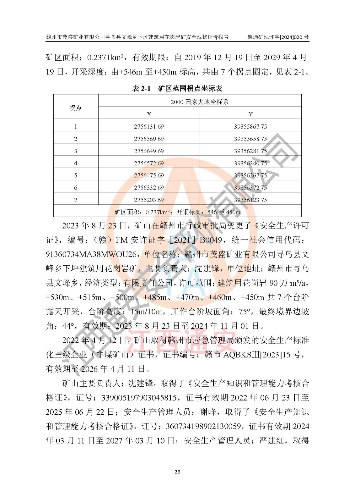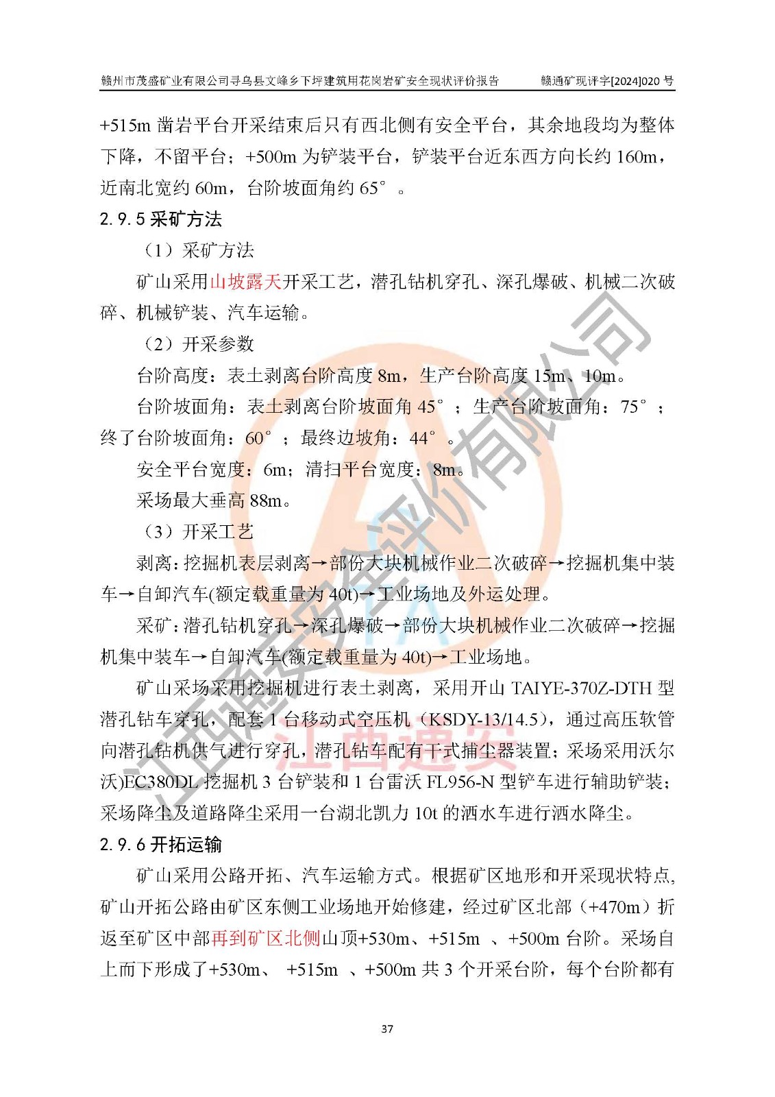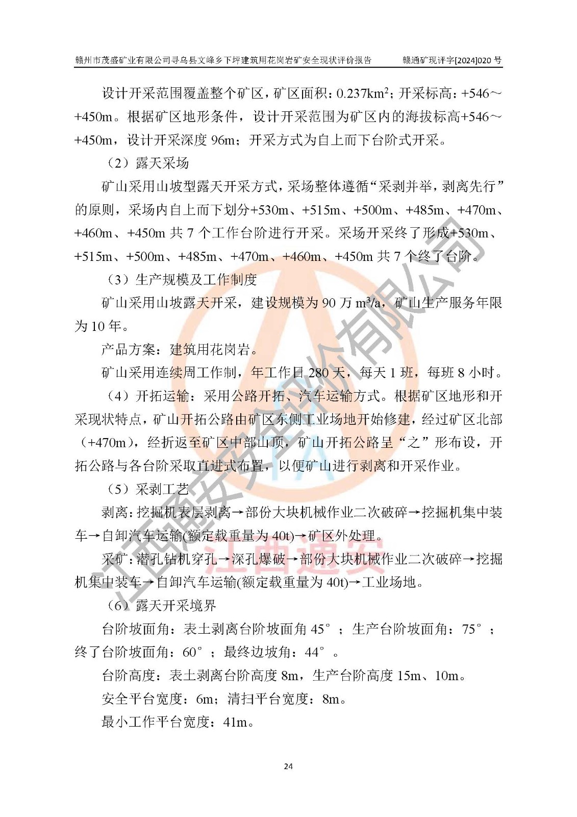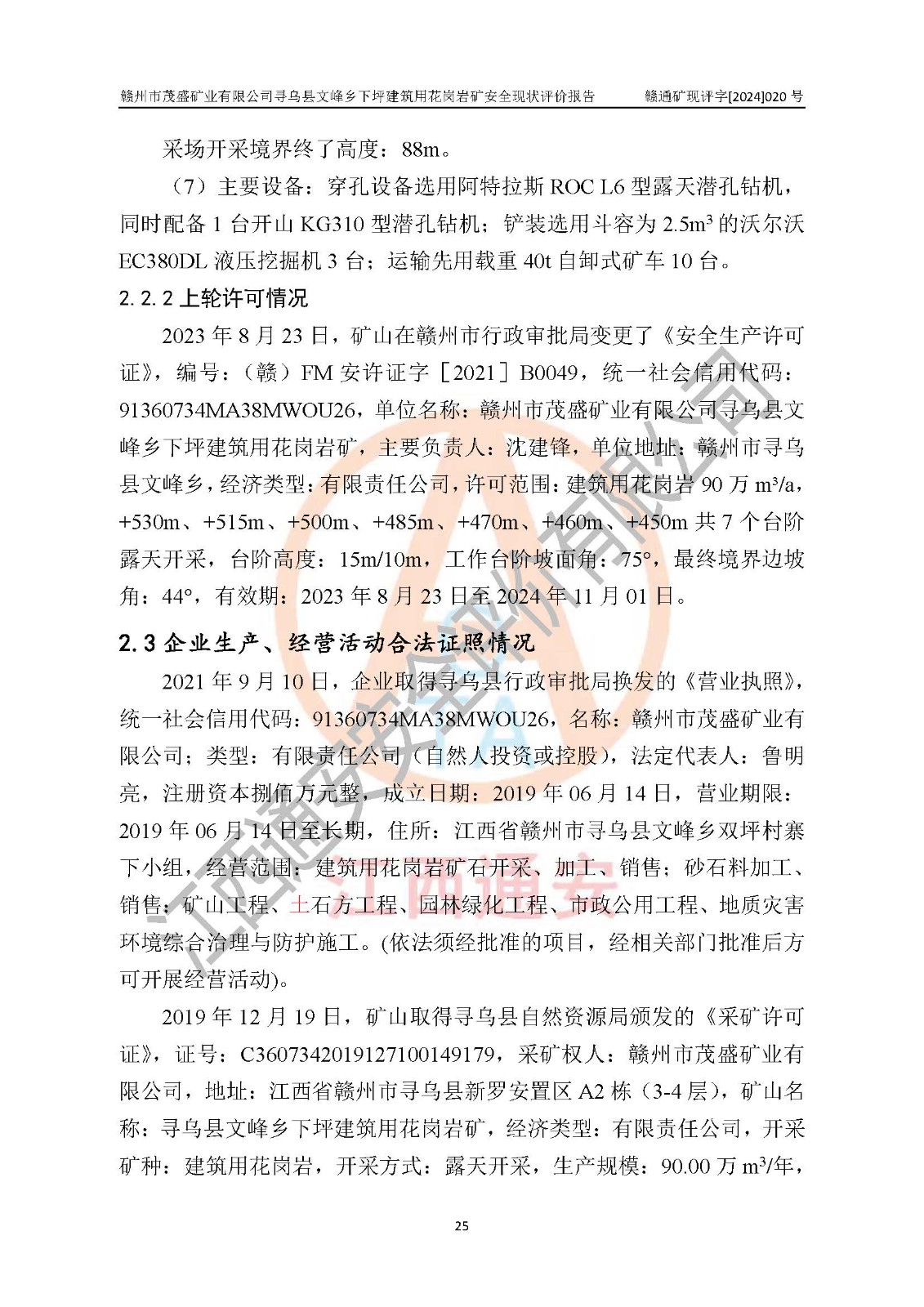項(xiàng)目簡(jiǎn)介 | 贛州市茂盛礦業(yè)有限公司尋烏縣文峰鄉(xiāng)下坪建筑用花崗巖礦,位于尋烏縣縣城240°方向,直線距離12**處,行政區(qū)劃隸屬尋烏縣文峰鄉(xiāng)管轄。礦區(qū)位置地理坐標(biāo):東經(jīng)115°34′12″~115°34′45″,北緯24°54′11″~25°54′30″。礦區(qū)至X484縣道約3**,交通方便。 礦山采用開拓公路汽車運(yùn)輸,礦山上山公路從礦區(qū)東側(cè)工業(yè)場(chǎng)地開始修建,經(jīng)過礦區(qū)北部(+470m)折返至礦區(qū)中部再到礦區(qū)北側(cè)山頂+530m、+515m 、+500m臺(tái)階;礦山經(jīng)過多年的開采,自上而形成了+530m、 +515m 、+500m共3個(gè)開采臺(tái)階,其中+530m、+515m臺(tái)階已到設(shè)計(jì)*終邊坡,+530m、+515m為安全平臺(tái),平臺(tái)寬度6m,臺(tái)階**8m/15m(剝離8m,開采15m),剝離坡面角約45°,開采坡面角約65°。 2022年4月12日,礦山取得贛州市應(yīng)急管理局頒發(fā)的安全生產(chǎn)標(biāo)準(zhǔn)化三級(jí)企業(yè)(非煤礦山)證書,證書編號(hào):贛市AQBKSⅢ[2023]15號(hào),**期至2026年4月11日。 | ||||