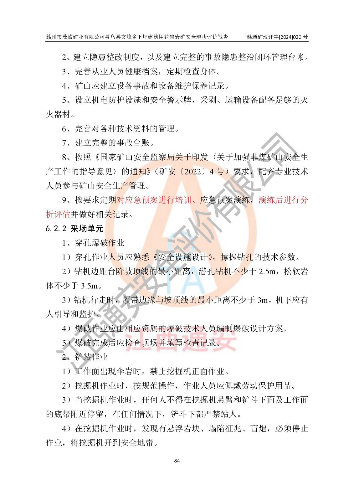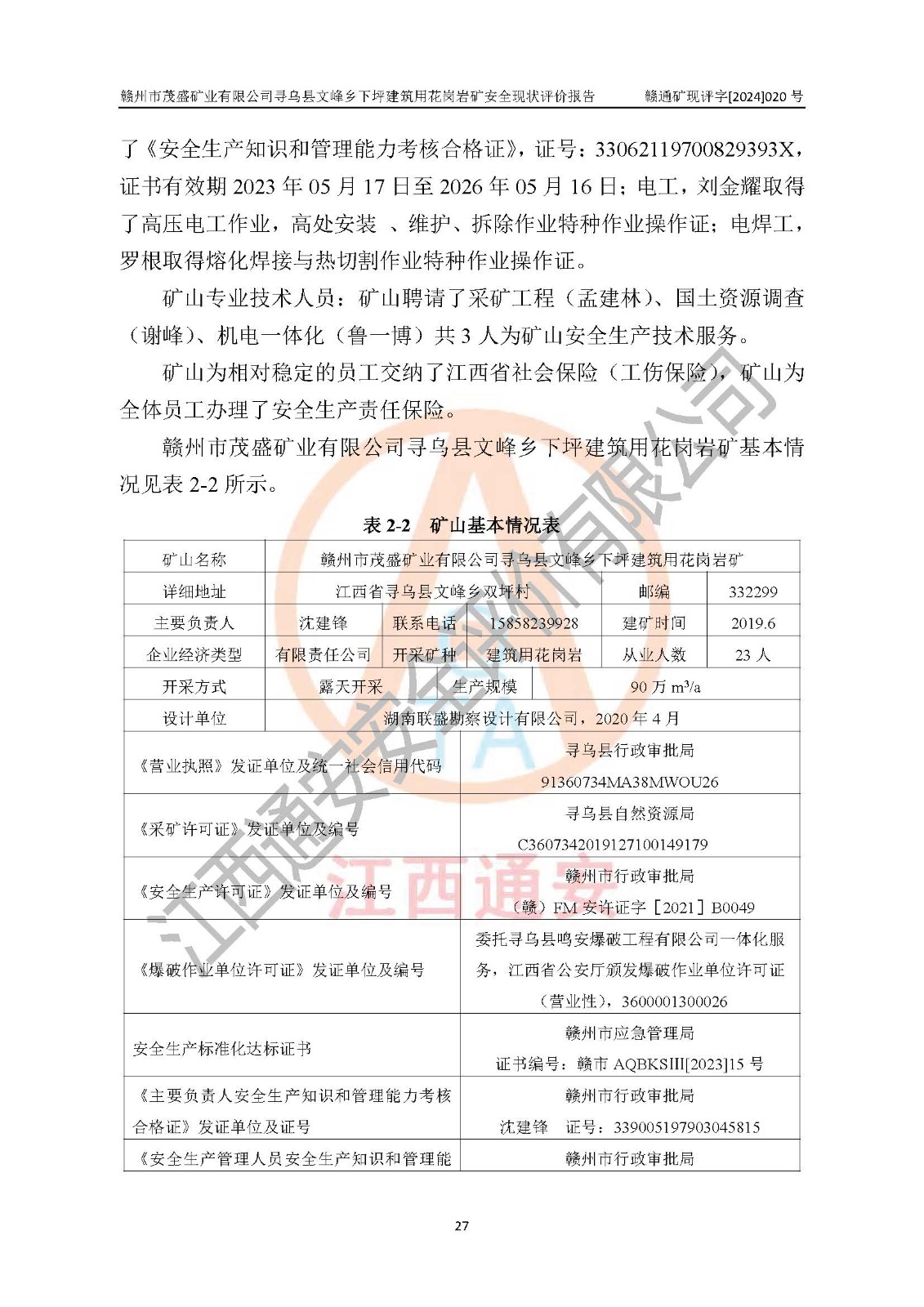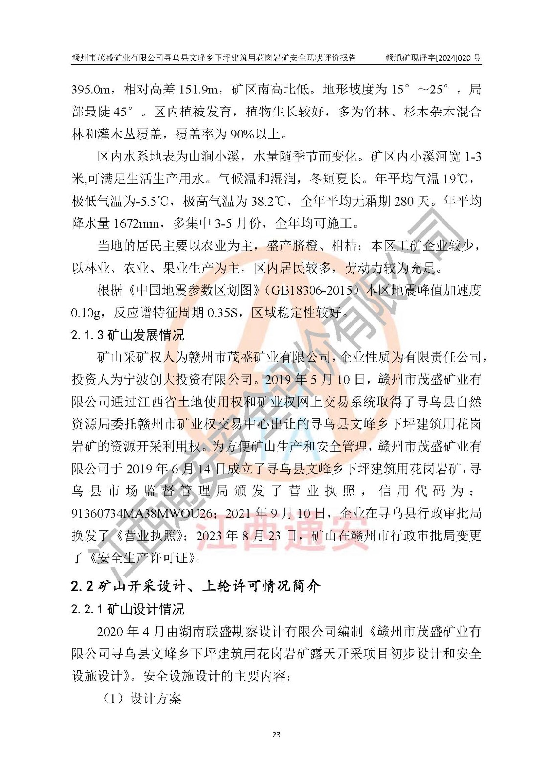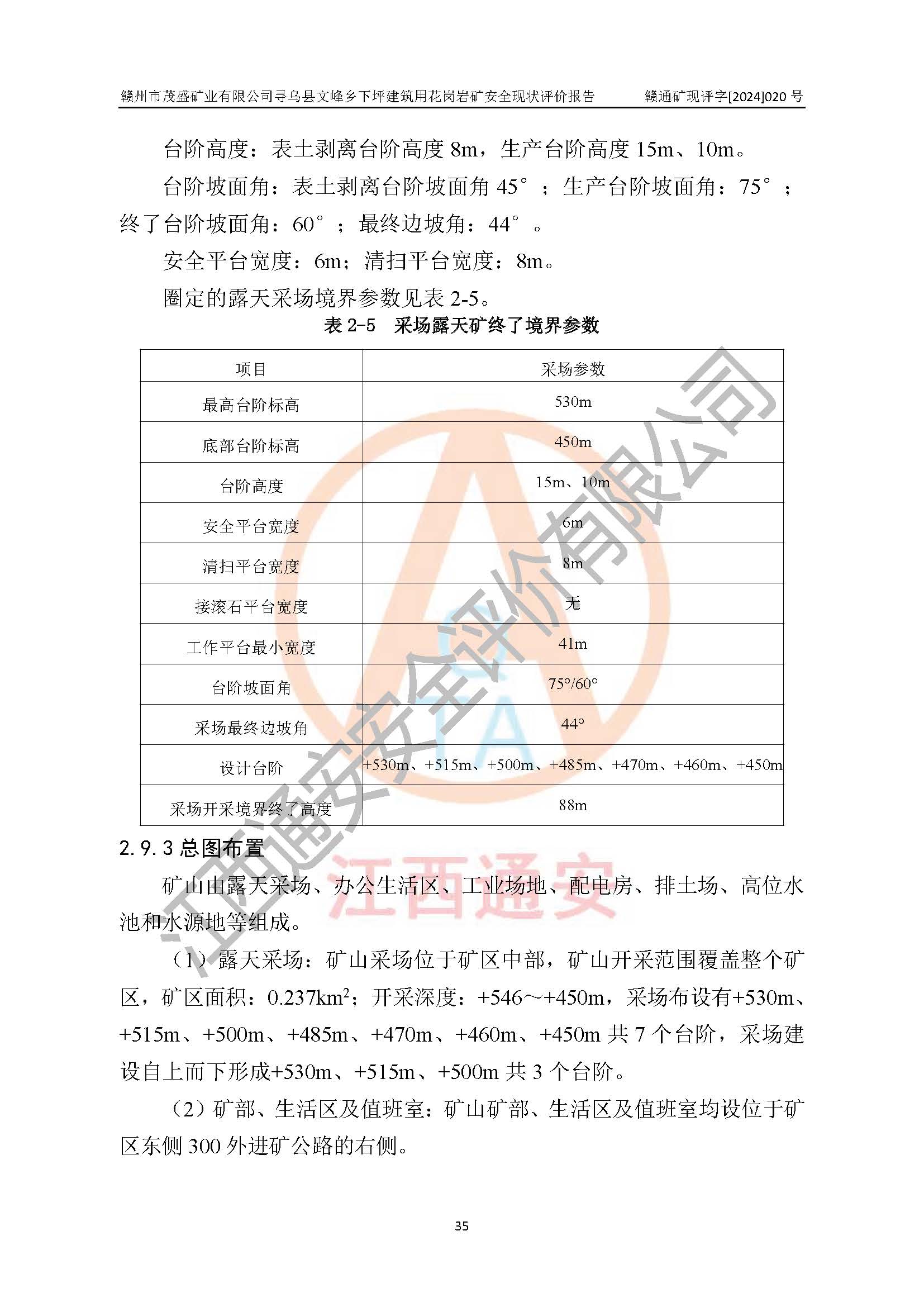 項(xiàng)目簡(jiǎn)介 | 贛州市茂盛礦業(yè)有限公司尋烏縣文峰鄉(xiāng)下坪建筑用花崗巖礦,位于尋烏縣縣城240°方向,直線距離12**處,行政區(qū)劃隸屬尋烏縣文峰鄉(xiāng)管轄。礦區(qū)位置地理坐標(biāo):東經(jīng)115°34′12″~115°34′45″,北緯24°54′11″~25°54′30″。礦區(qū)至X484縣道約3**,交通方便。 礦山采用開拓公路汽車運(yùn)輸,礦山上山公路從礦區(qū)東側(cè)工業(yè)場(chǎng)地開始修建,經(jīng)過礦區(qū)北部(+470m)折返至礦區(qū)中部再到礦區(qū)北側(cè)山頂+530m、+515m 、+500m臺(tái)階;礦山經(jīng)過多年的開采,自上而形成了+530m、 +515m 、+500m共3個(gè)開采臺(tái)階,其中+530m、+515m臺(tái)階已到設(shè)計(jì)*終邊坡,+530m、+515m為安全平臺(tái),平臺(tái)寬度6m,臺(tái)階**8m/15m(剝離8m,開采15m),剝離坡面角約45°,開采坡面角約65°。 2022年4月12日,礦山取得贛州市應(yīng)急管理局頒發(fā)的安全生產(chǎn)標(biāo)準(zhǔn)化三級(jí)企業(yè)(非煤礦山)證書,證書編號(hào):贛市AQBKSⅢ[2023]15號(hào),**期至2026年4月11日。 | ||||