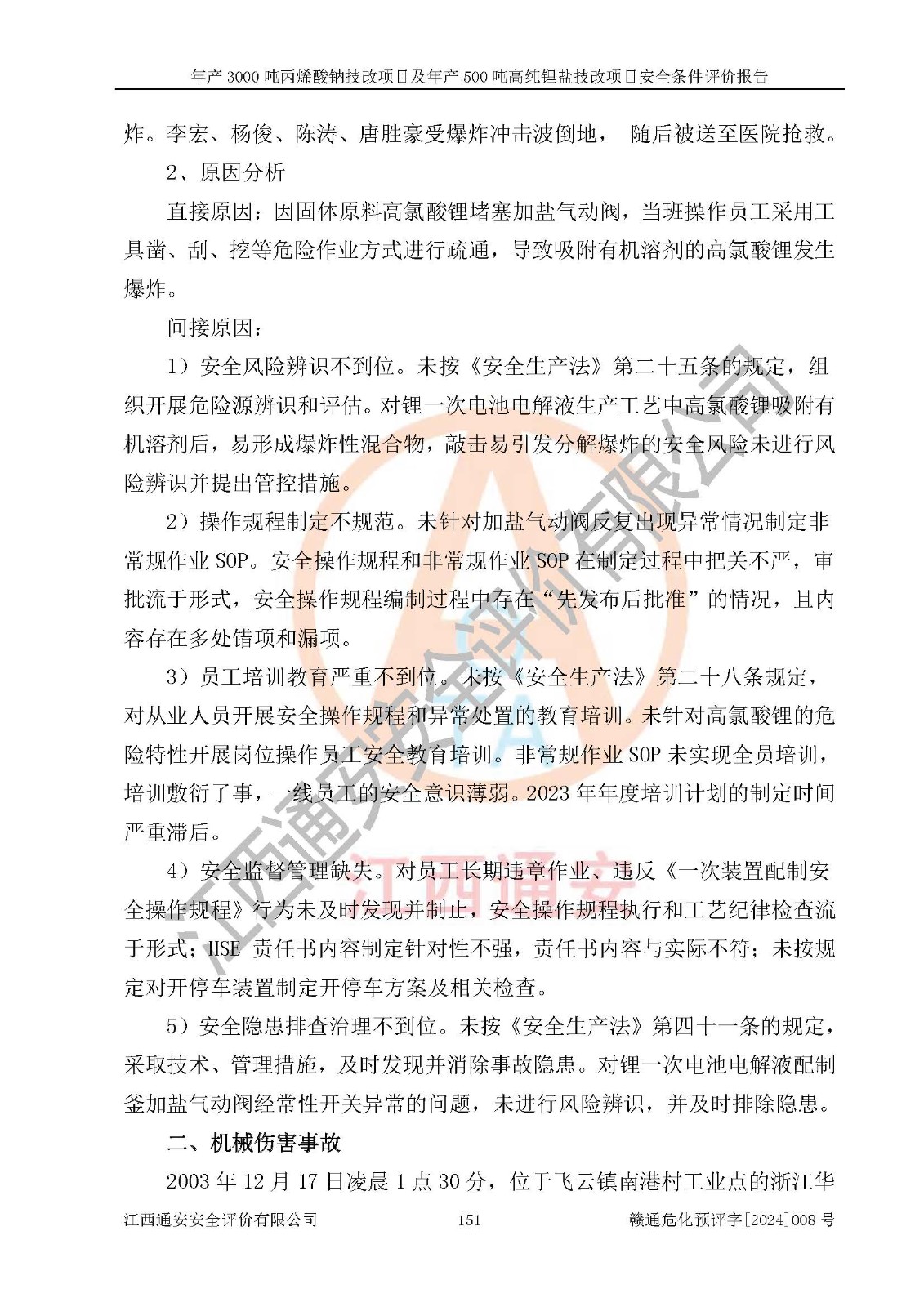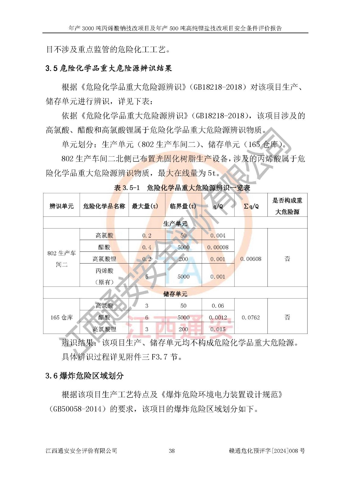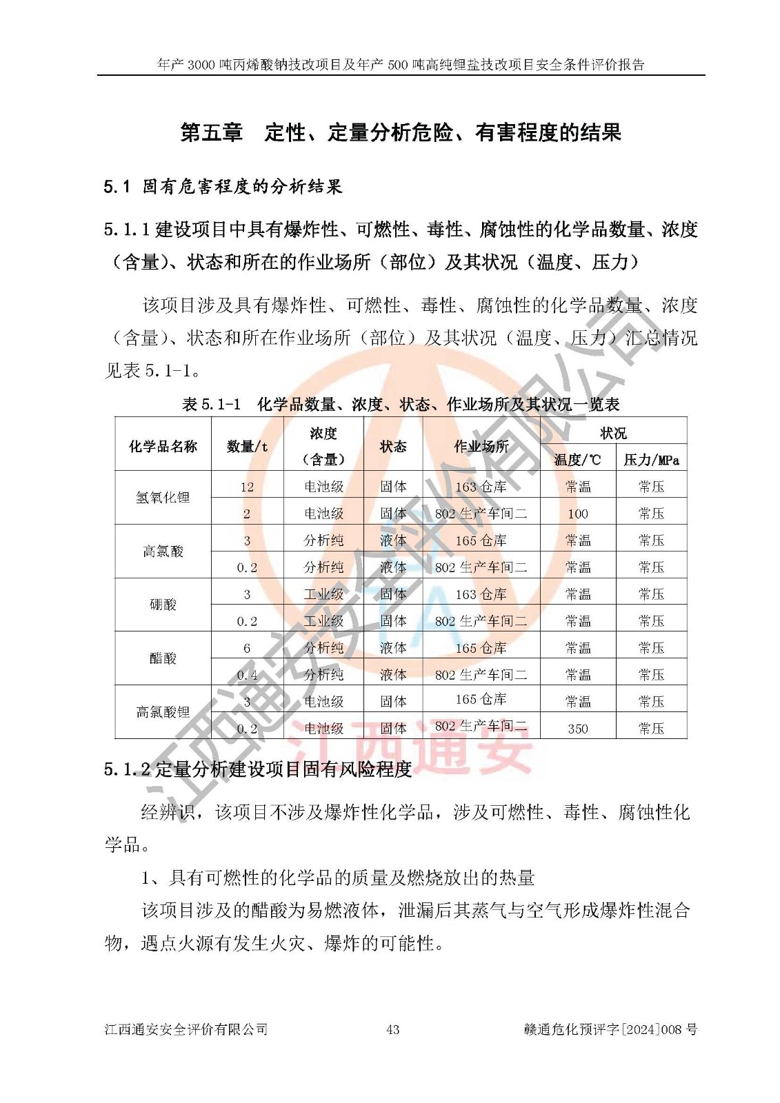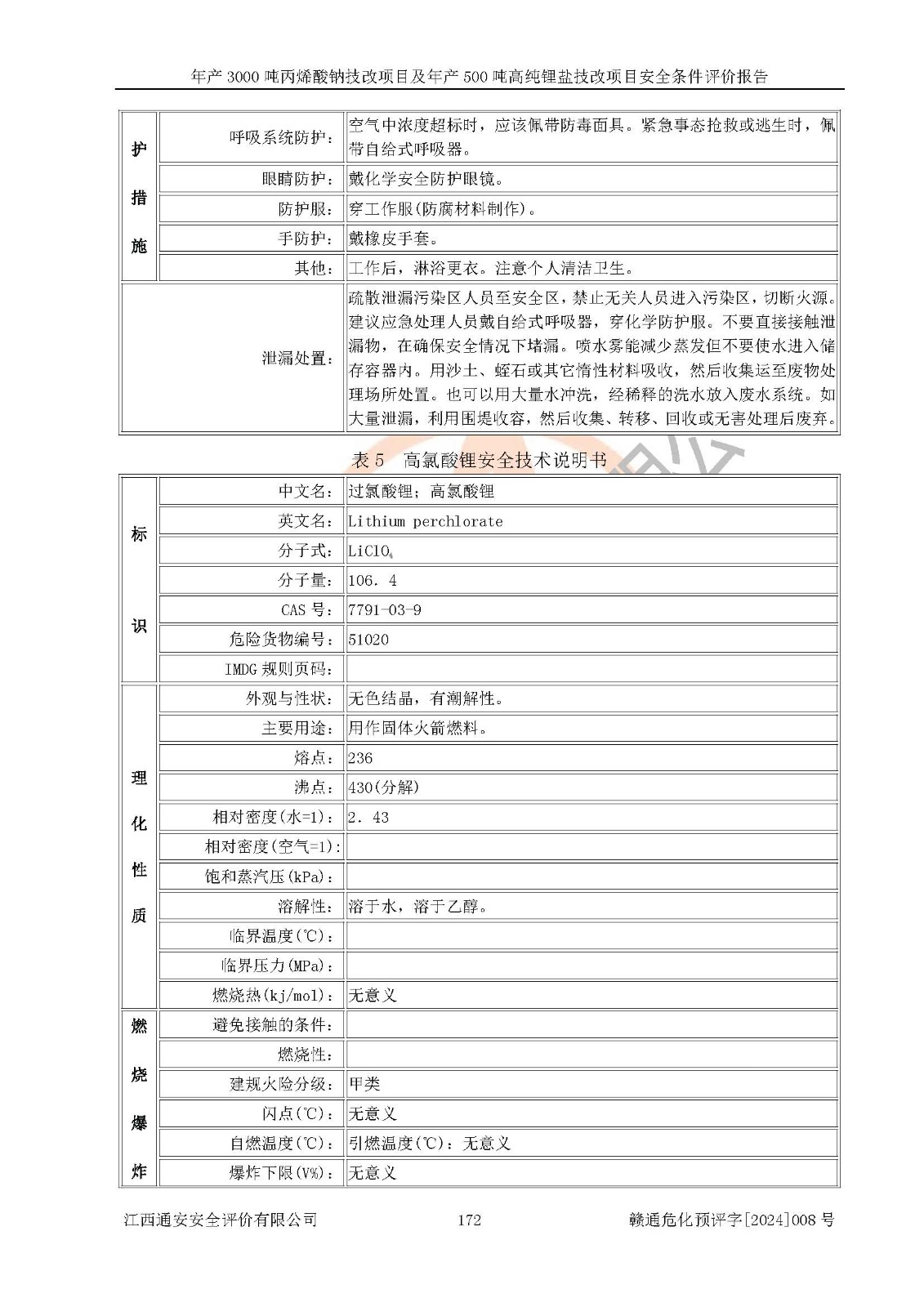 項目簡介 | 贛州朗固新材料科技有限公司(以下簡稱朗固新材料)成立于2020年03月31日,法定**人為陳學(xué)重,注冊資本伍**元整,經(jīng)營范圍為一般項目:光固化材料生產(chǎn)、銷售。(除許可業(yè)務(wù)外,可自主依法經(jīng)營法律法規(guī)非禁止或限制的項目) 贛州朗固新材料科技有限公司年產(chǎn)3000噸丙烯酸鈉技改項目及年產(chǎn)500噸高純鋰鹽技改項目已分別取得備案通知書,建設(shè)項目取得了項目規(guī)劃許可資料,建設(shè)地點位于贛縣區(qū)稀金新材料產(chǎn)業(yè)園區(qū)化工集中區(qū)。該項目生產(chǎn)過程中涉及使用的原輔材料有10%丙烯酸鈉溶液、氫氧化鋰、高氯酸、草酸、硼酸和醋酸,產(chǎn)品為丙烯酸鈉、高氯酸鋰、草酸鋰、硼酸鋰和醋酸鋰。經(jīng)辨識,氫氧化鋰、高氯酸、硼酸、醋酸和高氯酸鋰屬于危險化學(xué)品,高氯酸和高氯酸鋰屬于易制爆危險化學(xué)品,不涉及重點監(jiān)管的危險化學(xué)品,不涉及重點監(jiān)管的危險化工工藝,生產(chǎn)、儲存單元均不構(gòu)成危險化學(xué)品重大危險源。該項目生產(chǎn)過程中主要的危險有害因素為火災(zāi)、爆炸、灼燙。根據(jù)《安全生產(chǎn)許可證條例》、《危險化學(xué)品安全管理條例》和《危險化學(xué)品生產(chǎn)企業(yè)安全生產(chǎn)許可實施辦法》等相關(guān)規(guī)定,該項目產(chǎn)品中高氯酸鋰屬于危險化學(xué)品,需要辦理危險化學(xué)品安全生產(chǎn)許可證。 | |||