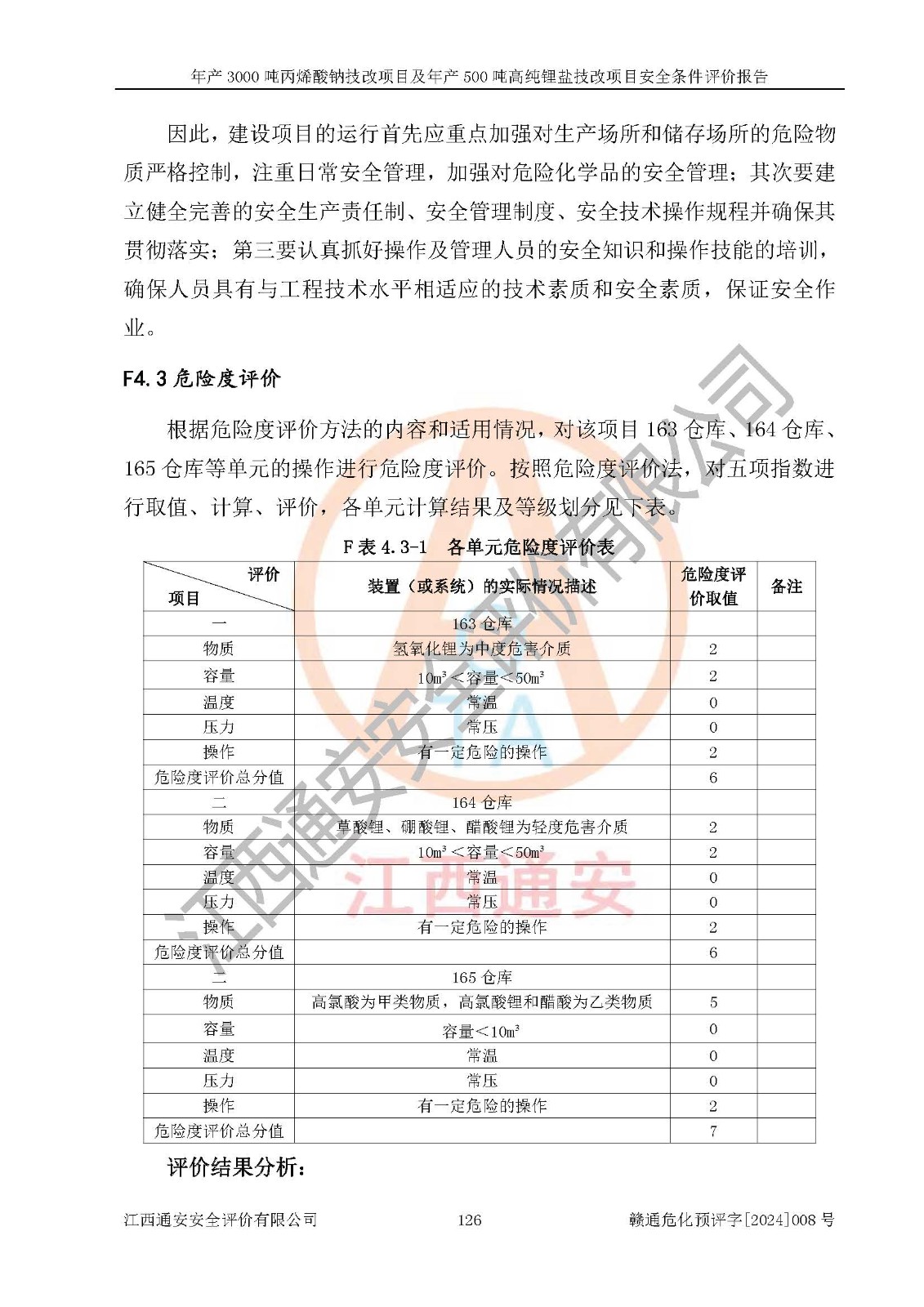 評價結(jié)論 | 贛州朗固新材料科技有限公司年產(chǎn)3000噸丙烯酸鈉技改項目及年產(chǎn)500噸高純鋰鹽技改項目在以后的初步設(shè)計、施工圖設(shè)計和建設(shè)施工、安裝調(diào)試及生產(chǎn)運行中,如能嚴格執(zhí)行**有關(guān)安全生產(chǎn)的法律法規(guī)、規(guī)章、標(biāo)準(zhǔn)、規(guī)范,認真落實項目可行性研究報告提出的安全對策措施,并合理采納本報告中提出的安全對策措施及建議,真正做到安全設(shè)施與主體工程同時設(shè)計、同時施工、同時投入生產(chǎn)和使用,則工程潛在的危險、有害因素可得到**控制,風(fēng)險在**控制和可接受范圍內(nèi)。 | |||
