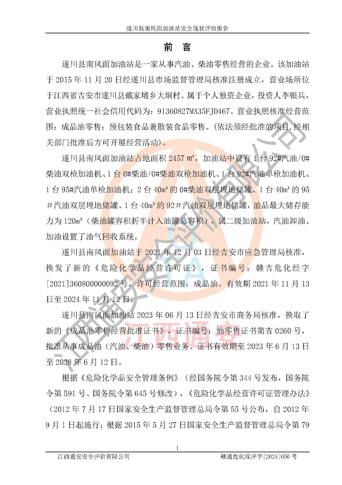 項(xiàng)目簡介 | 遂川縣南風(fēng)面加油站是一家從事汽油、柴油零售經(jīng)營的企業(yè)。該加油站于2015年11月20日經(jīng)遂川縣市場監(jiān)督管理局核準(zhǔn)注冊(cè)成立,營業(yè)場所位于江西省吉安市遂川縣戴家埔鄉(xiāng)大垌村。屬于個(gè)人獨(dú)資企業(yè),投資人李銀兵,營業(yè)執(zhí)照統(tǒng)一社會(huì)信用代碼為:91360827MA35FJD467。營業(yè)執(zhí)照核準(zhǔn)經(jīng)營范圍:成品油零售:預(yù)包裝食品兼散裝食品零售。(依法須經(jīng)批準(zhǔn)的項(xiàng)目,經(jīng)相關(guān)部門批準(zhǔn)后方可開展經(jīng)營活動(dòng))。 遂川縣南風(fēng)面加油站占地面積2457㎡,加油站中設(shè)有1臺(tái)92#汽油/0#柴油雙槍加油機(jī)、1臺(tái)0#柴油/0#柴油雙槍加油機(jī)、1臺(tái)92#汽油單槍加油機(jī)、1臺(tái)95#汽油單槍加油機(jī);2臺(tái)40m3的0#柴油雙層埋地儲(chǔ)罐、1臺(tái)40m3的95#汽油雙層埋地儲(chǔ)罐、1臺(tái)40m3的92#汽油雙層埋地儲(chǔ)罐,油品*大儲(chǔ)存能力為120m3(柴油罐容積折半計(jì)入油罐總?cè)莘e),屬二級(jí)加油站,汽油卸油、加油設(shè)置了油氣回收系統(tǒng)。 遂川縣南風(fēng)面加油站于2021年12月03日經(jīng)吉安市應(yīng)急管理局核準(zhǔn),換發(fā)了新的《危險(xiǎn)化學(xué)品經(jīng)營許可證》,證書編號(hào):贛吉?;?jīng)字[2021]360800000092號(hào),許可經(jīng)營范圍:成品油。**期2021年11月13日至2024年11月12日。 遂川縣南風(fēng)面加油站2023年06月13日經(jīng)吉安市商務(wù)局核準(zhǔn),換取了新的《成品油零售經(jīng)營批準(zhǔn)證書》,證書編號(hào):油零售證書第吉0260號(hào),批準(zhǔn)從事成品油(汽油、柴油)零售業(yè)務(wù)。證書**期至2023年6月13日至2028年6月12日。 | ||||