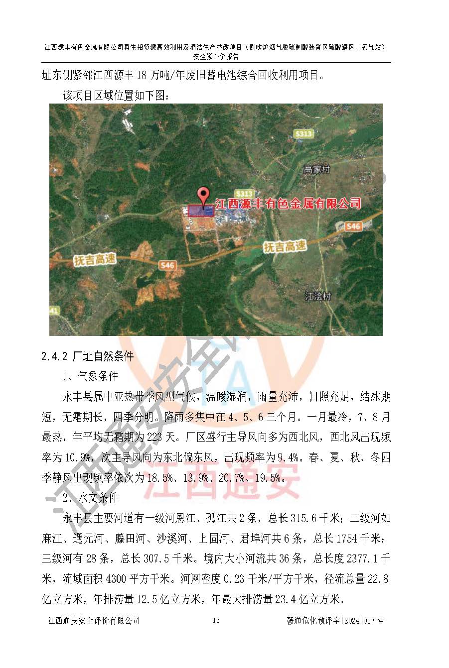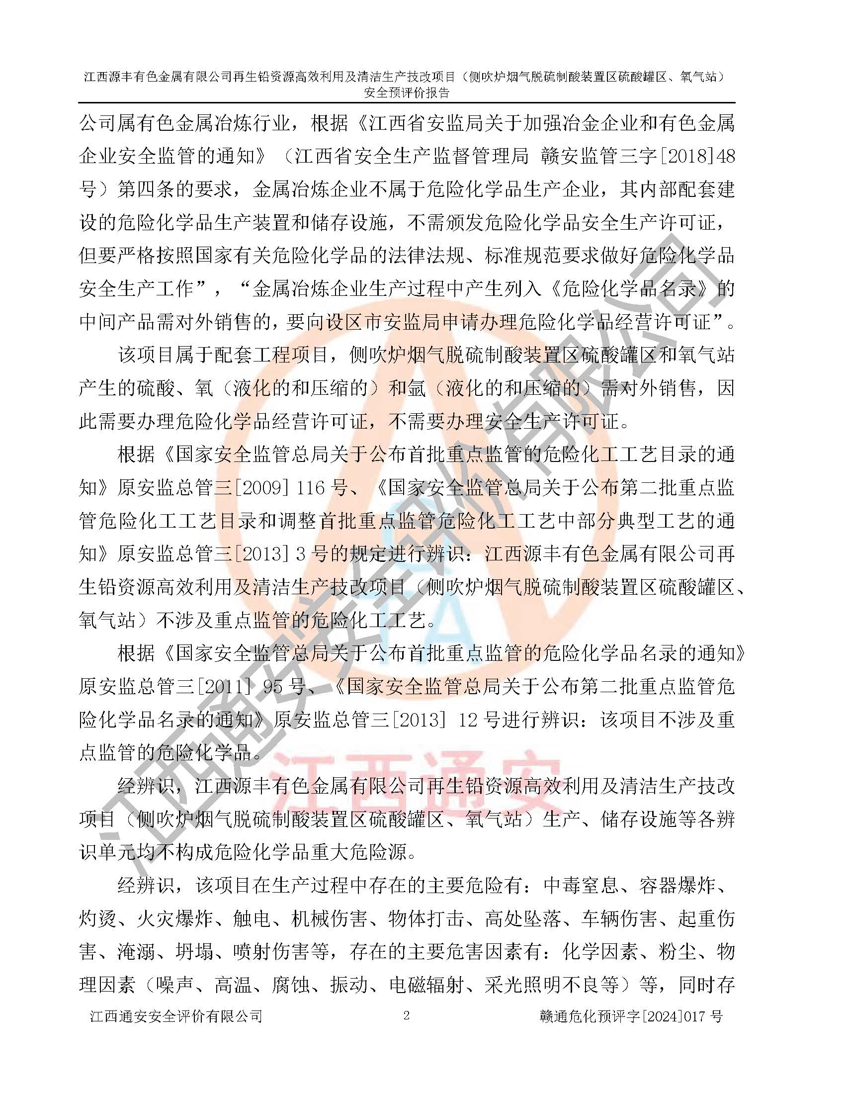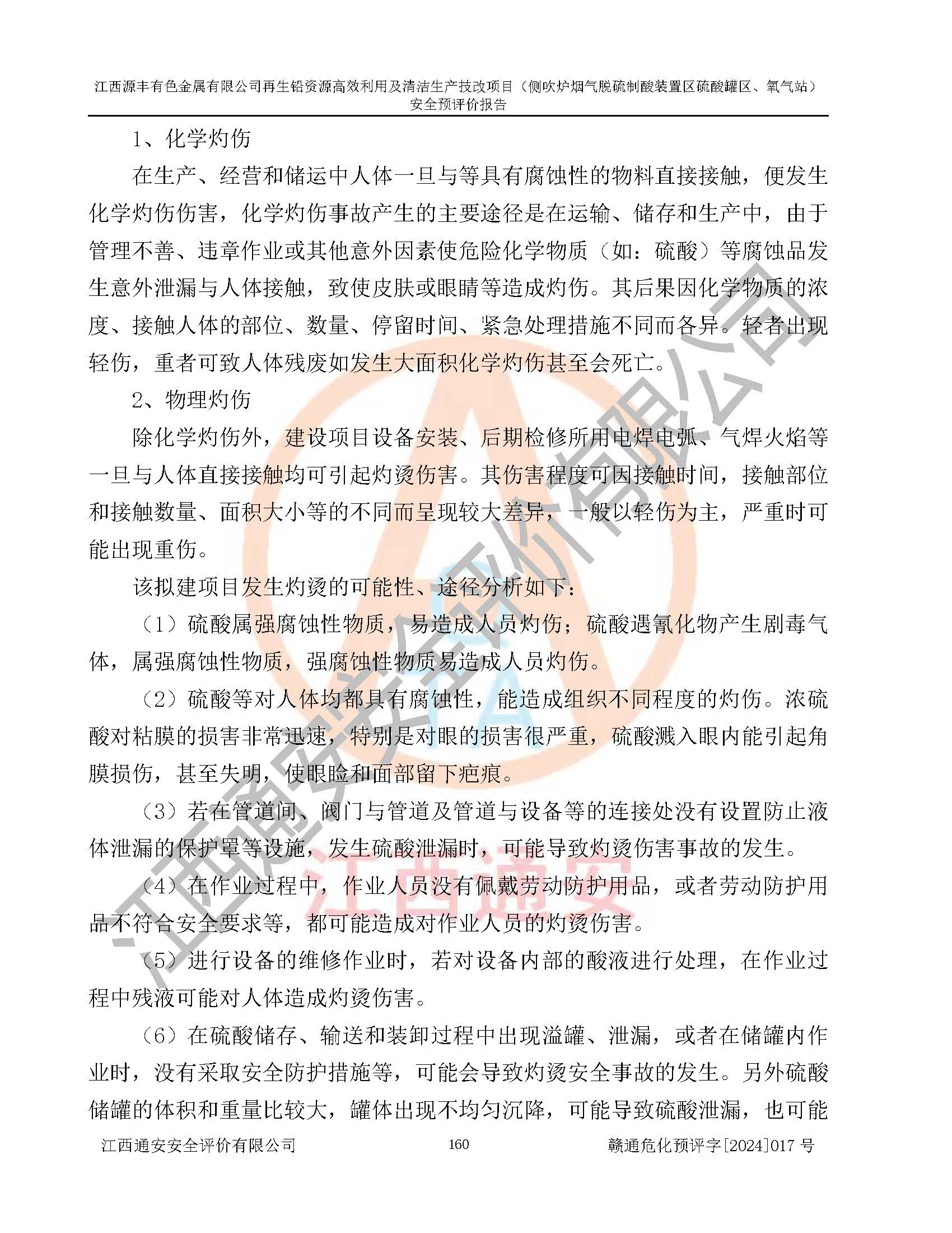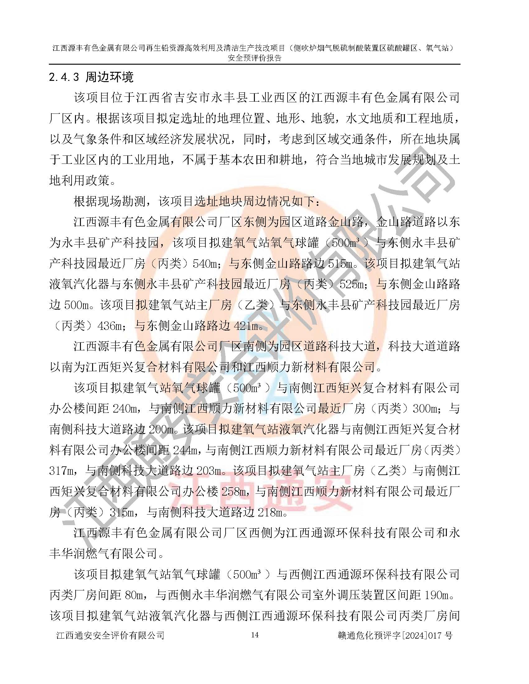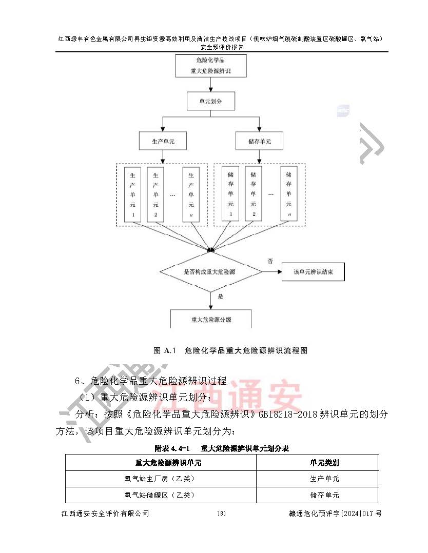 項(xiàng)目簡(jiǎn)介 | 江西源豐有色金屬有限公司成立于2010年08月27日,并取得了永豐縣市場(chǎng)監(jiān)督管理局頒發(fā)的《營(yíng)業(yè)執(zhí)照》,營(yíng)業(yè)執(zhí)照統(tǒng)一社會(huì)信用代碼:91360825561057744X。公司注冊(cè)住所:江西省吉安市永豐縣工業(yè)西區(qū)。法定**人:李新戰(zhàn),注冊(cè)資本:壹億陸仟壹佰捌拾伍萬(wàn)捌仟陸佰元整。企業(yè)類型:有限責(zé)任公司(非自然人投資或控股的法人獨(dú)資)。經(jīng)營(yíng)范圍包括一般項(xiàng)目:有色金屬合金制造,有色金屬合金銷售,廢舊蓄電池、礦燈、銀、鋅、鋁、鉛、銅、廢渣的處理及經(jīng)營(yíng);合金、鉛膏、塑料本企業(yè)自產(chǎn)產(chǎn)品的銷售;自營(yíng)和代理**各類商品和技術(shù)的進(jìn)出口業(yè)務(wù),信息咨詢服務(wù)(不含許可類信息咨詢服務(wù))(除許可業(yè)務(wù)外,可自主依法經(jīng)營(yíng)法律法規(guī)非禁止或限制的項(xiàng)目)。 江西源豐有色金屬有限公司于2024年6月11日取得永豐縣工業(yè)和信息化局出具的《江西省工業(yè)企業(yè)技術(shù)改造項(xiàng)目備案通知書》,項(xiàng)目統(tǒng)一代碼為:2020-360825-42-03-047942,項(xiàng)目名稱為:江西源豐有色金屬有限公司再生鉛資源**利用及清潔生產(chǎn)技改項(xiàng)目。本項(xiàng)目為江西源豐有色金屬有限公司再生鉛資源**利用及清潔生產(chǎn)技改項(xiàng)目的配套工程項(xiàng)目:側(cè)吹爐煙氣脫硫制酸裝置區(qū)硫酸罐區(qū)、氧氣站。 根據(jù)《危險(xiǎn)化學(xué)品目錄(2015版)》(**安監(jiān)總局等十部門公告[2015]第5號(hào)),應(yīng)急管理部、工業(yè)和信息化部、公安部、生態(tài)環(huán)境部、交通運(yùn)輸部、農(nóng)業(yè)農(nóng)村部、衛(wèi)生健康委、市場(chǎng)監(jiān)管總局、鐵路局、民航局決定調(diào)整《危險(xiǎn)化學(xué)品目錄(2015版)》(應(yīng)急管理部、工業(yè)和信息化部、公安部、生態(tài)環(huán)境部、交通運(yùn)輸部、農(nóng)業(yè)農(nóng)村部、衛(wèi)生健康委、市場(chǎng)監(jiān)管總局、鐵路局、民航局公告2022年第8號(hào))以及應(yīng)急管理部辦公廳關(guān)于修改《危險(xiǎn)化學(xué)品目錄(2015年版)實(shí)施指南(試行)》涉及柴油部分內(nèi)容的通知(應(yīng)急廳函[2022]300號(hào)),該項(xiàng)目主要涉及的危險(xiǎn)化學(xué)品有:硫酸、氧(液化的和壓縮的)、氮(液化的和壓縮的)、氬(液化的和壓縮的)。 | |||