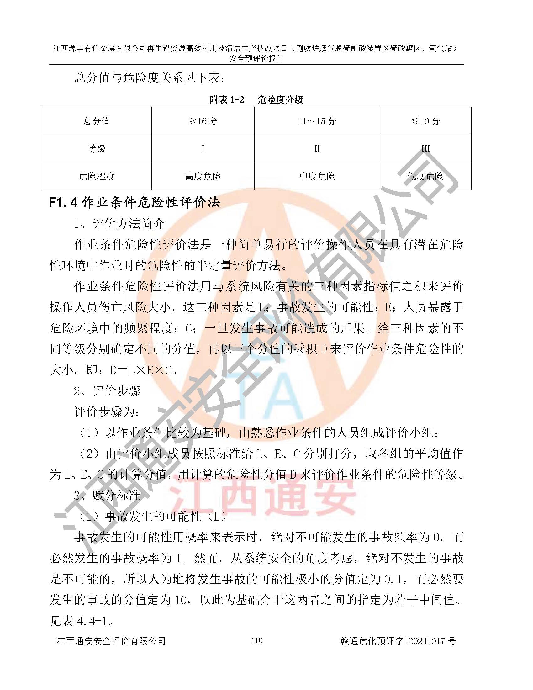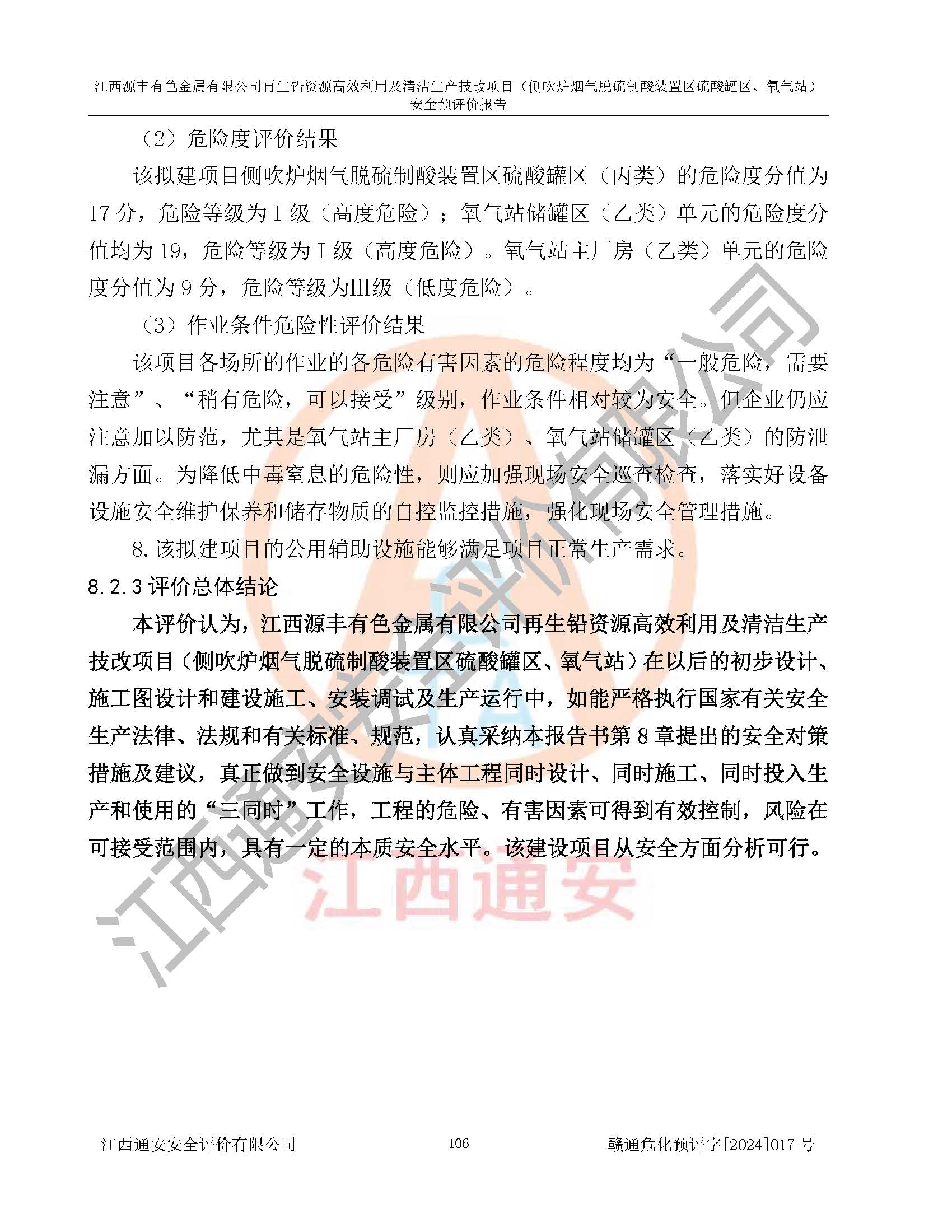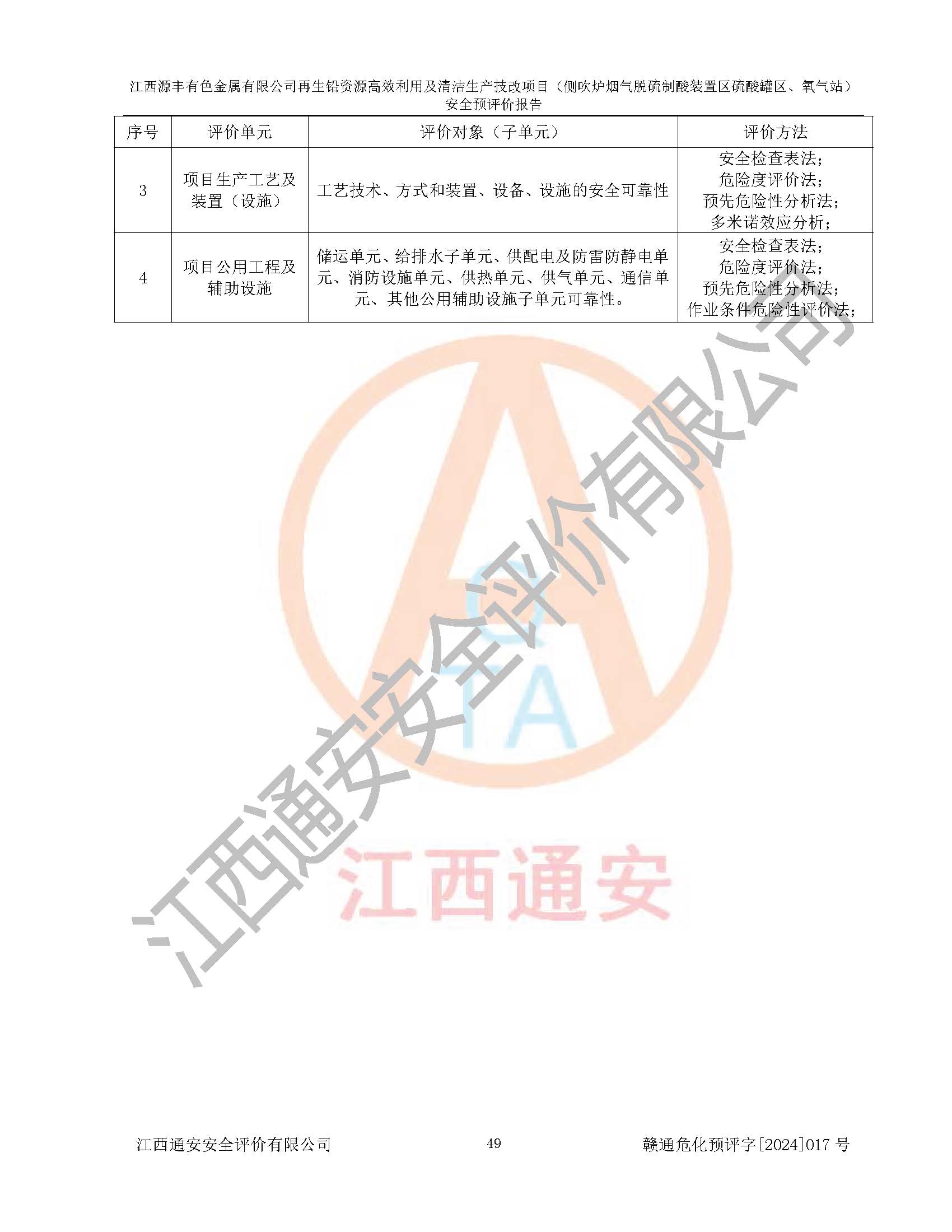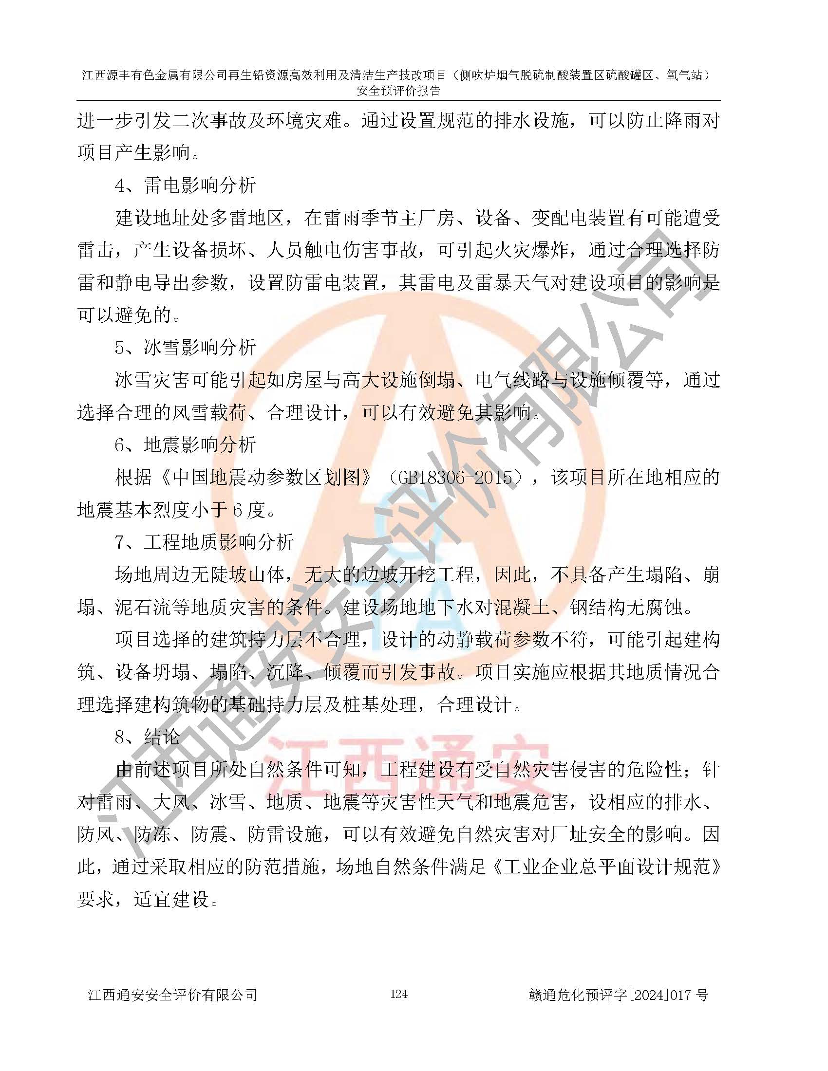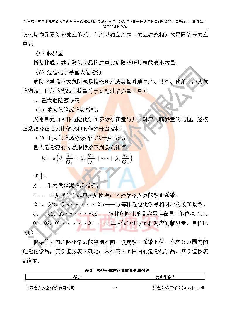 評(píng)價(jià)結(jié)論 | 評(píng)價(jià)結(jié)論:本評(píng)價(jià)認(rèn)為,江西源豐有色金屬有限公司再生鉛資源**利用及清潔生產(chǎn)技改項(xiàng)目(側(cè)吹爐煙氣脫硫制酸裝置區(qū)硫酸罐區(qū)、氧氣站)在以后的初步設(shè)計(jì)、施工圖設(shè)計(jì)和建設(shè)施工、安裝調(diào)試及生產(chǎn)運(yùn)行中,如能嚴(yán)格執(zhí)行**有關(guān)安全生產(chǎn)法律、法規(guī)和有關(guān)標(biāo)準(zhǔn)、規(guī)范,認(rèn)真采納本報(bào)告書第8章提出的安全對(duì)策措施及建議,真正做到安全設(shè)施與主體工程同時(shí)設(shè)計(jì)、同時(shí)施工、同時(shí)投入生產(chǎn)和使用的“三同時(shí)”工作,工程的危險(xiǎn)、有害因素可得到**控制,風(fēng)險(xiǎn)在可接受范圍內(nèi),具有**的本質(zhì)安全水平。該建設(shè)項(xiàng)目從安全方面分析可行。 | |||