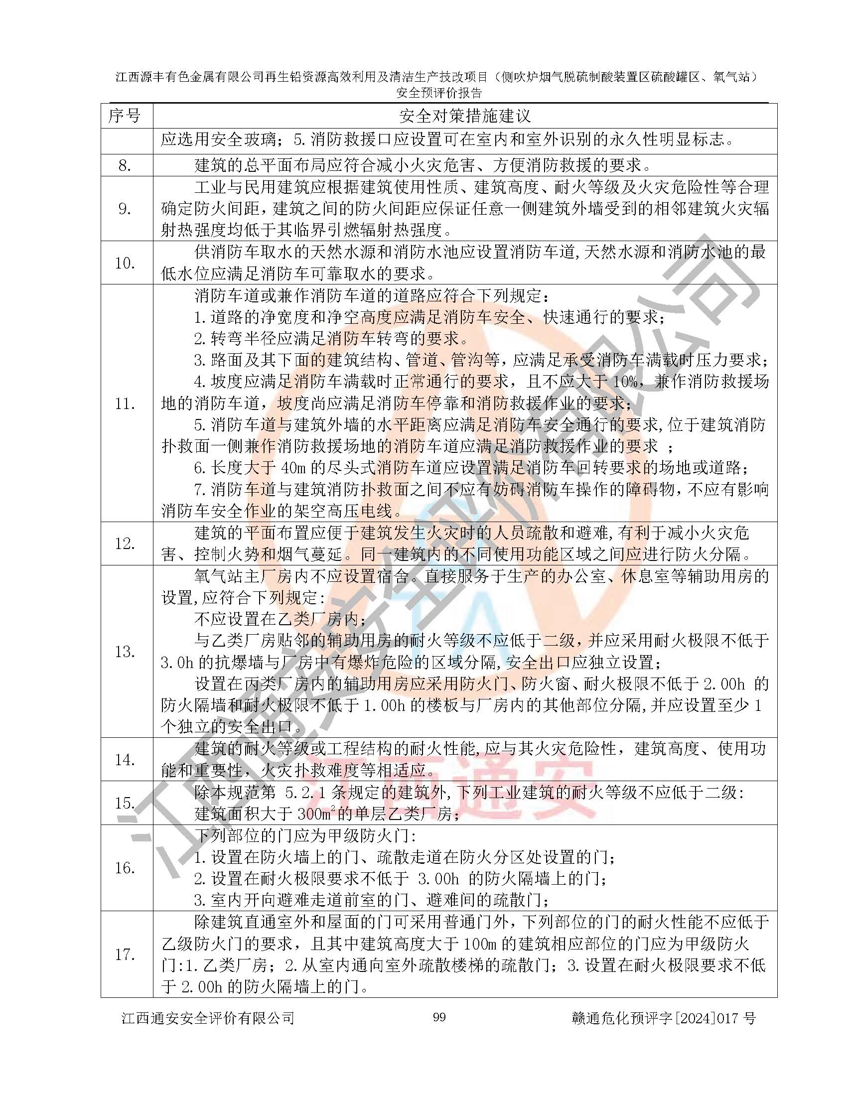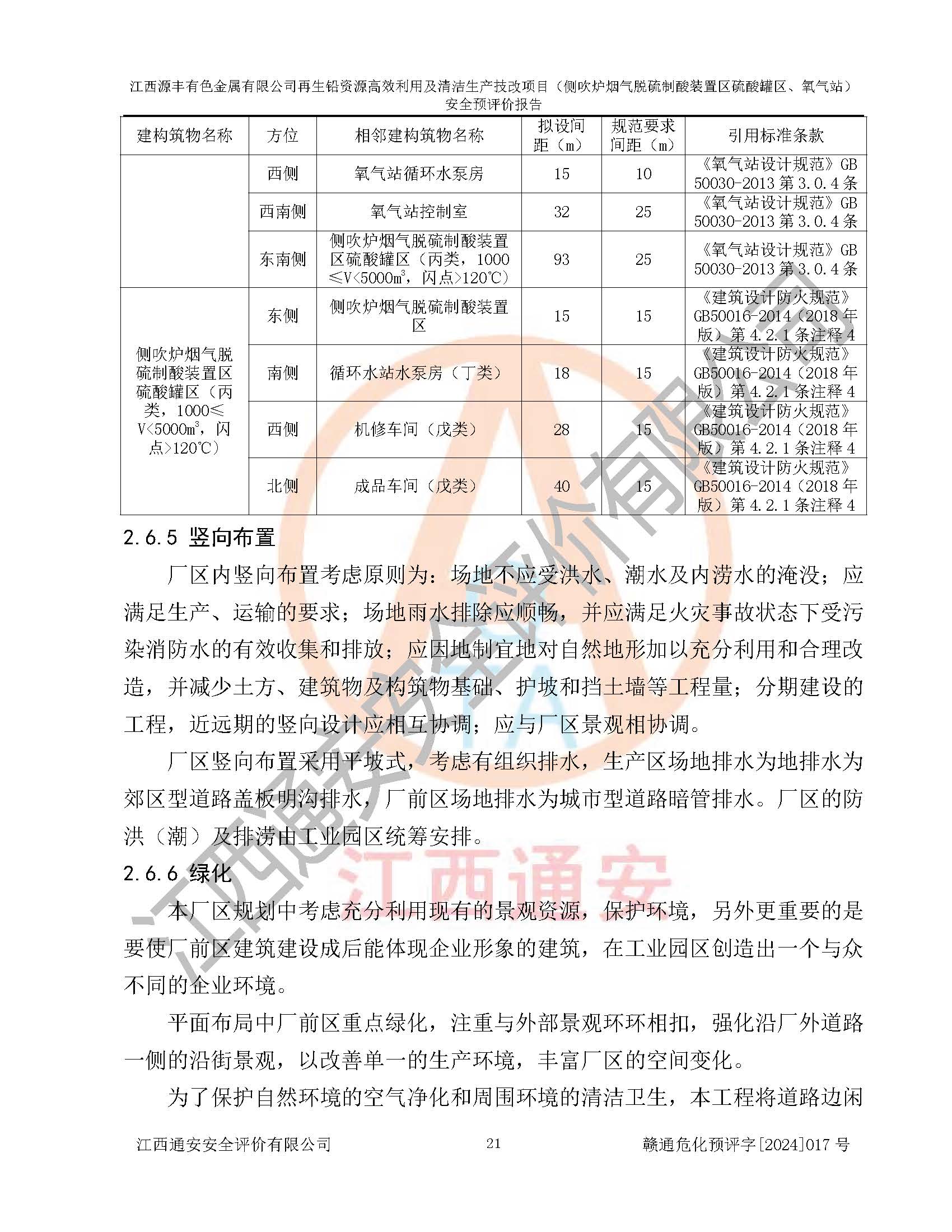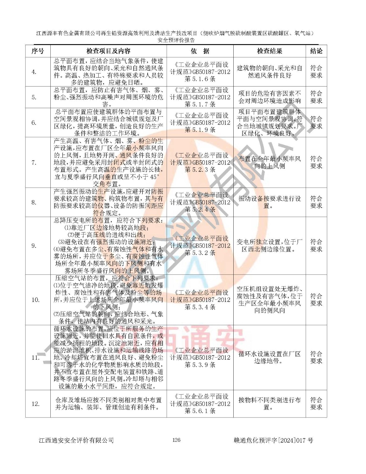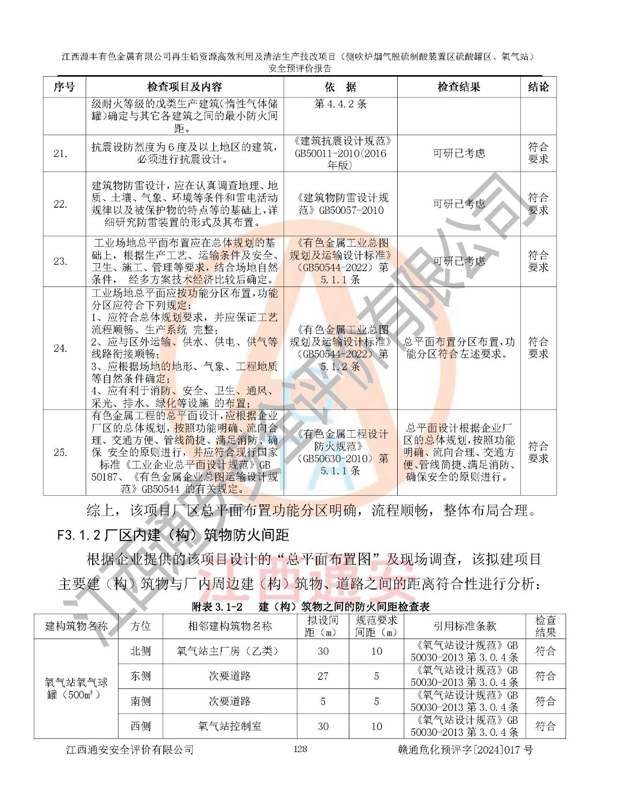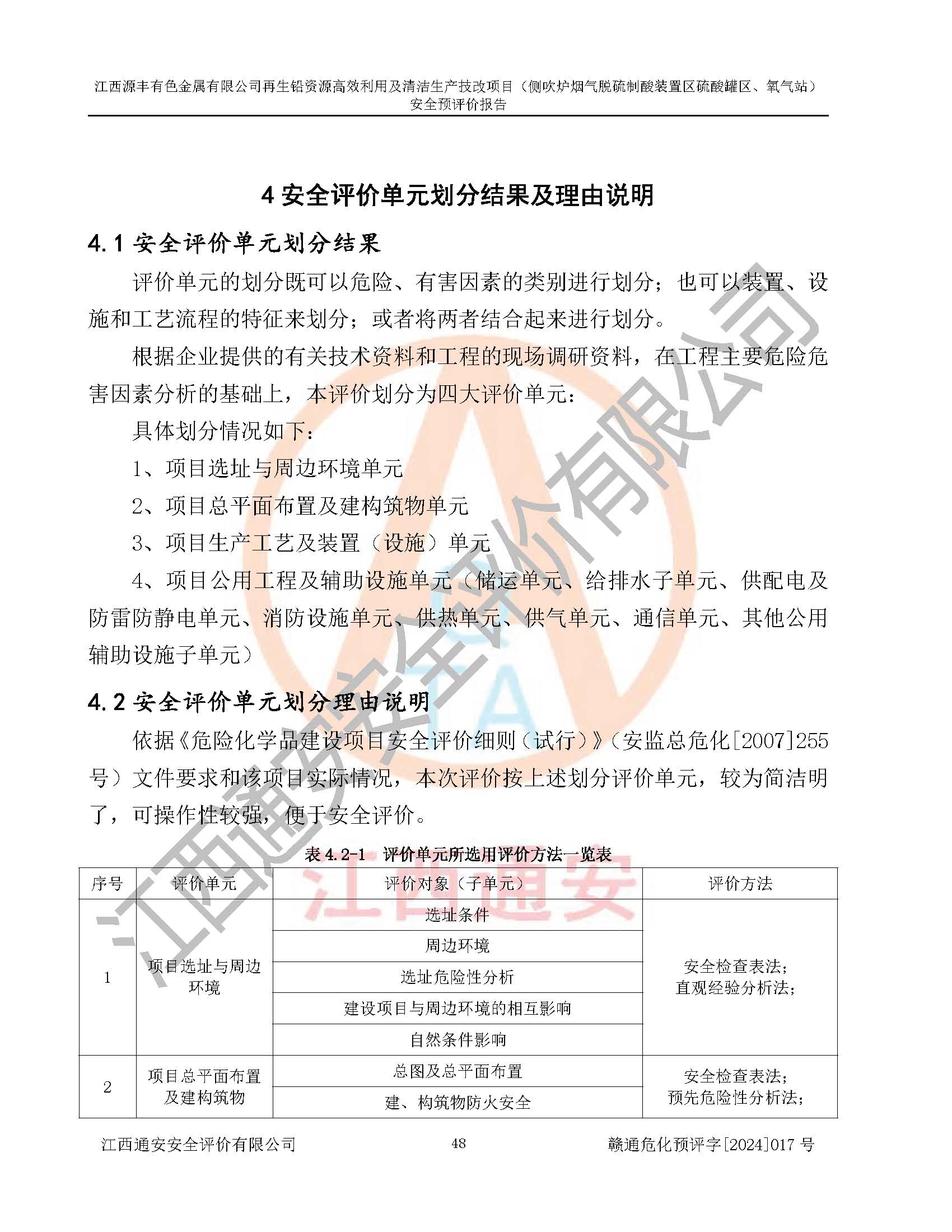 評(píng)價(jià)結(jié)論 | 評(píng)價(jià)結(jié)論:本評(píng)價(jià)認(rèn)為,江西源豐有色金屬有限公司再生鉛資源**利用及清潔生產(chǎn)技改項(xiàng)目(側(cè)吹爐煙氣脫硫制酸裝置區(qū)硫酸罐區(qū)、氧氣站)在以后的初步設(shè)計(jì)、施工圖設(shè)計(jì)和建設(shè)施工、安裝調(diào)試及生產(chǎn)運(yùn)行中,如能嚴(yán)格執(zhí)行**有關(guān)安全生產(chǎn)法律、法規(guī)和有關(guān)標(biāo)準(zhǔn)、規(guī)范,認(rèn)真采納本報(bào)告書第8章提出的安全對(duì)策措施及建議,真正做到安全設(shè)施與主體工程同時(shí)設(shè)計(jì)、同時(shí)施工、同時(shí)投入生產(chǎn)和使用的“三同時(shí)”工作,工程的危險(xiǎn)、有害因素可得到**控制,風(fēng)險(xiǎn)在可接受范圍內(nèi),具有**的本質(zhì)安全水平。該建設(shè)項(xiàng)目從安全方面分析可行。 | |||