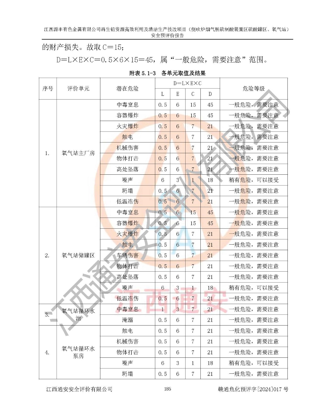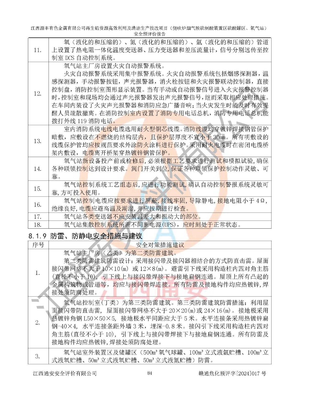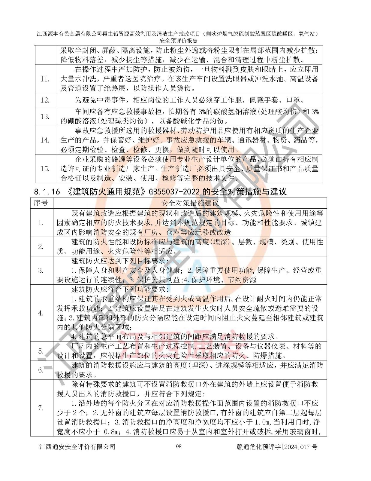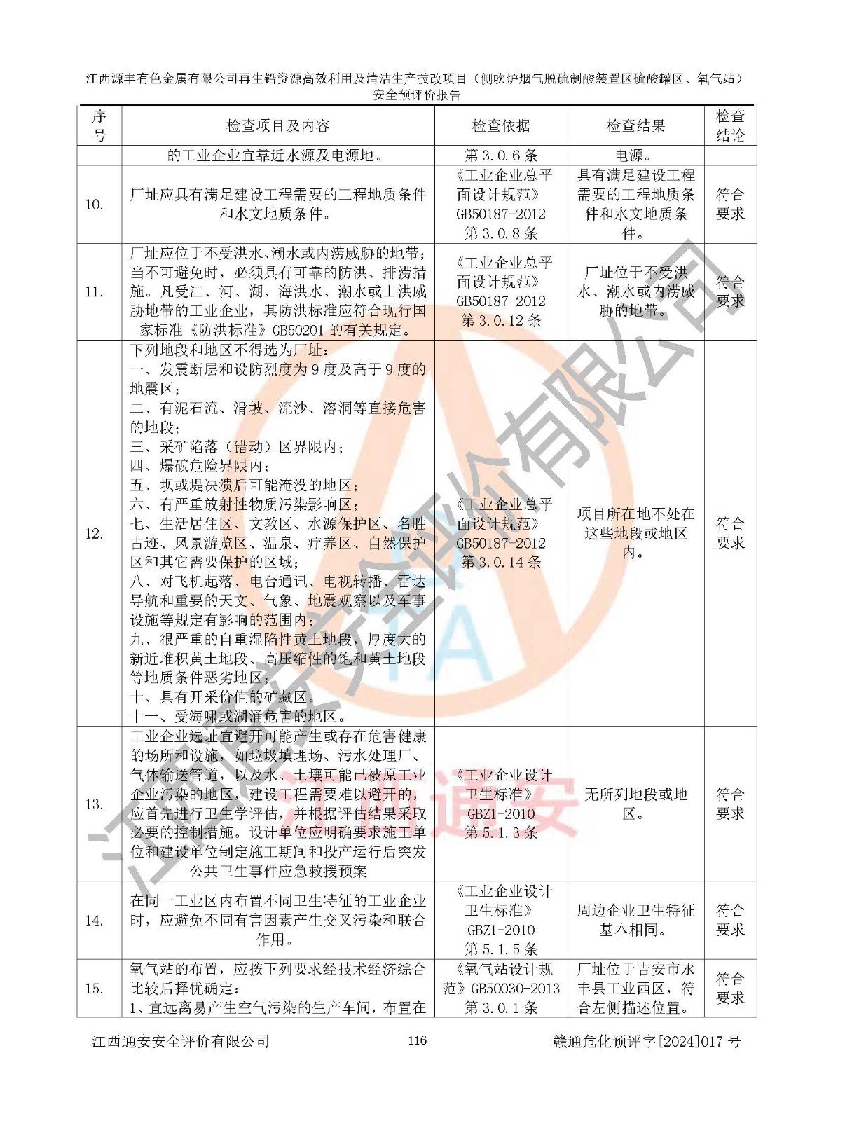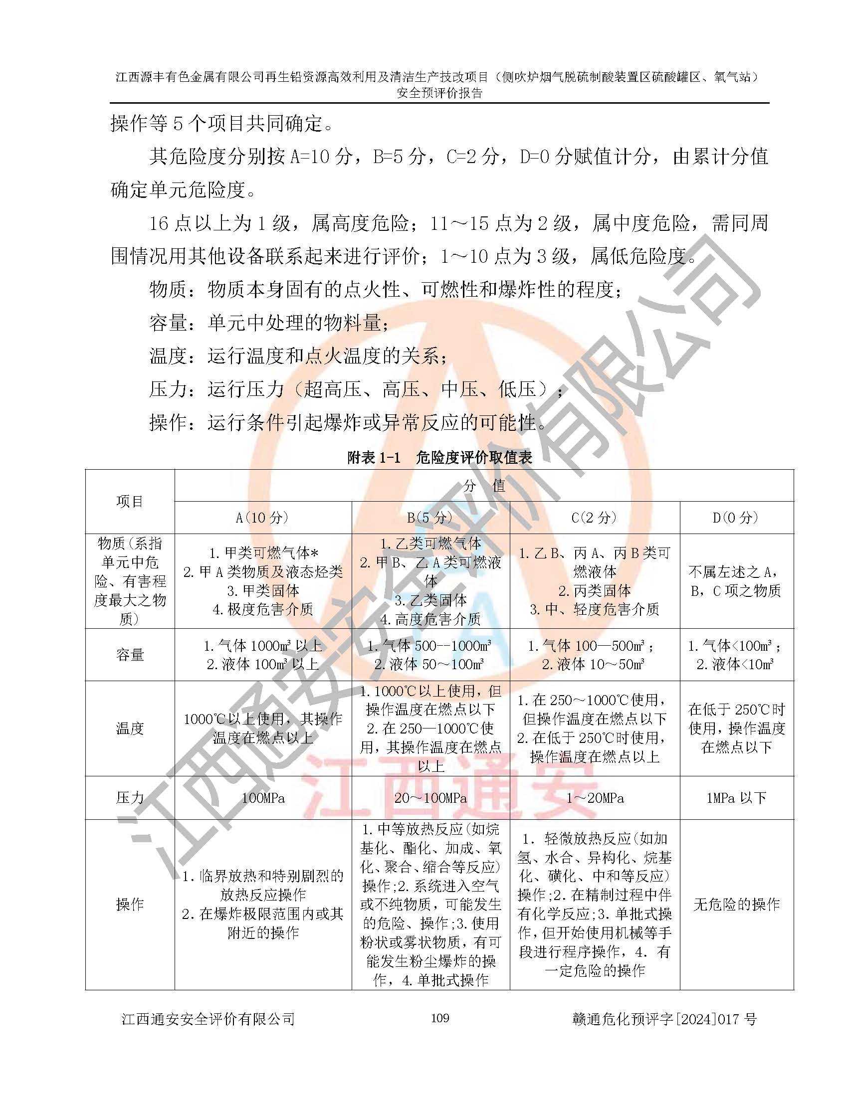 評(píng)價(jià)結(jié)論 | 評(píng)價(jià)結(jié)論:本評(píng)價(jià)認(rèn)為,江西源豐有色金屬有限公司再生鉛資源**利用及清潔生產(chǎn)技改項(xiàng)目(側(cè)吹爐煙氣脫硫制酸裝置區(qū)硫酸罐區(qū)、氧氣站)在以后的初步設(shè)計(jì)、施工圖設(shè)計(jì)和建設(shè)施工、安裝調(diào)試及生產(chǎn)運(yùn)行中,如能嚴(yán)格執(zhí)行**有關(guān)安全生產(chǎn)法律、法規(guī)和有關(guān)標(biāo)準(zhǔn)、規(guī)范,認(rèn)真采納本報(bào)告書第8章提出的安全對(duì)策措施及建議,真正做到安全設(shè)施與主體工程同時(shí)設(shè)計(jì)、同時(shí)施工、同時(shí)投入生產(chǎn)和使用的“三同時(shí)”工作,工程的危險(xiǎn)、有害因素可得到**控制,風(fēng)險(xiǎn)在可接受范圍內(nèi),具有**的本質(zhì)安全水平。該建設(shè)項(xiàng)目從安全方面分析可行。 | |||