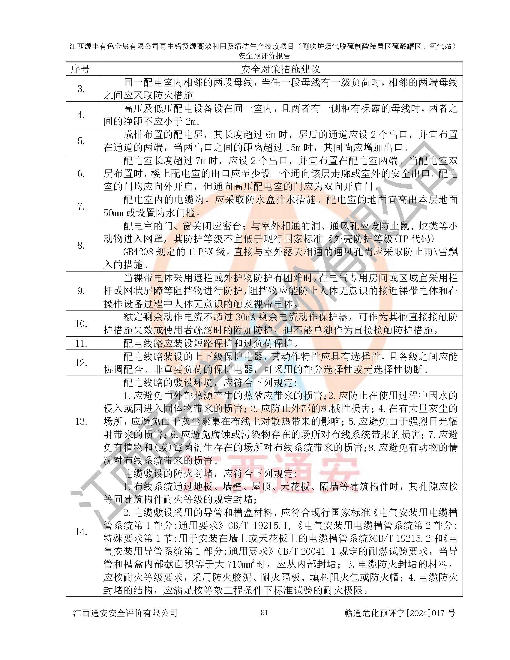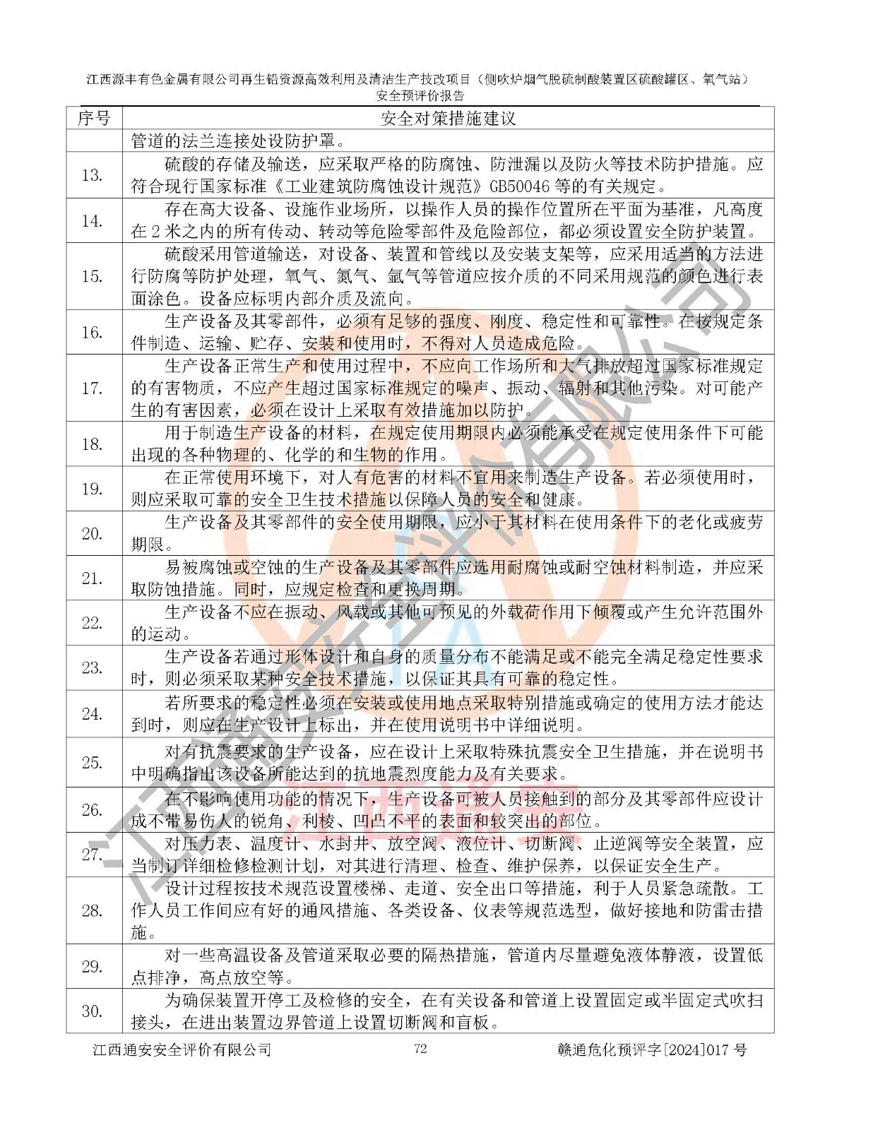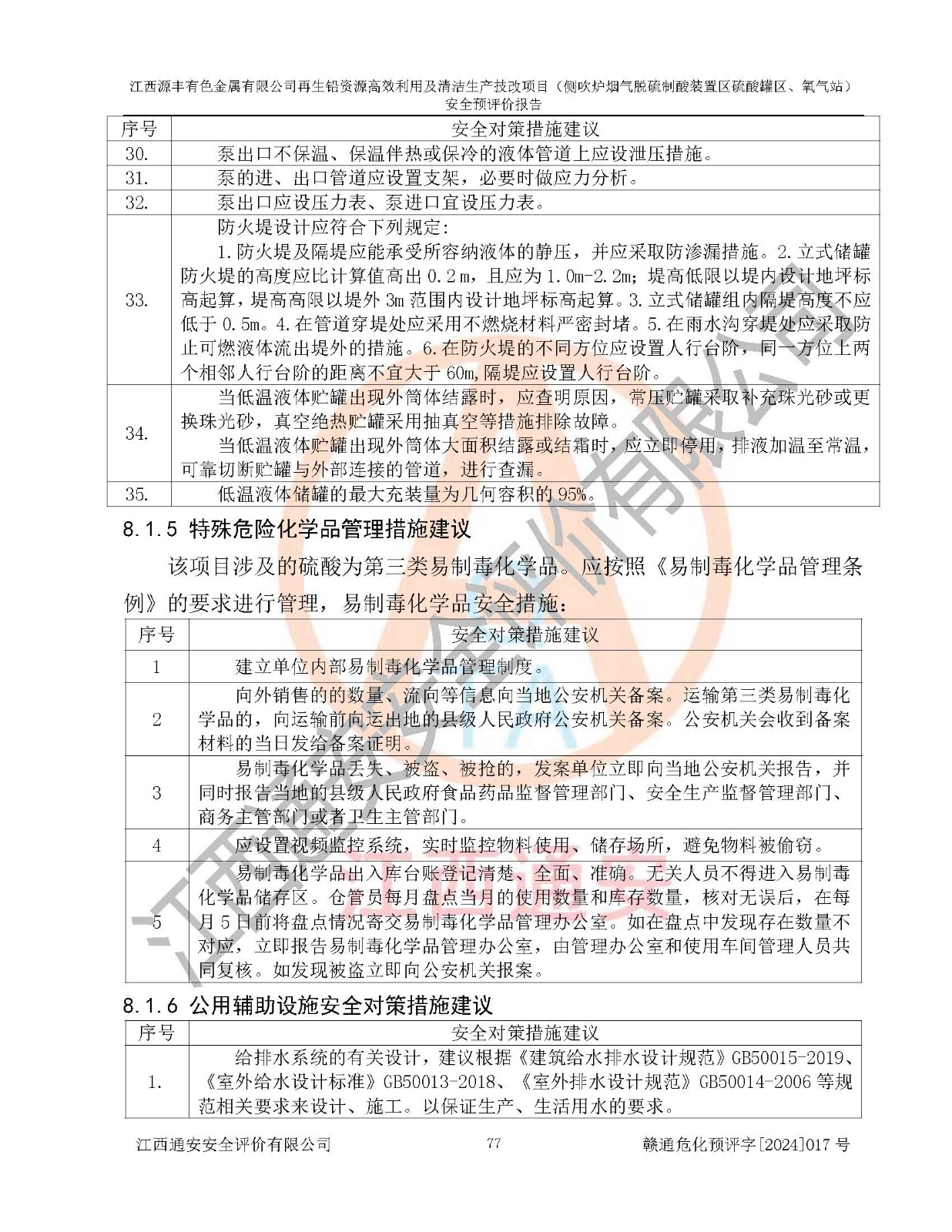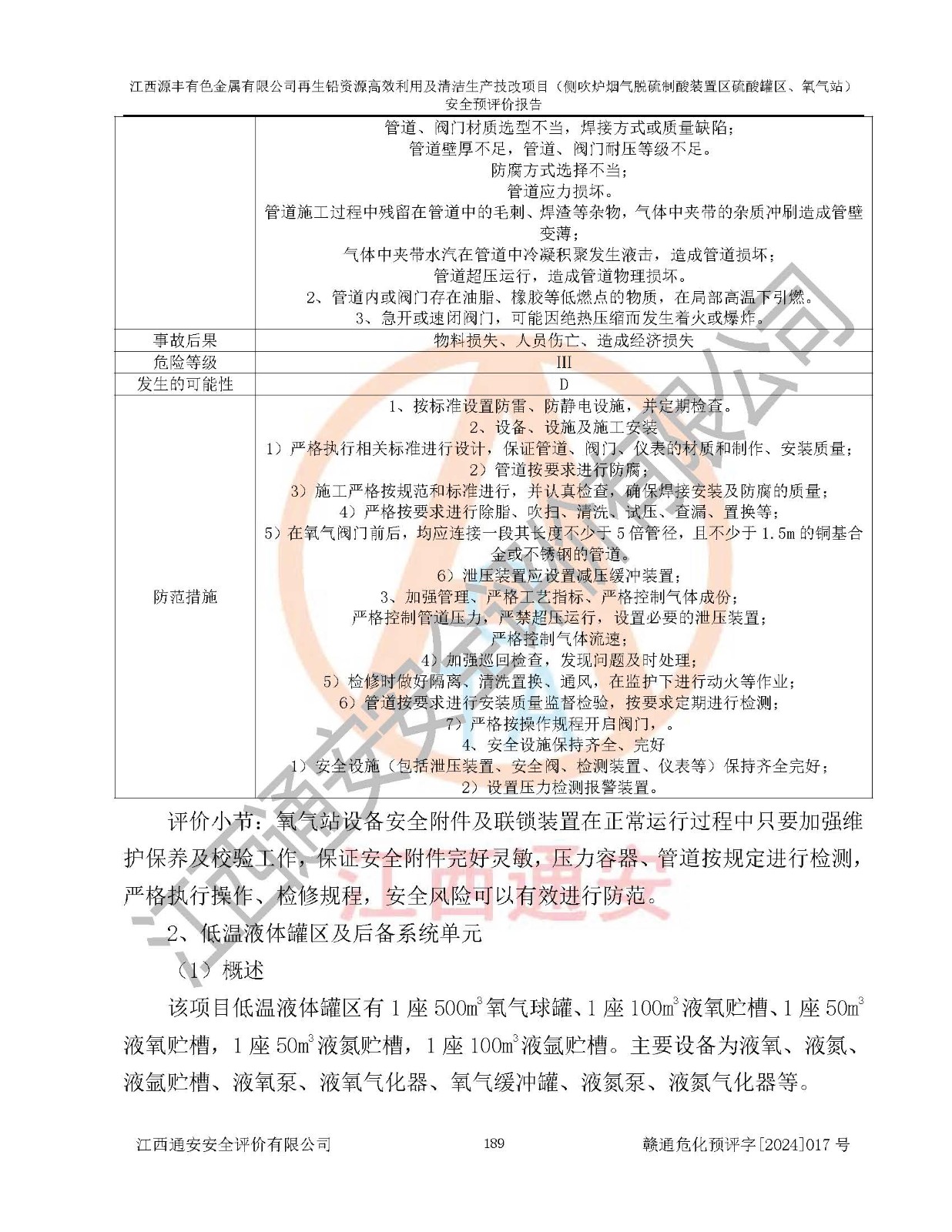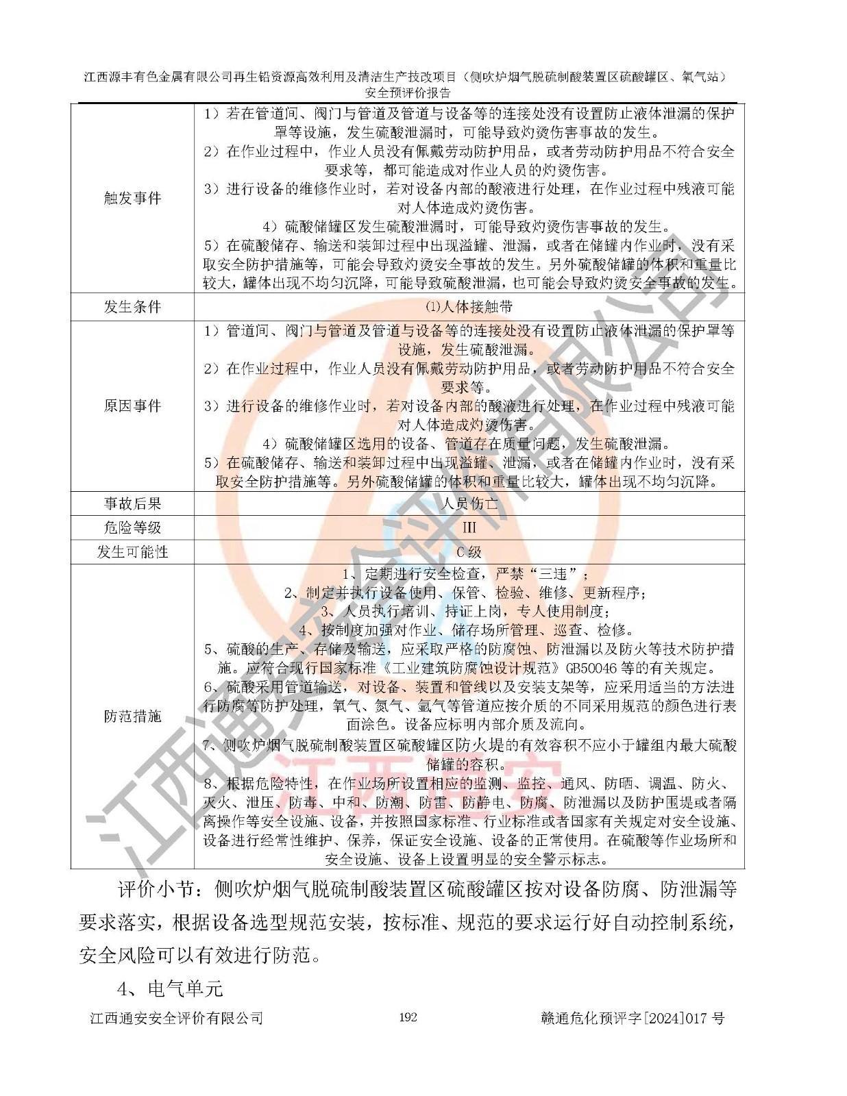 評(píng)價(jià)結(jié)論 | 評(píng)價(jià)結(jié)論:本評(píng)價(jià)認(rèn)為,江西源豐有色金屬有限公司再生鉛資源**利用及清潔生產(chǎn)技改項(xiàng)目(側(cè)吹爐煙氣脫硫制酸裝置區(qū)硫酸罐區(qū)、氧氣站)在以后的初步設(shè)計(jì)、施工圖設(shè)計(jì)和建設(shè)施工、安裝調(diào)試及生產(chǎn)運(yùn)行中,如能嚴(yán)格執(zhí)行**有關(guān)安全生產(chǎn)法律、法規(guī)和有關(guān)標(biāo)準(zhǔn)、規(guī)范,認(rèn)真采納本報(bào)告書第8章提出的安全對(duì)策措施及建議,真正做到安全設(shè)施與主體工程同時(shí)設(shè)計(jì)、同時(shí)施工、同時(shí)投入生產(chǎn)和使用的“三同時(shí)”工作,工程的危險(xiǎn)、有害因素可得到**控制,風(fēng)險(xiǎn)在可接受范圍內(nèi),具有**的本質(zhì)安全水平。該建設(shè)項(xiàng)目從安全方面分析可行。 | |||