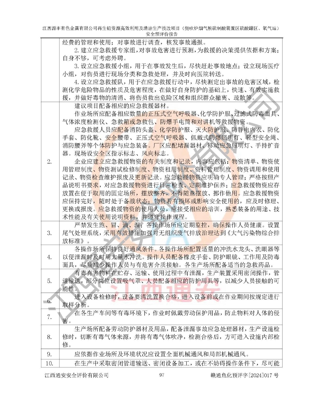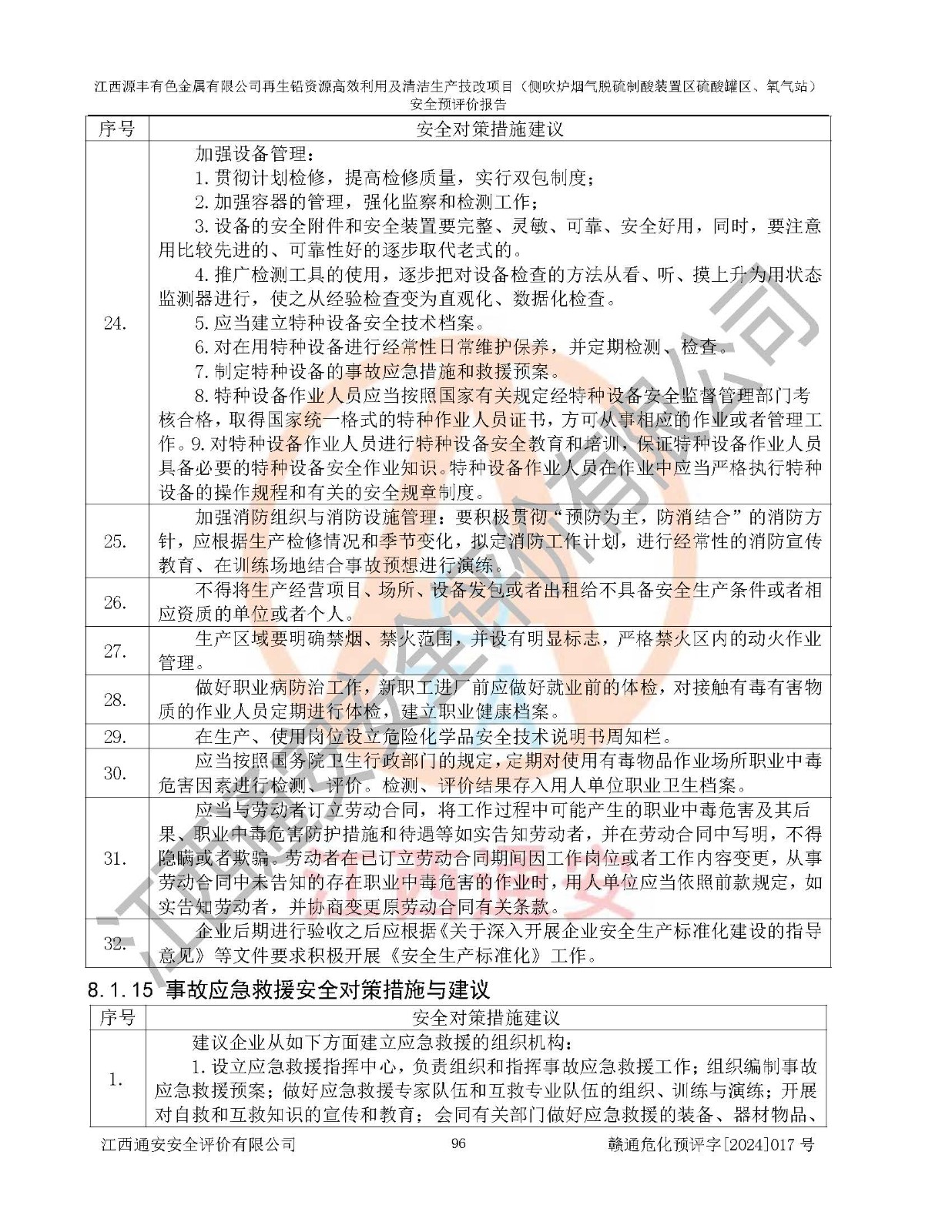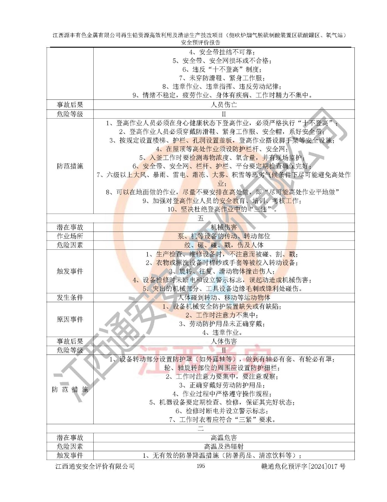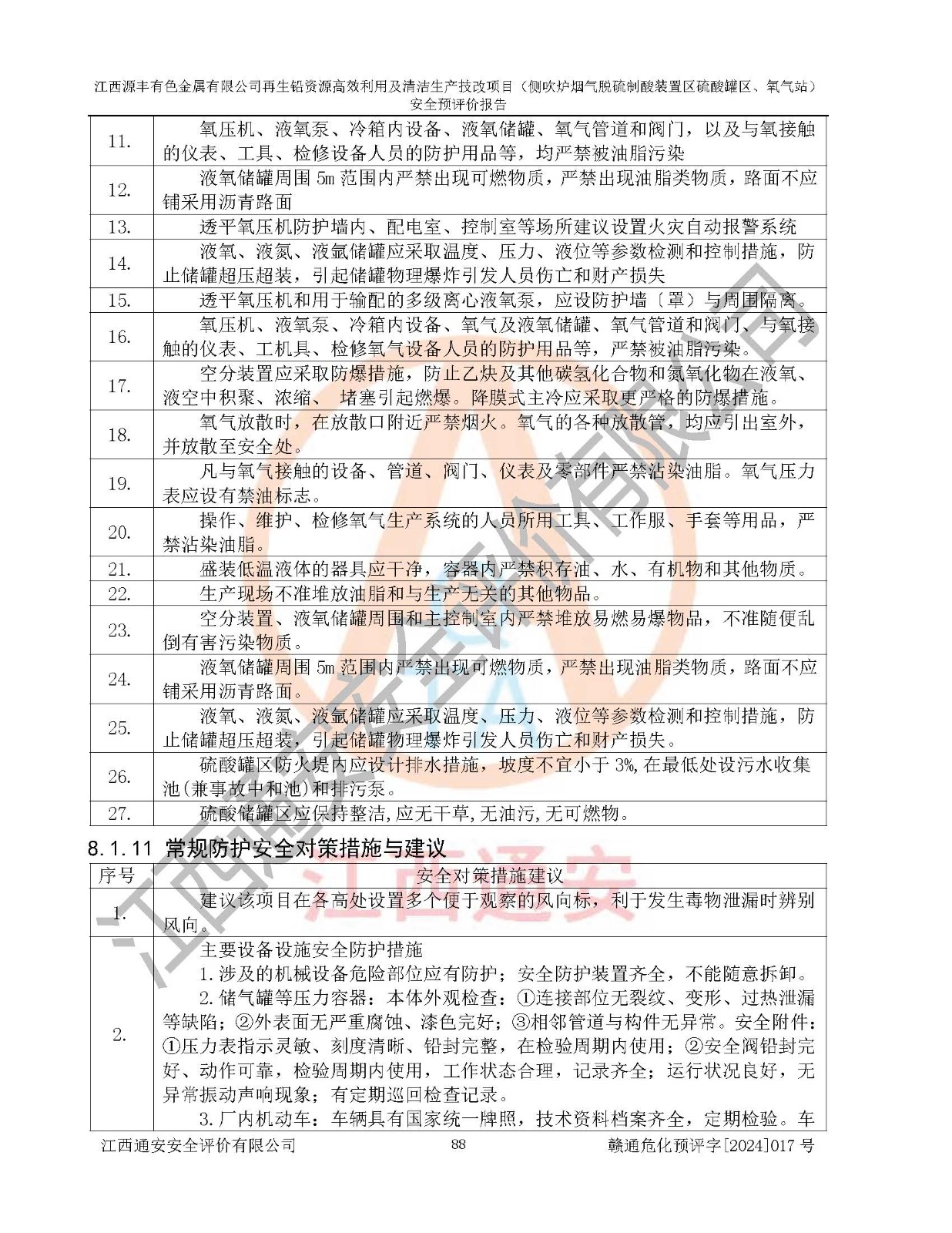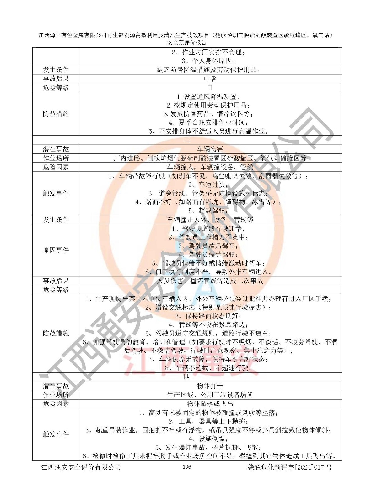 評(píng)價(jià)結(jié)論 | 評(píng)價(jià)結(jié)論:本評(píng)價(jià)認(rèn)為,江西源豐有色金屬有限公司再生鉛資源**利用及清潔生產(chǎn)技改項(xiàng)目(側(cè)吹爐煙氣脫硫制酸裝置區(qū)硫酸罐區(qū)、氧氣站)在以后的初步設(shè)計(jì)、施工圖設(shè)計(jì)和建設(shè)施工、安裝調(diào)試及生產(chǎn)運(yùn)行中,如能嚴(yán)格執(zhí)行**有關(guān)安全生產(chǎn)法律、法規(guī)和有關(guān)標(biāo)準(zhǔn)、規(guī)范,認(rèn)真采納本報(bào)告書第8章提出的安全對(duì)策措施及建議,真正做到安全設(shè)施與主體工程同時(shí)設(shè)計(jì)、同時(shí)施工、同時(shí)投入生產(chǎn)和使用的“三同時(shí)”工作,工程的危險(xiǎn)、有害因素可得到**控制,風(fēng)險(xiǎn)在可接受范圍內(nèi),具有**的本質(zhì)安全水平。該建設(shè)項(xiàng)目從安全方面分析可行。 | |||