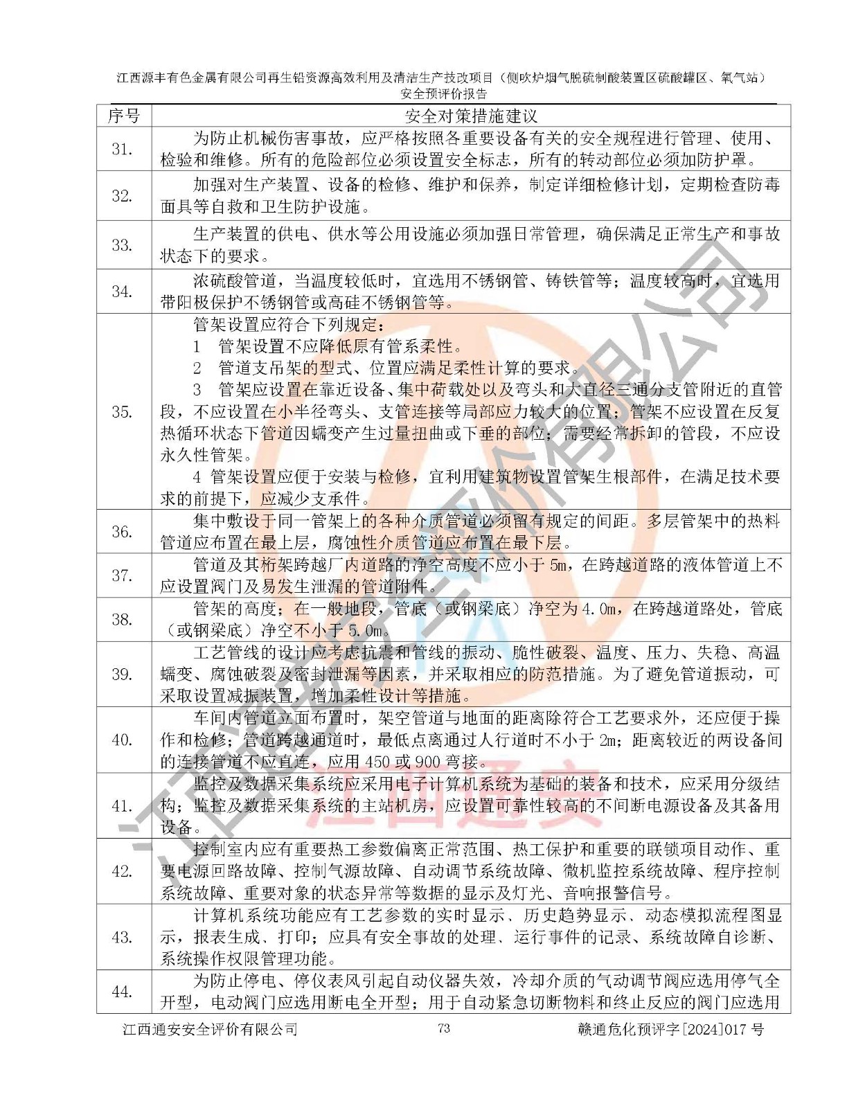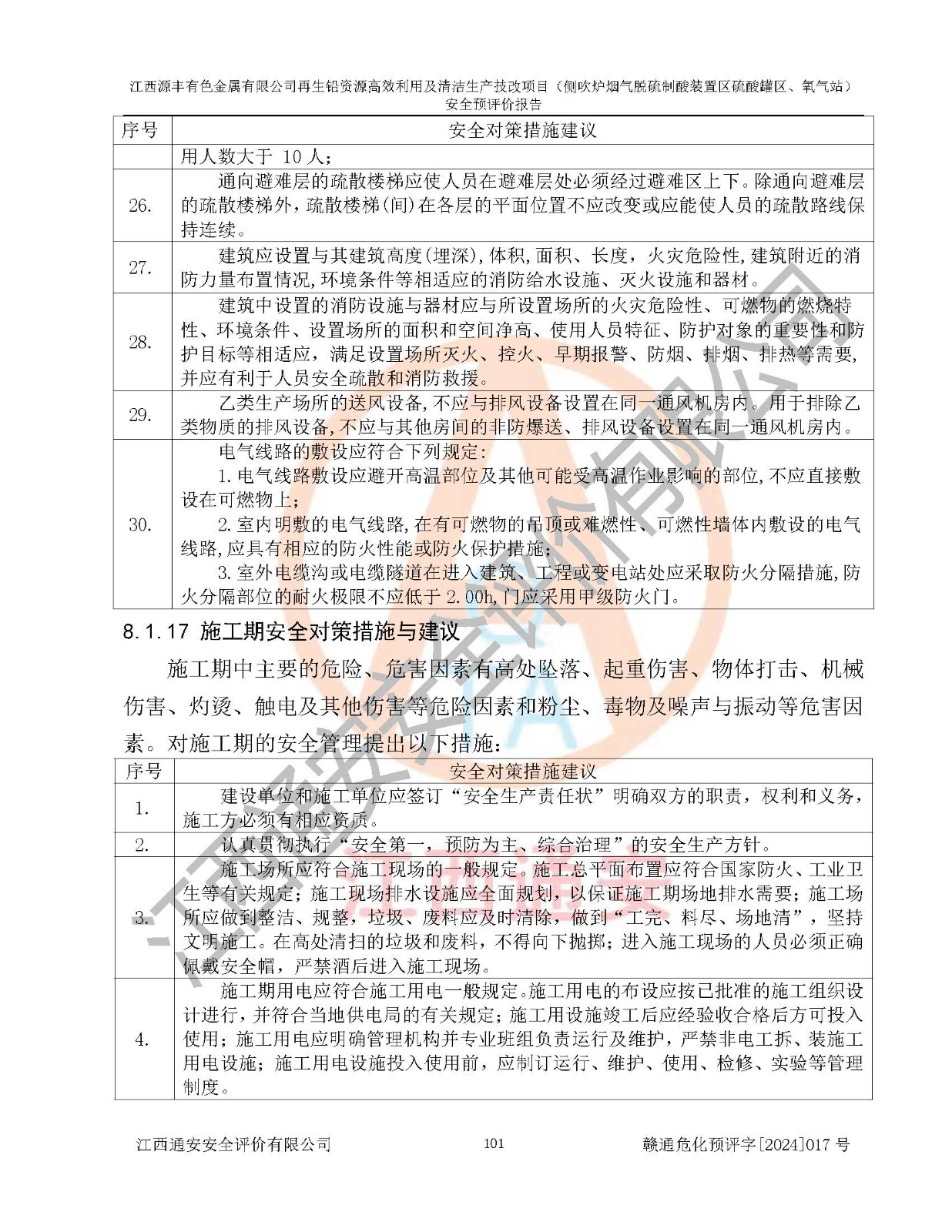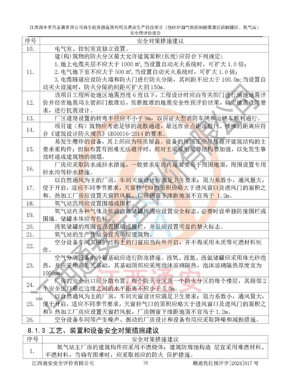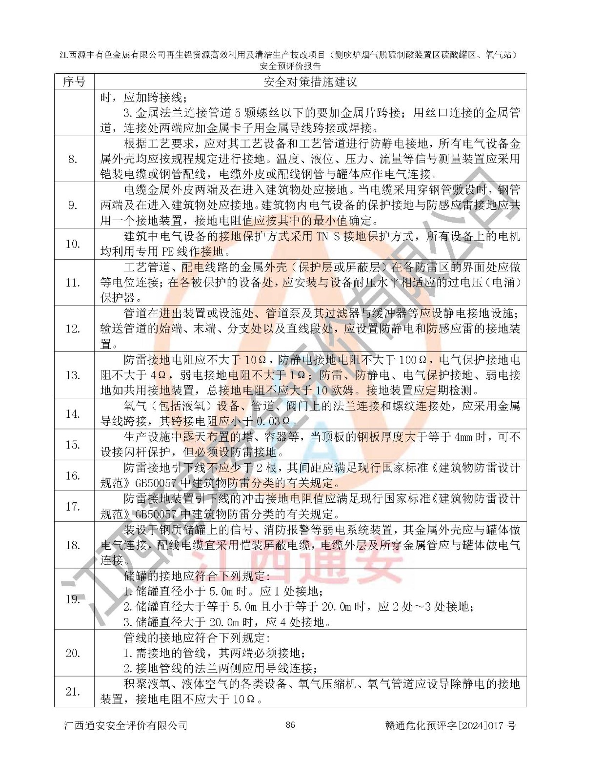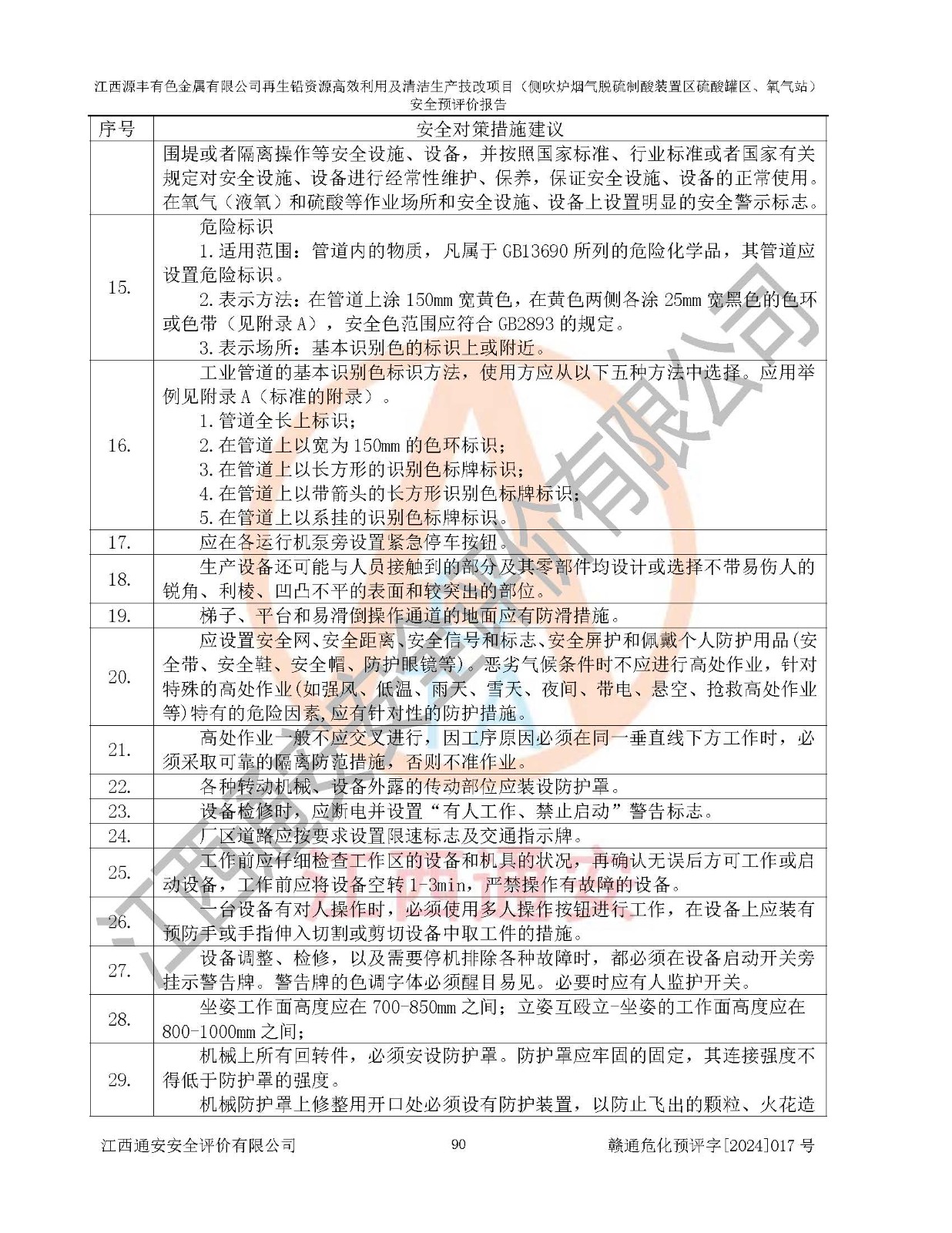 評(píng)價(jià)結(jié)論 | 評(píng)價(jià)結(jié)論:本評(píng)價(jià)認(rèn)為,江西源豐有色金屬有限公司再生鉛資源**利用及清潔生產(chǎn)技改項(xiàng)目(側(cè)吹爐煙氣脫硫制酸裝置區(qū)硫酸罐區(qū)、氧氣站)在以后的初步設(shè)計(jì)、施工圖設(shè)計(jì)和建設(shè)施工、安裝調(diào)試及生產(chǎn)運(yùn)行中,如能嚴(yán)格執(zhí)行**有關(guān)安全生產(chǎn)法律、法規(guī)和有關(guān)標(biāo)準(zhǔn)、規(guī)范,認(rèn)真采納本報(bào)告書第8章提出的安全對(duì)策措施及建議,真正做到安全設(shè)施與主體工程同時(shí)設(shè)計(jì)、同時(shí)施工、同時(shí)投入生產(chǎn)和使用的“三同時(shí)”工作,工程的危險(xiǎn)、有害因素可得到**控制,風(fēng)險(xiǎn)在可接受范圍內(nèi),具有**的本質(zhì)安全水平。該建設(shè)項(xiàng)目從安全方面分析可行。 | |||