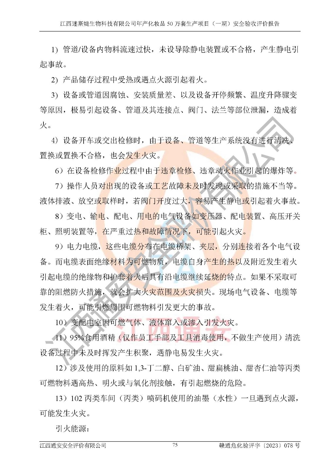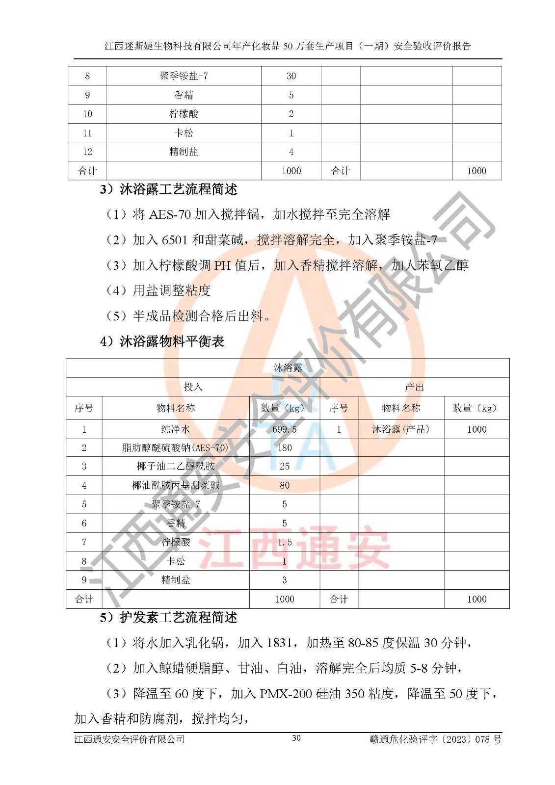 項(xiàng)目簡(jiǎn)介 | 江西迷斯婕生物科技有限公司于2019年5月30日成立,營(yíng)業(yè)期限:2019年5月30日至長(zhǎng)期。注冊(cè)資本伍佰萬(wàn)元整。類型:有限責(zé)任公司(自然人投資或控股),法定**人:陳其良。住所位于江西省吉安市吉水縣工業(yè)園二期林化香料基地(吉興路),經(jīng)營(yíng)范圍:生物科技技術(shù)研發(fā)、技術(shù)服務(wù);植物性天然香料、香精香料、化妝品、護(hù)膚精油、日化用品、保健按摩用品、洗滌用品、手工皂、煙具用品、消毒產(chǎn)品生產(chǎn)及銷售、林化產(chǎn)品、日化原料銷售及網(wǎng)上貿(mào)易代理;貿(mào)易進(jìn)出口業(yè)務(wù)(依法須經(jīng)批準(zhǔn)的項(xiàng)目,經(jīng)相關(guān)部門(mén)批準(zhǔn)后方可開(kāi)展經(jīng)營(yíng)活動(dòng))。 江西迷斯婕生物科技有限公司于2019年6月21日取得吉水縣發(fā)展改革委員會(huì)的備案(項(xiàng)目代碼:2019-360822-26-03-012156),項(xiàng)目名稱:江西迷斯婕生物科技有限公司年產(chǎn)化妝品50萬(wàn)套生產(chǎn)項(xiàng)目,建設(shè)內(nèi)容及規(guī)模:廠房1棟,面積3451.85平米,辦公樓宿舍各1棟,面積2000平米,倉(cāng)庫(kù)2棟,面積1000平米,年產(chǎn)化妝品50萬(wàn)套。 根據(jù)《國(guó)民經(jīng)濟(jì)行業(yè)分類》GB/T4754-2017 、《國(guó)民經(jīng)濟(jì)行業(yè)分類》**標(biāo)準(zhǔn)第1號(hào)修改單 GB/T4754-2017/XG1-2019 對(duì)本項(xiàng)目進(jìn)行辨識(shí):本項(xiàng)目屬于化妝品制造〔C2682〕行業(yè)。 江西迷斯婕生物科技有限公司于2019年10月12日組織專家進(jìn)行評(píng)審,2019年10月30日由江西贛昌安全生產(chǎn)科技服務(wù)有限公司編制《江西迷斯婕生物科技有限公司年產(chǎn)化妝品50萬(wàn)套生產(chǎn)項(xiàng)目安全預(yù)評(píng)價(jià)報(bào)告》終稿。 江西迷斯婕生物科技有限公司于2021年5月26日組織專家進(jìn)行評(píng)審,2021年6月7日由山東鴻運(yùn)工程設(shè)計(jì)有限公司編制《江西迷斯婕生物科技有限公司年產(chǎn)化妝品50萬(wàn)套生產(chǎn)項(xiàng)目安全設(shè)施設(shè)計(jì)》終稿。 江西迷斯婕生物科技有限公司在2023年12月26日將《江西迷斯婕生物科技有限公司年產(chǎn)化妝品50萬(wàn)套生產(chǎn)項(xiàng)目一期試生產(chǎn)方案》在吉水縣應(yīng)急管理局備案,進(jìn)入試生產(chǎn)階段,試生產(chǎn)的時(shí)間為2023年12月15日至2024年6月15日。在試生產(chǎn)期間,生產(chǎn)設(shè)施及公用設(shè)施能符合設(shè)計(jì)要求并本產(chǎn)品的正常運(yùn)轉(zhuǎn),同時(shí)各項(xiàng)應(yīng)急事故防護(hù)設(shè)備滿足生產(chǎn)安全需要,產(chǎn)品的生產(chǎn)工藝條件成熟、穩(wěn)定,所配套的生產(chǎn)設(shè)備運(yùn)轉(zhuǎn)良好,同時(shí)證明所配套的各種輔助系統(tǒng)及所有安全設(shè)施運(yùn)轉(zhuǎn)良好,試生產(chǎn)至今未發(fā)生生產(chǎn)事故。 該公司定員17人,專職安全管理人員1人。 江西迷斯婕生物科技有限公司年產(chǎn)化妝品50萬(wàn)套生產(chǎn)項(xiàng)目(一期)的主要原輔料為:1,3-丁二醇、VE醋酸酯、白礦油、苯氧乙醇、對(duì)羥基苯乙酮、甘油、瓜兒膠羥丙基氯化銨、PMX-200 硅油350粘度、PMX-0345、精制鹽、聚季銨鹽-7、聚氧乙烯氫化蓖麻油、聚氧乙烯硬酯醇醚、卡波姆、卡松、玫瑰花提取物、檸檬酸、檸檬提取物、羥苯丙酯、羥苯甲酯、羥乙基纖維素、三乙醇胺、鯨蠟硬脂醇、天竺葵提取物、甜扁桃油、甜杏仁油、透明質(zhì)酸鈉、烷基葡萄糖苷、香精、辛酸葵酸甘油酯、椰油酰胺丙基甜菜堿、椰子油二乙醇酰胺、依蘭提取物、硬脂基**基氯化銨、硬脂酸、硬脂酸單甘油酯、月桂基肌氨酸鈉、脂肪醇醚硫酸鈉、棕櫚酸異辛酯等;主要產(chǎn)品為200t/a洗發(fā)露、300t/a沐浴露、80t/a護(hù)發(fā)素、50t/a潤(rùn)膚霜、30t/a面膜、10t/a按摩油等6個(gè)產(chǎn)品。 該項(xiàng)目涉及95%食用酒精(僅作員工手部及工具消毒使用,不做生產(chǎn)使用)、柴油(發(fā)電機(jī)燃料)等危險(xiǎn)化學(xué)品。因此,在生產(chǎn)或使用過(guò)程中存在著火災(zāi)、中毒和窒息、灼燙等危險(xiǎn)性。 | ||||