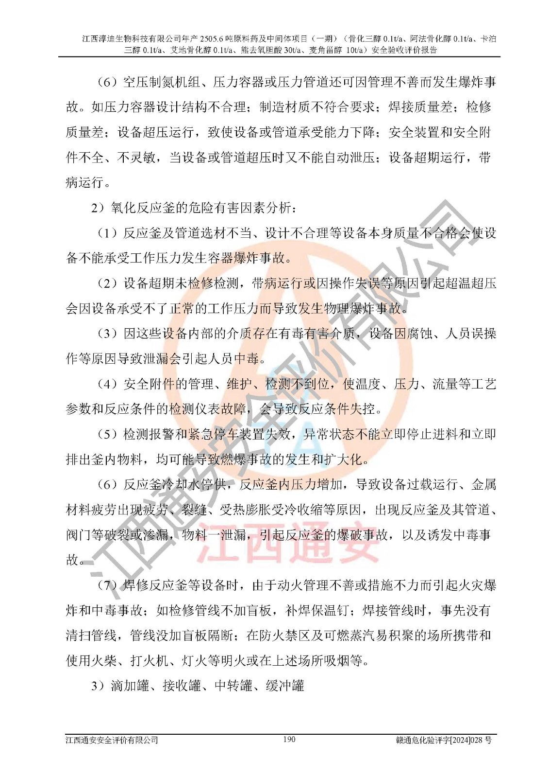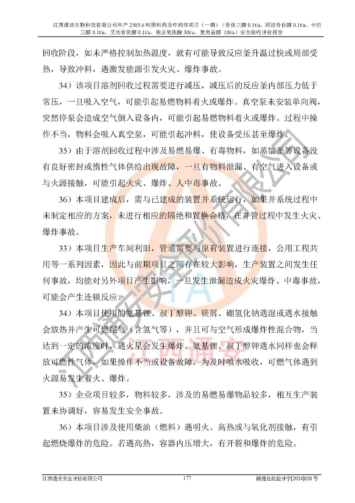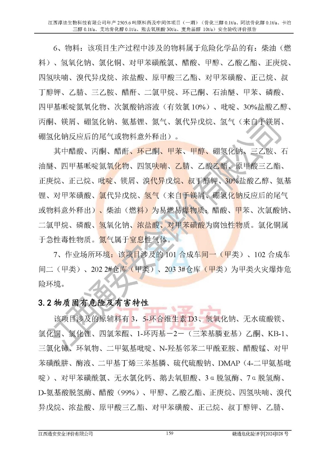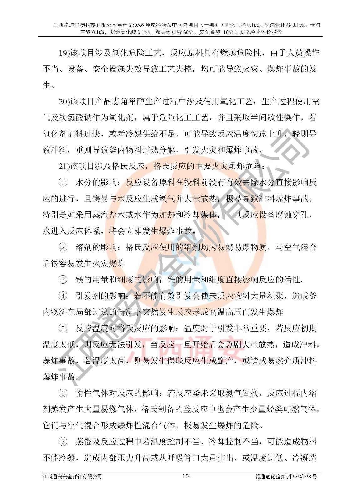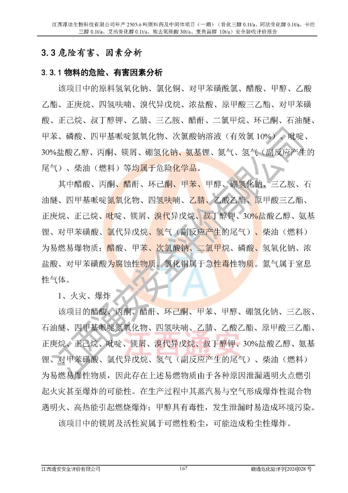 項目簡介 | 江西淳迪生物科技有限公司成立于2007年;2018年5月11日,為了適應市場需求和企業(yè)發(fā)展,該公司更名為江西神田生物科技有限公司。2021年4月14日,該公司再次更名為江西淳迪生物科技有限公司。 江西淳迪生物科技有限公司位于江西省**井岡山經濟技術開發(fā)區(qū),成立于2007年4月24日,并取得吉安市市場監(jiān)督管理局井岡山經濟技術開發(fā)區(qū)分局頒發(fā)的營業(yè)執(zhí)照,注冊資本叁仟萬元整,法定**人吳哲華,公司類型為其他有限責任公司,統(tǒng)一社會信用代碼:913608057994888273,經營范圍:許可項目:藥品生產,飼料生產,飼料添加劑生產,食品添加劑生產,獸藥生產(依法須經批準的項目,經相關部門批準后方可開展經營活動)一般項目:進出口代理,技術進出口,貨物進出口,**化學產品制造(不含危險化學品),生物飼料研發(fā),生物化工產品技術研發(fā),畜牧漁業(yè)飼料銷售,飼料添加劑銷售,食品添加劑銷售,飼料原料銷售(除許可業(yè)務外,可自主依法經營法律法規(guī)非禁止或限制的項目)。 江西神田生物科技有限公司于2020年11月11日取得江西省企業(yè)投資項目備案通知書,備案項目名稱:年產2505.6噸原料藥及中間體項目,項目統(tǒng)一代碼:2020-360861-27-03-012513。因江西神田生物科技有限公司于2021年4月14日將公司名稱變更為江西淳迪生物科技有限公司,2021年11月5日。江西淳迪生物科技有限公司將“年產2505.6噸原料藥及中間體項目”信息變更情況告知備案機關,并對備案內容進行修改,重新取得江西省企業(yè)投資項目備案通知書,備案項目名稱:年產2505.6噸原料藥及中間體項目,統(tǒng)一項目代碼:2111-360861-04-05-321685,項目總投資額30000萬元(3億元)。 江西淳迪生物科技有限公司于2021年4月委托江西贛安安全生產科學技術咨詢服務中心編制《江西淳迪生物科技有限公司年產2505.6噸原料藥及中間體項目(一期)安全條件評價報告》并于2021年6月23日通過了吉安市應急管理局組織的安全條件評價審查,審查通過后出具危險化學品建設項目安全條件評價審查意見書(編號為:吉市危化項目安條審字〔2021〕6號)。 江西淳迪生物科技有限公司于2022年12月委托廣東政和工程有限公司編制《江西淳迪生物科技有限公司年產2505.6噸原料藥及中間體項目(一期)安全設施設計》并于2023年2月3日通過了吉安市應急管理局組織的安全設施設計審查,審查通過后出具危險化學品建設項目安全設施設計審查意見書(編號為:吉市?;椖堪苍O審字〔2023〕2號)。 江西淳迪生物科技有限公司于2023年9月5日向井岡山經濟技術開發(fā)區(qū)應急管理局提交了《江西淳迪生物科技有限公司年產2505.6噸原料藥及中間體項目(一期:骨化三醇0.1t/a、阿法骨化醇0.1t/a、卡泊三醇0.1t/a、艾地骨化醇0.1t/a、地屈孕酮5t/a、熊去氧膽酸30t/a、麥角甾醇 10t/a)試生產方案》并取得井岡山經濟技術開發(fā)區(qū)應急管理局出具的《危險化學品建設項目試生產(使用)方案回執(zhí)》(回執(zhí)編號為:井開?;椖總渥帧?/span>2023〕04號),試生產的時間為2023年09月08日至2024年09月07日。 該工程涉及的氫氧化鈉、氯化銅、對甲苯磺酰氯、醋酸、甲醇、乙酸乙酯、正庚烷、四氫呋喃、溴代異戊烷、濃鹽酸、原甲酸三乙酯、對甲苯磺酸、正己烷、叔丁醇鉀、乙腈、三乙胺、醋酐、二氯甲烷、環(huán)己酮、石油醚、甲苯、磷酸、四甲基哌啶氮氧化物、次氯酸鈉溶液(**氯10%)、吡啶、30%鹽酸乙醇、**、鎂屑、硼氫化鈉、氨基鋰、氮氣、氯代異戊烷、氫氣(來自于鎂屑、硼氫化鈉反應后的尾氣或物料意外釋出)屬于危險化學品。其中**(第三類)、醋酐(第二類)、甲苯(第三類)、濃鹽酸(第三類)為易制毒化學品。甲苯、甲醇、乙酸乙酯、氫氣(來自于鎂屑、硼氫化鈉反應后的尾氣或物料意外釋出)屬于重點監(jiān)管的危險化學品。硼氫化鈉、鎂屑屬于易制爆危險化學品。甲醇屬于特別管控危險化學品。 該項目101合成車間一(反應釜U1-R20)及102合成車間二(反應釜U3-R05)麥角甾醇的氧化反應生產步驟涉及的氧化工藝屬于重點監(jiān)管的危險化工工藝。該項目中間體膽固醇的偶聯(lián)反應生產工序及骨化三醇中間體25-羥基脫氫膽固醇的偶聯(lián)反應生產工序涉及的格氏反應,參照重點監(jiān)管的危險化工工藝進行管控。 本項目生產單元和儲存設施單元不構成危險化學品重大危險源。 | |||