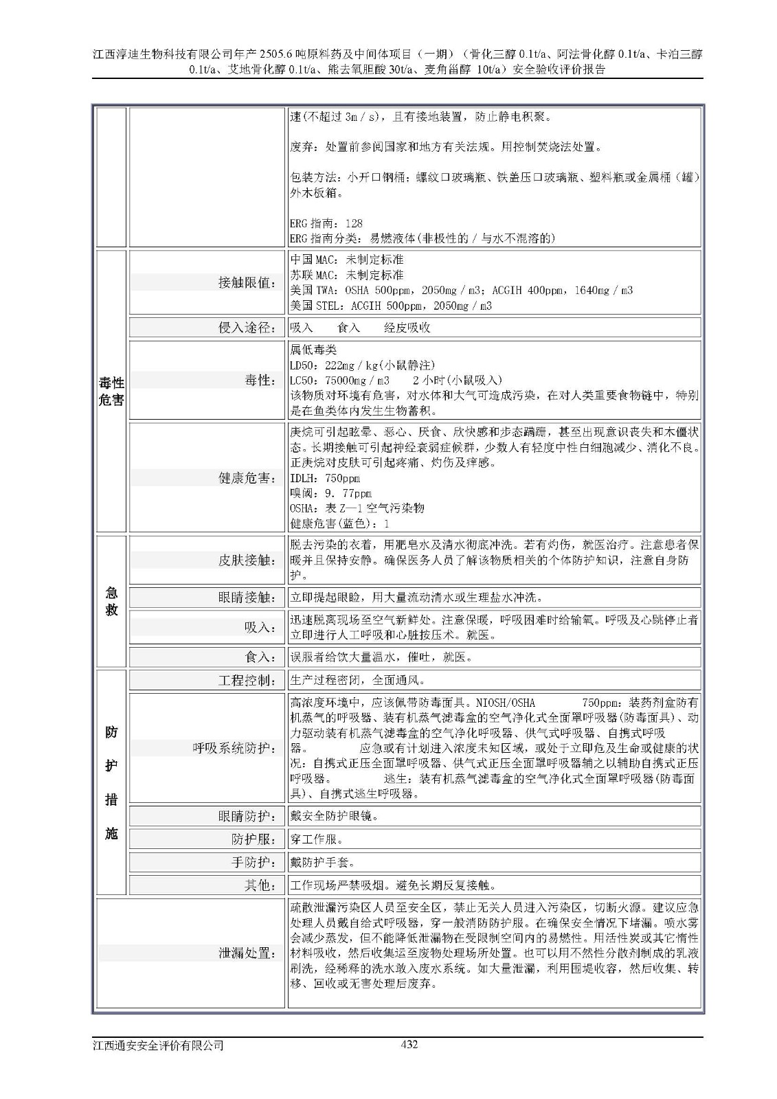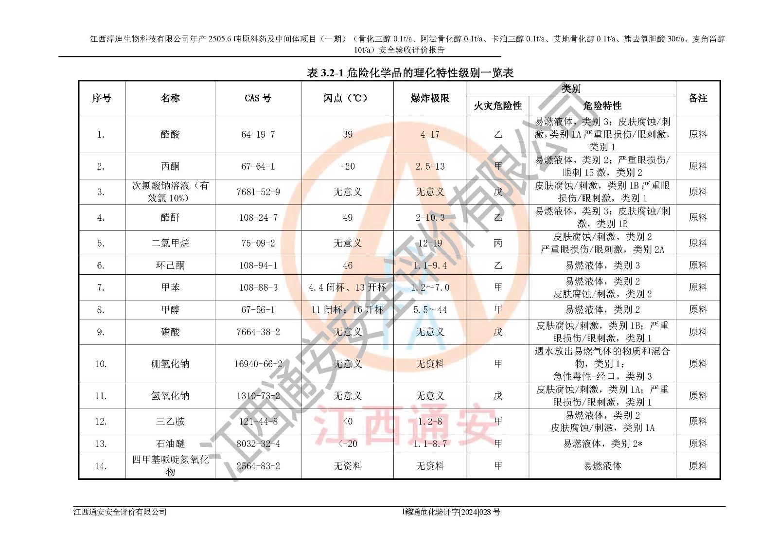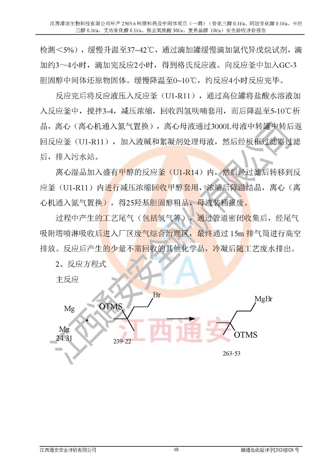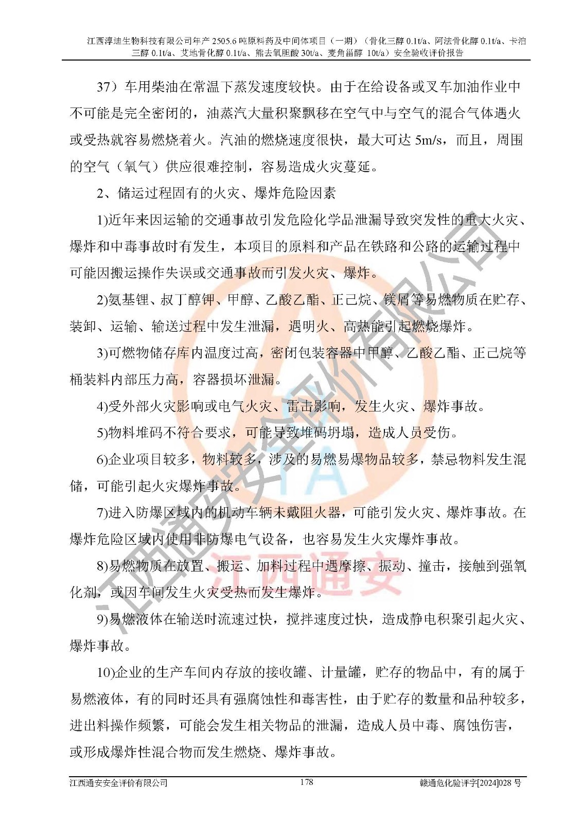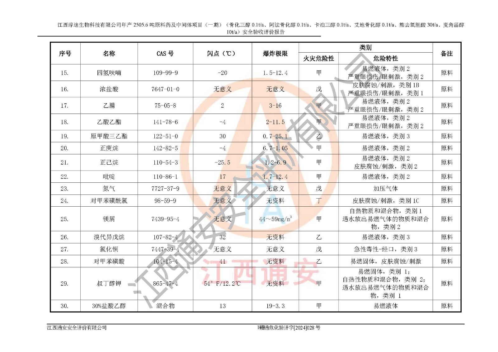 項目簡介 | 江西淳迪生物科技有限公司成立于2007年;2018年5月11日,為了適應市場需求和企業(yè)發(fā)展,該公司更名為江西神田生物科技有限公司。2021年4月14日,該公司再次更名為江西淳迪生物科技有限公司。 江西淳迪生物科技有限公司位于江西省**井岡山經濟技術開發(fā)區(qū),成立于2007年4月24日,并取得吉安市市場監(jiān)督管理局井岡山經濟技術開發(fā)區(qū)分局頒發(fā)的營業(yè)執(zhí)照,注冊資本叁仟萬元整,法定**人吳哲華,公司類型為其他有限責任公司,統(tǒng)一社會信用代碼:913608057994888273,經營范圍:許可項目:藥品生產,飼料生產,飼料添加劑生產,食品添加劑生產,獸藥生產(依法須經批準的項目,經相關部門批準后方可開展經營活動)一般項目:進出口代理,技術進出口,貨物進出口,**化學產品制造(不含危險化學品),生物飼料研發(fā),生物化工產品技術研發(fā),畜牧漁業(yè)飼料銷售,飼料添加劑銷售,食品添加劑銷售,飼料原料銷售(除許可業(yè)務外,可自主依法經營法律法規(guī)非禁止或限制的項目)。 江西神田生物科技有限公司于2020年11月11日取得江西省企業(yè)投資項目備案通知書,備案項目名稱:年產2505.6噸原料藥及中間體項目,項目統(tǒng)一代碼:2020-360861-27-03-012513。因江西神田生物科技有限公司于2021年4月14日將公司名稱變更為江西淳迪生物科技有限公司,2021年11月5日。江西淳迪生物科技有限公司將“年產2505.6噸原料藥及中間體項目”信息變更情況告知備案機關,并對備案內容進行修改,重新取得江西省企業(yè)投資項目備案通知書,備案項目名稱:年產2505.6噸原料藥及中間體項目,統(tǒng)一項目代碼:2111-360861-04-05-321685,項目總投資額30000萬元(3億元)。 江西淳迪生物科技有限公司于2021年4月委托江西贛安安全生產科學技術咨詢服務中心編制《江西淳迪生物科技有限公司年產2505.6噸原料藥及中間體項目(一期)安全條件評價報告》并于2021年6月23日通過了吉安市應急管理局組織的安全條件評價審查,審查通過后出具危險化學品建設項目安全條件評價審查意見書(編號為:吉市危化項目安條審字〔2021〕6號)。 江西淳迪生物科技有限公司于2022年12月委托廣東政和工程有限公司編制《江西淳迪生物科技有限公司年產2505.6噸原料藥及中間體項目(一期)安全設施設計》并于2023年2月3日通過了吉安市應急管理局組織的安全設施設計審查,審查通過后出具危險化學品建設項目安全設施設計審查意見書(編號為:吉市?;椖堪苍O審字〔2023〕2號)。 江西淳迪生物科技有限公司于2023年9月5日向井岡山經濟技術開發(fā)區(qū)應急管理局提交了《江西淳迪生物科技有限公司年產2505.6噸原料藥及中間體項目(一期:骨化三醇0.1t/a、阿法骨化醇0.1t/a、卡泊三醇0.1t/a、艾地骨化醇0.1t/a、地屈孕酮5t/a、熊去氧膽酸30t/a、麥角甾醇 10t/a)試生產方案》并取得井岡山經濟技術開發(fā)區(qū)應急管理局出具的《危險化學品建設項目試生產(使用)方案回執(zhí)》(回執(zhí)編號為:井開?;椖總渥帧?/span>2023〕04號),試生產的時間為2023年09月08日至2024年09月07日。 該工程涉及的氫氧化鈉、氯化銅、對甲苯磺酰氯、醋酸、甲醇、乙酸乙酯、正庚烷、四氫呋喃、溴代異戊烷、濃鹽酸、原甲酸三乙酯、對甲苯磺酸、正己烷、叔丁醇鉀、乙腈、三乙胺、醋酐、二氯甲烷、環(huán)己酮、石油醚、甲苯、磷酸、四甲基哌啶氮氧化物、次氯酸鈉溶液(**氯10%)、吡啶、30%鹽酸乙醇、**、鎂屑、硼氫化鈉、氨基鋰、氮氣、氯代異戊烷、氫氣(來自于鎂屑、硼氫化鈉反應后的尾氣或物料意外釋出)屬于危險化學品。其中**(第三類)、醋酐(第二類)、甲苯(第三類)、濃鹽酸(第三類)為易制毒化學品。甲苯、甲醇、乙酸乙酯、氫氣(來自于鎂屑、硼氫化鈉反應后的尾氣或物料意外釋出)屬于重點監(jiān)管的危險化學品。硼氫化鈉、鎂屑屬于易制爆危險化學品。甲醇屬于特別管控危險化學品。 該項目101合成車間一(反應釜U1-R20)及102合成車間二(反應釜U3-R05)麥角甾醇的氧化反應生產步驟涉及的氧化工藝屬于重點監(jiān)管的危險化工工藝。該項目中間體膽固醇的偶聯(lián)反應生產工序及骨化三醇中間體25-羥基脫氫膽固醇的偶聯(lián)反應生產工序涉及的格氏反應,參照重點監(jiān)管的危險化工工藝進行管控。 本項目生產單元和儲存設施單元不構成危險化學品重大危險源。 | |||