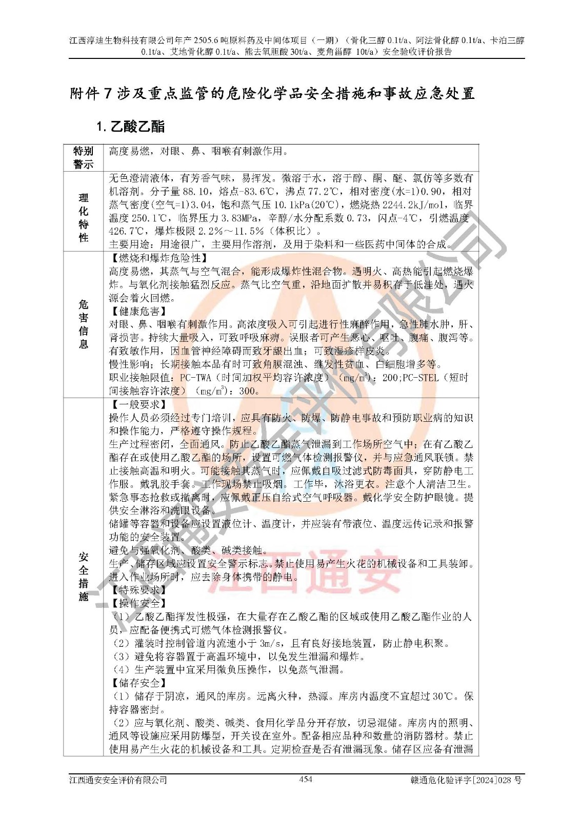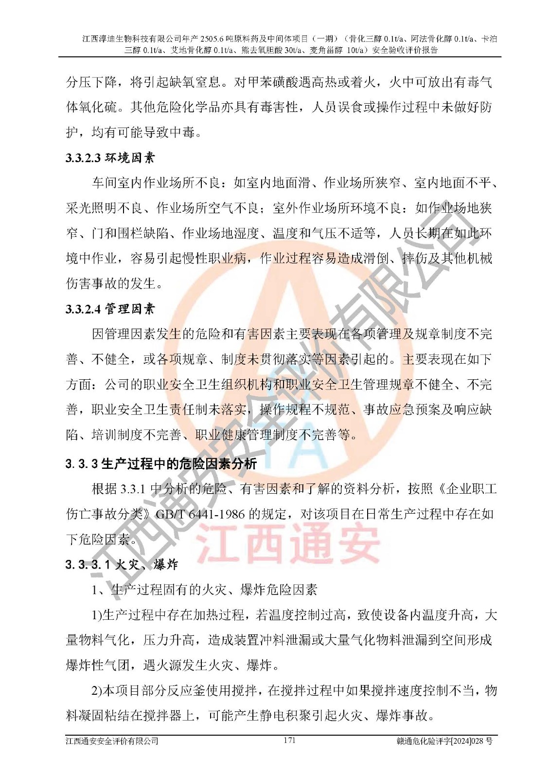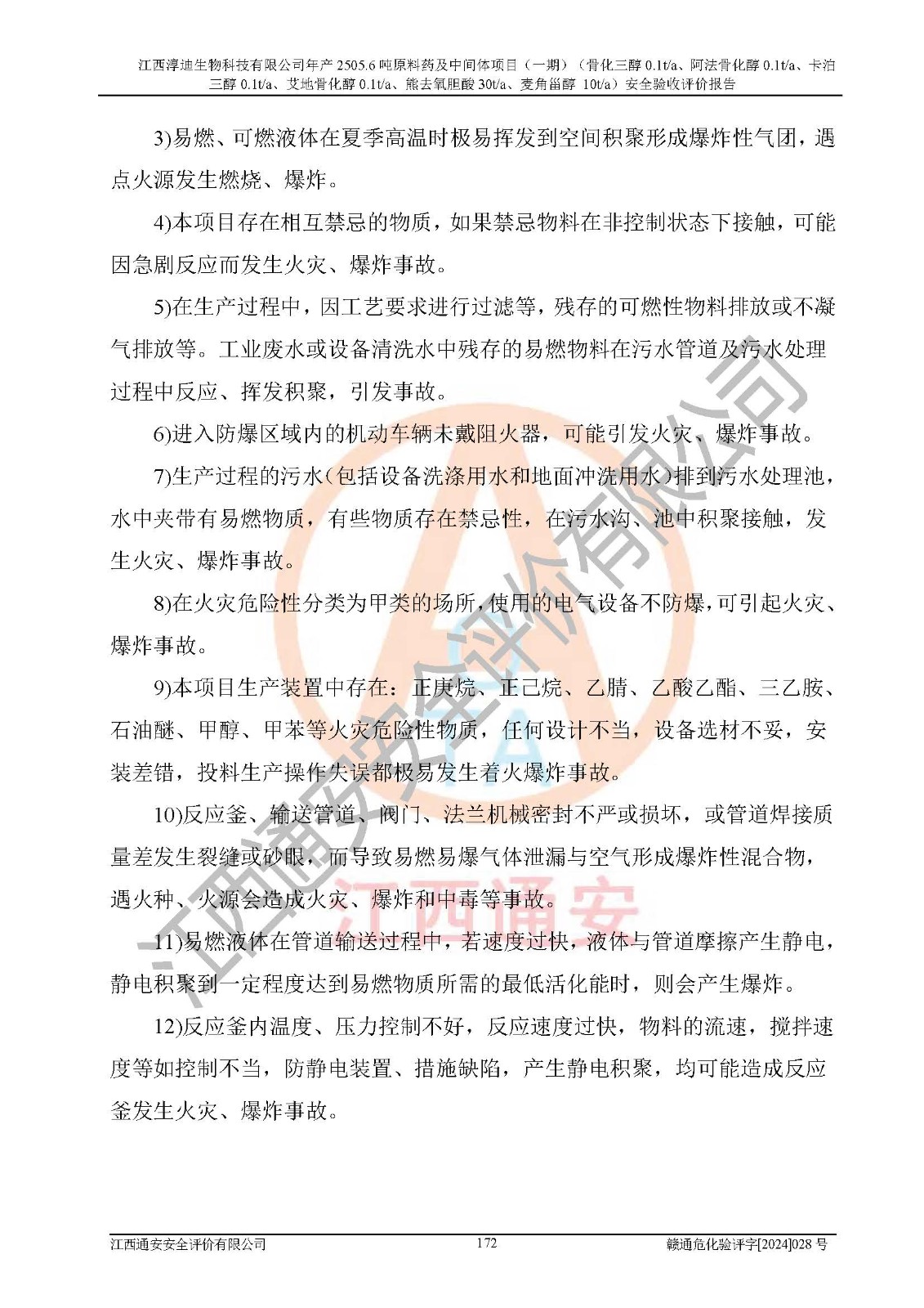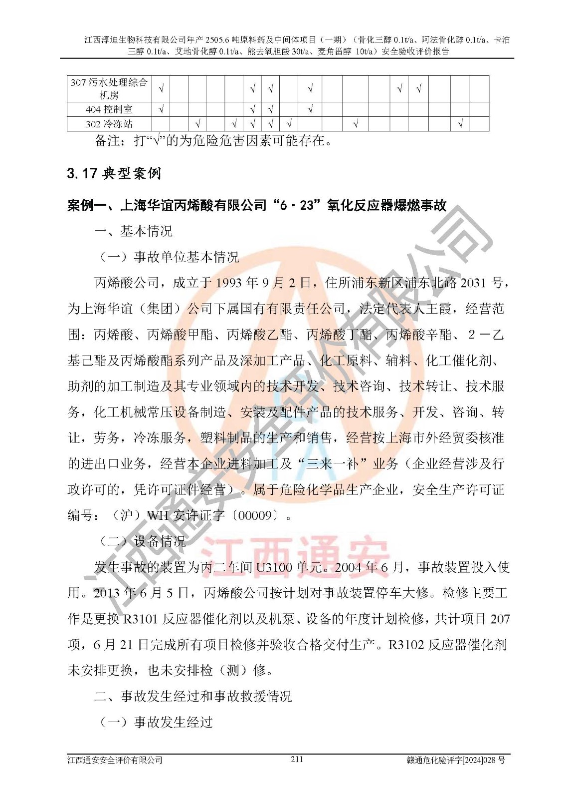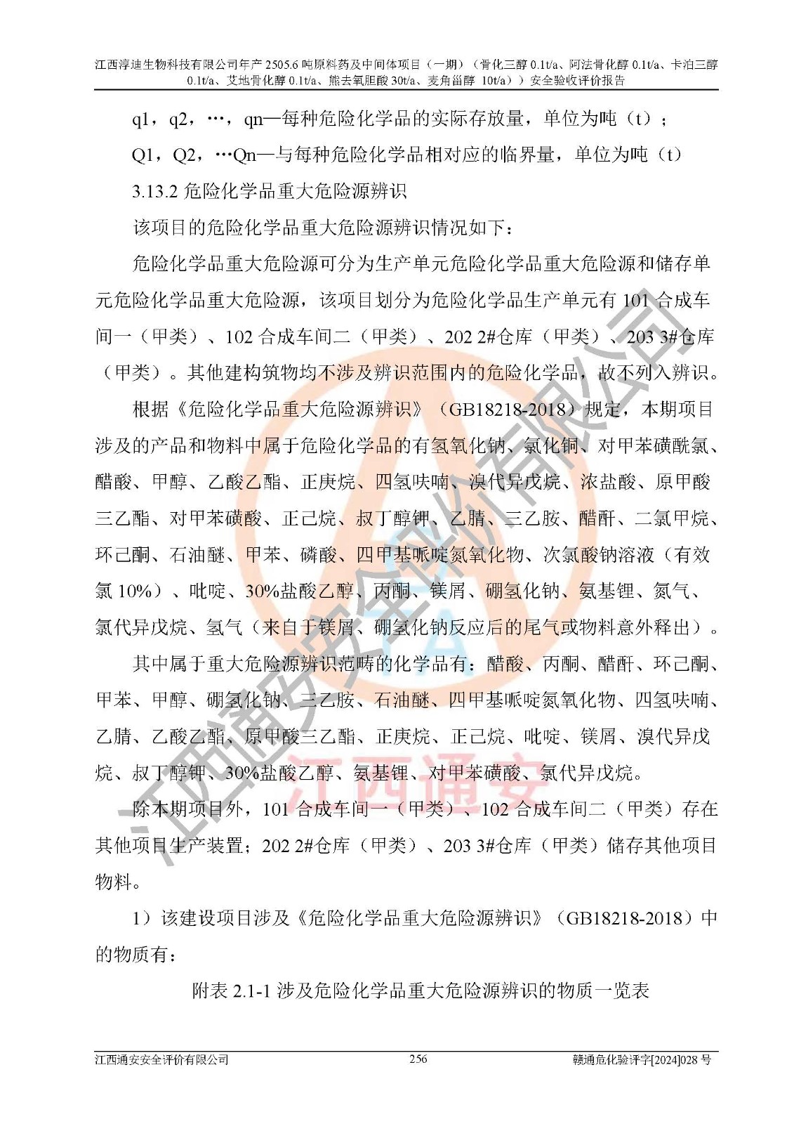 項目簡介 | 江西淳迪生物科技有限公司成立于2007年;2018年5月11日,為了適應市場需求和企業(yè)發(fā)展,該公司更名為江西神田生物科技有限公司。2021年4月14日,該公司再次更名為江西淳迪生物科技有限公司。 江西淳迪生物科技有限公司位于江西省**井岡山經濟技術開發(fā)區(qū),成立于2007年4月24日,并取得吉安市市場監(jiān)督管理局井岡山經濟技術開發(fā)區(qū)分局頒發(fā)的營業(yè)執(zhí)照,注冊資本叁仟萬元整,法定**人吳哲華,公司類型為其他有限責任公司,統(tǒng)一社會信用代碼:913608057994888273,經營范圍:許可項目:藥品生產,飼料生產,飼料添加劑生產,食品添加劑生產,獸藥生產(依法須經批準的項目,經相關部門批準后方可開展經營活動)一般項目:進出口代理,技術進出口,貨物進出口,**化學產品制造(不含危險化學品),生物飼料研發(fā),生物化工產品技術研發(fā),畜牧漁業(yè)飼料銷售,飼料添加劑銷售,食品添加劑銷售,飼料原料銷售(除許可業(yè)務外,可自主依法經營法律法規(guī)非禁止或限制的項目)。 江西神田生物科技有限公司于2020年11月11日取得江西省企業(yè)投資項目備案通知書,備案項目名稱:年產2505.6噸原料藥及中間體項目,項目統(tǒng)一代碼:2020-360861-27-03-012513。因江西神田生物科技有限公司于2021年4月14日將公司名稱變更為江西淳迪生物科技有限公司,2021年11月5日。江西淳迪生物科技有限公司將“年產2505.6噸原料藥及中間體項目”信息變更情況告知備案機關,并對備案內容進行修改,重新取得江西省企業(yè)投資項目備案通知書,備案項目名稱:年產2505.6噸原料藥及中間體項目,統(tǒng)一項目代碼:2111-360861-04-05-321685,項目總投資額30000萬元(3億元)。 江西淳迪生物科技有限公司于2021年4月委托江西贛安安全生產科學技術咨詢服務中心編制《江西淳迪生物科技有限公司年產2505.6噸原料藥及中間體項目(一期)安全條件評價報告》并于2021年6月23日通過了吉安市應急管理局組織的安全條件評價審查,審查通過后出具危險化學品建設項目安全條件評價審查意見書(編號為:吉市危化項目安條審字〔2021〕6號)。 江西淳迪生物科技有限公司于2022年12月委托廣東政和工程有限公司編制《江西淳迪生物科技有限公司年產2505.6噸原料藥及中間體項目(一期)安全設施設計》并于2023年2月3日通過了吉安市應急管理局組織的安全設施設計審查,審查通過后出具危險化學品建設項目安全設施設計審查意見書(編號為:吉市?;椖堪苍O審字〔2023〕2號)。 江西淳迪生物科技有限公司于2023年9月5日向井岡山經濟技術開發(fā)區(qū)應急管理局提交了《江西淳迪生物科技有限公司年產2505.6噸原料藥及中間體項目(一期:骨化三醇0.1t/a、阿法骨化醇0.1t/a、卡泊三醇0.1t/a、艾地骨化醇0.1t/a、地屈孕酮5t/a、熊去氧膽酸30t/a、麥角甾醇 10t/a)試生產方案》并取得井岡山經濟技術開發(fā)區(qū)應急管理局出具的《危險化學品建設項目試生產(使用)方案回執(zhí)》(回執(zhí)編號為:井開?;椖總渥帧?/span>2023〕04號),試生產的時間為2023年09月08日至2024年09月07日。 該工程涉及的氫氧化鈉、氯化銅、對甲苯磺酰氯、醋酸、甲醇、乙酸乙酯、正庚烷、四氫呋喃、溴代異戊烷、濃鹽酸、原甲酸三乙酯、對甲苯磺酸、正己烷、叔丁醇鉀、乙腈、三乙胺、醋酐、二氯甲烷、環(huán)己酮、石油醚、甲苯、磷酸、四甲基哌啶氮氧化物、次氯酸鈉溶液(**氯10%)、吡啶、30%鹽酸乙醇、**、鎂屑、硼氫化鈉、氨基鋰、氮氣、氯代異戊烷、氫氣(來自于鎂屑、硼氫化鈉反應后的尾氣或物料意外釋出)屬于危險化學品。其中**(第三類)、醋酐(第二類)、甲苯(第三類)、濃鹽酸(第三類)為易制毒化學品。甲苯、甲醇、乙酸乙酯、氫氣(來自于鎂屑、硼氫化鈉反應后的尾氣或物料意外釋出)屬于重點監(jiān)管的危險化學品。硼氫化鈉、鎂屑屬于易制爆危險化學品。甲醇屬于特別管控危險化學品。 該項目101合成車間一(反應釜U1-R20)及102合成車間二(反應釜U3-R05)麥角甾醇的氧化反應生產步驟涉及的氧化工藝屬于重點監(jiān)管的危險化工工藝。該項目中間體膽固醇的偶聯(lián)反應生產工序及骨化三醇中間體25-羥基脫氫膽固醇的偶聯(lián)反應生產工序涉及的格氏反應,參照重點監(jiān)管的危險化工工藝進行管控。 本項目生產單元和儲存設施單元不構成危險化學品重大危險源。 | |||