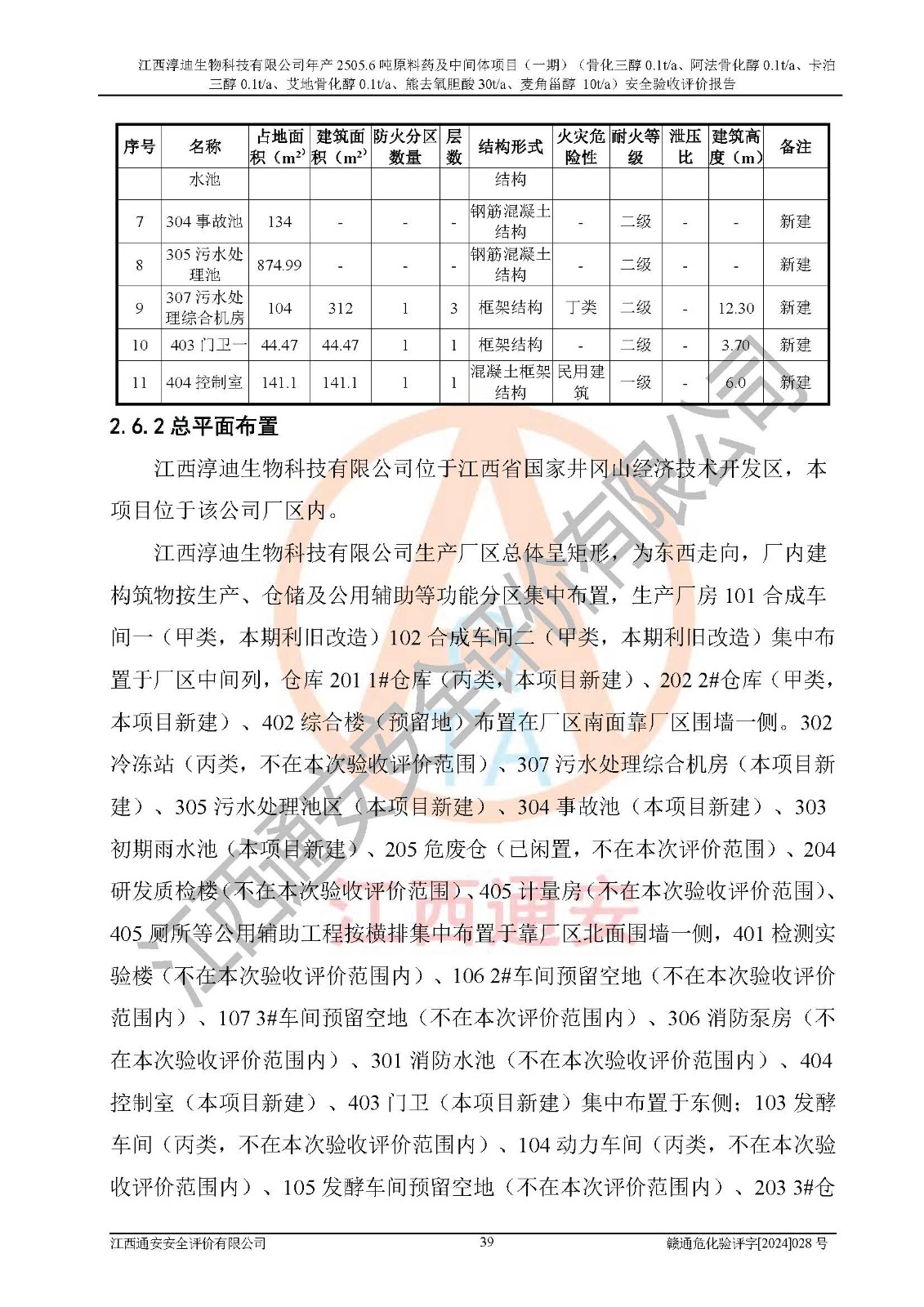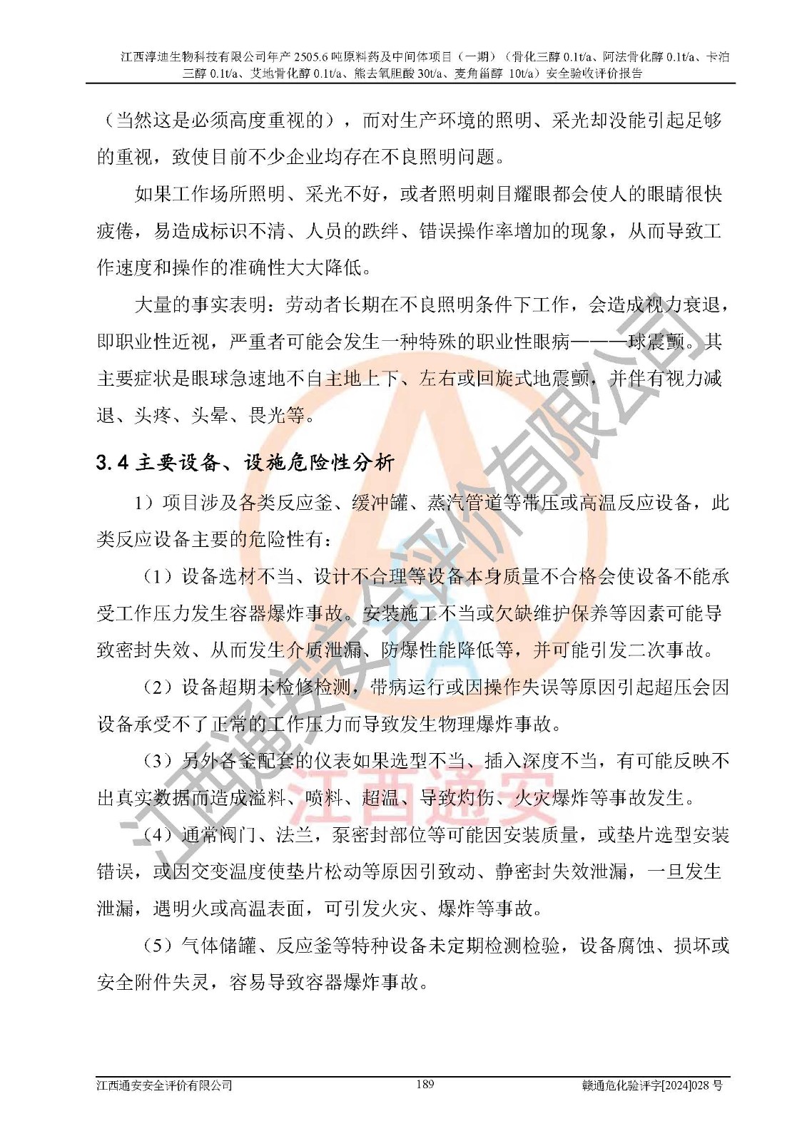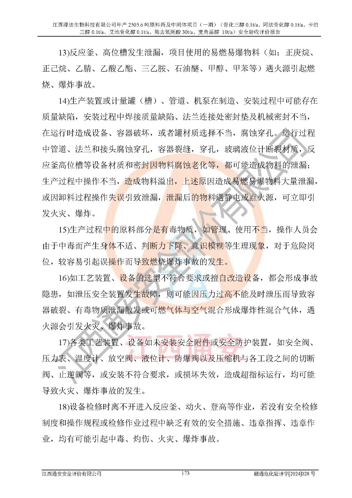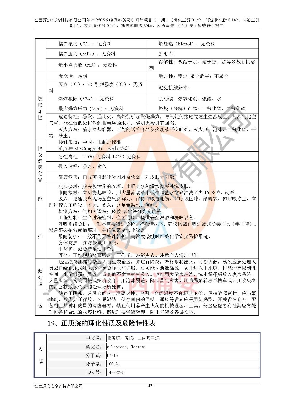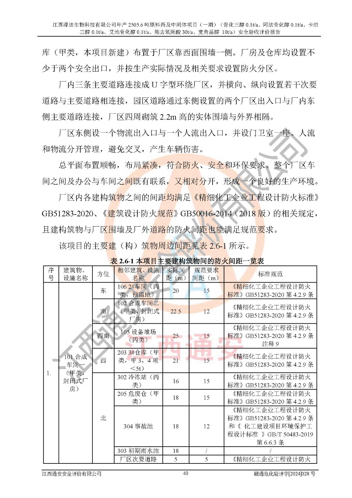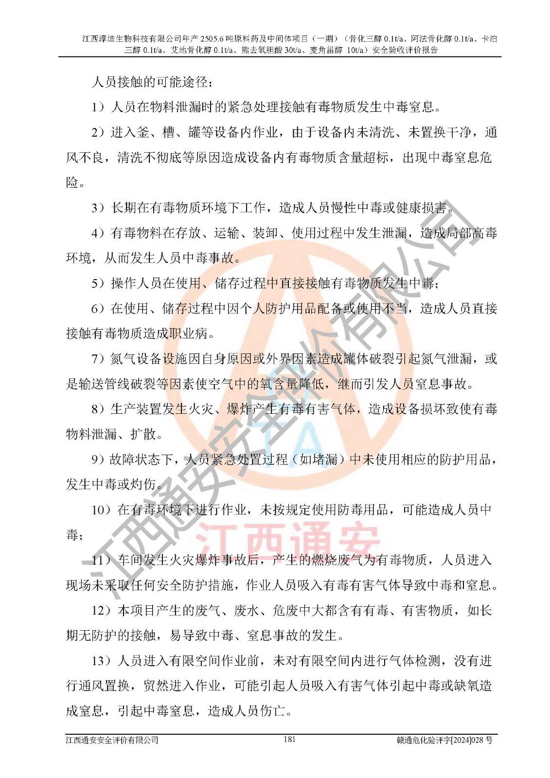 項目簡介 | 江西淳迪生物科技有限公司成立于2007年;2018年5月11日,為了適應市場需求和企業(yè)發(fā)展,該公司更名為江西神田生物科技有限公司。2021年4月14日,該公司再次更名為江西淳迪生物科技有限公司。 江西淳迪生物科技有限公司位于江西省**井岡山經濟技術開發(fā)區(qū),成立于2007年4月24日,并取得吉安市市場監(jiān)督管理局井岡山經濟技術開發(fā)區(qū)分局頒發(fā)的營業(yè)執(zhí)照,注冊資本叁仟萬元整,法定**人吳哲華,公司類型為其他有限責任公司,統(tǒng)一社會信用代碼:913608057994888273,經營范圍:許可項目:藥品生產,飼料生產,飼料添加劑生產,食品添加劑生產,獸藥生產(依法須經批準的項目,經相關部門批準后方可開展經營活動)一般項目:進出口代理,技術進出口,貨物進出口,**化學產品制造(不含危險化學品),生物飼料研發(fā),生物化工產品技術研發(fā),畜牧漁業(yè)飼料銷售,飼料添加劑銷售,食品添加劑銷售,飼料原料銷售(除許可業(yè)務外,可自主依法經營法律法規(guī)非禁止或限制的項目)。 江西神田生物科技有限公司于2020年11月11日取得江西省企業(yè)投資項目備案通知書,備案項目名稱:年產2505.6噸原料藥及中間體項目,項目統(tǒng)一代碼:2020-360861-27-03-012513。因江西神田生物科技有限公司于2021年4月14日將公司名稱變更為江西淳迪生物科技有限公司,2021年11月5日。江西淳迪生物科技有限公司將“年產2505.6噸原料藥及中間體項目”信息變更情況告知備案機關,并對備案內容進行修改,重新取得江西省企業(yè)投資項目備案通知書,備案項目名稱:年產2505.6噸原料藥及中間體項目,統(tǒng)一項目代碼:2111-360861-04-05-321685,項目總投資額30000萬元(3億元)。 江西淳迪生物科技有限公司于2021年4月委托江西贛安安全生產科學技術咨詢服務中心編制《江西淳迪生物科技有限公司年產2505.6噸原料藥及中間體項目(一期)安全條件評價報告》并于2021年6月23日通過了吉安市應急管理局組織的安全條件評價審查,審查通過后出具危險化學品建設項目安全條件評價審查意見書(編號為:吉市危化項目安條審字〔2021〕6號)。 江西淳迪生物科技有限公司于2022年12月委托廣東政和工程有限公司編制《江西淳迪生物科技有限公司年產2505.6噸原料藥及中間體項目(一期)安全設施設計》并于2023年2月3日通過了吉安市應急管理局組織的安全設施設計審查,審查通過后出具危險化學品建設項目安全設施設計審查意見書(編號為:吉市?;椖堪苍O審字〔2023〕2號)。 江西淳迪生物科技有限公司于2023年9月5日向井岡山經濟技術開發(fā)區(qū)應急管理局提交了《江西淳迪生物科技有限公司年產2505.6噸原料藥及中間體項目(一期:骨化三醇0.1t/a、阿法骨化醇0.1t/a、卡泊三醇0.1t/a、艾地骨化醇0.1t/a、地屈孕酮5t/a、熊去氧膽酸30t/a、麥角甾醇 10t/a)試生產方案》并取得井岡山經濟技術開發(fā)區(qū)應急管理局出具的《危險化學品建設項目試生產(使用)方案回執(zhí)》(回執(zhí)編號為:井開?;椖總渥帧?/span>2023〕04號),試生產的時間為2023年09月08日至2024年09月07日。 該工程涉及的氫氧化鈉、氯化銅、對甲苯磺酰氯、醋酸、甲醇、乙酸乙酯、正庚烷、四氫呋喃、溴代異戊烷、濃鹽酸、原甲酸三乙酯、對甲苯磺酸、正己烷、叔丁醇鉀、乙腈、三乙胺、醋酐、二氯甲烷、環(huán)己酮、石油醚、甲苯、磷酸、四甲基哌啶氮氧化物、次氯酸鈉溶液(**氯10%)、吡啶、30%鹽酸乙醇、**、鎂屑、硼氫化鈉、氨基鋰、氮氣、氯代異戊烷、氫氣(來自于鎂屑、硼氫化鈉反應后的尾氣或物料意外釋出)屬于危險化學品。其中**(第三類)、醋酐(第二類)、甲苯(第三類)、濃鹽酸(第三類)為易制毒化學品。甲苯、甲醇、乙酸乙酯、氫氣(來自于鎂屑、硼氫化鈉反應后的尾氣或物料意外釋出)屬于重點監(jiān)管的危險化學品。硼氫化鈉、鎂屑屬于易制爆危險化學品。甲醇屬于特別管控危險化學品。 該項目101合成車間一(反應釜U1-R20)及102合成車間二(反應釜U3-R05)麥角甾醇的氧化反應生產步驟涉及的氧化工藝屬于重點監(jiān)管的危險化工工藝。該項目中間體膽固醇的偶聯(lián)反應生產工序及骨化三醇中間體25-羥基脫氫膽固醇的偶聯(lián)反應生產工序涉及的格氏反應,參照重點監(jiān)管的危險化工工藝進行管控。 本項目生產單元和儲存設施單元不構成危險化學品重大危險源。 | |||