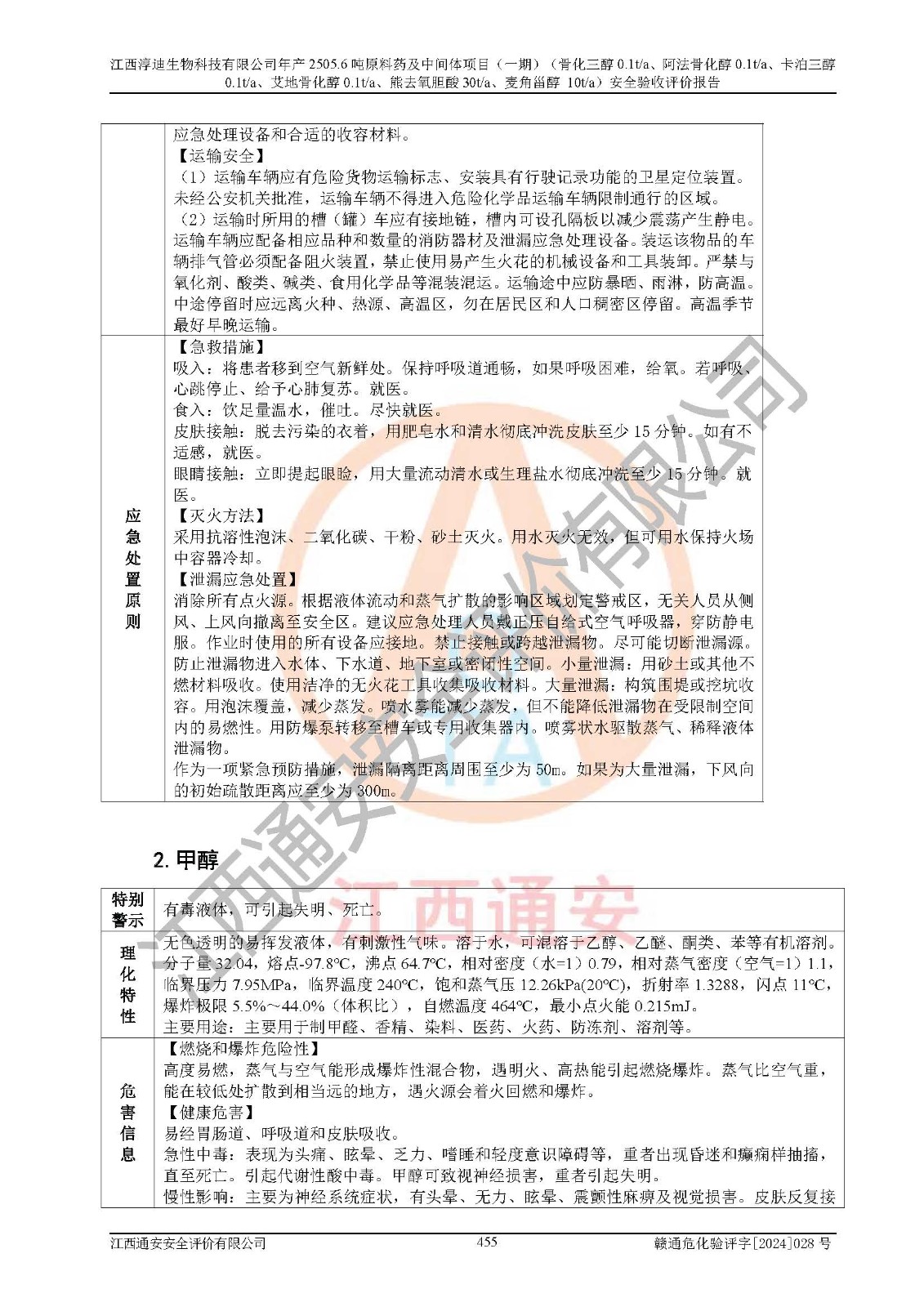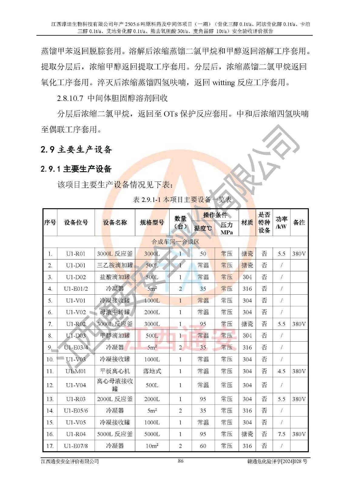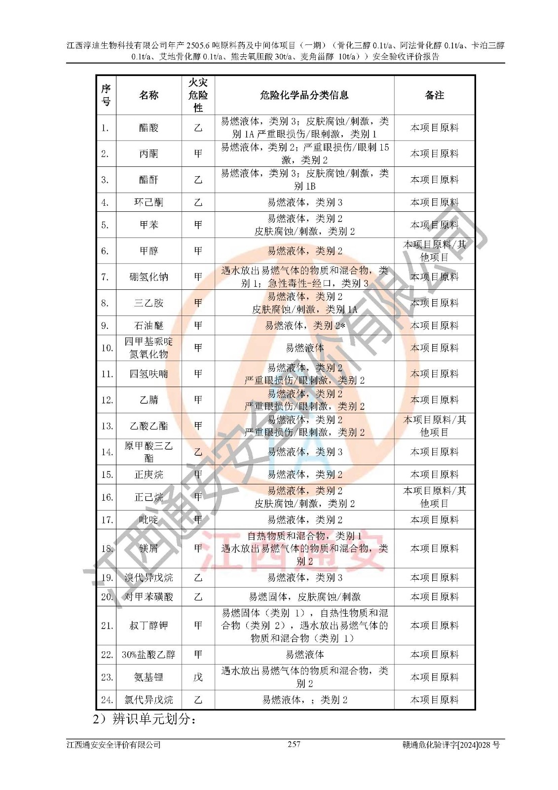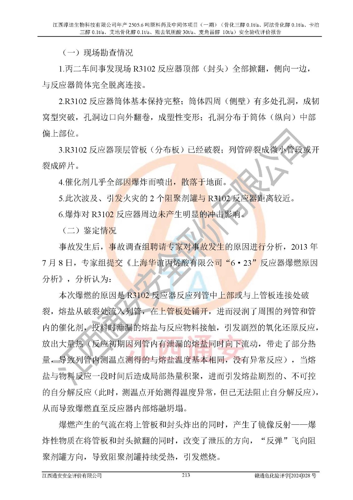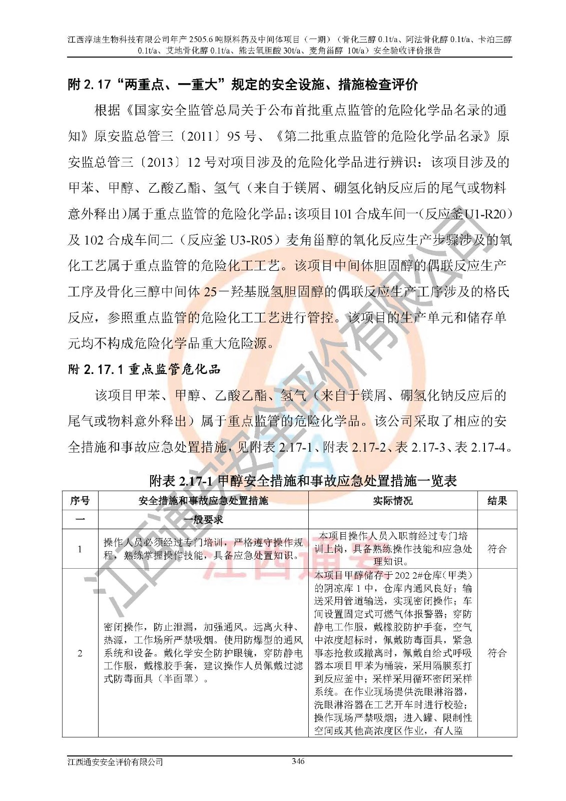 項目簡介 | 江西淳迪生物科技有限公司成立于2007年;2018年5月11日,為了適應市場需求和企業(yè)發(fā)展,該公司更名為江西神田生物科技有限公司。2021年4月14日,該公司再次更名為江西淳迪生物科技有限公司。 江西淳迪生物科技有限公司位于江西省**井岡山經濟技術開發(fā)區(qū),成立于2007年4月24日,并取得吉安市市場監(jiān)督管理局井岡山經濟技術開發(fā)區(qū)分局頒發(fā)的營業(yè)執(zhí)照,注冊資本叁仟萬元整,法定**人吳哲華,公司類型為其他有限責任公司,統(tǒng)一社會信用代碼:913608057994888273,經營范圍:許可項目:藥品生產,飼料生產,飼料添加劑生產,食品添加劑生產,獸藥生產(依法須經批準的項目,經相關部門批準后方可開展經營活動)一般項目:進出口代理,技術進出口,貨物進出口,**化學產品制造(不含危險化學品),生物飼料研發(fā),生物化工產品技術研發(fā),畜牧漁業(yè)飼料銷售,飼料添加劑銷售,食品添加劑銷售,飼料原料銷售(除許可業(yè)務外,可自主依法經營法律法規(guī)非禁止或限制的項目)。 江西神田生物科技有限公司于2020年11月11日取得江西省企業(yè)投資項目備案通知書,備案項目名稱:年產2505.6噸原料藥及中間體項目,項目統(tǒng)一代碼:2020-360861-27-03-012513。因江西神田生物科技有限公司于2021年4月14日將公司名稱變更為江西淳迪生物科技有限公司,2021年11月5日。江西淳迪生物科技有限公司將“年產2505.6噸原料藥及中間體項目”信息變更情況告知備案機關,并對備案內容進行修改,重新取得江西省企業(yè)投資項目備案通知書,備案項目名稱:年產2505.6噸原料藥及中間體項目,統(tǒng)一項目代碼:2111-360861-04-05-321685,項目總投資額30000萬元(3億元)。 江西淳迪生物科技有限公司于2021年4月委托江西贛安安全生產科學技術咨詢服務中心編制《江西淳迪生物科技有限公司年產2505.6噸原料藥及中間體項目(一期)安全條件評價報告》并于2021年6月23日通過了吉安市應急管理局組織的安全條件評價審查,審查通過后出具危險化學品建設項目安全條件評價審查意見書(編號為:吉市危化項目安條審字〔2021〕6號)。 江西淳迪生物科技有限公司于2022年12月委托廣東政和工程有限公司編制《江西淳迪生物科技有限公司年產2505.6噸原料藥及中間體項目(一期)安全設施設計》并于2023年2月3日通過了吉安市應急管理局組織的安全設施設計審查,審查通過后出具危險化學品建設項目安全設施設計審查意見書(編號為:吉市?;椖堪苍O審字〔2023〕2號)。 江西淳迪生物科技有限公司于2023年9月5日向井岡山經濟技術開發(fā)區(qū)應急管理局提交了《江西淳迪生物科技有限公司年產2505.6噸原料藥及中間體項目(一期:骨化三醇0.1t/a、阿法骨化醇0.1t/a、卡泊三醇0.1t/a、艾地骨化醇0.1t/a、地屈孕酮5t/a、熊去氧膽酸30t/a、麥角甾醇 10t/a)試生產方案》并取得井岡山經濟技術開發(fā)區(qū)應急管理局出具的《危險化學品建設項目試生產(使用)方案回執(zhí)》(回執(zhí)編號為:井開?;椖總渥帧?/span>2023〕04號),試生產的時間為2023年09月08日至2024年09月07日。 該工程涉及的氫氧化鈉、氯化銅、對甲苯磺酰氯、醋酸、甲醇、乙酸乙酯、正庚烷、四氫呋喃、溴代異戊烷、濃鹽酸、原甲酸三乙酯、對甲苯磺酸、正己烷、叔丁醇鉀、乙腈、三乙胺、醋酐、二氯甲烷、環(huán)己酮、石油醚、甲苯、磷酸、四甲基哌啶氮氧化物、次氯酸鈉溶液(**氯10%)、吡啶、30%鹽酸乙醇、**、鎂屑、硼氫化鈉、氨基鋰、氮氣、氯代異戊烷、氫氣(來自于鎂屑、硼氫化鈉反應后的尾氣或物料意外釋出)屬于危險化學品。其中**(第三類)、醋酐(第二類)、甲苯(第三類)、濃鹽酸(第三類)為易制毒化學品。甲苯、甲醇、乙酸乙酯、氫氣(來自于鎂屑、硼氫化鈉反應后的尾氣或物料意外釋出)屬于重點監(jiān)管的危險化學品。硼氫化鈉、鎂屑屬于易制爆危險化學品。甲醇屬于特別管控危險化學品。 該項目101合成車間一(反應釜U1-R20)及102合成車間二(反應釜U3-R05)麥角甾醇的氧化反應生產步驟涉及的氧化工藝屬于重點監(jiān)管的危險化工工藝。該項目中間體膽固醇的偶聯(lián)反應生產工序及骨化三醇中間體25-羥基脫氫膽固醇的偶聯(lián)反應生產工序涉及的格氏反應,參照重點監(jiān)管的危險化工工藝進行管控。 本項目生產單元和儲存設施單元不構成危險化學品重大危險源。 | |||