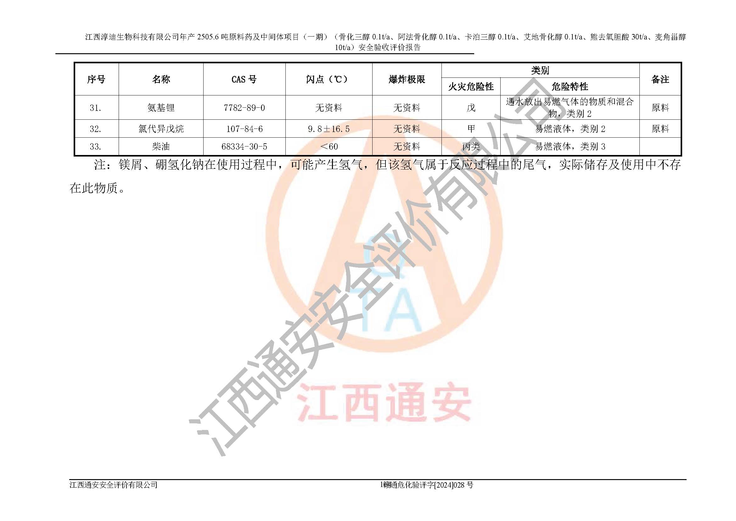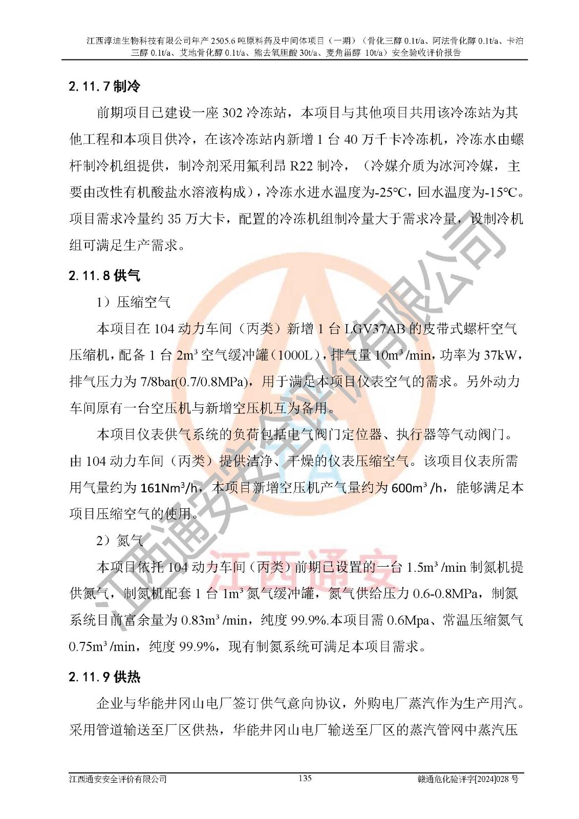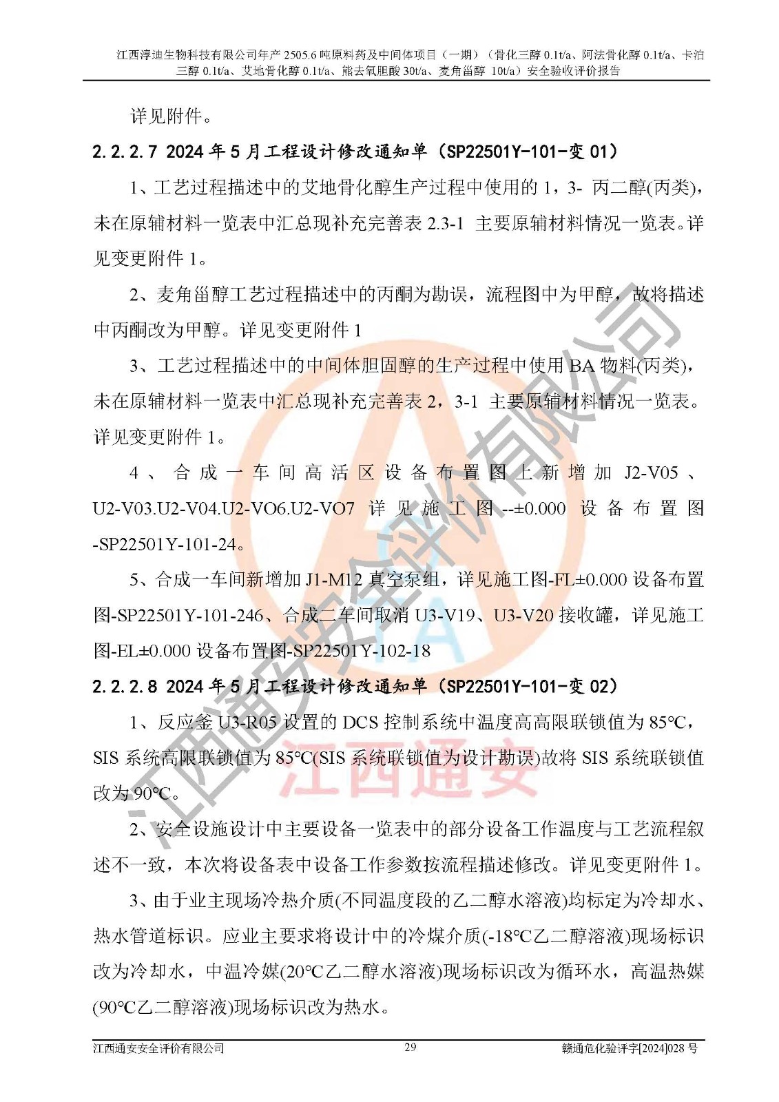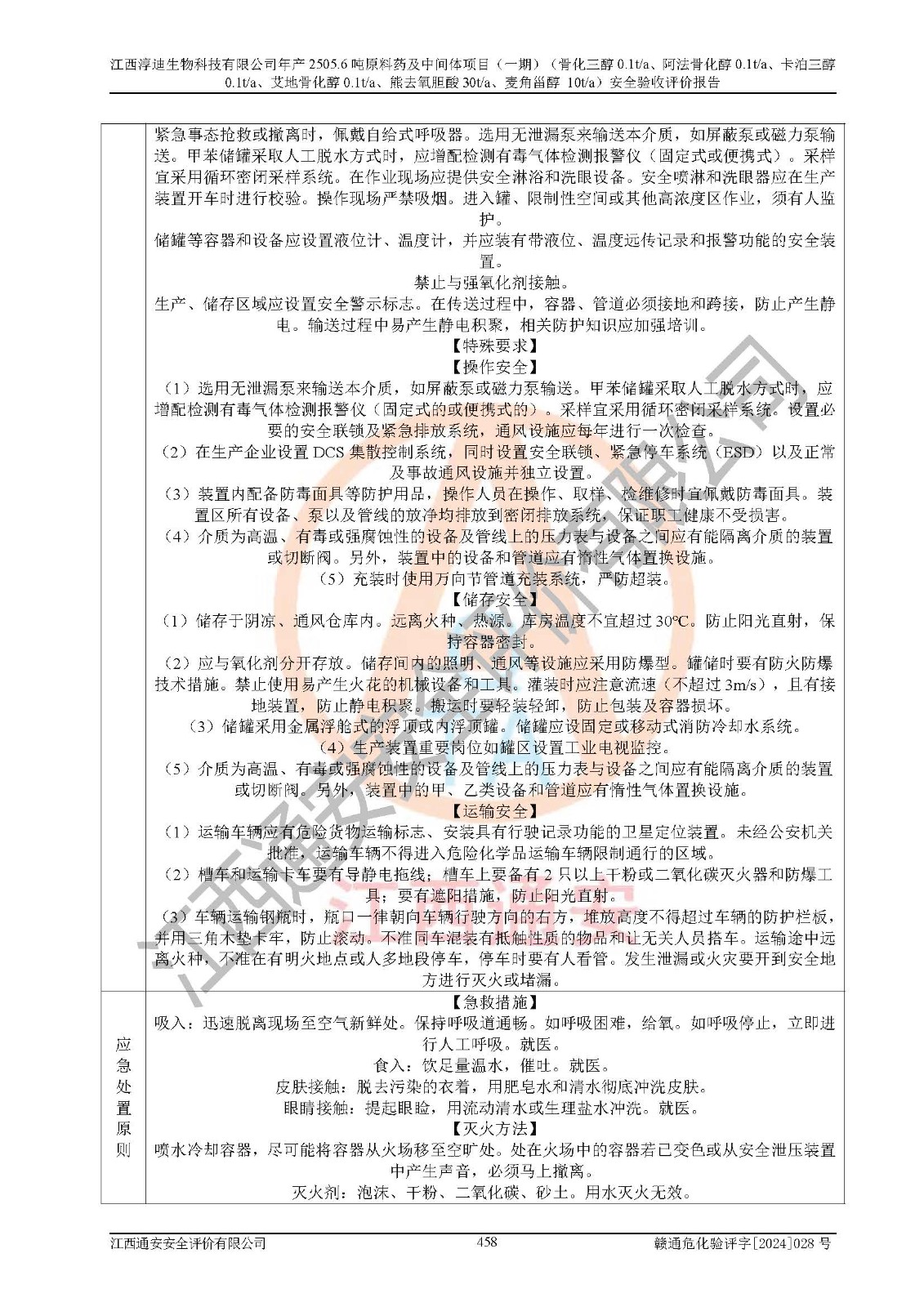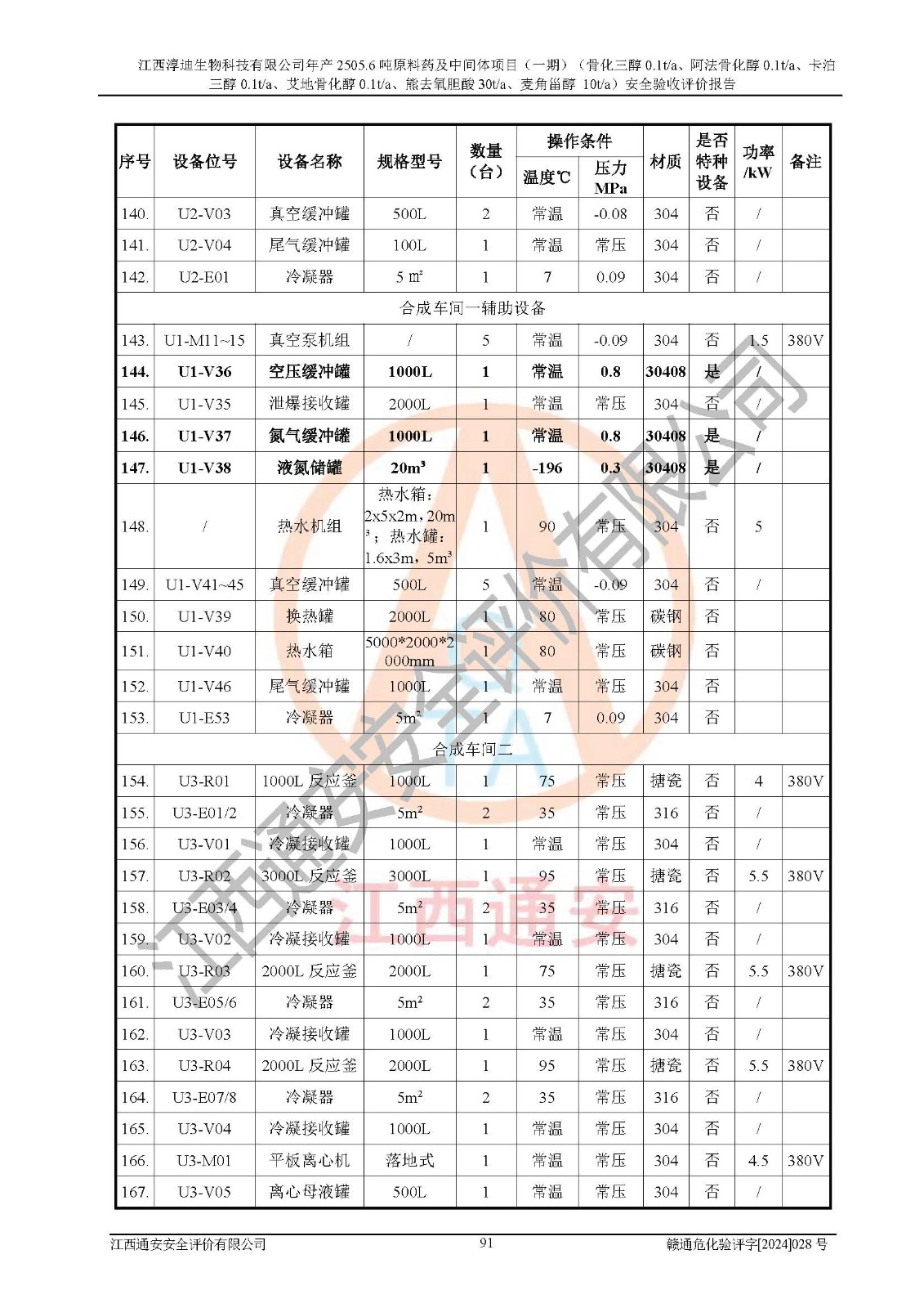 項目簡介 | 江西淳迪生物科技有限公司成立于2007年;2018年5月11日,為了適應市場需求和企業(yè)發(fā)展,該公司更名為江西神田生物科技有限公司。2021年4月14日,該公司再次更名為江西淳迪生物科技有限公司。 江西淳迪生物科技有限公司位于江西省**井岡山經濟技術開發(fā)區(qū),成立于2007年4月24日,并取得吉安市市場監(jiān)督管理局井岡山經濟技術開發(fā)區(qū)分局頒發(fā)的營業(yè)執(zhí)照,注冊資本叁仟萬元整,法定**人吳哲華,公司類型為其他有限責任公司,統(tǒng)一社會信用代碼:913608057994888273,經營范圍:許可項目:藥品生產,飼料生產,飼料添加劑生產,食品添加劑生產,獸藥生產(依法須經批準的項目,經相關部門批準后方可開展經營活動)一般項目:進出口代理,技術進出口,貨物進出口,**化學產品制造(不含危險化學品),生物飼料研發(fā),生物化工產品技術研發(fā),畜牧漁業(yè)飼料銷售,飼料添加劑銷售,食品添加劑銷售,飼料原料銷售(除許可業(yè)務外,可自主依法經營法律法規(guī)非禁止或限制的項目)。 江西神田生物科技有限公司于2020年11月11日取得江西省企業(yè)投資項目備案通知書,備案項目名稱:年產2505.6噸原料藥及中間體項目,項目統(tǒng)一代碼:2020-360861-27-03-012513。因江西神田生物科技有限公司于2021年4月14日將公司名稱變更為江西淳迪生物科技有限公司,2021年11月5日。江西淳迪生物科技有限公司將“年產2505.6噸原料藥及中間體項目”信息變更情況告知備案機關,并對備案內容進行修改,重新取得江西省企業(yè)投資項目備案通知書,備案項目名稱:年產2505.6噸原料藥及中間體項目,統(tǒng)一項目代碼:2111-360861-04-05-321685,項目總投資額30000萬元(3億元)。 江西淳迪生物科技有限公司于2021年4月委托江西贛安安全生產科學技術咨詢服務中心編制《江西淳迪生物科技有限公司年產2505.6噸原料藥及中間體項目(一期)安全條件評價報告》并于2021年6月23日通過了吉安市應急管理局組織的安全條件評價審查,審查通過后出具危險化學品建設項目安全條件評價審查意見書(編號為:吉市危化項目安條審字〔2021〕6號)。 江西淳迪生物科技有限公司于2022年12月委托廣東政和工程有限公司編制《江西淳迪生物科技有限公司年產2505.6噸原料藥及中間體項目(一期)安全設施設計》并于2023年2月3日通過了吉安市應急管理局組織的安全設施設計審查,審查通過后出具危險化學品建設項目安全設施設計審查意見書(編號為:吉市?;椖堪苍O審字〔2023〕2號)。 江西淳迪生物科技有限公司于2023年9月5日向井岡山經濟技術開發(fā)區(qū)應急管理局提交了《江西淳迪生物科技有限公司年產2505.6噸原料藥及中間體項目(一期:骨化三醇0.1t/a、阿法骨化醇0.1t/a、卡泊三醇0.1t/a、艾地骨化醇0.1t/a、地屈孕酮5t/a、熊去氧膽酸30t/a、麥角甾醇 10t/a)試生產方案》并取得井岡山經濟技術開發(fā)區(qū)應急管理局出具的《危險化學品建設項目試生產(使用)方案回執(zhí)》(回執(zhí)編號為:井開?;椖總渥帧?/span>2023〕04號),試生產的時間為2023年09月08日至2024年09月07日。 該工程涉及的氫氧化鈉、氯化銅、對甲苯磺酰氯、醋酸、甲醇、乙酸乙酯、正庚烷、四氫呋喃、溴代異戊烷、濃鹽酸、原甲酸三乙酯、對甲苯磺酸、正己烷、叔丁醇鉀、乙腈、三乙胺、醋酐、二氯甲烷、環(huán)己酮、石油醚、甲苯、磷酸、四甲基哌啶氮氧化物、次氯酸鈉溶液(**氯10%)、吡啶、30%鹽酸乙醇、**、鎂屑、硼氫化鈉、氨基鋰、氮氣、氯代異戊烷、氫氣(來自于鎂屑、硼氫化鈉反應后的尾氣或物料意外釋出)屬于危險化學品。其中**(第三類)、醋酐(第二類)、甲苯(第三類)、濃鹽酸(第三類)為易制毒化學品。甲苯、甲醇、乙酸乙酯、氫氣(來自于鎂屑、硼氫化鈉反應后的尾氣或物料意外釋出)屬于重點監(jiān)管的危險化學品。硼氫化鈉、鎂屑屬于易制爆危險化學品。甲醇屬于特別管控危險化學品。 該項目101合成車間一(反應釜U1-R20)及102合成車間二(反應釜U3-R05)麥角甾醇的氧化反應生產步驟涉及的氧化工藝屬于重點監(jiān)管的危險化工工藝。該項目中間體膽固醇的偶聯(lián)反應生產工序及骨化三醇中間體25-羥基脫氫膽固醇的偶聯(lián)反應生產工序涉及的格氏反應,參照重點監(jiān)管的危險化工工藝進行管控。 本項目生產單元和儲存設施單元不構成危險化學品重大危險源。 | |||