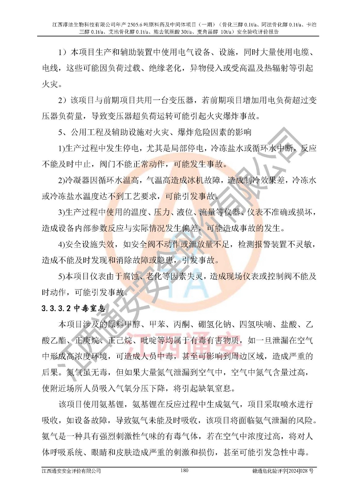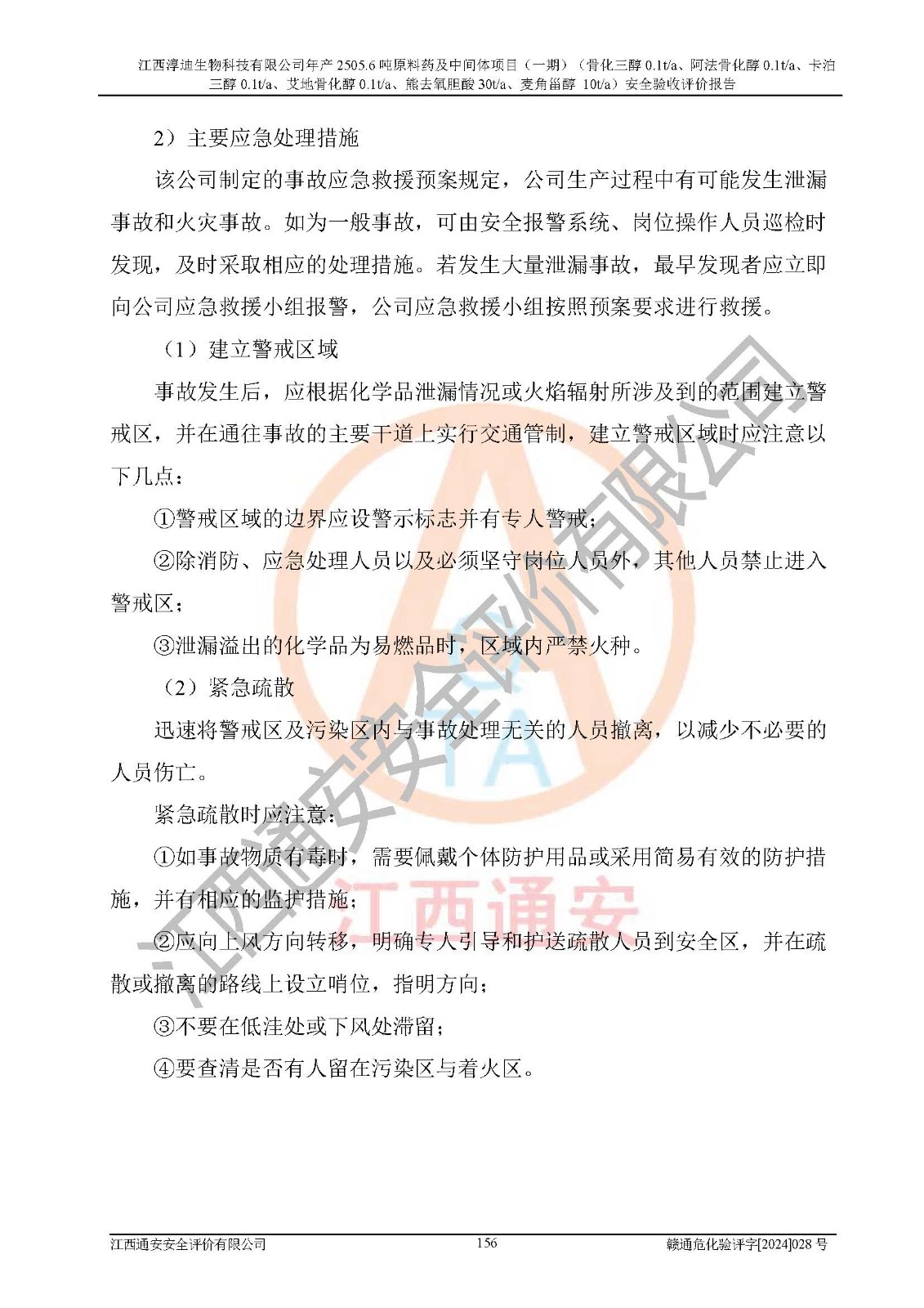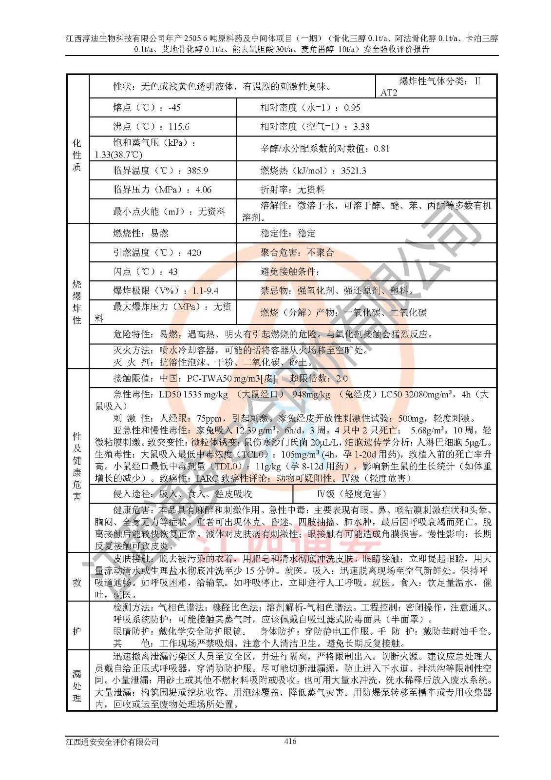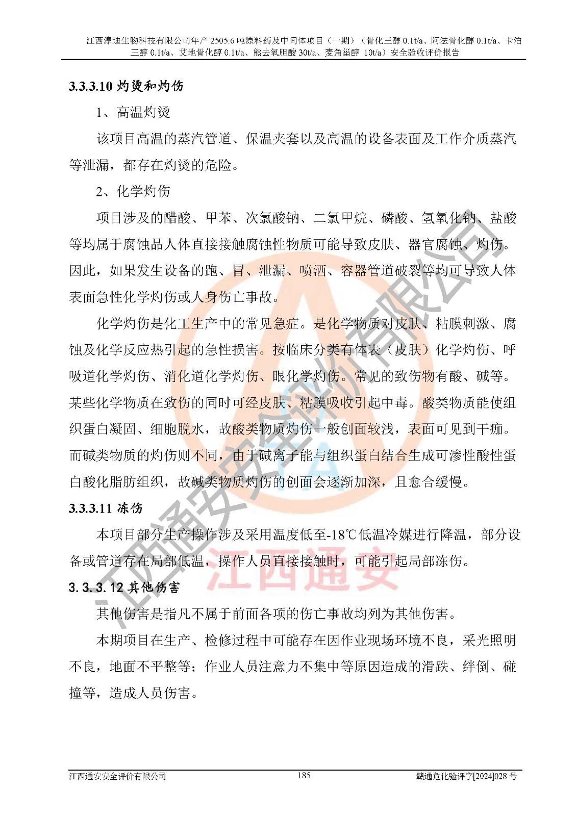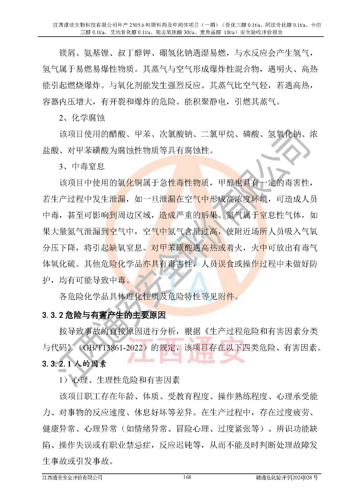 項目簡介 | 江西淳迪生物科技有限公司成立于2007年;2018年5月11日,為了適應市場需求和企業(yè)發(fā)展,該公司更名為江西神田生物科技有限公司。2021年4月14日,該公司再次更名為江西淳迪生物科技有限公司。 江西淳迪生物科技有限公司位于江西省**井岡山經濟技術開發(fā)區(qū),成立于2007年4月24日,并取得吉安市市場監(jiān)督管理局井岡山經濟技術開發(fā)區(qū)分局頒發(fā)的營業(yè)執(zhí)照,注冊資本叁仟萬元整,法定**人吳哲華,公司類型為其他有限責任公司,統(tǒng)一社會信用代碼:913608057994888273,經營范圍:許可項目:藥品生產,飼料生產,飼料添加劑生產,食品添加劑生產,獸藥生產(依法須經批準的項目,經相關部門批準后方可開展經營活動)一般項目:進出口代理,技術進出口,貨物進出口,**化學產品制造(不含危險化學品),生物飼料研發(fā),生物化工產品技術研發(fā),畜牧漁業(yè)飼料銷售,飼料添加劑銷售,食品添加劑銷售,飼料原料銷售(除許可業(yè)務外,可自主依法經營法律法規(guī)非禁止或限制的項目)。 江西神田生物科技有限公司于2020年11月11日取得江西省企業(yè)投資項目備案通知書,備案項目名稱:年產2505.6噸原料藥及中間體項目,項目統(tǒng)一代碼:2020-360861-27-03-012513。因江西神田生物科技有限公司于2021年4月14日將公司名稱變更為江西淳迪生物科技有限公司,2021年11月5日。江西淳迪生物科技有限公司將“年產2505.6噸原料藥及中間體項目”信息變更情況告知備案機關,并對備案內容進行修改,重新取得江西省企業(yè)投資項目備案通知書,備案項目名稱:年產2505.6噸原料藥及中間體項目,統(tǒng)一項目代碼:2111-360861-04-05-321685,項目總投資額30000萬元(3億元)。 江西淳迪生物科技有限公司于2021年4月委托江西贛安安全生產科學技術咨詢服務中心編制《江西淳迪生物科技有限公司年產2505.6噸原料藥及中間體項目(一期)安全條件評價報告》并于2021年6月23日通過了吉安市應急管理局組織的安全條件評價審查,審查通過后出具危險化學品建設項目安全條件評價審查意見書(編號為:吉市危化項目安條審字〔2021〕6號)。 江西淳迪生物科技有限公司于2022年12月委托廣東政和工程有限公司編制《江西淳迪生物科技有限公司年產2505.6噸原料藥及中間體項目(一期)安全設施設計》并于2023年2月3日通過了吉安市應急管理局組織的安全設施設計審查,審查通過后出具危險化學品建設項目安全設施設計審查意見書(編號為:吉市?;椖堪苍O審字〔2023〕2號)。 江西淳迪生物科技有限公司于2023年9月5日向井岡山經濟技術開發(fā)區(qū)應急管理局提交了《江西淳迪生物科技有限公司年產2505.6噸原料藥及中間體項目(一期:骨化三醇0.1t/a、阿法骨化醇0.1t/a、卡泊三醇0.1t/a、艾地骨化醇0.1t/a、地屈孕酮5t/a、熊去氧膽酸30t/a、麥角甾醇 10t/a)試生產方案》并取得井岡山經濟技術開發(fā)區(qū)應急管理局出具的《危險化學品建設項目試生產(使用)方案回執(zhí)》(回執(zhí)編號為:井開?;椖總渥帧?/span>2023〕04號),試生產的時間為2023年09月08日至2024年09月07日。 該工程涉及的氫氧化鈉、氯化銅、對甲苯磺酰氯、醋酸、甲醇、乙酸乙酯、正庚烷、四氫呋喃、溴代異戊烷、濃鹽酸、原甲酸三乙酯、對甲苯磺酸、正己烷、叔丁醇鉀、乙腈、三乙胺、醋酐、二氯甲烷、環(huán)己酮、石油醚、甲苯、磷酸、四甲基哌啶氮氧化物、次氯酸鈉溶液(**氯10%)、吡啶、30%鹽酸乙醇、**、鎂屑、硼氫化鈉、氨基鋰、氮氣、氯代異戊烷、氫氣(來自于鎂屑、硼氫化鈉反應后的尾氣或物料意外釋出)屬于危險化學品。其中**(第三類)、醋酐(第二類)、甲苯(第三類)、濃鹽酸(第三類)為易制毒化學品。甲苯、甲醇、乙酸乙酯、氫氣(來自于鎂屑、硼氫化鈉反應后的尾氣或物料意外釋出)屬于重點監(jiān)管的危險化學品。硼氫化鈉、鎂屑屬于易制爆危險化學品。甲醇屬于特別管控危險化學品。 該項目101合成車間一(反應釜U1-R20)及102合成車間二(反應釜U3-R05)麥角甾醇的氧化反應生產步驟涉及的氧化工藝屬于重點監(jiān)管的危險化工工藝。該項目中間體膽固醇的偶聯(lián)反應生產工序及骨化三醇中間體25-羥基脫氫膽固醇的偶聯(lián)反應生產工序涉及的格氏反應,參照重點監(jiān)管的危險化工工藝進行管控。 本項目生產單元和儲存設施單元不構成危險化學品重大危險源。 | |||