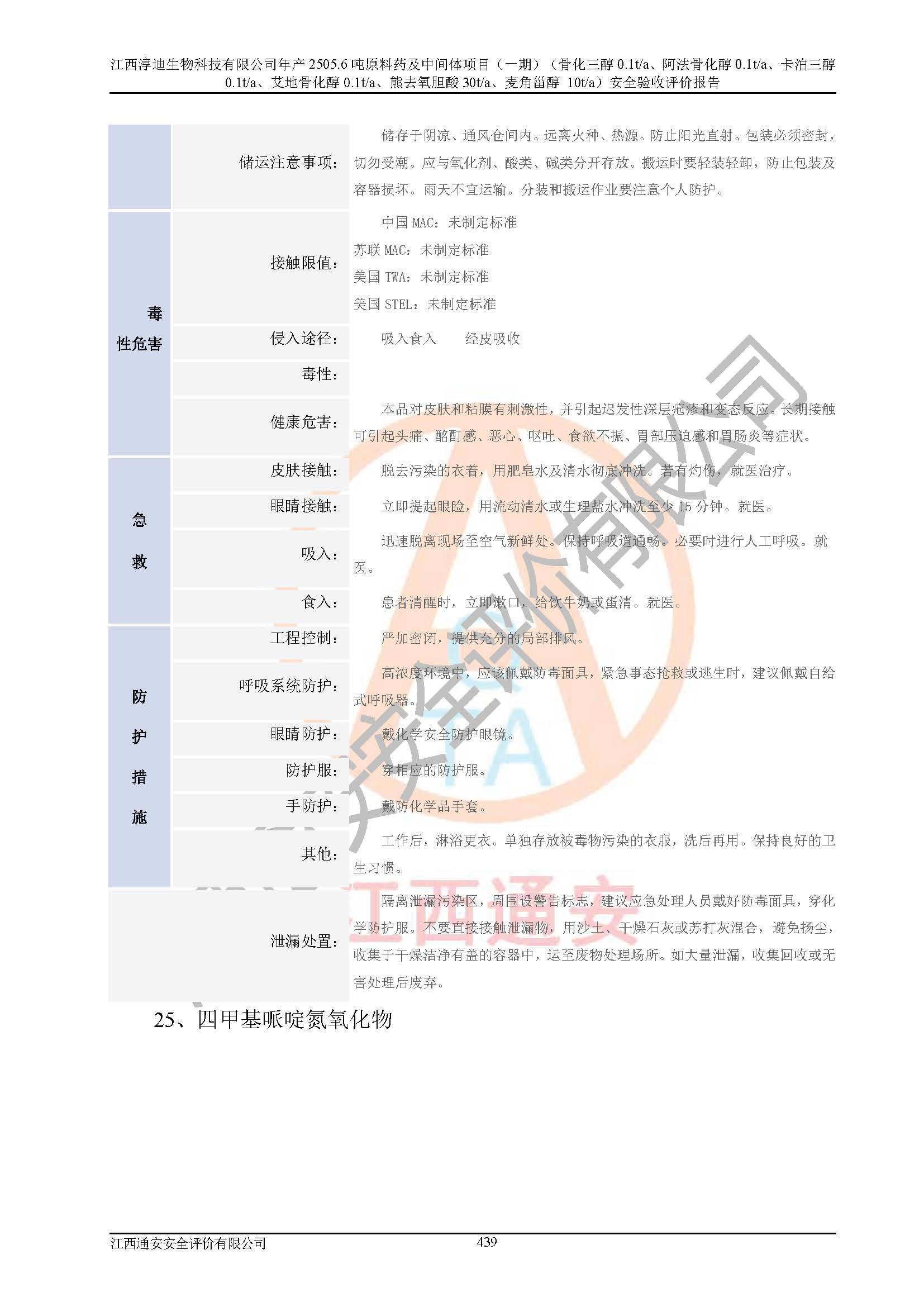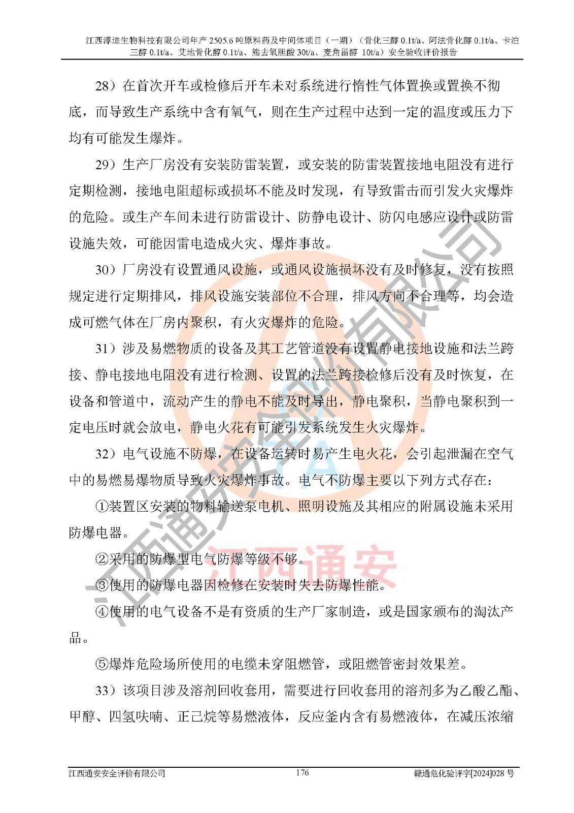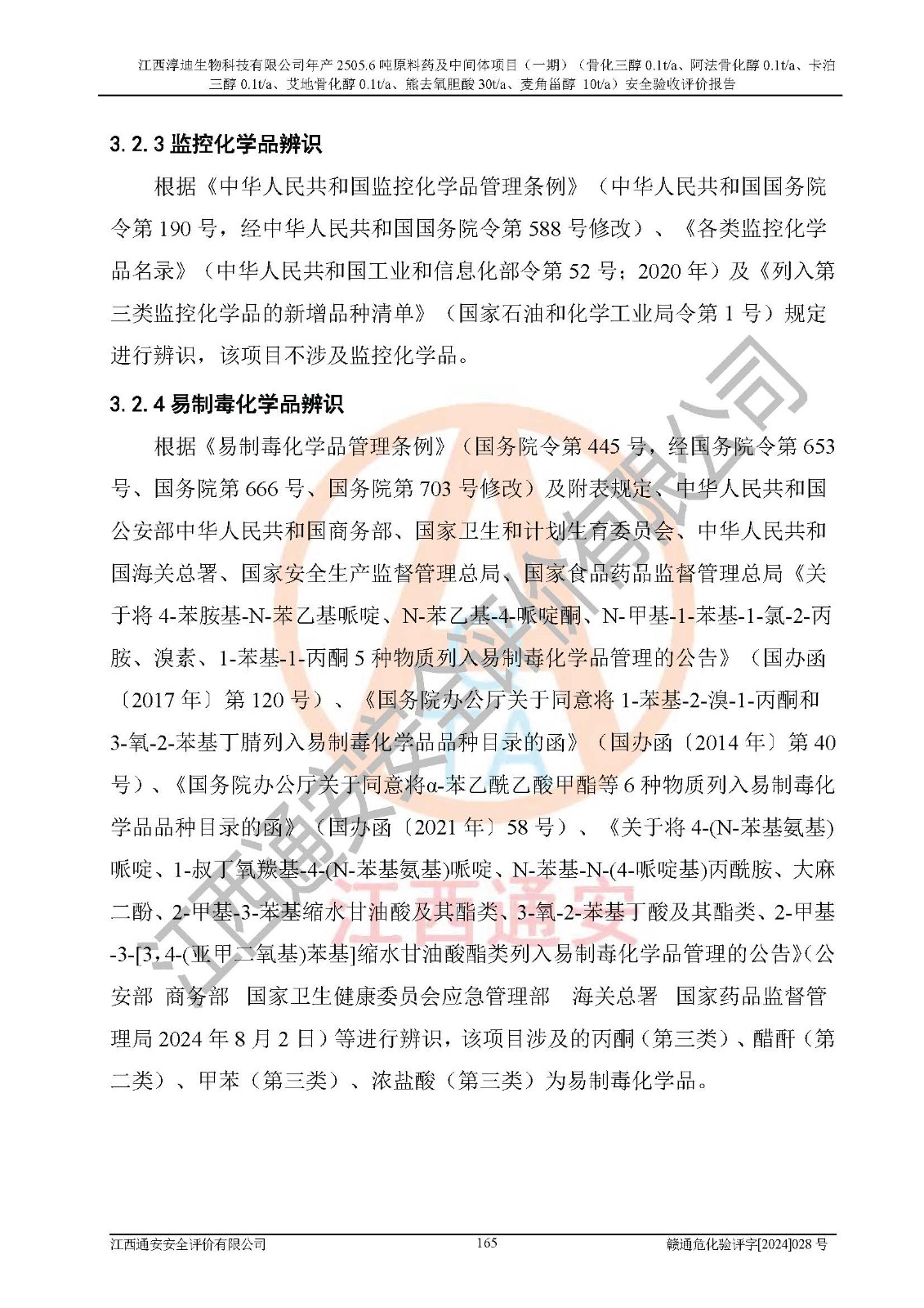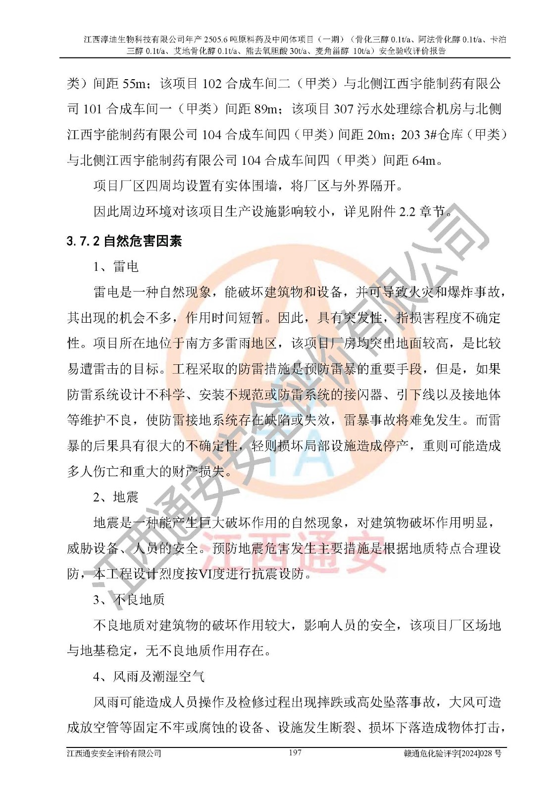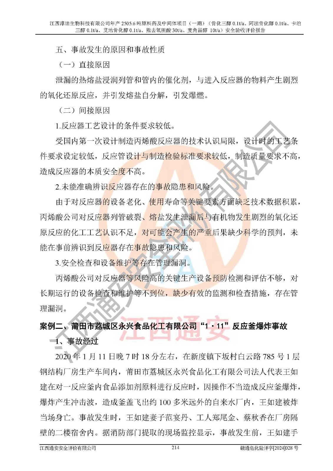 項目簡介 | 江西淳迪生物科技有限公司成立于2007年;2018年5月11日,為了適應市場需求和企業(yè)發(fā)展,該公司更名為江西神田生物科技有限公司。2021年4月14日,該公司再次更名為江西淳迪生物科技有限公司。 江西淳迪生物科技有限公司位于江西省**井岡山經濟技術開發(fā)區(qū),成立于2007年4月24日,并取得吉安市市場監(jiān)督管理局井岡山經濟技術開發(fā)區(qū)分局頒發(fā)的營業(yè)執(zhí)照,注冊資本叁仟萬元整,法定**人吳哲華,公司類型為其他有限責任公司,統(tǒng)一社會信用代碼:913608057994888273,經營范圍:許可項目:藥品生產,飼料生產,飼料添加劑生產,食品添加劑生產,獸藥生產(依法須經批準的項目,經相關部門批準后方可開展經營活動)一般項目:進出口代理,技術進出口,貨物進出口,**化學產品制造(不含危險化學品),生物飼料研發(fā),生物化工產品技術研發(fā),畜牧漁業(yè)飼料銷售,飼料添加劑銷售,食品添加劑銷售,飼料原料銷售(除許可業(yè)務外,可自主依法經營法律法規(guī)非禁止或限制的項目)。 江西神田生物科技有限公司于2020年11月11日取得江西省企業(yè)投資項目備案通知書,備案項目名稱:年產2505.6噸原料藥及中間體項目,項目統(tǒng)一代碼:2020-360861-27-03-012513。因江西神田生物科技有限公司于2021年4月14日將公司名稱變更為江西淳迪生物科技有限公司,2021年11月5日。江西淳迪生物科技有限公司將“年產2505.6噸原料藥及中間體項目”信息變更情況告知備案機關,并對備案內容進行修改,重新取得江西省企業(yè)投資項目備案通知書,備案項目名稱:年產2505.6噸原料藥及中間體項目,統(tǒng)一項目代碼:2111-360861-04-05-321685,項目總投資額30000萬元(3億元)。 江西淳迪生物科技有限公司于2021年4月委托江西贛安安全生產科學技術咨詢服務中心編制《江西淳迪生物科技有限公司年產2505.6噸原料藥及中間體項目(一期)安全條件評價報告》并于2021年6月23日通過了吉安市應急管理局組織的安全條件評價審查,審查通過后出具危險化學品建設項目安全條件評價審查意見書(編號為:吉市危化項目安條審字〔2021〕6號)。 江西淳迪生物科技有限公司于2022年12月委托廣東政和工程有限公司編制《江西淳迪生物科技有限公司年產2505.6噸原料藥及中間體項目(一期)安全設施設計》并于2023年2月3日通過了吉安市應急管理局組織的安全設施設計審查,審查通過后出具危險化學品建設項目安全設施設計審查意見書(編號為:吉市?;椖堪苍O審字〔2023〕2號)。 江西淳迪生物科技有限公司于2023年9月5日向井岡山經濟技術開發(fā)區(qū)應急管理局提交了《江西淳迪生物科技有限公司年產2505.6噸原料藥及中間體項目(一期:骨化三醇0.1t/a、阿法骨化醇0.1t/a、卡泊三醇0.1t/a、艾地骨化醇0.1t/a、地屈孕酮5t/a、熊去氧膽酸30t/a、麥角甾醇 10t/a)試生產方案》并取得井岡山經濟技術開發(fā)區(qū)應急管理局出具的《危險化學品建設項目試生產(使用)方案回執(zhí)》(回執(zhí)編號為:井開?;椖總渥帧?/span>2023〕04號),試生產的時間為2023年09月08日至2024年09月07日。 該工程涉及的氫氧化鈉、氯化銅、對甲苯磺酰氯、醋酸、甲醇、乙酸乙酯、正庚烷、四氫呋喃、溴代異戊烷、濃鹽酸、原甲酸三乙酯、對甲苯磺酸、正己烷、叔丁醇鉀、乙腈、三乙胺、醋酐、二氯甲烷、環(huán)己酮、石油醚、甲苯、磷酸、四甲基哌啶氮氧化物、次氯酸鈉溶液(**氯10%)、吡啶、30%鹽酸乙醇、**、鎂屑、硼氫化鈉、氨基鋰、氮氣、氯代異戊烷、氫氣(來自于鎂屑、硼氫化鈉反應后的尾氣或物料意外釋出)屬于危險化學品。其中**(第三類)、醋酐(第二類)、甲苯(第三類)、濃鹽酸(第三類)為易制毒化學品。甲苯、甲醇、乙酸乙酯、氫氣(來自于鎂屑、硼氫化鈉反應后的尾氣或物料意外釋出)屬于重點監(jiān)管的危險化學品。硼氫化鈉、鎂屑屬于易制爆危險化學品。甲醇屬于特別管控危險化學品。 該項目101合成車間一(反應釜U1-R20)及102合成車間二(反應釜U3-R05)麥角甾醇的氧化反應生產步驟涉及的氧化工藝屬于重點監(jiān)管的危險化工工藝。該項目中間體膽固醇的偶聯(lián)反應生產工序及骨化三醇中間體25-羥基脫氫膽固醇的偶聯(lián)反應生產工序涉及的格氏反應,參照重點監(jiān)管的危險化工工藝進行管控。 本項目生產單元和儲存設施單元不構成危險化學品重大危險源。 | |||