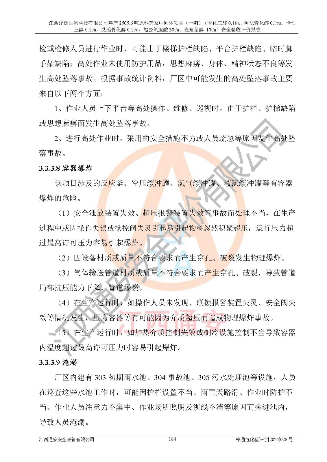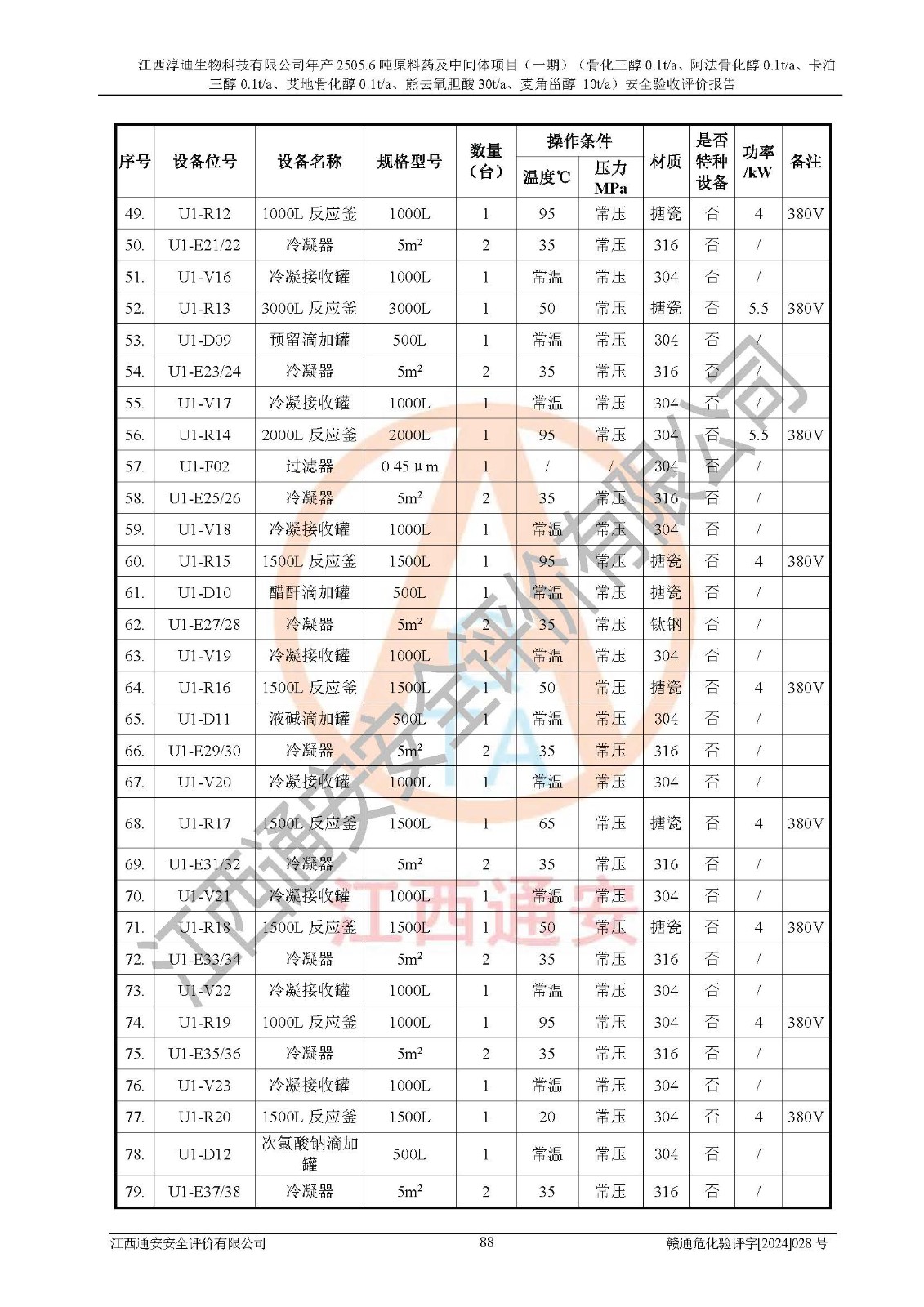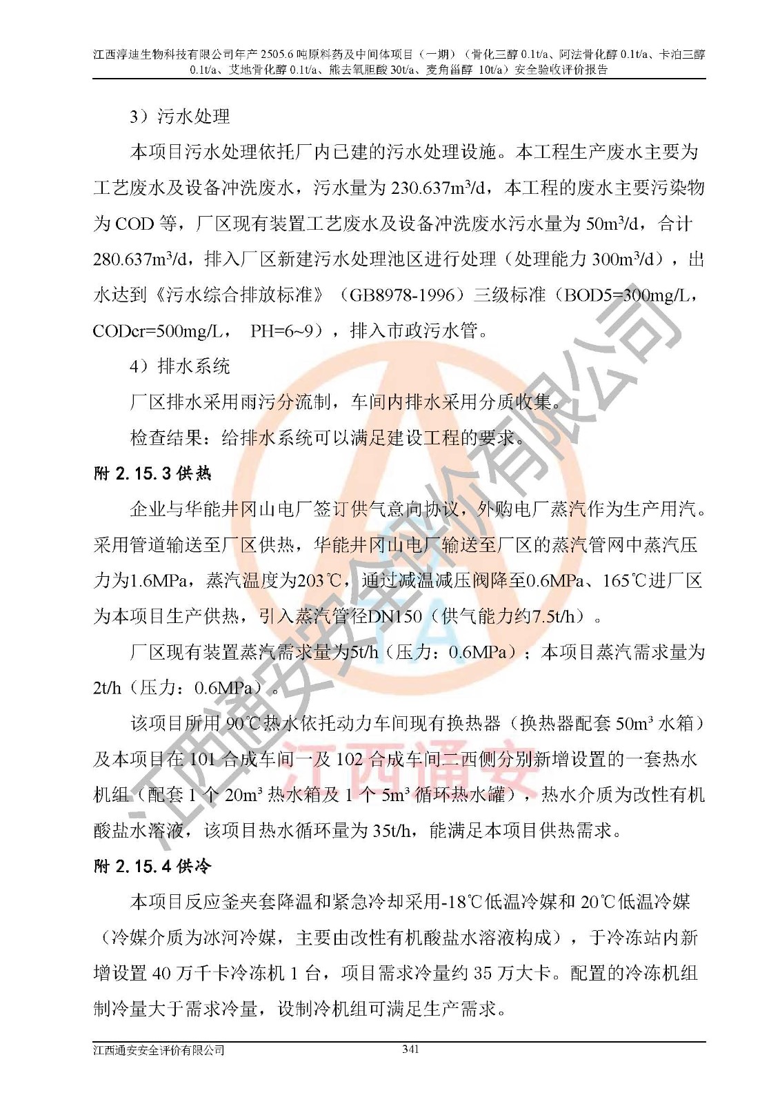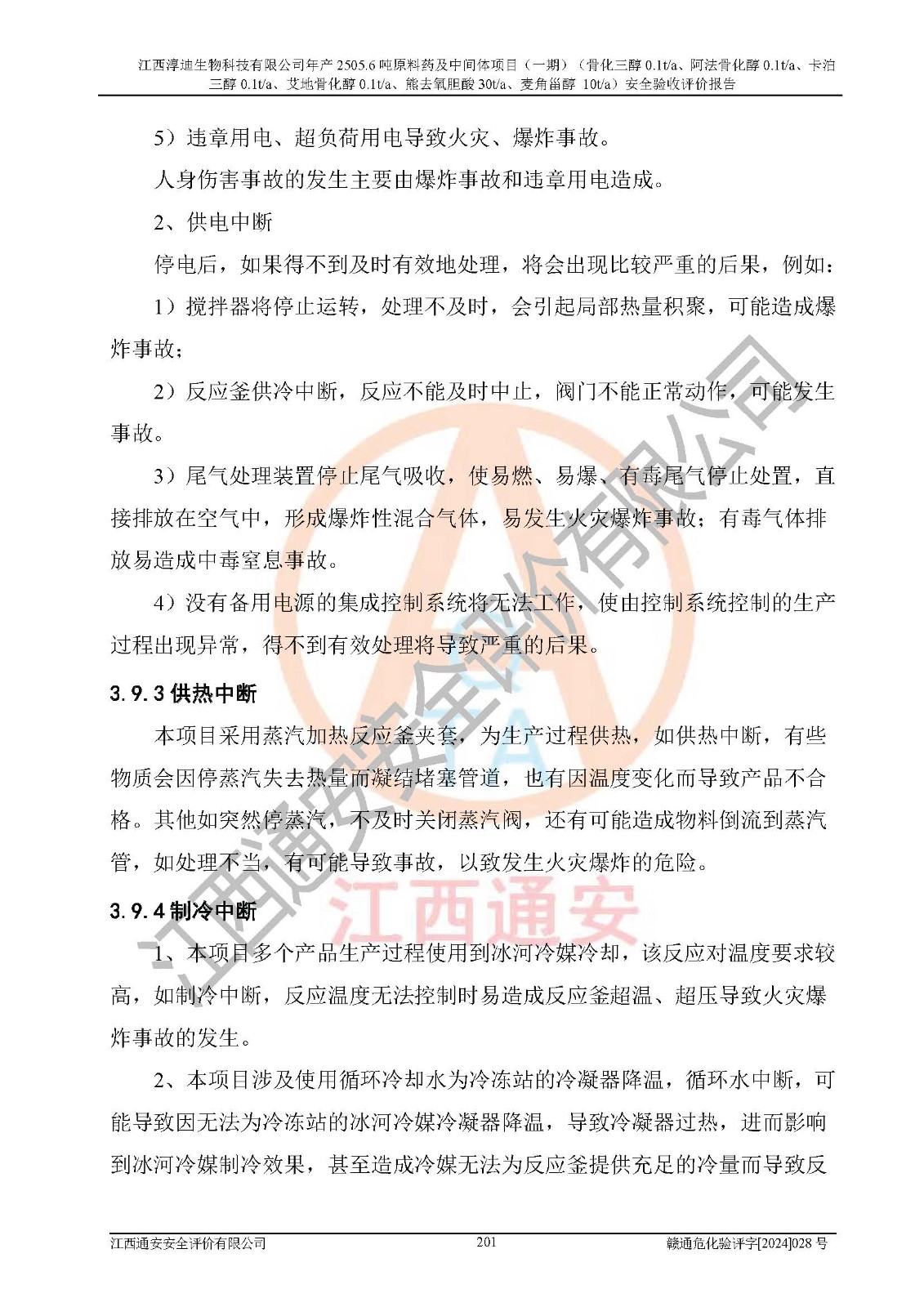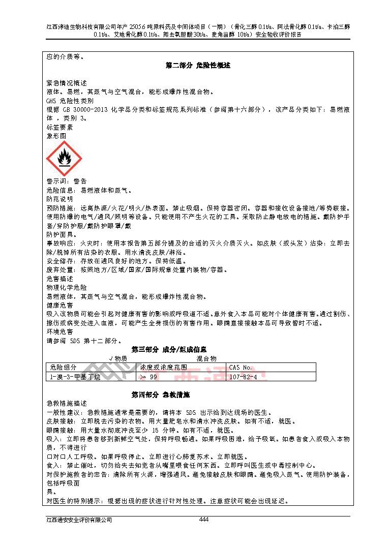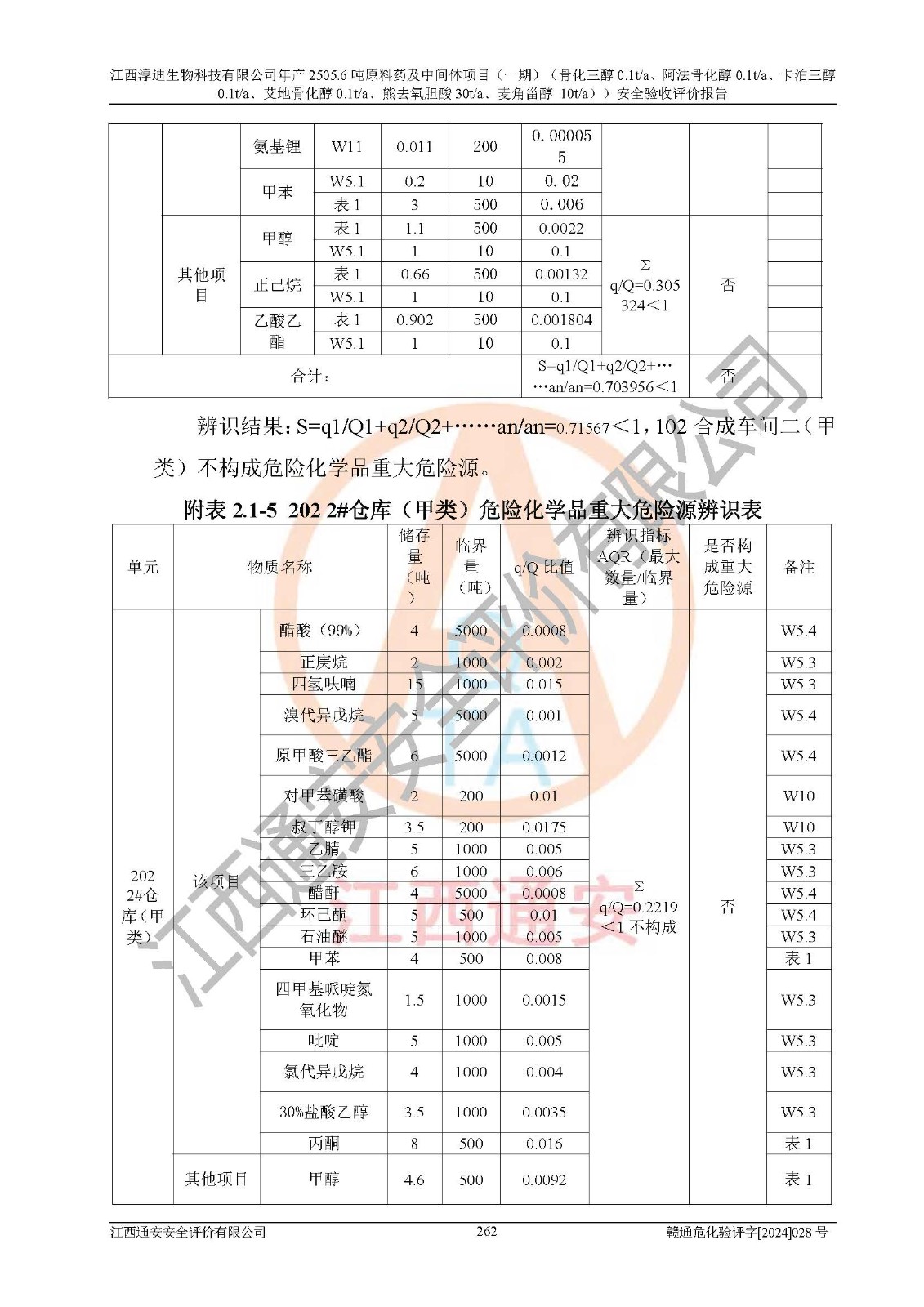 項目簡介 | 江西淳迪生物科技有限公司成立于2007年;2018年5月11日,為了適應市場需求和企業(yè)發(fā)展,該公司更名為江西神田生物科技有限公司。2021年4月14日,該公司再次更名為江西淳迪生物科技有限公司。 江西淳迪生物科技有限公司位于江西省**井岡山經濟技術開發(fā)區(qū),成立于2007年4月24日,并取得吉安市市場監(jiān)督管理局井岡山經濟技術開發(fā)區(qū)分局頒發(fā)的營業(yè)執(zhí)照,注冊資本叁仟萬元整,法定**人吳哲華,公司類型為其他有限責任公司,統(tǒng)一社會信用代碼:913608057994888273,經營范圍:許可項目:藥品生產,飼料生產,飼料添加劑生產,食品添加劑生產,獸藥生產(依法須經批準的項目,經相關部門批準后方可開展經營活動)一般項目:進出口代理,技術進出口,貨物進出口,**化學產品制造(不含危險化學品),生物飼料研發(fā),生物化工產品技術研發(fā),畜牧漁業(yè)飼料銷售,飼料添加劑銷售,食品添加劑銷售,飼料原料銷售(除許可業(yè)務外,可自主依法經營法律法規(guī)非禁止或限制的項目)。 江西神田生物科技有限公司于2020年11月11日取得江西省企業(yè)投資項目備案通知書,備案項目名稱:年產2505.6噸原料藥及中間體項目,項目統(tǒng)一代碼:2020-360861-27-03-012513。因江西神田生物科技有限公司于2021年4月14日將公司名稱變更為江西淳迪生物科技有限公司,2021年11月5日。江西淳迪生物科技有限公司將“年產2505.6噸原料藥及中間體項目”信息變更情況告知備案機關,并對備案內容進行修改,重新取得江西省企業(yè)投資項目備案通知書,備案項目名稱:年產2505.6噸原料藥及中間體項目,統(tǒng)一項目代碼:2111-360861-04-05-321685,項目總投資額30000萬元(3億元)。 江西淳迪生物科技有限公司于2021年4月委托江西贛安安全生產科學技術咨詢服務中心編制《江西淳迪生物科技有限公司年產2505.6噸原料藥及中間體項目(一期)安全條件評價報告》并于2021年6月23日通過了吉安市應急管理局組織的安全條件評價審查,審查通過后出具危險化學品建設項目安全條件評價審查意見書(編號為:吉市危化項目安條審字〔2021〕6號)。 江西淳迪生物科技有限公司于2022年12月委托廣東政和工程有限公司編制《江西淳迪生物科技有限公司年產2505.6噸原料藥及中間體項目(一期)安全設施設計》并于2023年2月3日通過了吉安市應急管理局組織的安全設施設計審查,審查通過后出具危險化學品建設項目安全設施設計審查意見書(編號為:吉市?;椖堪苍O審字〔2023〕2號)。 江西淳迪生物科技有限公司于2023年9月5日向井岡山經濟技術開發(fā)區(qū)應急管理局提交了《江西淳迪生物科技有限公司年產2505.6噸原料藥及中間體項目(一期:骨化三醇0.1t/a、阿法骨化醇0.1t/a、卡泊三醇0.1t/a、艾地骨化醇0.1t/a、地屈孕酮5t/a、熊去氧膽酸30t/a、麥角甾醇 10t/a)試生產方案》并取得井岡山經濟技術開發(fā)區(qū)應急管理局出具的《危險化學品建設項目試生產(使用)方案回執(zhí)》(回執(zhí)編號為:井開?;椖總渥帧?/span>2023〕04號),試生產的時間為2023年09月08日至2024年09月07日。 該工程涉及的氫氧化鈉、氯化銅、對甲苯磺酰氯、醋酸、甲醇、乙酸乙酯、正庚烷、四氫呋喃、溴代異戊烷、濃鹽酸、原甲酸三乙酯、對甲苯磺酸、正己烷、叔丁醇鉀、乙腈、三乙胺、醋酐、二氯甲烷、環(huán)己酮、石油醚、甲苯、磷酸、四甲基哌啶氮氧化物、次氯酸鈉溶液(**氯10%)、吡啶、30%鹽酸乙醇、**、鎂屑、硼氫化鈉、氨基鋰、氮氣、氯代異戊烷、氫氣(來自于鎂屑、硼氫化鈉反應后的尾氣或物料意外釋出)屬于危險化學品。其中**(第三類)、醋酐(第二類)、甲苯(第三類)、濃鹽酸(第三類)為易制毒化學品。甲苯、甲醇、乙酸乙酯、氫氣(來自于鎂屑、硼氫化鈉反應后的尾氣或物料意外釋出)屬于重點監(jiān)管的危險化學品。硼氫化鈉、鎂屑屬于易制爆危險化學品。甲醇屬于特別管控危險化學品。 該項目101合成車間一(反應釜U1-R20)及102合成車間二(反應釜U3-R05)麥角甾醇的氧化反應生產步驟涉及的氧化工藝屬于重點監(jiān)管的危險化工工藝。該項目中間體膽固醇的偶聯(lián)反應生產工序及骨化三醇中間體25-羥基脫氫膽固醇的偶聯(lián)反應生產工序涉及的格氏反應,參照重點監(jiān)管的危險化工工藝進行管控。 本項目生產單元和儲存設施單元不構成危險化學品重大危險源。 | |||