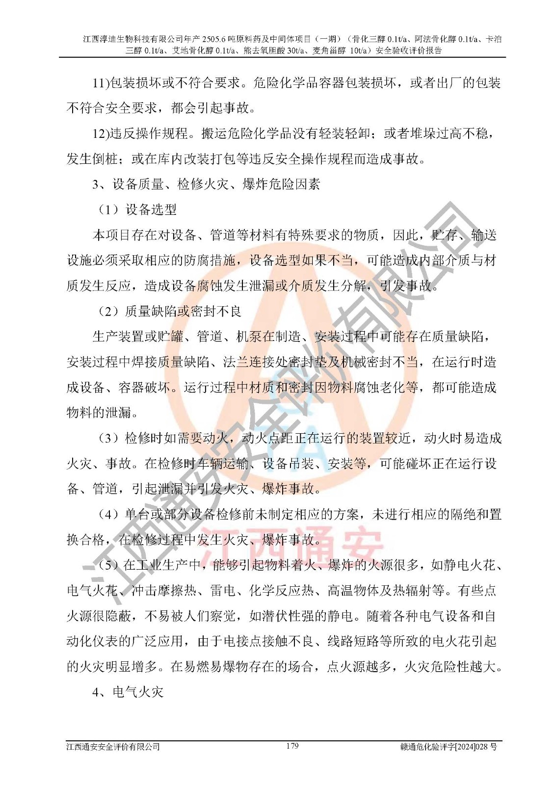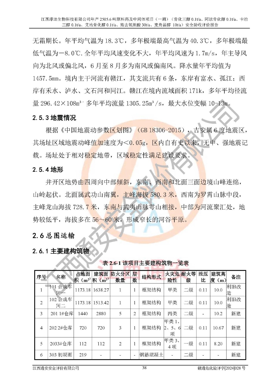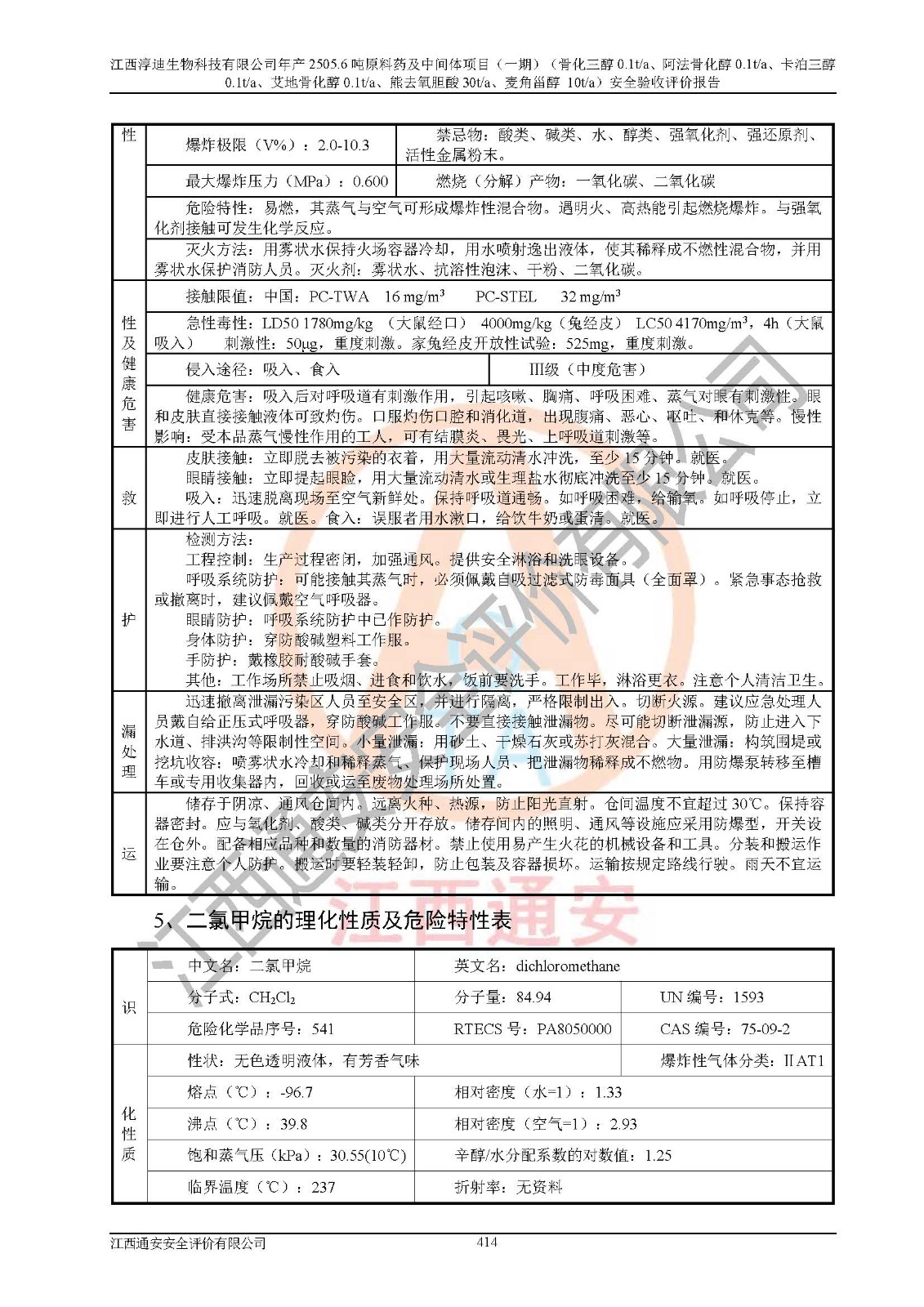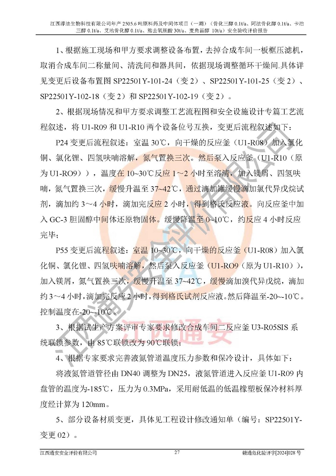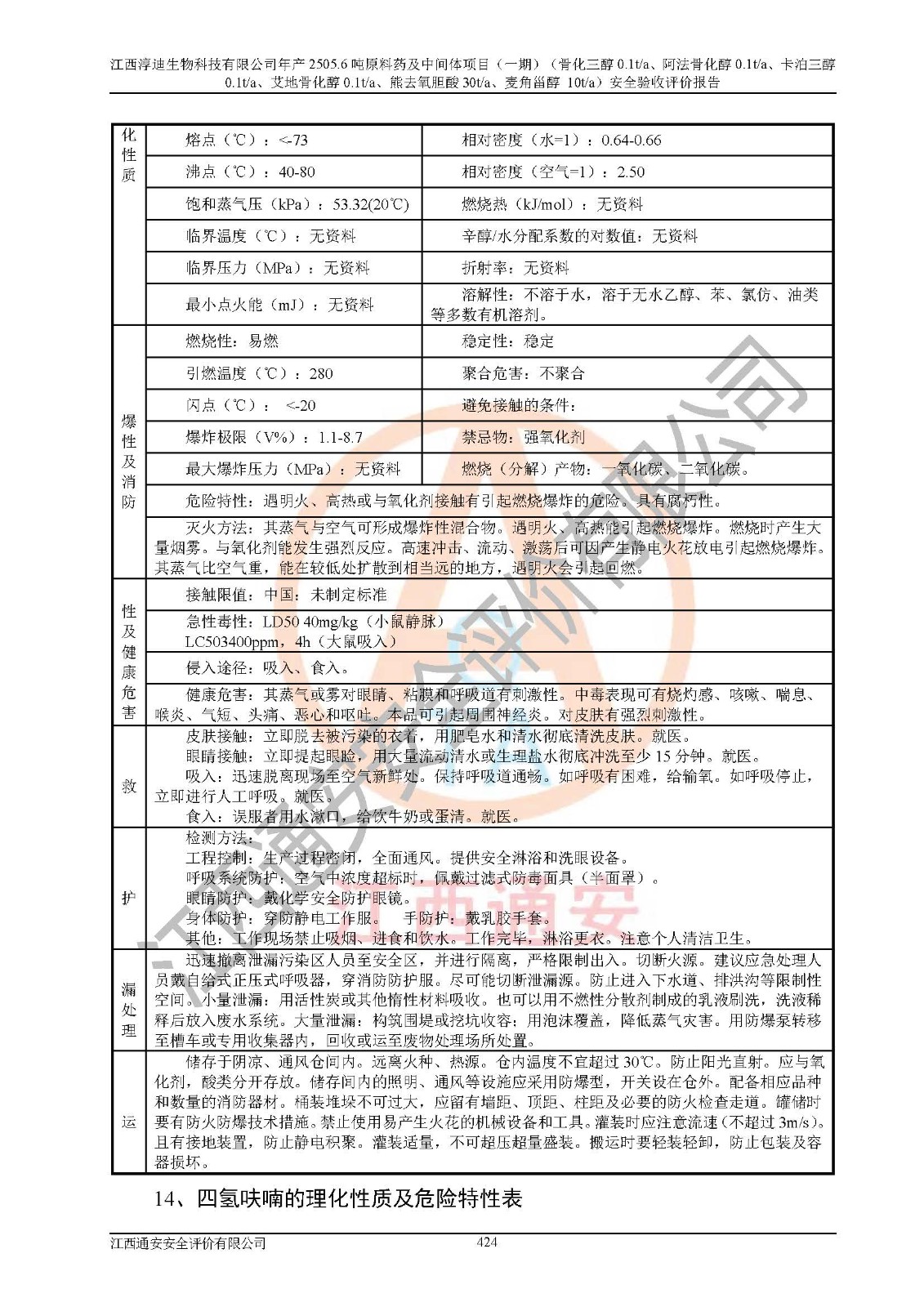 項目簡介 | 江西淳迪生物科技有限公司成立于2007年;2018年5月11日,為了適應市場需求和企業(yè)發(fā)展,該公司更名為江西神田生物科技有限公司。2021年4月14日,該公司再次更名為江西淳迪生物科技有限公司。 江西淳迪生物科技有限公司位于江西省**井岡山經濟技術開發(fā)區(qū),成立于2007年4月24日,并取得吉安市市場監(jiān)督管理局井岡山經濟技術開發(fā)區(qū)分局頒發(fā)的營業(yè)執(zhí)照,注冊資本叁仟萬元整,法定**人吳哲華,公司類型為其他有限責任公司,統(tǒng)一社會信用代碼:913608057994888273,經營范圍:許可項目:藥品生產,飼料生產,飼料添加劑生產,食品添加劑生產,獸藥生產(依法須經批準的項目,經相關部門批準后方可開展經營活動)一般項目:進出口代理,技術進出口,貨物進出口,**化學產品制造(不含危險化學品),生物飼料研發(fā),生物化工產品技術研發(fā),畜牧漁業(yè)飼料銷售,飼料添加劑銷售,食品添加劑銷售,飼料原料銷售(除許可業(yè)務外,可自主依法經營法律法規(guī)非禁止或限制的項目)。 江西神田生物科技有限公司于2020年11月11日取得江西省企業(yè)投資項目備案通知書,備案項目名稱:年產2505.6噸原料藥及中間體項目,項目統(tǒng)一代碼:2020-360861-27-03-012513。因江西神田生物科技有限公司于2021年4月14日將公司名稱變更為江西淳迪生物科技有限公司,2021年11月5日。江西淳迪生物科技有限公司將“年產2505.6噸原料藥及中間體項目”信息變更情況告知備案機關,并對備案內容進行修改,重新取得江西省企業(yè)投資項目備案通知書,備案項目名稱:年產2505.6噸原料藥及中間體項目,統(tǒng)一項目代碼:2111-360861-04-05-321685,項目總投資額30000萬元(3億元)。 江西淳迪生物科技有限公司于2021年4月委托江西贛安安全生產科學技術咨詢服務中心編制《江西淳迪生物科技有限公司年產2505.6噸原料藥及中間體項目(一期)安全條件評價報告》并于2021年6月23日通過了吉安市應急管理局組織的安全條件評價審查,審查通過后出具危險化學品建設項目安全條件評價審查意見書(編號為:吉市危化項目安條審字〔2021〕6號)。 江西淳迪生物科技有限公司于2022年12月委托廣東政和工程有限公司編制《江西淳迪生物科技有限公司年產2505.6噸原料藥及中間體項目(一期)安全設施設計》并于2023年2月3日通過了吉安市應急管理局組織的安全設施設計審查,審查通過后出具危險化學品建設項目安全設施設計審查意見書(編號為:吉市?;椖堪苍O審字〔2023〕2號)。 江西淳迪生物科技有限公司于2023年9月5日向井岡山經濟技術開發(fā)區(qū)應急管理局提交了《江西淳迪生物科技有限公司年產2505.6噸原料藥及中間體項目(一期:骨化三醇0.1t/a、阿法骨化醇0.1t/a、卡泊三醇0.1t/a、艾地骨化醇0.1t/a、地屈孕酮5t/a、熊去氧膽酸30t/a、麥角甾醇 10t/a)試生產方案》并取得井岡山經濟技術開發(fā)區(qū)應急管理局出具的《危險化學品建設項目試生產(使用)方案回執(zhí)》(回執(zhí)編號為:井開?;椖總渥帧?/span>2023〕04號),試生產的時間為2023年09月08日至2024年09月07日。 該工程涉及的氫氧化鈉、氯化銅、對甲苯磺酰氯、醋酸、甲醇、乙酸乙酯、正庚烷、四氫呋喃、溴代異戊烷、濃鹽酸、原甲酸三乙酯、對甲苯磺酸、正己烷、叔丁醇鉀、乙腈、三乙胺、醋酐、二氯甲烷、環(huán)己酮、石油醚、甲苯、磷酸、四甲基哌啶氮氧化物、次氯酸鈉溶液(**氯10%)、吡啶、30%鹽酸乙醇、**、鎂屑、硼氫化鈉、氨基鋰、氮氣、氯代異戊烷、氫氣(來自于鎂屑、硼氫化鈉反應后的尾氣或物料意外釋出)屬于危險化學品。其中**(第三類)、醋酐(第二類)、甲苯(第三類)、濃鹽酸(第三類)為易制毒化學品。甲苯、甲醇、乙酸乙酯、氫氣(來自于鎂屑、硼氫化鈉反應后的尾氣或物料意外釋出)屬于重點監(jiān)管的危險化學品。硼氫化鈉、鎂屑屬于易制爆危險化學品。甲醇屬于特別管控危險化學品。 該項目101合成車間一(反應釜U1-R20)及102合成車間二(反應釜U3-R05)麥角甾醇的氧化反應生產步驟涉及的氧化工藝屬于重點監(jiān)管的危險化工工藝。該項目中間體膽固醇的偶聯(lián)反應生產工序及骨化三醇中間體25-羥基脫氫膽固醇的偶聯(lián)反應生產工序涉及的格氏反應,參照重點監(jiān)管的危險化工工藝進行管控。 本項目生產單元和儲存設施單元不構成危險化學品重大危險源。 | |||