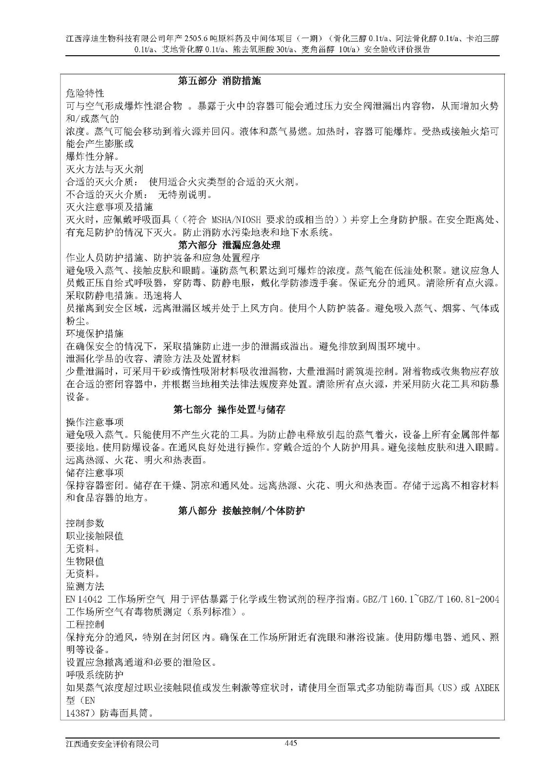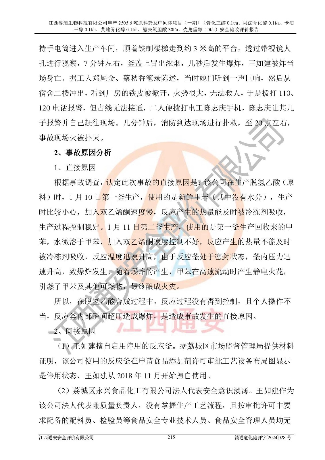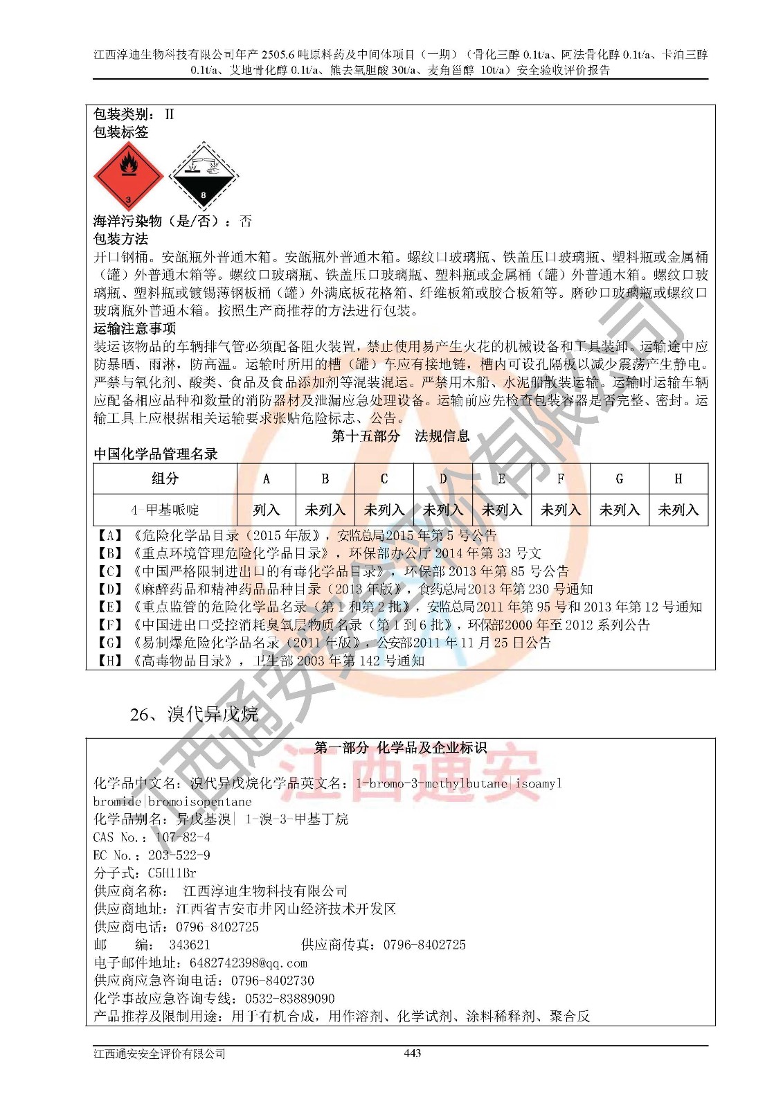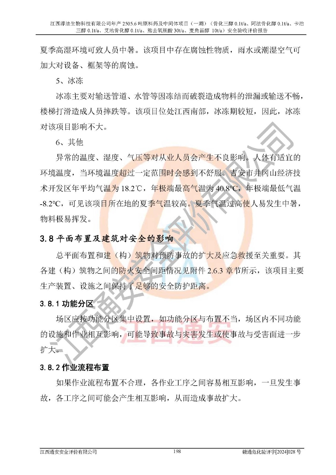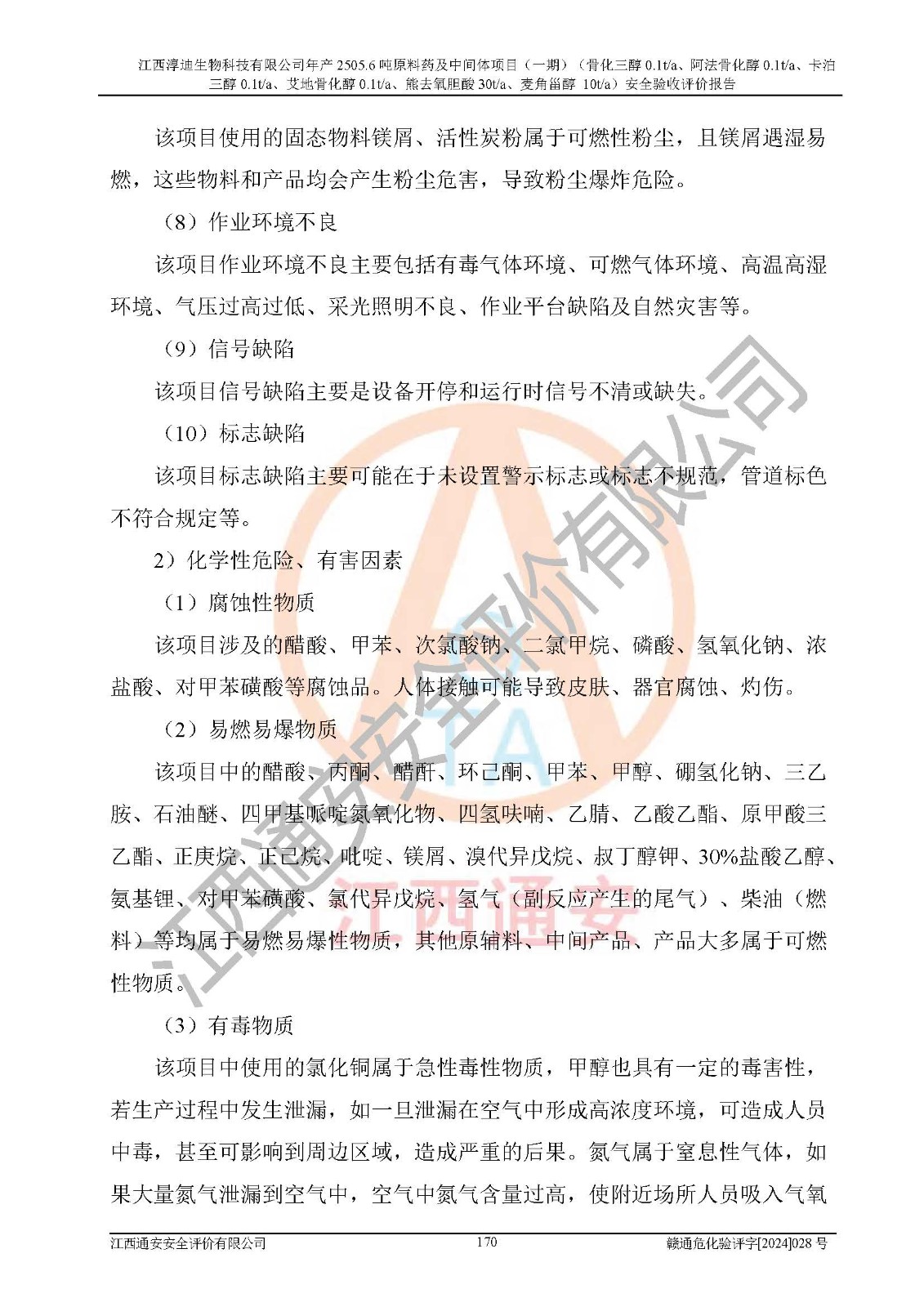 項目簡介 | 江西淳迪生物科技有限公司成立于2007年;2018年5月11日,為了適應市場需求和企業(yè)發(fā)展,該公司更名為江西神田生物科技有限公司。2021年4月14日,該公司再次更名為江西淳迪生物科技有限公司。 江西淳迪生物科技有限公司位于江西省**井岡山經濟技術開發(fā)區(qū),成立于2007年4月24日,并取得吉安市市場監(jiān)督管理局井岡山經濟技術開發(fā)區(qū)分局頒發(fā)的營業(yè)執(zhí)照,注冊資本叁仟萬元整,法定**人吳哲華,公司類型為其他有限責任公司,統(tǒng)一社會信用代碼:913608057994888273,經營范圍:許可項目:藥品生產,飼料生產,飼料添加劑生產,食品添加劑生產,獸藥生產(依法須經批準的項目,經相關部門批準后方可開展經營活動)一般項目:進出口代理,技術進出口,貨物進出口,**化學產品制造(不含危險化學品),生物飼料研發(fā),生物化工產品技術研發(fā),畜牧漁業(yè)飼料銷售,飼料添加劑銷售,食品添加劑銷售,飼料原料銷售(除許可業(yè)務外,可自主依法經營法律法規(guī)非禁止或限制的項目)。 江西神田生物科技有限公司于2020年11月11日取得江西省企業(yè)投資項目備案通知書,備案項目名稱:年產2505.6噸原料藥及中間體項目,項目統(tǒng)一代碼:2020-360861-27-03-012513。因江西神田生物科技有限公司于2021年4月14日將公司名稱變更為江西淳迪生物科技有限公司,2021年11月5日。江西淳迪生物科技有限公司將“年產2505.6噸原料藥及中間體項目”信息變更情況告知備案機關,并對備案內容進行修改,重新取得江西省企業(yè)投資項目備案通知書,備案項目名稱:年產2505.6噸原料藥及中間體項目,統(tǒng)一項目代碼:2111-360861-04-05-321685,項目總投資額30000萬元(3億元)。 江西淳迪生物科技有限公司于2021年4月委托江西贛安安全生產科學技術咨詢服務中心編制《江西淳迪生物科技有限公司年產2505.6噸原料藥及中間體項目(一期)安全條件評價報告》并于2021年6月23日通過了吉安市應急管理局組織的安全條件評價審查,審查通過后出具危險化學品建設項目安全條件評價審查意見書(編號為:吉市危化項目安條審字〔2021〕6號)。 江西淳迪生物科技有限公司于2022年12月委托廣東政和工程有限公司編制《江西淳迪生物科技有限公司年產2505.6噸原料藥及中間體項目(一期)安全設施設計》并于2023年2月3日通過了吉安市應急管理局組織的安全設施設計審查,審查通過后出具危險化學品建設項目安全設施設計審查意見書(編號為:吉市?;椖堪苍O審字〔2023〕2號)。 江西淳迪生物科技有限公司于2023年9月5日向井岡山經濟技術開發(fā)區(qū)應急管理局提交了《江西淳迪生物科技有限公司年產2505.6噸原料藥及中間體項目(一期:骨化三醇0.1t/a、阿法骨化醇0.1t/a、卡泊三醇0.1t/a、艾地骨化醇0.1t/a、地屈孕酮5t/a、熊去氧膽酸30t/a、麥角甾醇 10t/a)試生產方案》并取得井岡山經濟技術開發(fā)區(qū)應急管理局出具的《危險化學品建設項目試生產(使用)方案回執(zhí)》(回執(zhí)編號為:井開?;椖總渥帧?/span>2023〕04號),試生產的時間為2023年09月08日至2024年09月07日。 該工程涉及的氫氧化鈉、氯化銅、對甲苯磺酰氯、醋酸、甲醇、乙酸乙酯、正庚烷、四氫呋喃、溴代異戊烷、濃鹽酸、原甲酸三乙酯、對甲苯磺酸、正己烷、叔丁醇鉀、乙腈、三乙胺、醋酐、二氯甲烷、環(huán)己酮、石油醚、甲苯、磷酸、四甲基哌啶氮氧化物、次氯酸鈉溶液(**氯10%)、吡啶、30%鹽酸乙醇、**、鎂屑、硼氫化鈉、氨基鋰、氮氣、氯代異戊烷、氫氣(來自于鎂屑、硼氫化鈉反應后的尾氣或物料意外釋出)屬于危險化學品。其中**(第三類)、醋酐(第二類)、甲苯(第三類)、濃鹽酸(第三類)為易制毒化學品。甲苯、甲醇、乙酸乙酯、氫氣(來自于鎂屑、硼氫化鈉反應后的尾氣或物料意外釋出)屬于重點監(jiān)管的危險化學品。硼氫化鈉、鎂屑屬于易制爆危險化學品。甲醇屬于特別管控危險化學品。 該項目101合成車間一(反應釜U1-R20)及102合成車間二(反應釜U3-R05)麥角甾醇的氧化反應生產步驟涉及的氧化工藝屬于重點監(jiān)管的危險化工工藝。該項目中間體膽固醇的偶聯(lián)反應生產工序及骨化三醇中間體25-羥基脫氫膽固醇的偶聯(lián)反應生產工序涉及的格氏反應,參照重點監(jiān)管的危險化工工藝進行管控。 本項目生產單元和儲存設施單元不構成危險化學品重大危險源。 | |||