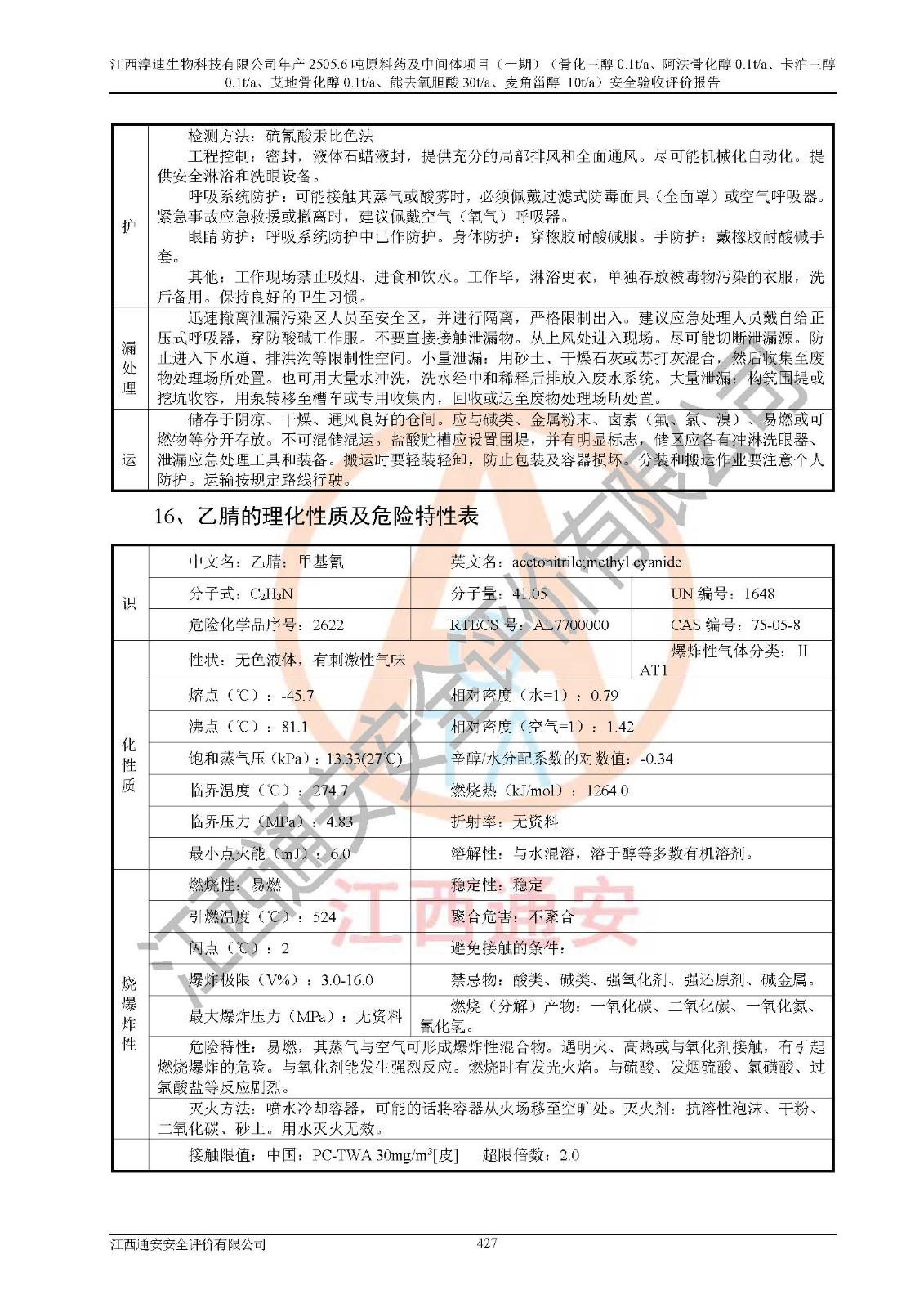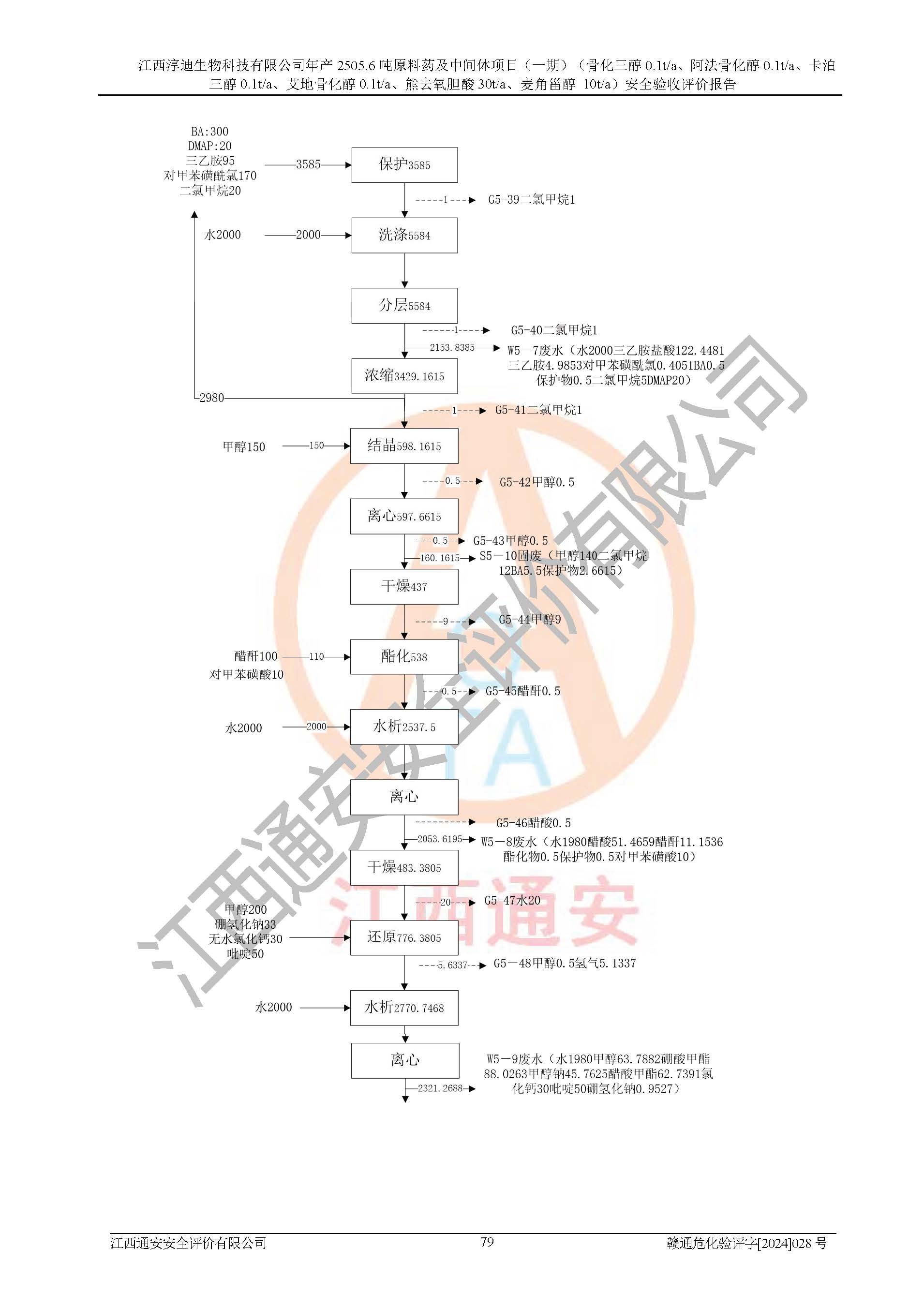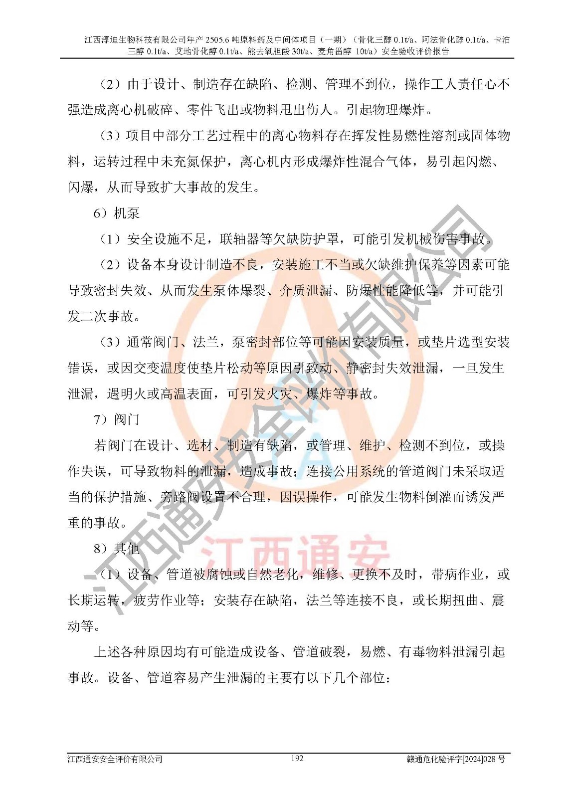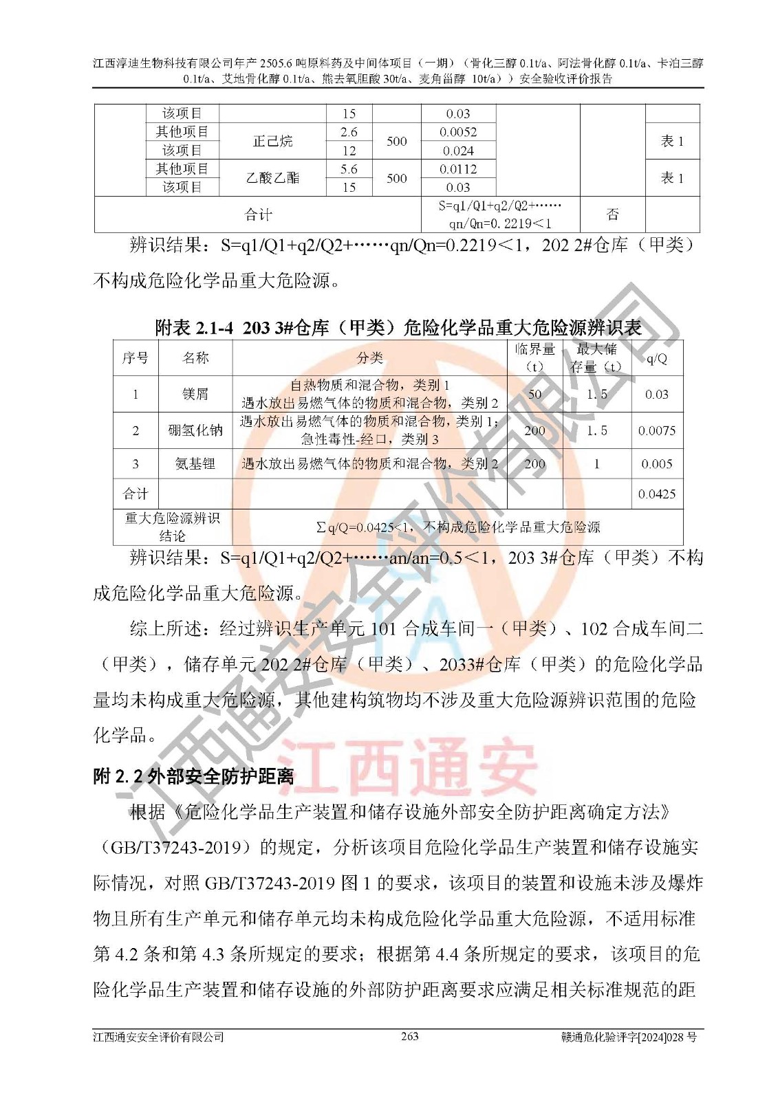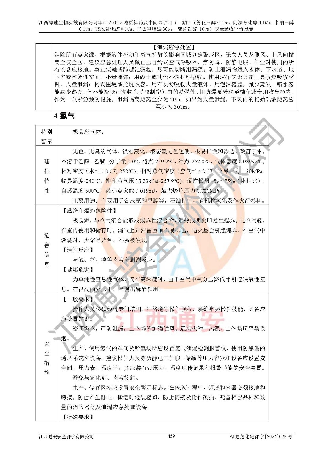 項目簡介 | 江西淳迪生物科技有限公司成立于2007年;2018年5月11日,為了適應市場需求和企業(yè)發(fā)展,該公司更名為江西神田生物科技有限公司。2021年4月14日,該公司再次更名為江西淳迪生物科技有限公司。 江西淳迪生物科技有限公司位于江西省**井岡山經濟技術開發(fā)區(qū),成立于2007年4月24日,并取得吉安市市場監(jiān)督管理局井岡山經濟技術開發(fā)區(qū)分局頒發(fā)的營業(yè)執(zhí)照,注冊資本叁仟萬元整,法定**人吳哲華,公司類型為其他有限責任公司,統(tǒng)一社會信用代碼:913608057994888273,經營范圍:許可項目:藥品生產,飼料生產,飼料添加劑生產,食品添加劑生產,獸藥生產(依法須經批準的項目,經相關部門批準后方可開展經營活動)一般項目:進出口代理,技術進出口,貨物進出口,**化學產品制造(不含危險化學品),生物飼料研發(fā),生物化工產品技術研發(fā),畜牧漁業(yè)飼料銷售,飼料添加劑銷售,食品添加劑銷售,飼料原料銷售(除許可業(yè)務外,可自主依法經營法律法規(guī)非禁止或限制的項目)。 江西神田生物科技有限公司于2020年11月11日取得江西省企業(yè)投資項目備案通知書,備案項目名稱:年產2505.6噸原料藥及中間體項目,項目統(tǒng)一代碼:2020-360861-27-03-012513。因江西神田生物科技有限公司于2021年4月14日將公司名稱變更為江西淳迪生物科技有限公司,2021年11月5日。江西淳迪生物科技有限公司將“年產2505.6噸原料藥及中間體項目”信息變更情況告知備案機關,并對備案內容進行修改,重新取得江西省企業(yè)投資項目備案通知書,備案項目名稱:年產2505.6噸原料藥及中間體項目,統(tǒng)一項目代碼:2111-360861-04-05-321685,項目總投資額30000萬元(3億元)。 江西淳迪生物科技有限公司于2021年4月委托江西贛安安全生產科學技術咨詢服務中心編制《江西淳迪生物科技有限公司年產2505.6噸原料藥及中間體項目(一期)安全條件評價報告》并于2021年6月23日通過了吉安市應急管理局組織的安全條件評價審查,審查通過后出具危險化學品建設項目安全條件評價審查意見書(編號為:吉市危化項目安條審字〔2021〕6號)。 江西淳迪生物科技有限公司于2022年12月委托廣東政和工程有限公司編制《江西淳迪生物科技有限公司年產2505.6噸原料藥及中間體項目(一期)安全設施設計》并于2023年2月3日通過了吉安市應急管理局組織的安全設施設計審查,審查通過后出具危險化學品建設項目安全設施設計審查意見書(編號為:吉市?;椖堪苍O審字〔2023〕2號)。 江西淳迪生物科技有限公司于2023年9月5日向井岡山經濟技術開發(fā)區(qū)應急管理局提交了《江西淳迪生物科技有限公司年產2505.6噸原料藥及中間體項目(一期:骨化三醇0.1t/a、阿法骨化醇0.1t/a、卡泊三醇0.1t/a、艾地骨化醇0.1t/a、地屈孕酮5t/a、熊去氧膽酸30t/a、麥角甾醇 10t/a)試生產方案》并取得井岡山經濟技術開發(fā)區(qū)應急管理局出具的《危險化學品建設項目試生產(使用)方案回執(zhí)》(回執(zhí)編號為:井開?;椖總渥帧?/span>2023〕04號),試生產的時間為2023年09月08日至2024年09月07日。 該工程涉及的氫氧化鈉、氯化銅、對甲苯磺酰氯、醋酸、甲醇、乙酸乙酯、正庚烷、四氫呋喃、溴代異戊烷、濃鹽酸、原甲酸三乙酯、對甲苯磺酸、正己烷、叔丁醇鉀、乙腈、三乙胺、醋酐、二氯甲烷、環(huán)己酮、石油醚、甲苯、磷酸、四甲基哌啶氮氧化物、次氯酸鈉溶液(**氯10%)、吡啶、30%鹽酸乙醇、**、鎂屑、硼氫化鈉、氨基鋰、氮氣、氯代異戊烷、氫氣(來自于鎂屑、硼氫化鈉反應后的尾氣或物料意外釋出)屬于危險化學品。其中**(第三類)、醋酐(第二類)、甲苯(第三類)、濃鹽酸(第三類)為易制毒化學品。甲苯、甲醇、乙酸乙酯、氫氣(來自于鎂屑、硼氫化鈉反應后的尾氣或物料意外釋出)屬于重點監(jiān)管的危險化學品。硼氫化鈉、鎂屑屬于易制爆危險化學品。甲醇屬于特別管控危險化學品。 該項目101合成車間一(反應釜U1-R20)及102合成車間二(反應釜U3-R05)麥角甾醇的氧化反應生產步驟涉及的氧化工藝屬于重點監(jiān)管的危險化工工藝。該項目中間體膽固醇的偶聯(lián)反應生產工序及骨化三醇中間體25-羥基脫氫膽固醇的偶聯(lián)反應生產工序涉及的格氏反應,參照重點監(jiān)管的危險化工工藝進行管控。 本項目生產單元和儲存設施單元不構成危險化學品重大危險源。 | |||
