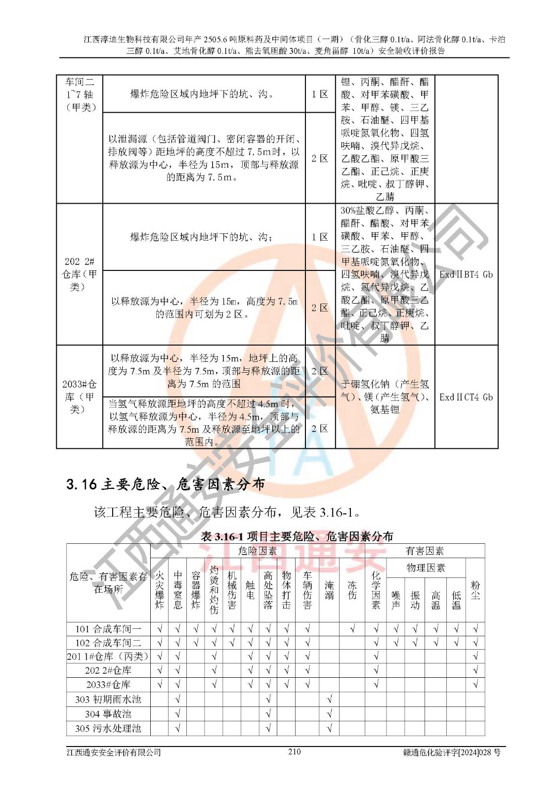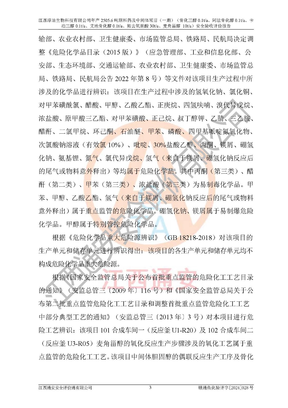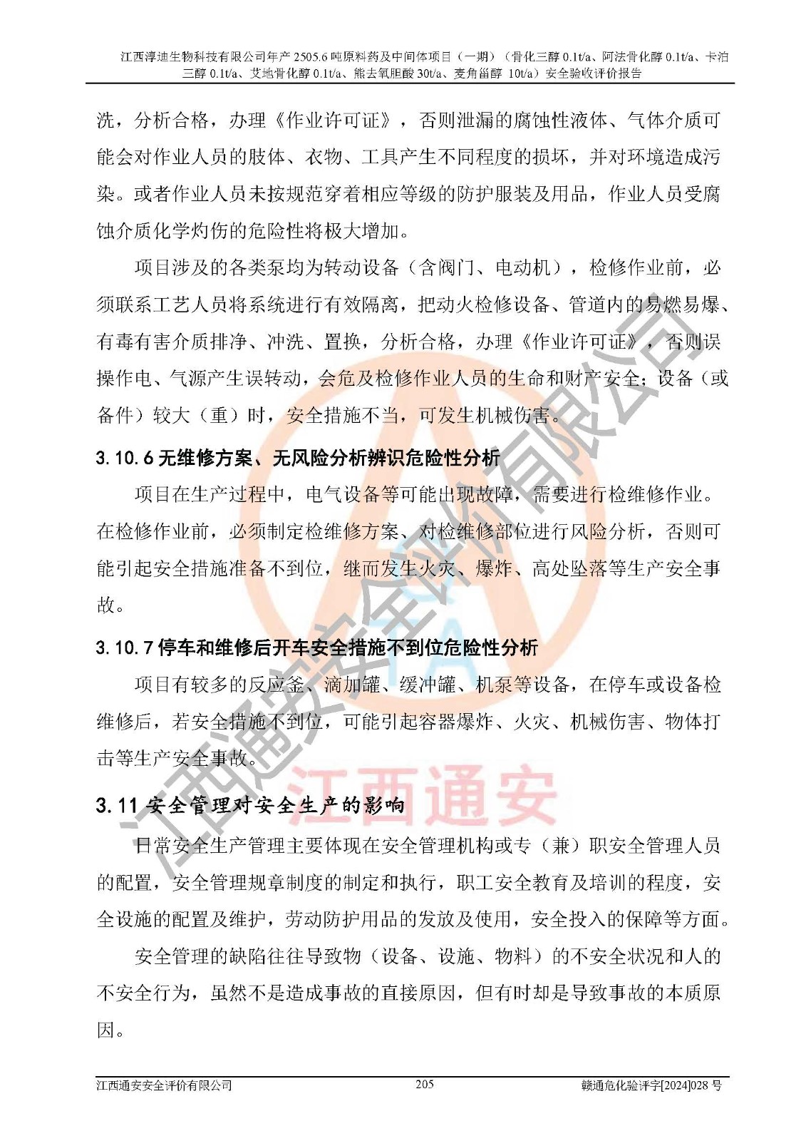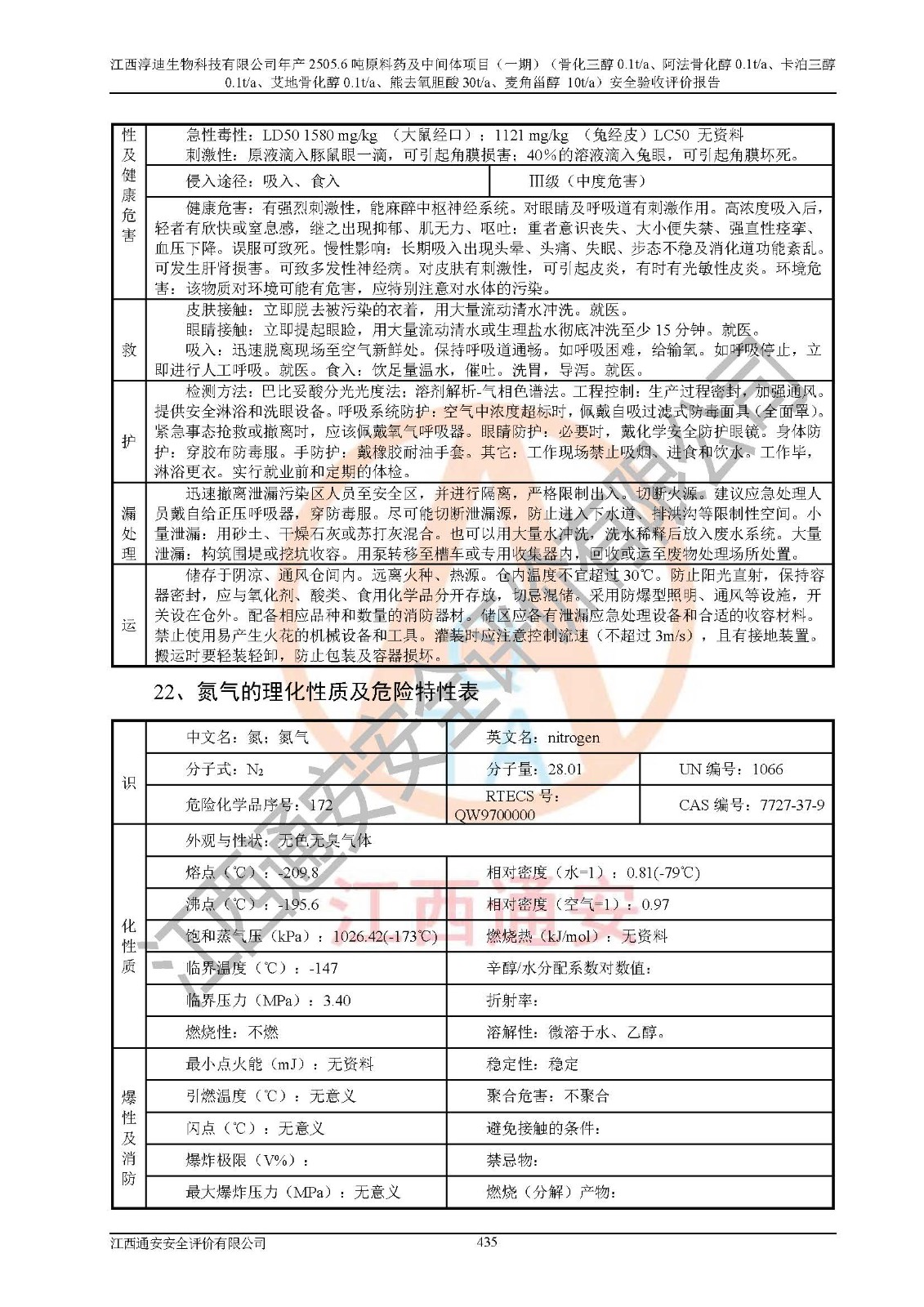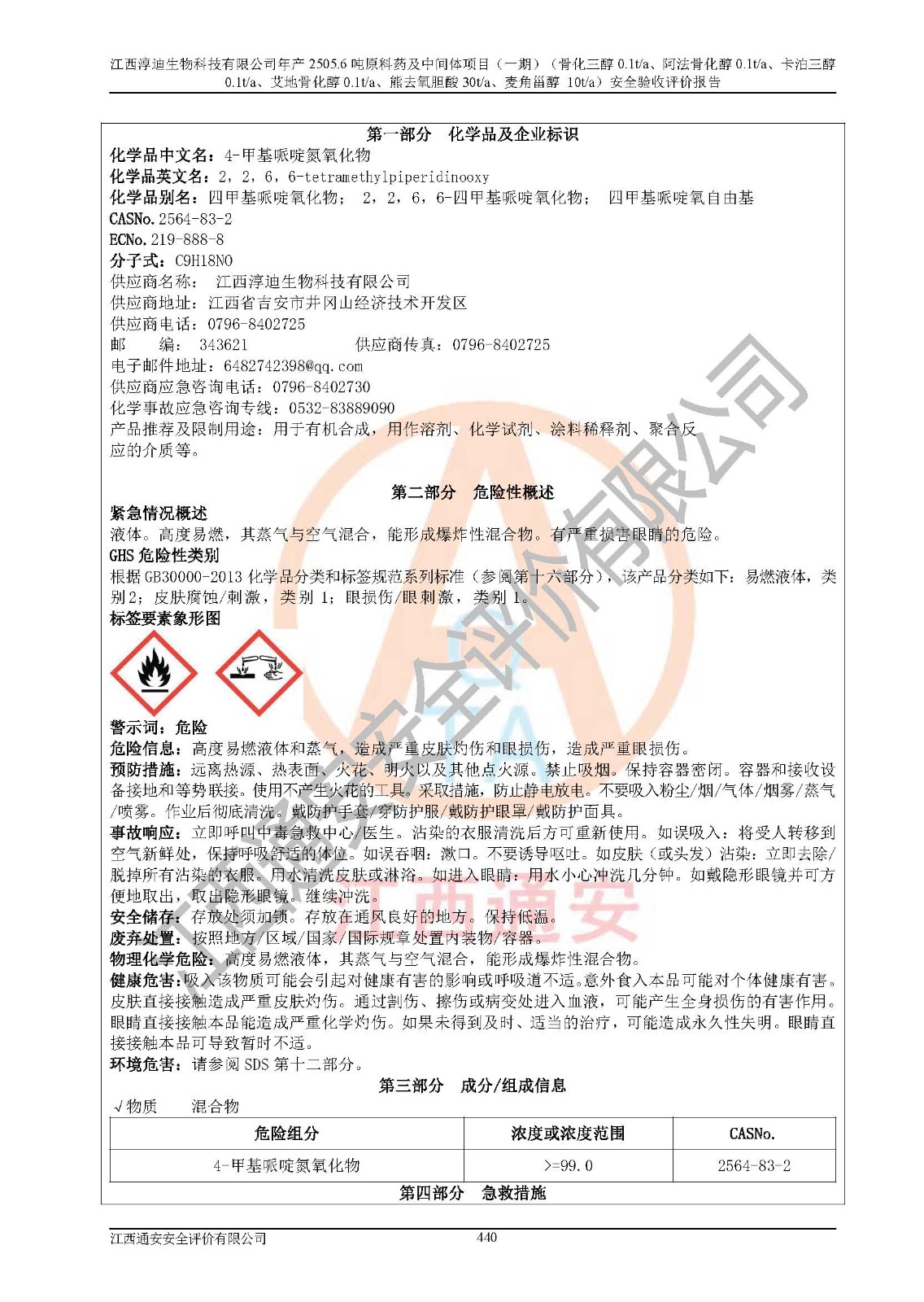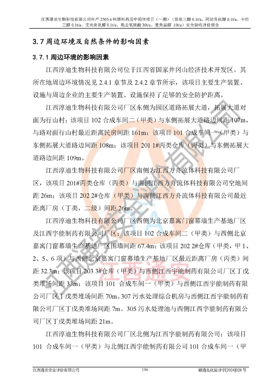 項目簡介 | 江西淳迪生物科技有限公司成立于2007年;2018年5月11日,為了適應市場需求和企業(yè)發(fā)展,該公司更名為江西神田生物科技有限公司。2021年4月14日,該公司再次更名為江西淳迪生物科技有限公司。 江西淳迪生物科技有限公司位于江西省**井岡山經濟技術開發(fā)區(qū),成立于2007年4月24日,并取得吉安市市場監(jiān)督管理局井岡山經濟技術開發(fā)區(qū)分局頒發(fā)的營業(yè)執(zhí)照,注冊資本叁仟萬元整,法定**人吳哲華,公司類型為其他有限責任公司,統(tǒng)一社會信用代碼:913608057994888273,經營范圍:許可項目:藥品生產,飼料生產,飼料添加劑生產,食品添加劑生產,獸藥生產(依法須經批準的項目,經相關部門批準后方可開展經營活動)一般項目:進出口代理,技術進出口,貨物進出口,**化學產品制造(不含危險化學品),生物飼料研發(fā),生物化工產品技術研發(fā),畜牧漁業(yè)飼料銷售,飼料添加劑銷售,食品添加劑銷售,飼料原料銷售(除許可業(yè)務外,可自主依法經營法律法規(guī)非禁止或限制的項目)。 江西神田生物科技有限公司于2020年11月11日取得江西省企業(yè)投資項目備案通知書,備案項目名稱:年產2505.6噸原料藥及中間體項目,項目統(tǒng)一代碼:2020-360861-27-03-012513。因江西神田生物科技有限公司于2021年4月14日將公司名稱變更為江西淳迪生物科技有限公司,2021年11月5日。江西淳迪生物科技有限公司將“年產2505.6噸原料藥及中間體項目”信息變更情況告知備案機關,并對備案內容進行修改,重新取得江西省企業(yè)投資項目備案通知書,備案項目名稱:年產2505.6噸原料藥及中間體項目,統(tǒng)一項目代碼:2111-360861-04-05-321685,項目總投資額30000萬元(3億元)。 江西淳迪生物科技有限公司于2021年4月委托江西贛安安全生產科學技術咨詢服務中心編制《江西淳迪生物科技有限公司年產2505.6噸原料藥及中間體項目(一期)安全條件評價報告》并于2021年6月23日通過了吉安市應急管理局組織的安全條件評價審查,審查通過后出具危險化學品建設項目安全條件評價審查意見書(編號為:吉市危化項目安條審字〔2021〕6號)。 江西淳迪生物科技有限公司于2022年12月委托廣東政和工程有限公司編制《江西淳迪生物科技有限公司年產2505.6噸原料藥及中間體項目(一期)安全設施設計》并于2023年2月3日通過了吉安市應急管理局組織的安全設施設計審查,審查通過后出具危險化學品建設項目安全設施設計審查意見書(編號為:吉市?;椖堪苍O審字〔2023〕2號)。 江西淳迪生物科技有限公司于2023年9月5日向井岡山經濟技術開發(fā)區(qū)應急管理局提交了《江西淳迪生物科技有限公司年產2505.6噸原料藥及中間體項目(一期:骨化三醇0.1t/a、阿法骨化醇0.1t/a、卡泊三醇0.1t/a、艾地骨化醇0.1t/a、地屈孕酮5t/a、熊去氧膽酸30t/a、麥角甾醇 10t/a)試生產方案》并取得井岡山經濟技術開發(fā)區(qū)應急管理局出具的《危險化學品建設項目試生產(使用)方案回執(zhí)》(回執(zhí)編號為:井開?;椖總渥帧?/span>2023〕04號),試生產的時間為2023年09月08日至2024年09月07日。 該工程涉及的氫氧化鈉、氯化銅、對甲苯磺酰氯、醋酸、甲醇、乙酸乙酯、正庚烷、四氫呋喃、溴代異戊烷、濃鹽酸、原甲酸三乙酯、對甲苯磺酸、正己烷、叔丁醇鉀、乙腈、三乙胺、醋酐、二氯甲烷、環(huán)己酮、石油醚、甲苯、磷酸、四甲基哌啶氮氧化物、次氯酸鈉溶液(**氯10%)、吡啶、30%鹽酸乙醇、**、鎂屑、硼氫化鈉、氨基鋰、氮氣、氯代異戊烷、氫氣(來自于鎂屑、硼氫化鈉反應后的尾氣或物料意外釋出)屬于危險化學品。其中**(第三類)、醋酐(第二類)、甲苯(第三類)、濃鹽酸(第三類)為易制毒化學品。甲苯、甲醇、乙酸乙酯、氫氣(來自于鎂屑、硼氫化鈉反應后的尾氣或物料意外釋出)屬于重點監(jiān)管的危險化學品。硼氫化鈉、鎂屑屬于易制爆危險化學品。甲醇屬于特別管控危險化學品。 該項目101合成車間一(反應釜U1-R20)及102合成車間二(反應釜U3-R05)麥角甾醇的氧化反應生產步驟涉及的氧化工藝屬于重點監(jiān)管的危險化工工藝。該項目中間體膽固醇的偶聯(lián)反應生產工序及骨化三醇中間體25-羥基脫氫膽固醇的偶聯(lián)反應生產工序涉及的格氏反應,參照重點監(jiān)管的危險化工工藝進行管控。 本項目生產單元和儲存設施單元不構成危險化學品重大危險源。 | |||