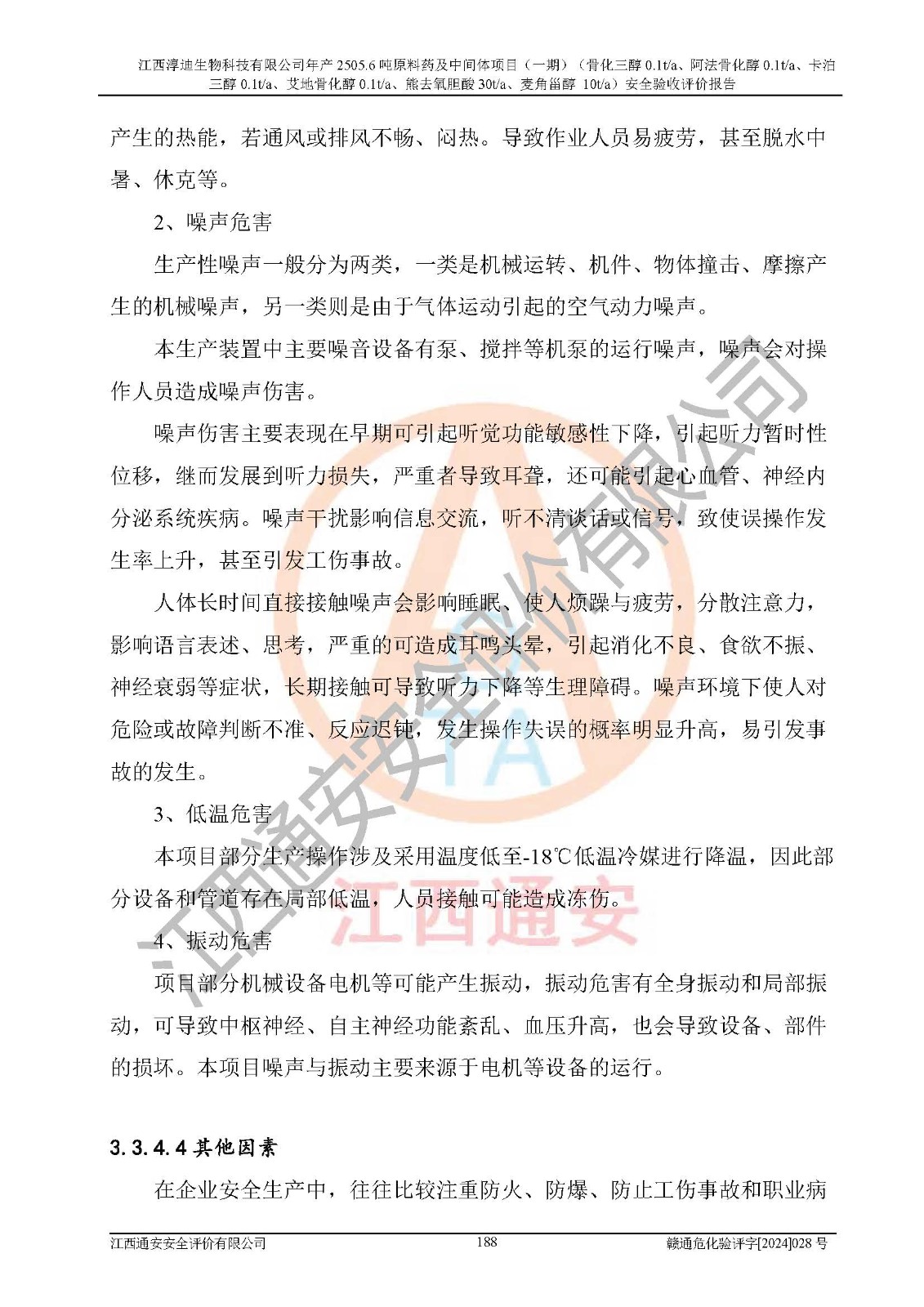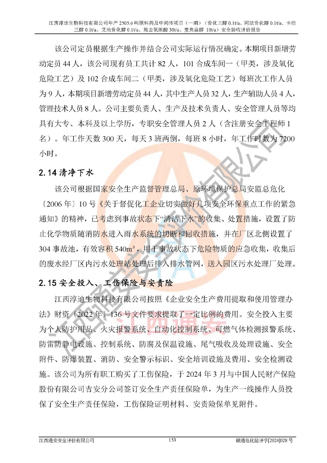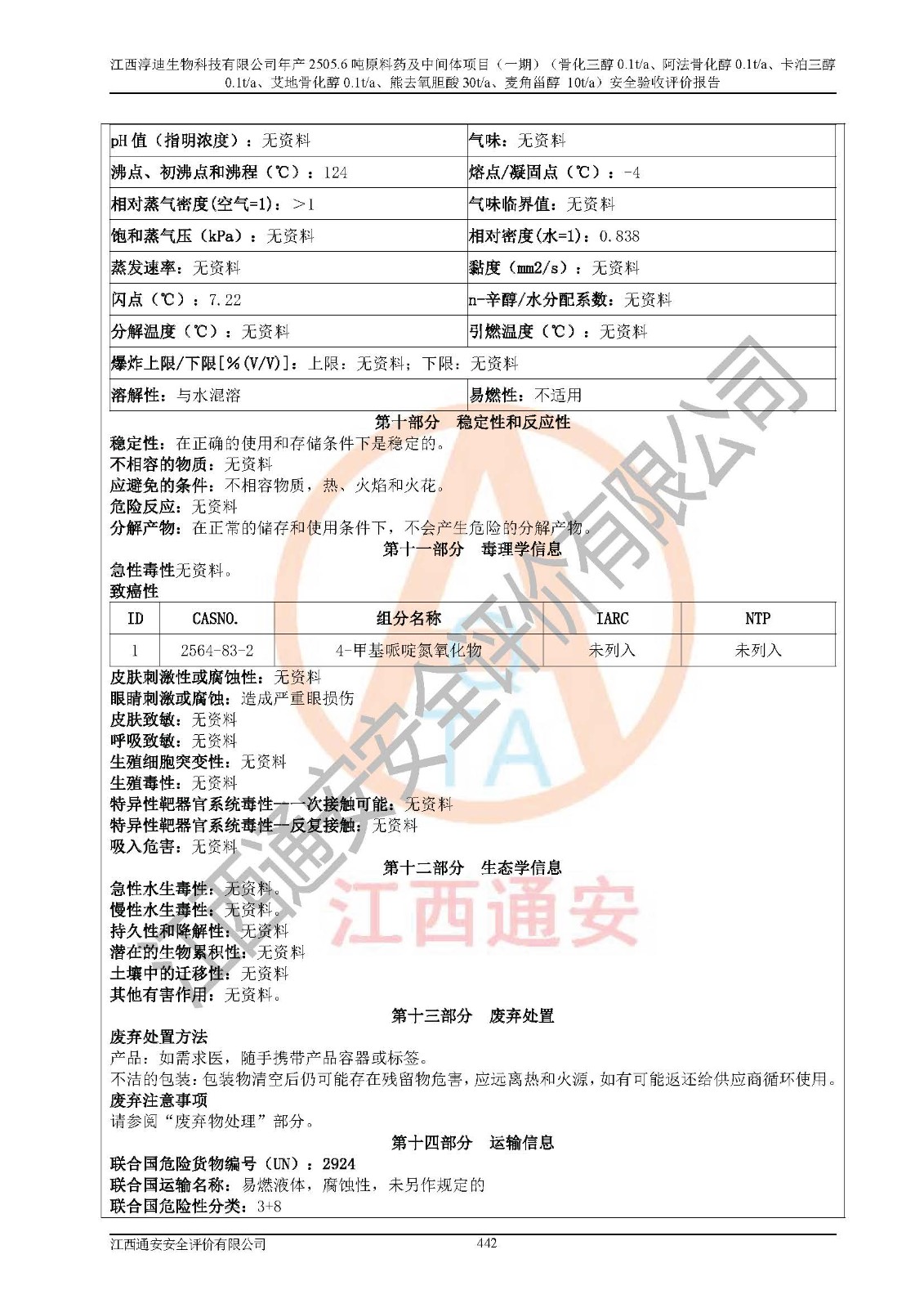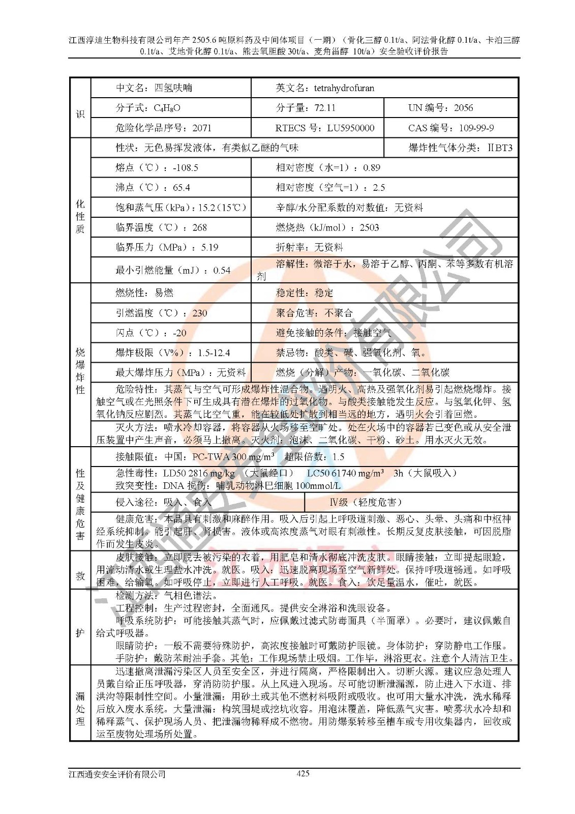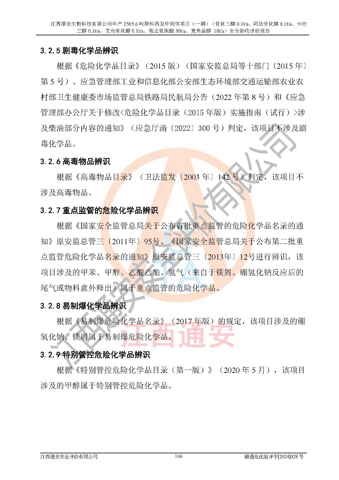 項目簡介 | 江西淳迪生物科技有限公司成立于2007年;2018年5月11日,為了適應市場需求和企業(yè)發(fā)展,該公司更名為江西神田生物科技有限公司。2021年4月14日,該公司再次更名為江西淳迪生物科技有限公司。 江西淳迪生物科技有限公司位于江西省**井岡山經濟技術開發(fā)區(qū),成立于2007年4月24日,并取得吉安市市場監(jiān)督管理局井岡山經濟技術開發(fā)區(qū)分局頒發(fā)的營業(yè)執(zhí)照,注冊資本叁仟萬元整,法定**人吳哲華,公司類型為其他有限責任公司,統(tǒng)一社會信用代碼:913608057994888273,經營范圍:許可項目:藥品生產,飼料生產,飼料添加劑生產,食品添加劑生產,獸藥生產(依法須經批準的項目,經相關部門批準后方可開展經營活動)一般項目:進出口代理,技術進出口,貨物進出口,**化學產品制造(不含危險化學品),生物飼料研發(fā),生物化工產品技術研發(fā),畜牧漁業(yè)飼料銷售,飼料添加劑銷售,食品添加劑銷售,飼料原料銷售(除許可業(yè)務外,可自主依法經營法律法規(guī)非禁止或限制的項目)。 江西神田生物科技有限公司于2020年11月11日取得江西省企業(yè)投資項目備案通知書,備案項目名稱:年產2505.6噸原料藥及中間體項目,項目統(tǒng)一代碼:2020-360861-27-03-012513。因江西神田生物科技有限公司于2021年4月14日將公司名稱變更為江西淳迪生物科技有限公司,2021年11月5日。江西淳迪生物科技有限公司將“年產2505.6噸原料藥及中間體項目”信息變更情況告知備案機關,并對備案內容進行修改,重新取得江西省企業(yè)投資項目備案通知書,備案項目名稱:年產2505.6噸原料藥及中間體項目,統(tǒng)一項目代碼:2111-360861-04-05-321685,項目總投資額30000萬元(3億元)。 江西淳迪生物科技有限公司于2021年4月委托江西贛安安全生產科學技術咨詢服務中心編制《江西淳迪生物科技有限公司年產2505.6噸原料藥及中間體項目(一期)安全條件評價報告》并于2021年6月23日通過了吉安市應急管理局組織的安全條件評價審查,審查通過后出具危險化學品建設項目安全條件評價審查意見書(編號為:吉市危化項目安條審字〔2021〕6號)。 江西淳迪生物科技有限公司于2022年12月委托廣東政和工程有限公司編制《江西淳迪生物科技有限公司年產2505.6噸原料藥及中間體項目(一期)安全設施設計》并于2023年2月3日通過了吉安市應急管理局組織的安全設施設計審查,審查通過后出具危險化學品建設項目安全設施設計審查意見書(編號為:吉市?;椖堪苍O審字〔2023〕2號)。 江西淳迪生物科技有限公司于2023年9月5日向井岡山經濟技術開發(fā)區(qū)應急管理局提交了《江西淳迪生物科技有限公司年產2505.6噸原料藥及中間體項目(一期:骨化三醇0.1t/a、阿法骨化醇0.1t/a、卡泊三醇0.1t/a、艾地骨化醇0.1t/a、地屈孕酮5t/a、熊去氧膽酸30t/a、麥角甾醇 10t/a)試生產方案》并取得井岡山經濟技術開發(fā)區(qū)應急管理局出具的《危險化學品建設項目試生產(使用)方案回執(zhí)》(回執(zhí)編號為:井開?;椖總渥帧?/span>2023〕04號),試生產的時間為2023年09月08日至2024年09月07日。 該工程涉及的氫氧化鈉、氯化銅、對甲苯磺酰氯、醋酸、甲醇、乙酸乙酯、正庚烷、四氫呋喃、溴代異戊烷、濃鹽酸、原甲酸三乙酯、對甲苯磺酸、正己烷、叔丁醇鉀、乙腈、三乙胺、醋酐、二氯甲烷、環(huán)己酮、石油醚、甲苯、磷酸、四甲基哌啶氮氧化物、次氯酸鈉溶液(**氯10%)、吡啶、30%鹽酸乙醇、**、鎂屑、硼氫化鈉、氨基鋰、氮氣、氯代異戊烷、氫氣(來自于鎂屑、硼氫化鈉反應后的尾氣或物料意外釋出)屬于危險化學品。其中**(第三類)、醋酐(第二類)、甲苯(第三類)、濃鹽酸(第三類)為易制毒化學品。甲苯、甲醇、乙酸乙酯、氫氣(來自于鎂屑、硼氫化鈉反應后的尾氣或物料意外釋出)屬于重點監(jiān)管的危險化學品。硼氫化鈉、鎂屑屬于易制爆危險化學品。甲醇屬于特別管控危險化學品。 該項目101合成車間一(反應釜U1-R20)及102合成車間二(反應釜U3-R05)麥角甾醇的氧化反應生產步驟涉及的氧化工藝屬于重點監(jiān)管的危險化工工藝。該項目中間體膽固醇的偶聯(lián)反應生產工序及骨化三醇中間體25-羥基脫氫膽固醇的偶聯(lián)反應生產工序涉及的格氏反應,參照重點監(jiān)管的危險化工工藝進行管控。 本項目生產單元和儲存設施單元不構成危險化學品重大危險源。 | |||