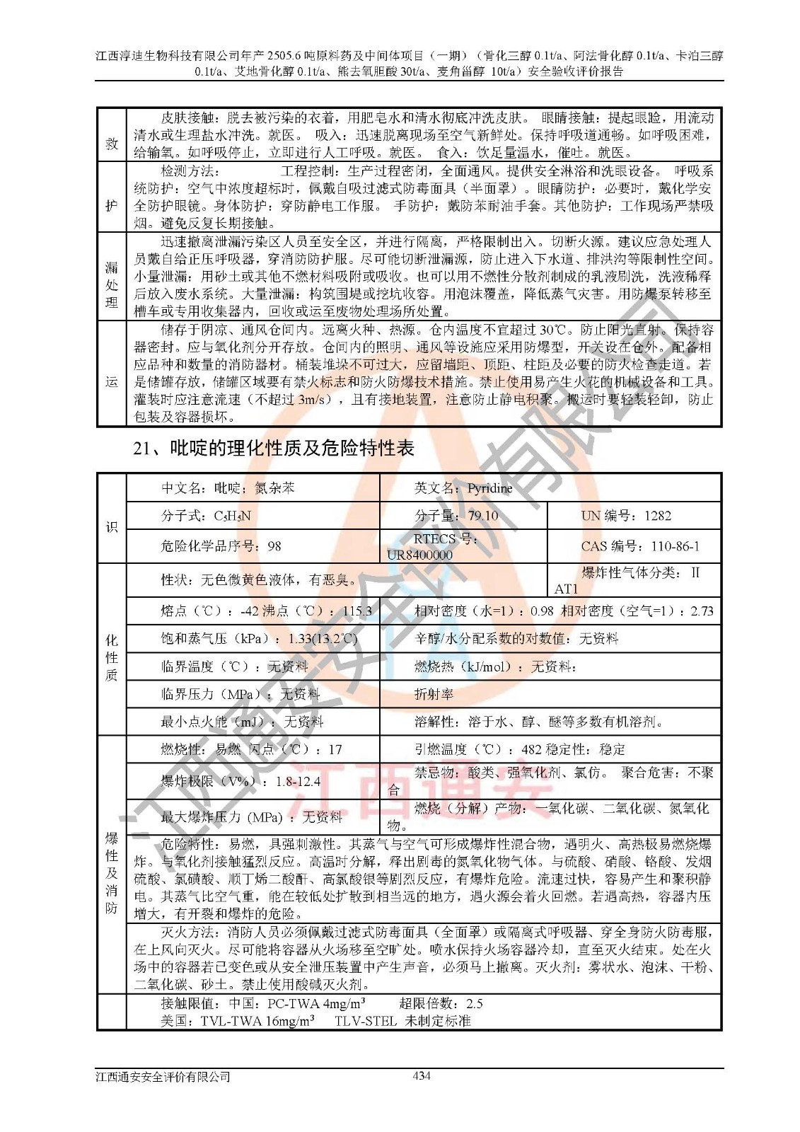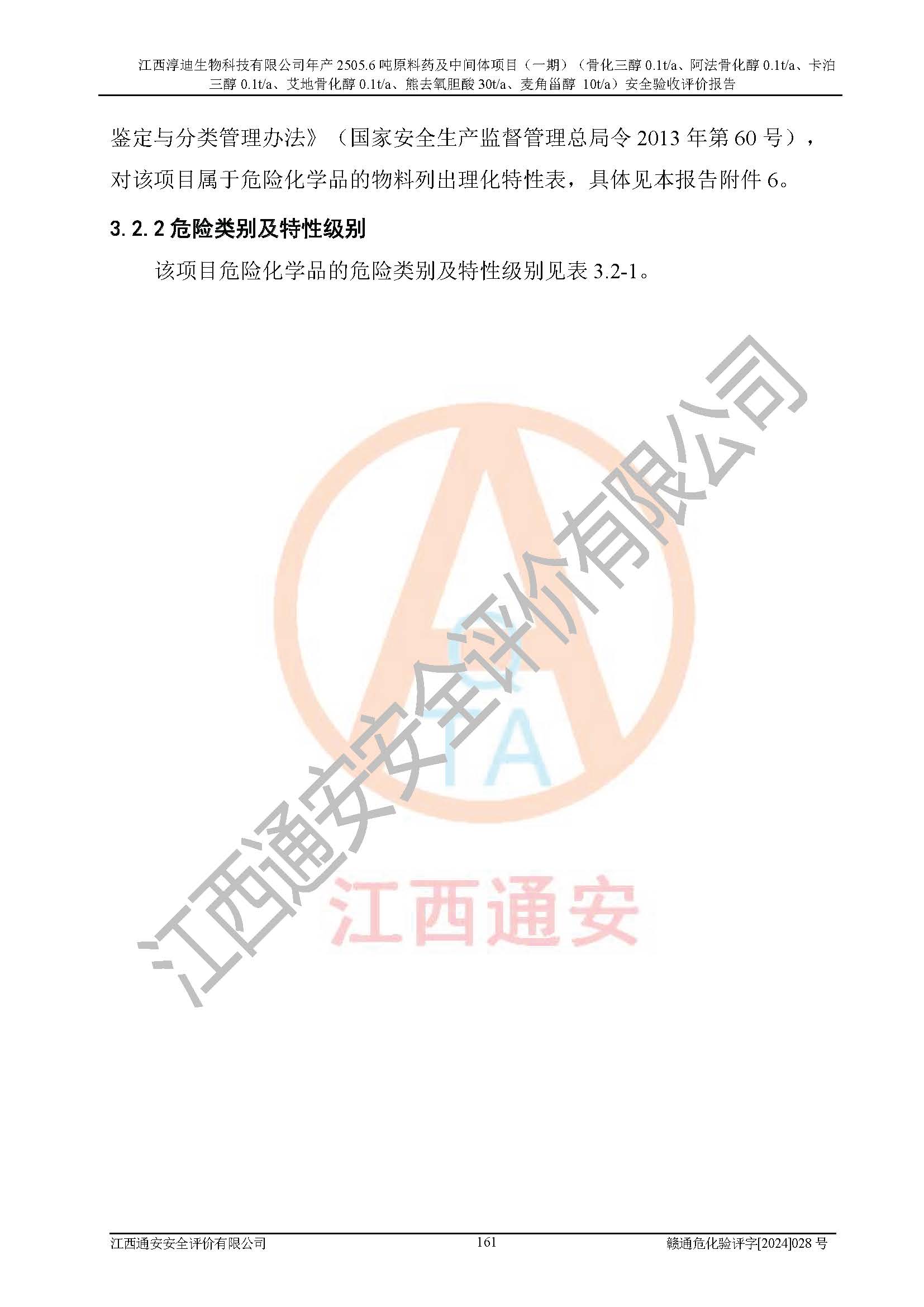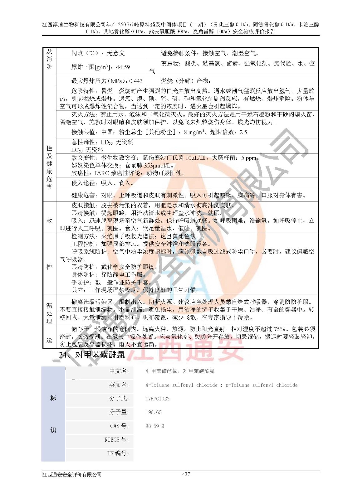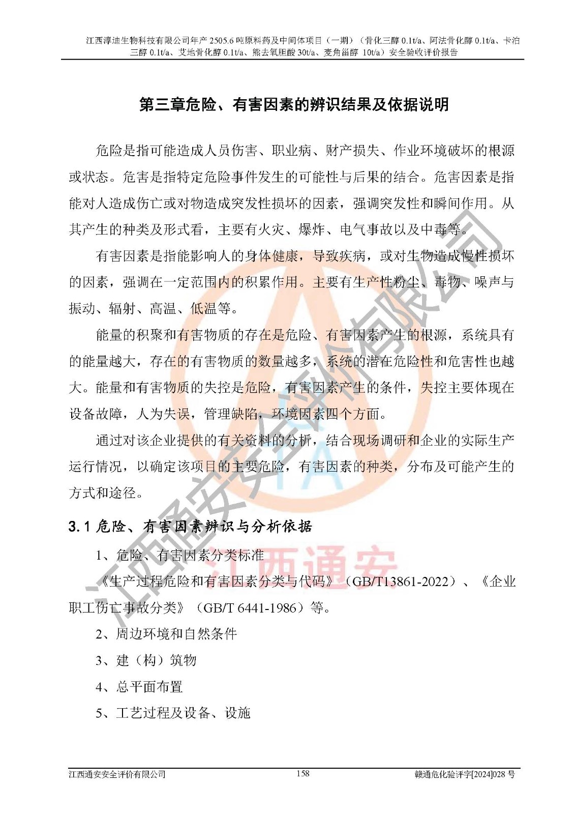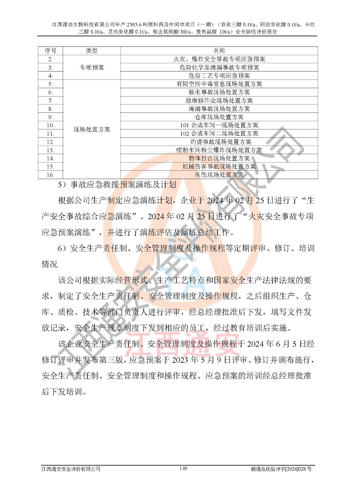 項目簡介 | 江西淳迪生物科技有限公司成立于2007年;2018年5月11日,為了適應市場需求和企業(yè)發(fā)展,該公司更名為江西神田生物科技有限公司。2021年4月14日,該公司再次更名為江西淳迪生物科技有限公司。 江西淳迪生物科技有限公司位于江西省**井岡山經濟技術開發(fā)區(qū),成立于2007年4月24日,并取得吉安市市場監(jiān)督管理局井岡山經濟技術開發(fā)區(qū)分局頒發(fā)的營業(yè)執(zhí)照,注冊資本叁仟萬元整,法定**人吳哲華,公司類型為其他有限責任公司,統(tǒng)一社會信用代碼:913608057994888273,經營范圍:許可項目:藥品生產,飼料生產,飼料添加劑生產,食品添加劑生產,獸藥生產(依法須經批準的項目,經相關部門批準后方可開展經營活動)一般項目:進出口代理,技術進出口,貨物進出口,**化學產品制造(不含危險化學品),生物飼料研發(fā),生物化工產品技術研發(fā),畜牧漁業(yè)飼料銷售,飼料添加劑銷售,食品添加劑銷售,飼料原料銷售(除許可業(yè)務外,可自主依法經營法律法規(guī)非禁止或限制的項目)。 江西神田生物科技有限公司于2020年11月11日取得江西省企業(yè)投資項目備案通知書,備案項目名稱:年產2505.6噸原料藥及中間體項目,項目統(tǒng)一代碼:2020-360861-27-03-012513。因江西神田生物科技有限公司于2021年4月14日將公司名稱變更為江西淳迪生物科技有限公司,2021年11月5日。江西淳迪生物科技有限公司將“年產2505.6噸原料藥及中間體項目”信息變更情況告知備案機關,并對備案內容進行修改,重新取得江西省企業(yè)投資項目備案通知書,備案項目名稱:年產2505.6噸原料藥及中間體項目,統(tǒng)一項目代碼:2111-360861-04-05-321685,項目總投資額30000萬元(3億元)。 江西淳迪生物科技有限公司于2021年4月委托江西贛安安全生產科學技術咨詢服務中心編制《江西淳迪生物科技有限公司年產2505.6噸原料藥及中間體項目(一期)安全條件評價報告》并于2021年6月23日通過了吉安市應急管理局組織的安全條件評價審查,審查通過后出具危險化學品建設項目安全條件評價審查意見書(編號為:吉市危化項目安條審字〔2021〕6號)。 江西淳迪生物科技有限公司于2022年12月委托廣東政和工程有限公司編制《江西淳迪生物科技有限公司年產2505.6噸原料藥及中間體項目(一期)安全設施設計》并于2023年2月3日通過了吉安市應急管理局組織的安全設施設計審查,審查通過后出具危險化學品建設項目安全設施設計審查意見書(編號為:吉市?;椖堪苍O審字〔2023〕2號)。 江西淳迪生物科技有限公司于2023年9月5日向井岡山經濟技術開發(fā)區(qū)應急管理局提交了《江西淳迪生物科技有限公司年產2505.6噸原料藥及中間體項目(一期:骨化三醇0.1t/a、阿法骨化醇0.1t/a、卡泊三醇0.1t/a、艾地骨化醇0.1t/a、地屈孕酮5t/a、熊去氧膽酸30t/a、麥角甾醇 10t/a)試生產方案》并取得井岡山經濟技術開發(fā)區(qū)應急管理局出具的《危險化學品建設項目試生產(使用)方案回執(zhí)》(回執(zhí)編號為:井開?;椖總渥帧?/span>2023〕04號),試生產的時間為2023年09月08日至2024年09月07日。 該工程涉及的氫氧化鈉、氯化銅、對甲苯磺酰氯、醋酸、甲醇、乙酸乙酯、正庚烷、四氫呋喃、溴代異戊烷、濃鹽酸、原甲酸三乙酯、對甲苯磺酸、正己烷、叔丁醇鉀、乙腈、三乙胺、醋酐、二氯甲烷、環(huán)己酮、石油醚、甲苯、磷酸、四甲基哌啶氮氧化物、次氯酸鈉溶液(**氯10%)、吡啶、30%鹽酸乙醇、**、鎂屑、硼氫化鈉、氨基鋰、氮氣、氯代異戊烷、氫氣(來自于鎂屑、硼氫化鈉反應后的尾氣或物料意外釋出)屬于危險化學品。其中**(第三類)、醋酐(第二類)、甲苯(第三類)、濃鹽酸(第三類)為易制毒化學品。甲苯、甲醇、乙酸乙酯、氫氣(來自于鎂屑、硼氫化鈉反應后的尾氣或物料意外釋出)屬于重點監(jiān)管的危險化學品。硼氫化鈉、鎂屑屬于易制爆危險化學品。甲醇屬于特別管控危險化學品。 該項目101合成車間一(反應釜U1-R20)及102合成車間二(反應釜U3-R05)麥角甾醇的氧化反應生產步驟涉及的氧化工藝屬于重點監(jiān)管的危險化工工藝。該項目中間體膽固醇的偶聯(lián)反應生產工序及骨化三醇中間體25-羥基脫氫膽固醇的偶聯(lián)反應生產工序涉及的格氏反應,參照重點監(jiān)管的危險化工工藝進行管控。 本項目生產單元和儲存設施單元不構成危險化學品重大危險源。 | |||