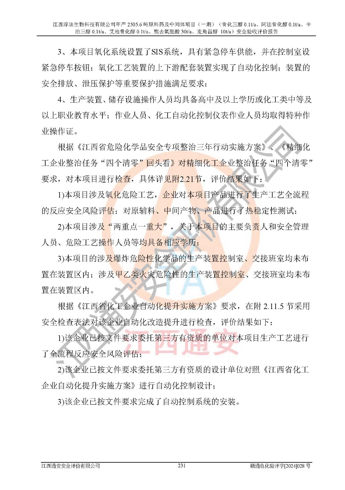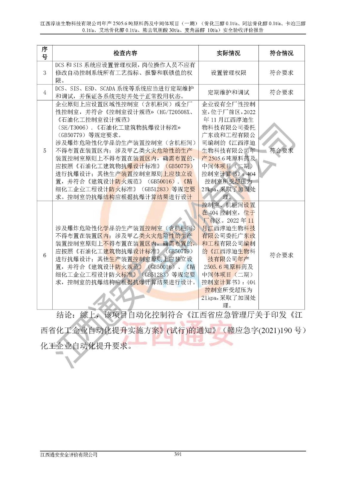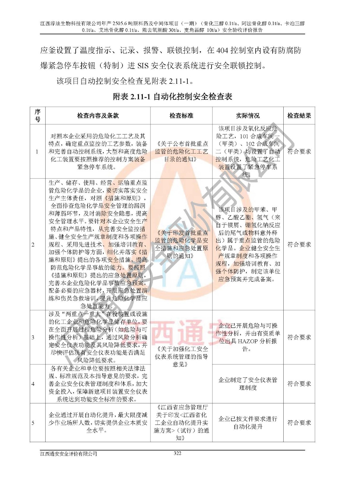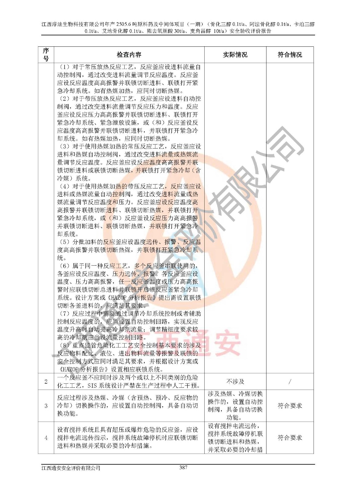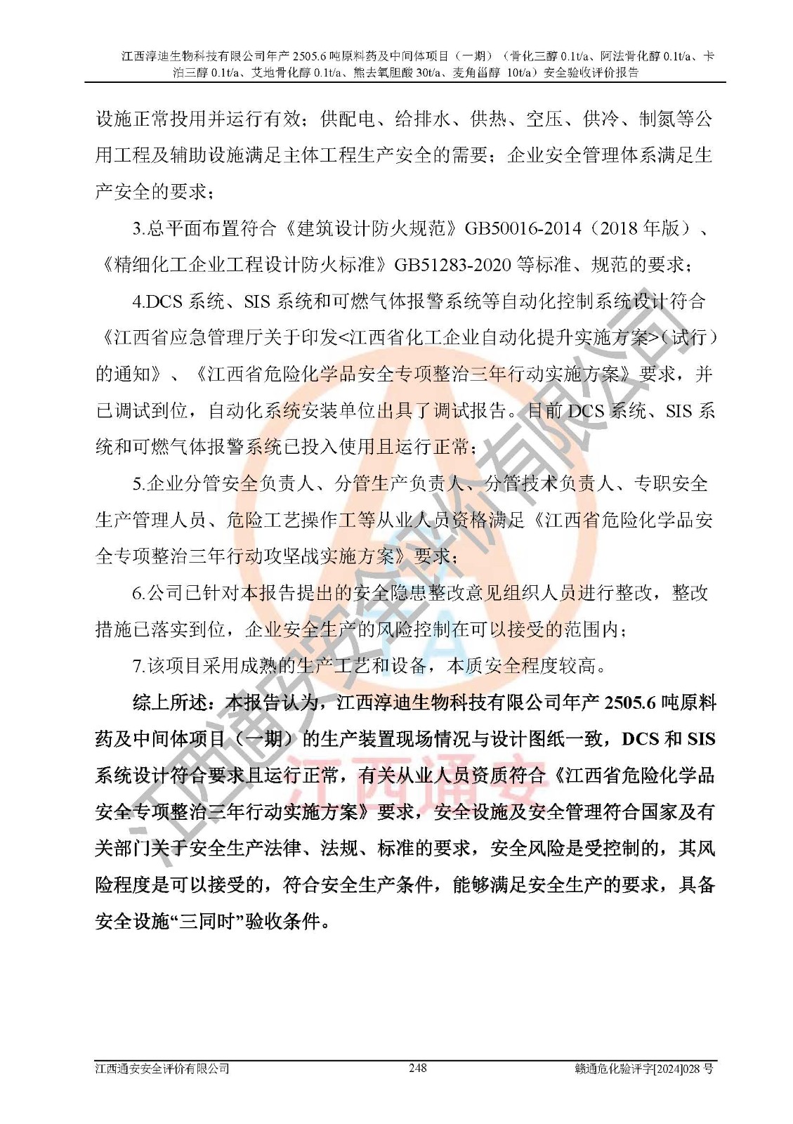 評價結論 | 評價結論:本報告認為,江西淳迪生物科技有限公司年產2505.6噸原料藥及中間體項目(一期)的生產裝置現(xiàn)場情況與設計圖紙一致,DCS和SIS系統(tǒng)設計符合要求且運行正常,有關從業(yè)人員資質符合《江西省危險化學品安全專項整治三年行動實施方案》要求,安全設施及安全管理符合**及有關部門關于安全生產法律、法規(guī)、標準的要求,安全風險是受控制的,其風險程度是可以接受的,符合安全生產條件,能夠滿足安全生產的要求,具備安全設施“三同時”驗收條件。 | |||
