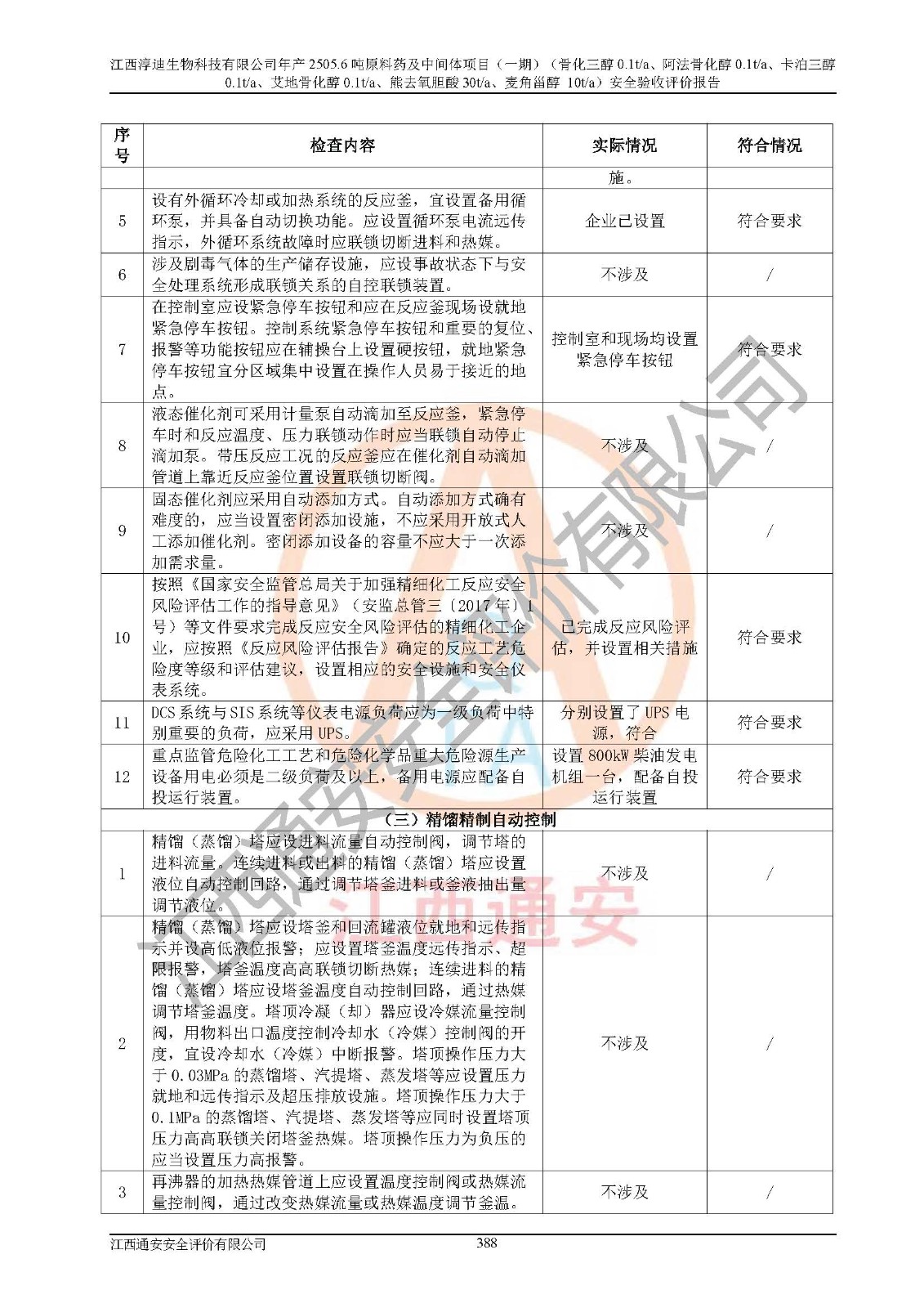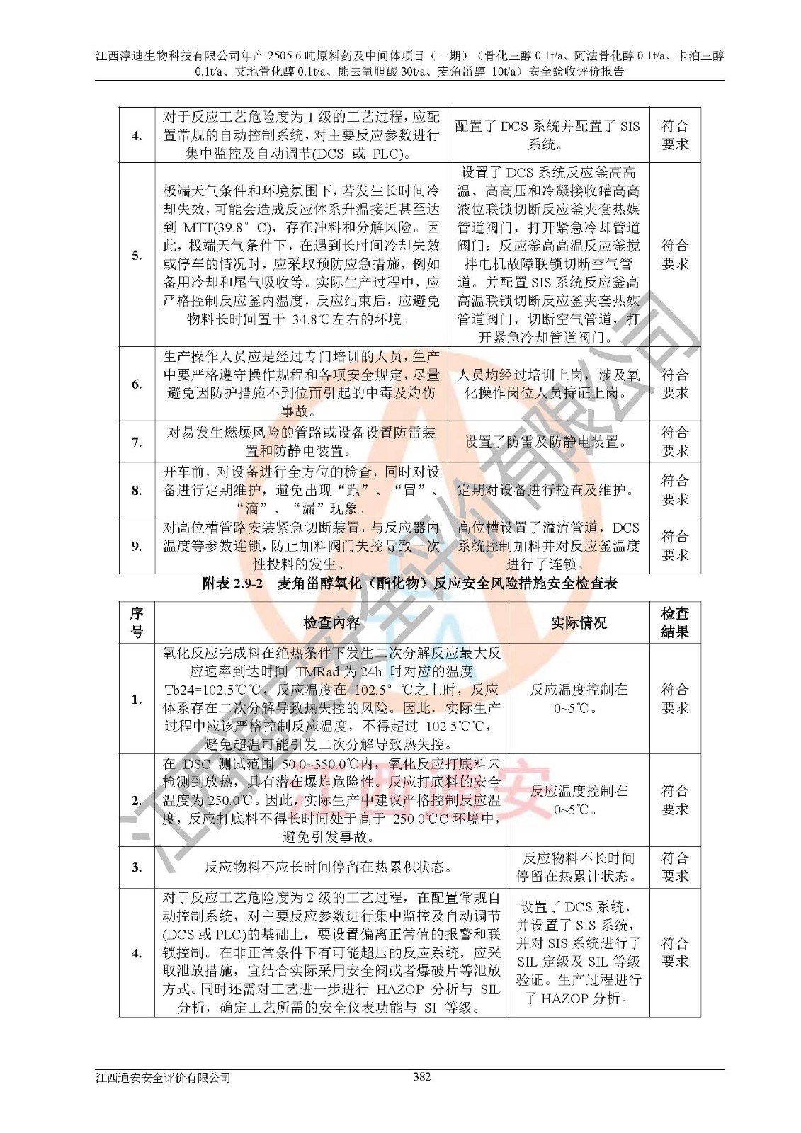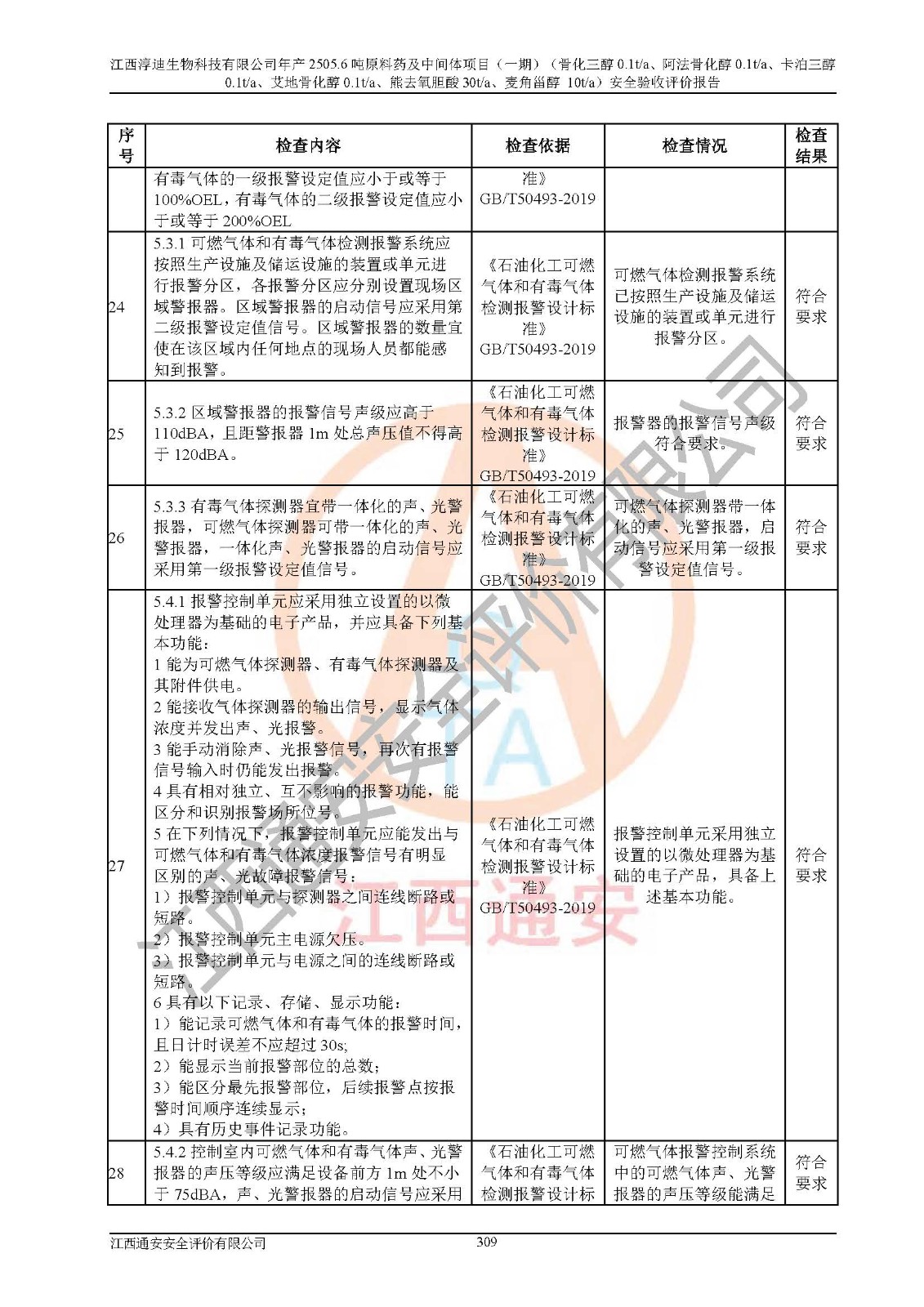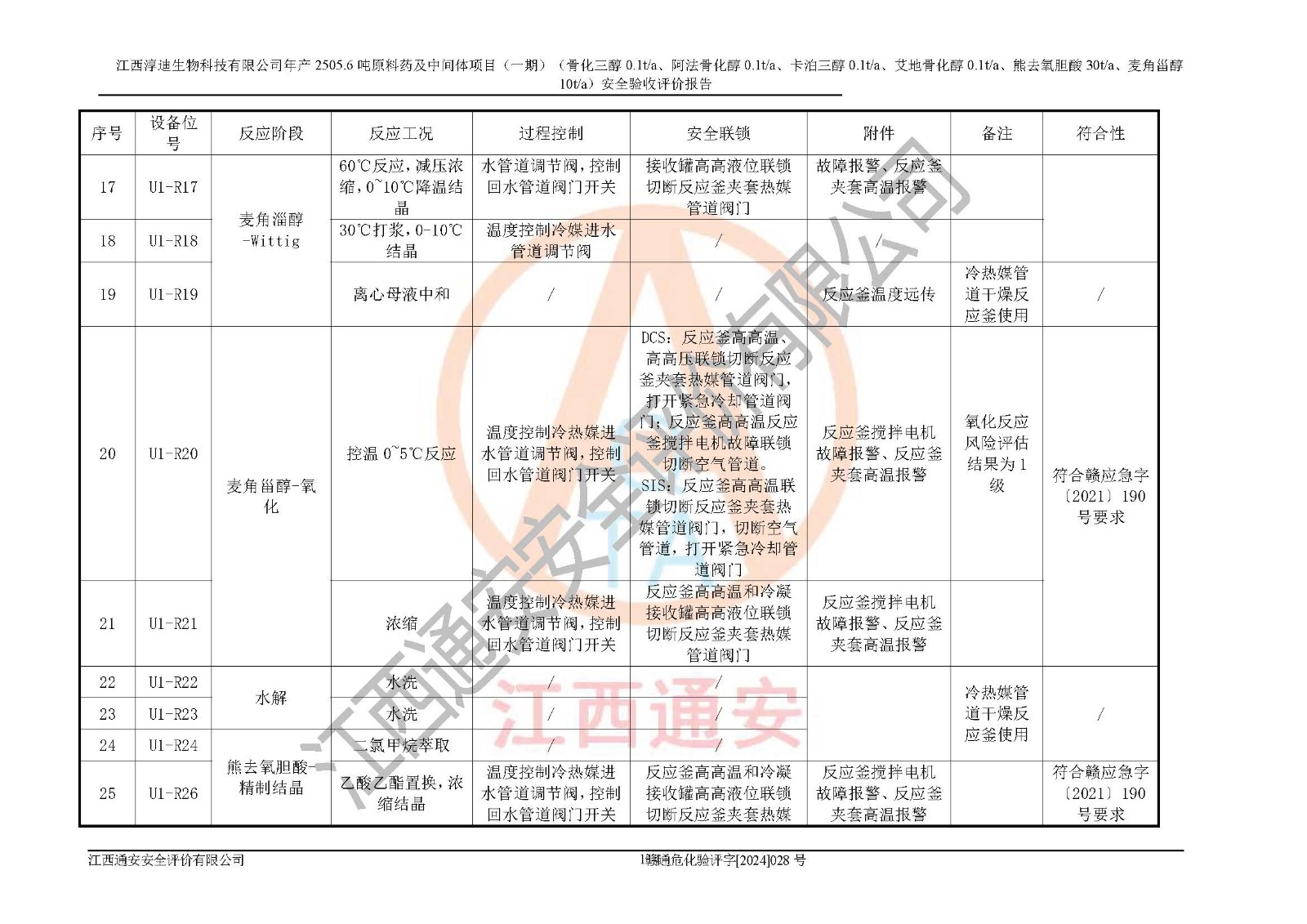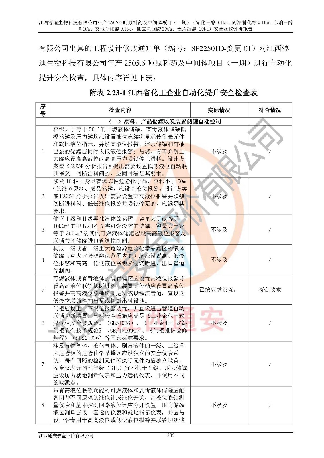 評價結論 | 評價結論:本報告認為,江西淳迪生物科技有限公司年產2505.6噸原料藥及中間體項目(一期)的生產裝置現(xiàn)場情況與設計圖紙一致,DCS和SIS系統(tǒng)設計符合要求且運行正常,有關從業(yè)人員資質符合《江西省危險化學品安全專項整治三年行動實施方案》要求,安全設施及安全管理符合**及有關部門關于安全生產法律、法規(guī)、標準的要求,安全風險是受控制的,其風險程度是可以接受的,符合安全生產條件,能夠滿足安全生產的要求,具備安全設施“三同時”驗收條件。 | |||