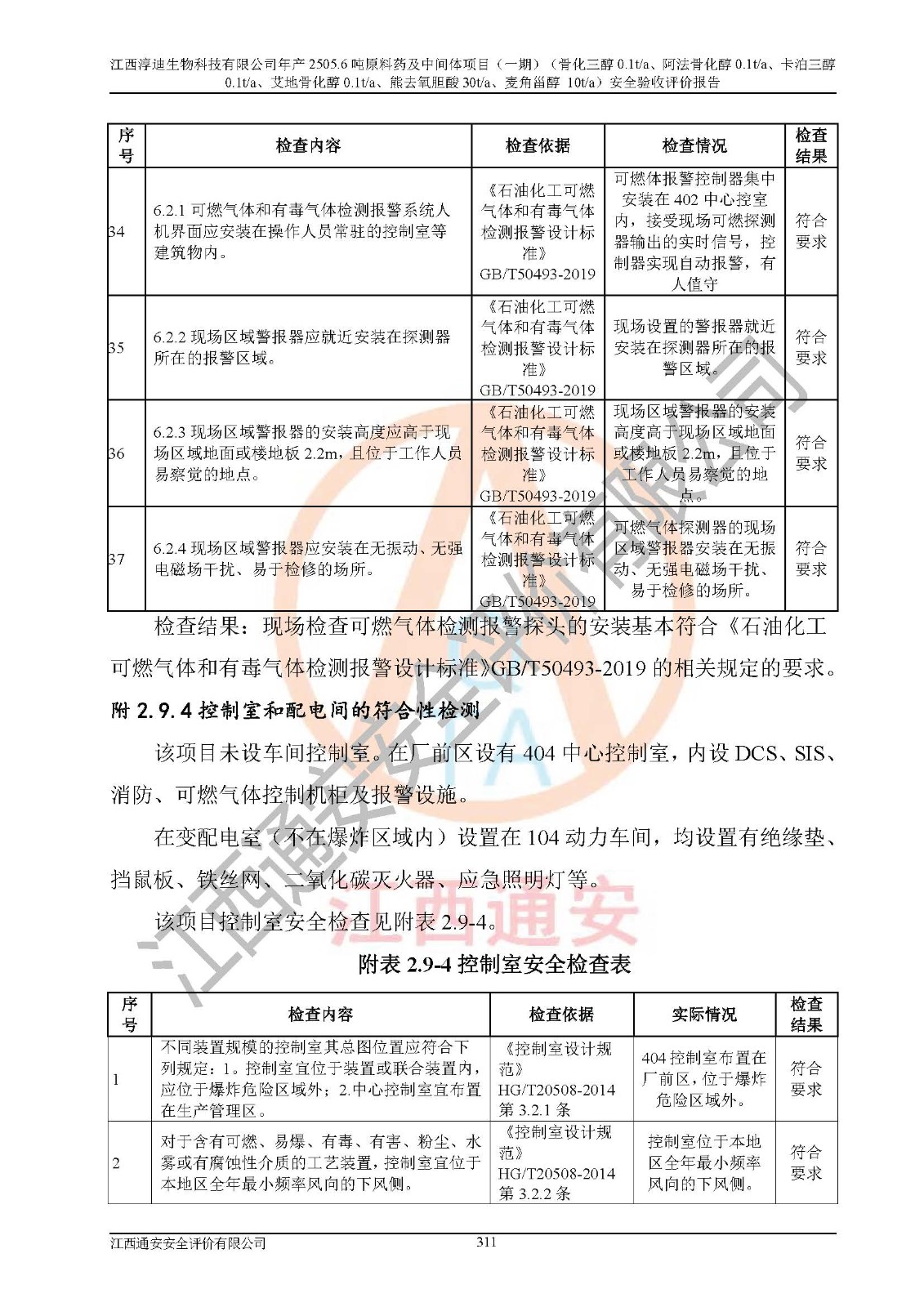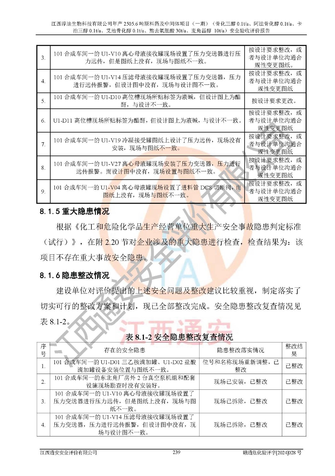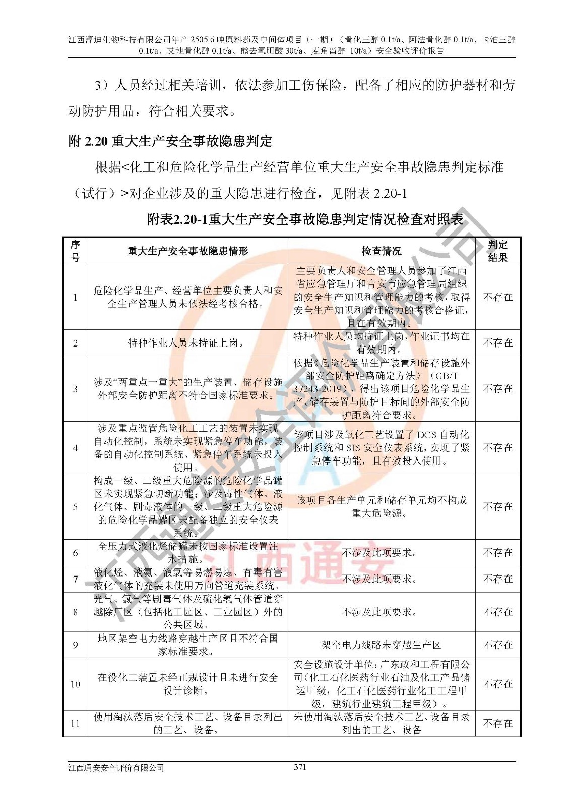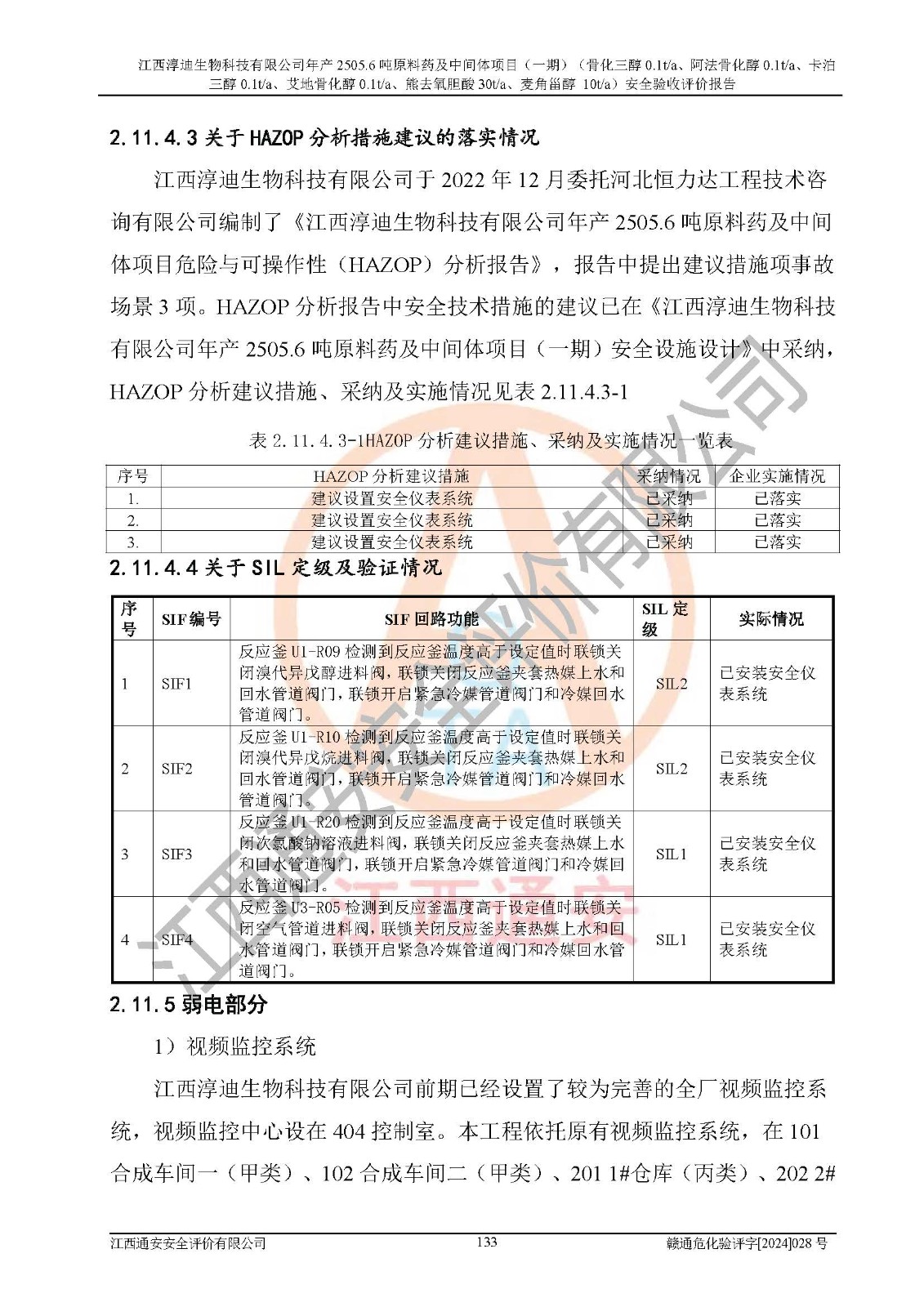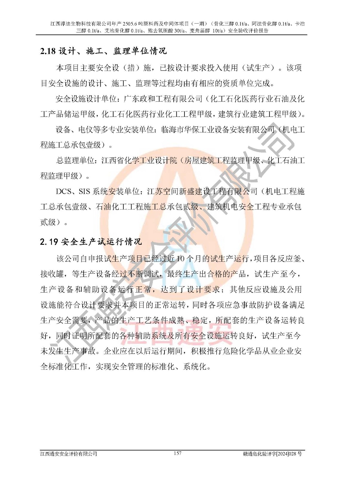 評價結論 | 評價結論:本報告認為,江西淳迪生物科技有限公司年產2505.6噸原料藥及中間體項目(一期)的生產裝置現(xiàn)場情況與設計圖紙一致,DCS和SIS系統(tǒng)設計符合要求且運行正常,有關從業(yè)人員資質符合《江西省危險化學品安全專項整治三年行動實施方案》要求,安全設施及安全管理符合**及有關部門關于安全生產法律、法規(guī)、標準的要求,安全風險是受控制的,其風險程度是可以接受的,符合安全生產條件,能夠滿足安全生產的要求,具備安全設施“三同時”驗收條件。 | |||