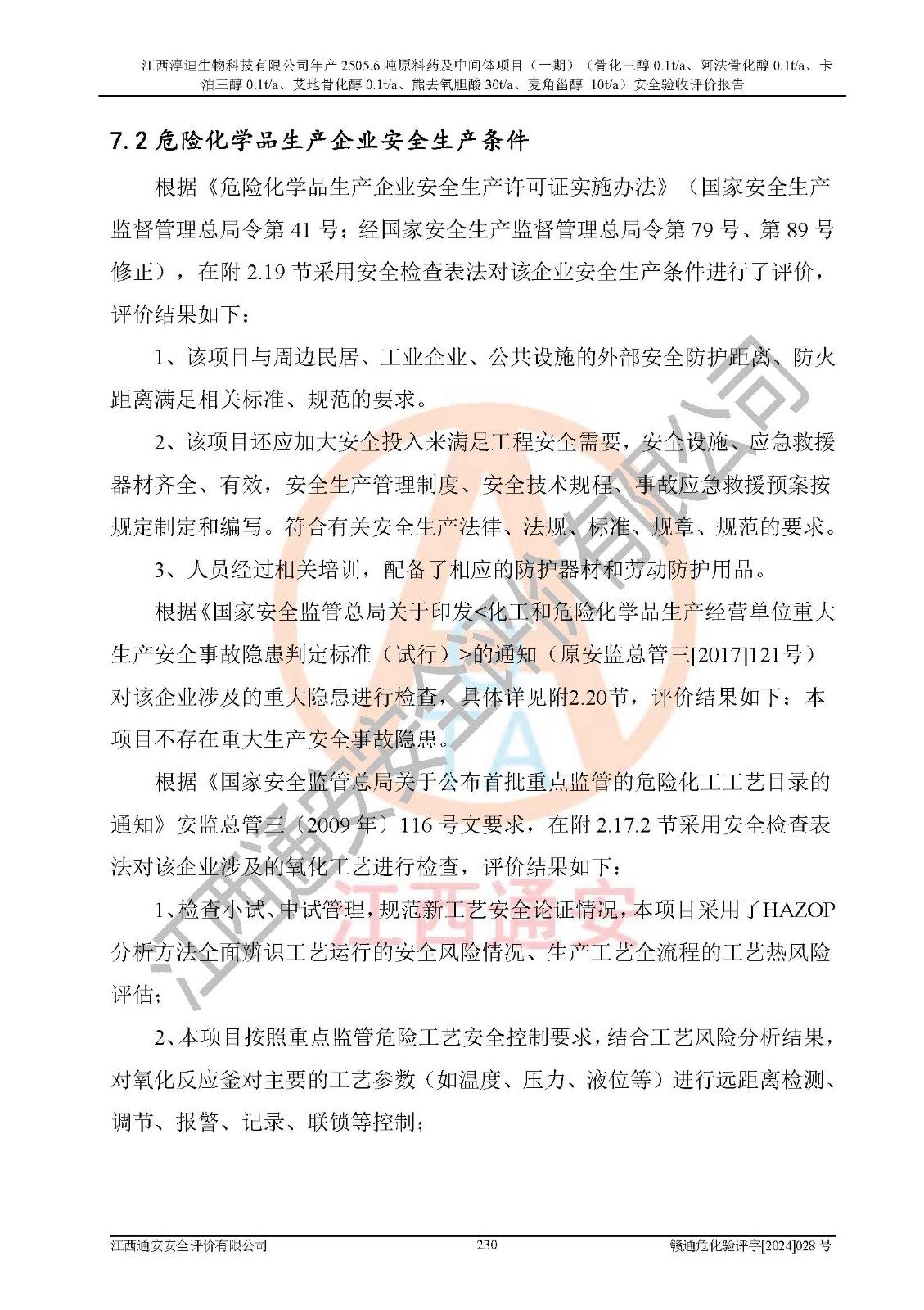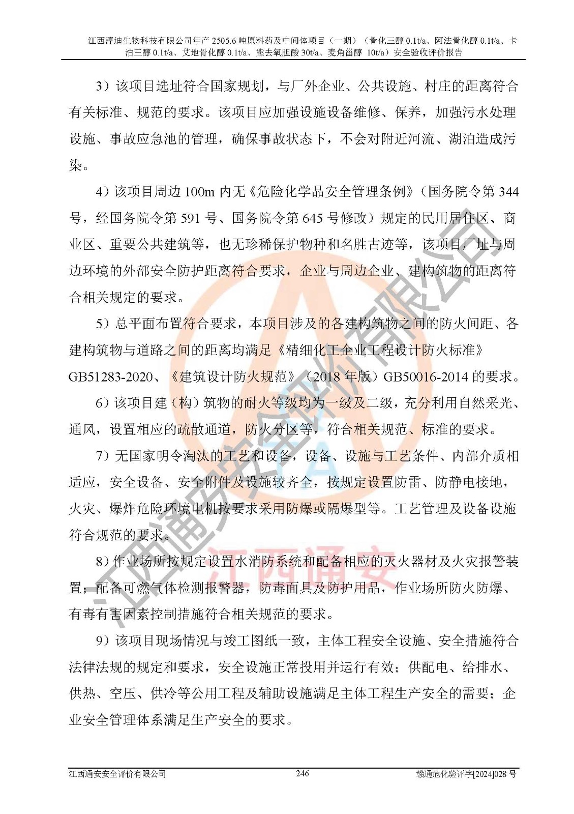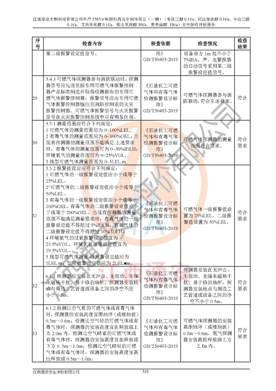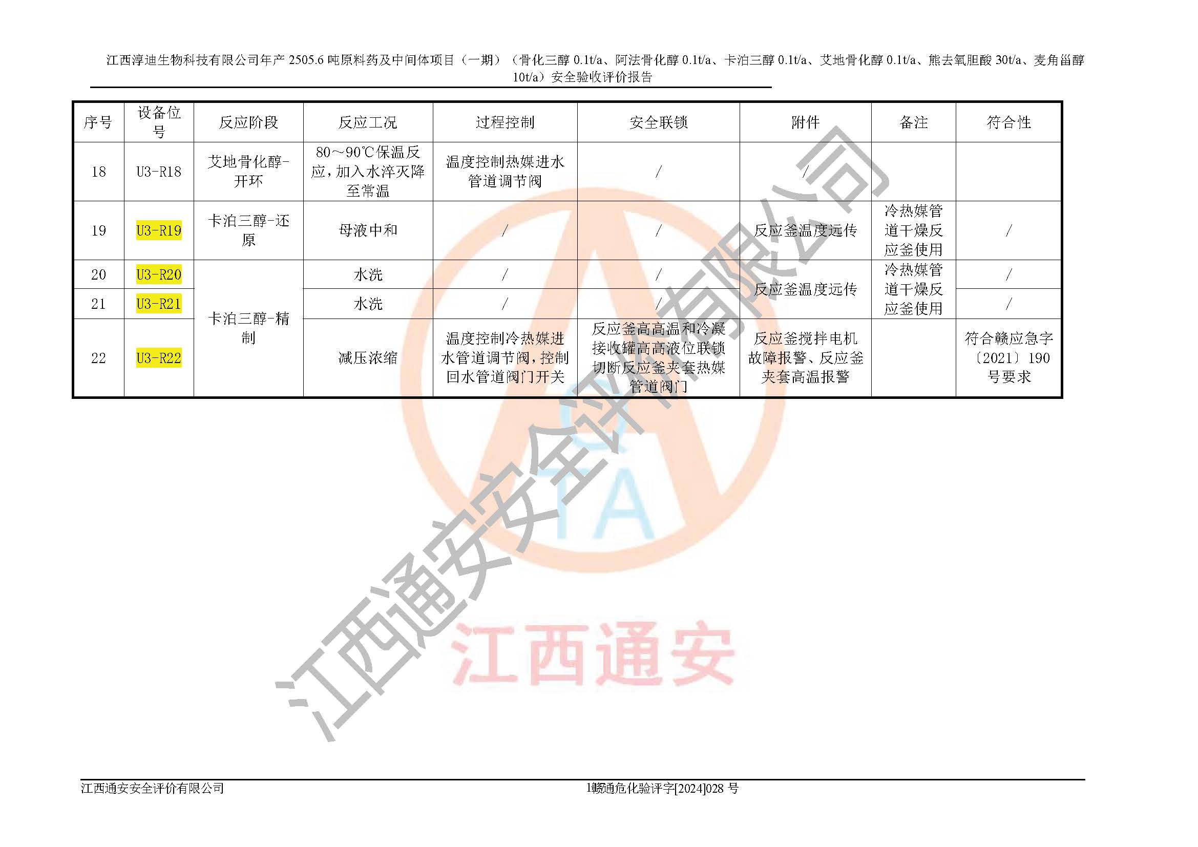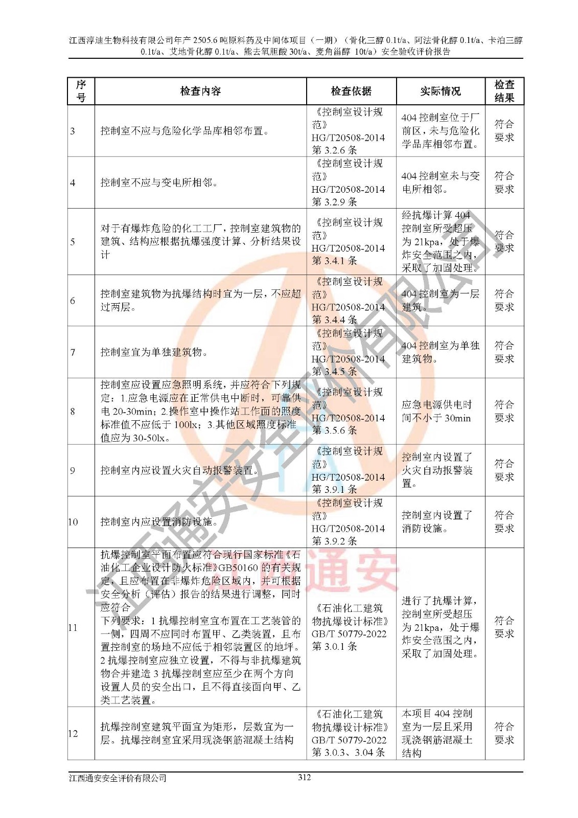 評價結論 | 評價結論:本報告認為,江西淳迪生物科技有限公司年產2505.6噸原料藥及中間體項目(一期)的生產裝置現(xiàn)場情況與設計圖紙一致,DCS和SIS系統(tǒng)設計符合要求且運行正常,有關從業(yè)人員資質符合《江西省危險化學品安全專項整治三年行動實施方案》要求,安全設施及安全管理符合**及有關部門關于安全生產法律、法規(guī)、標準的要求,安全風險是受控制的,其風險程度是可以接受的,符合安全生產條件,能夠滿足安全生產的要求,具備安全設施“三同時”驗收條件。 | |||