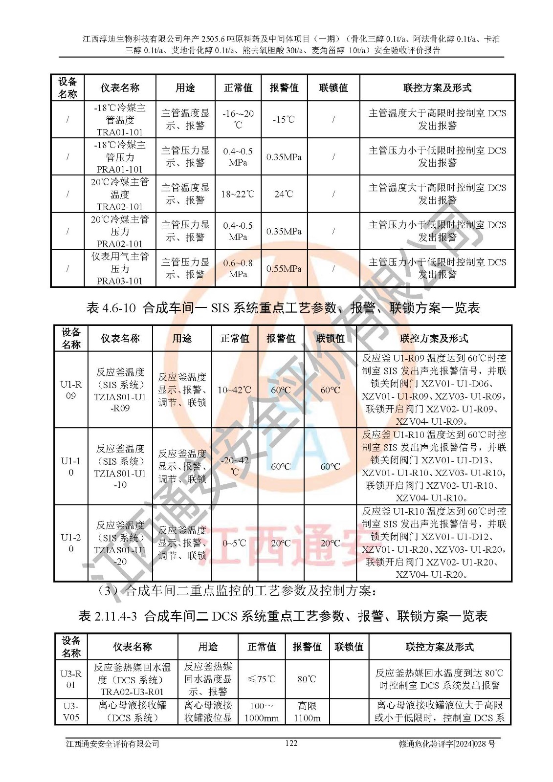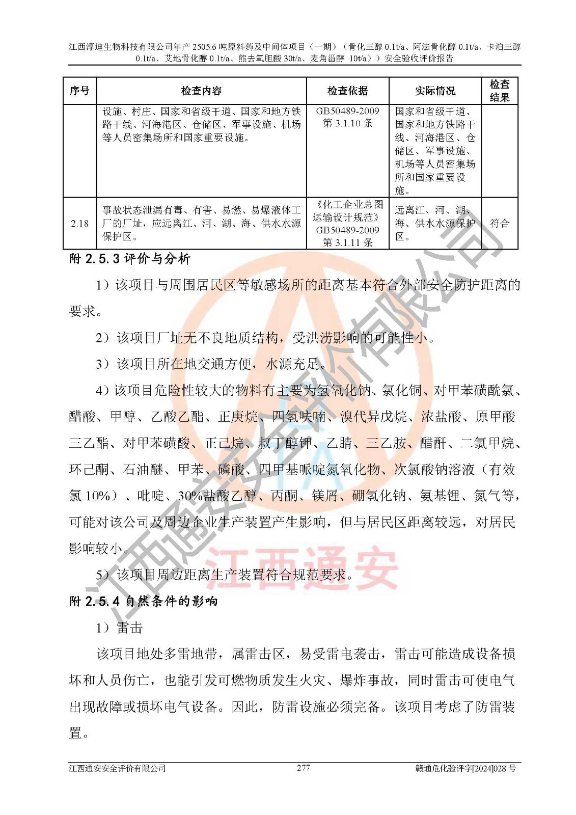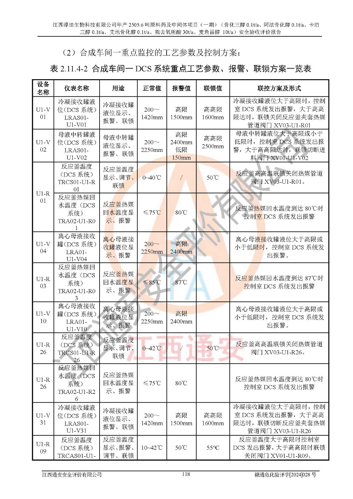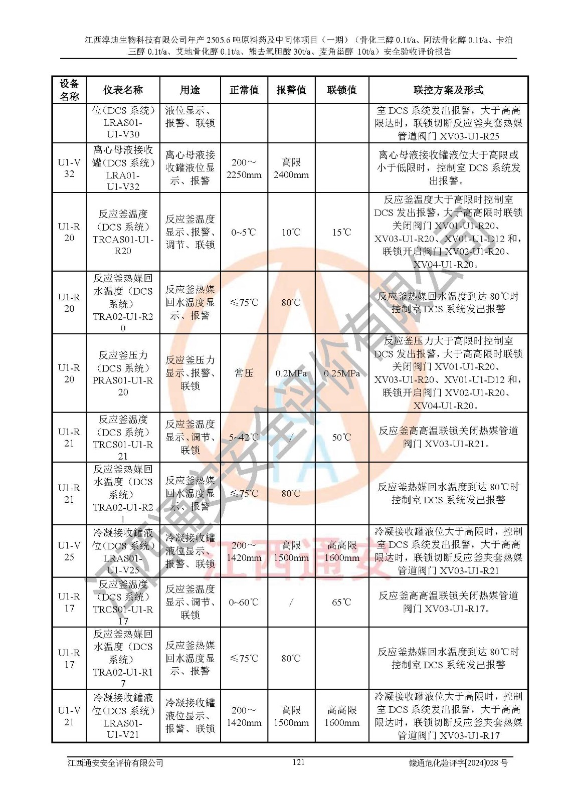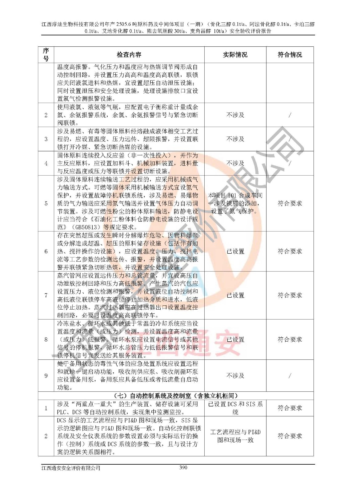 評價結論 | 評價結論:本報告認為,江西淳迪生物科技有限公司年產2505.6噸原料藥及中間體項目(一期)的生產裝置現(xiàn)場情況與設計圖紙一致,DCS和SIS系統(tǒng)設計符合要求且運行正常,有關從業(yè)人員資質符合《江西省危險化學品安全專項整治三年行動實施方案》要求,安全設施及安全管理符合**及有關部門關于安全生產法律、法規(guī)、標準的要求,安全風險是受控制的,其風險程度是可以接受的,符合安全生產條件,能夠滿足安全生產的要求,具備安全設施“三同時”驗收條件。 | |||