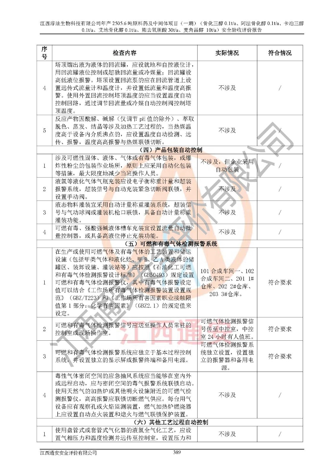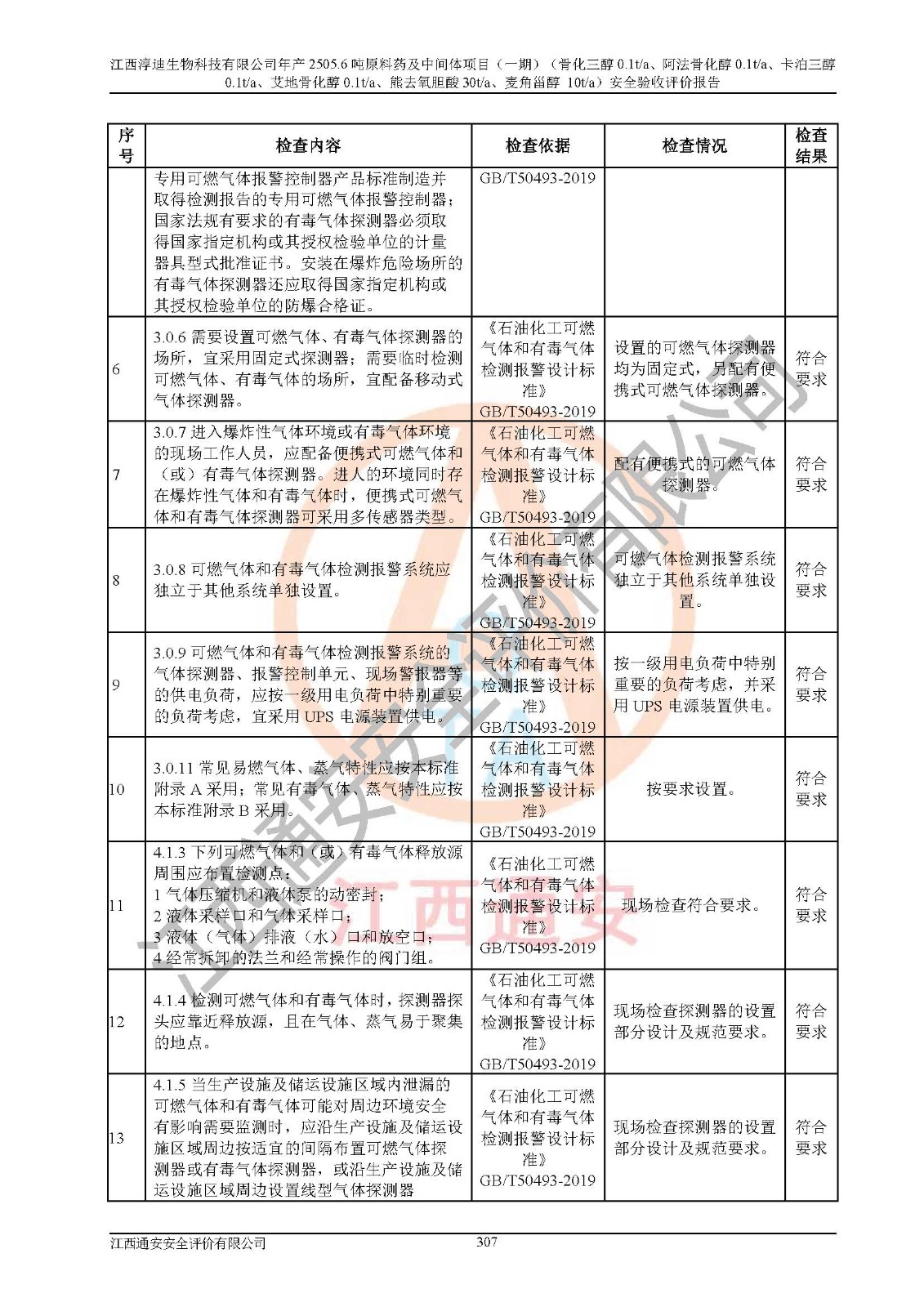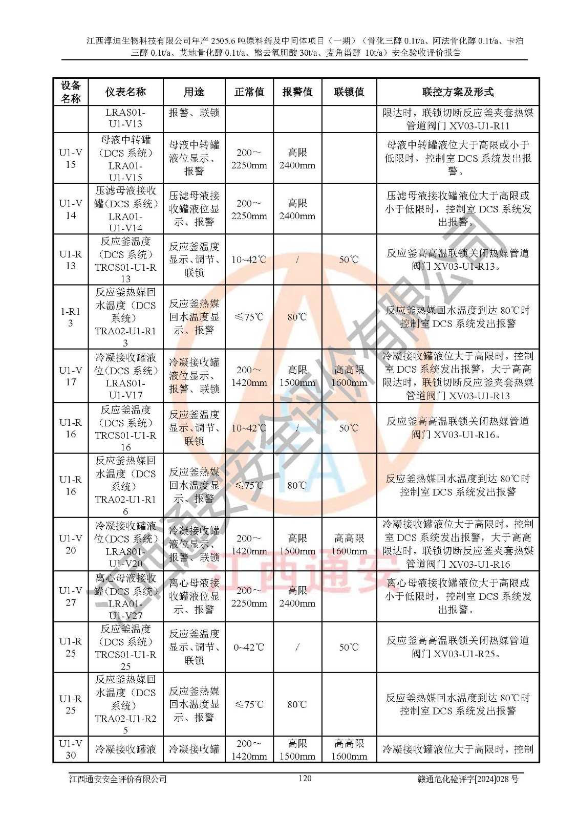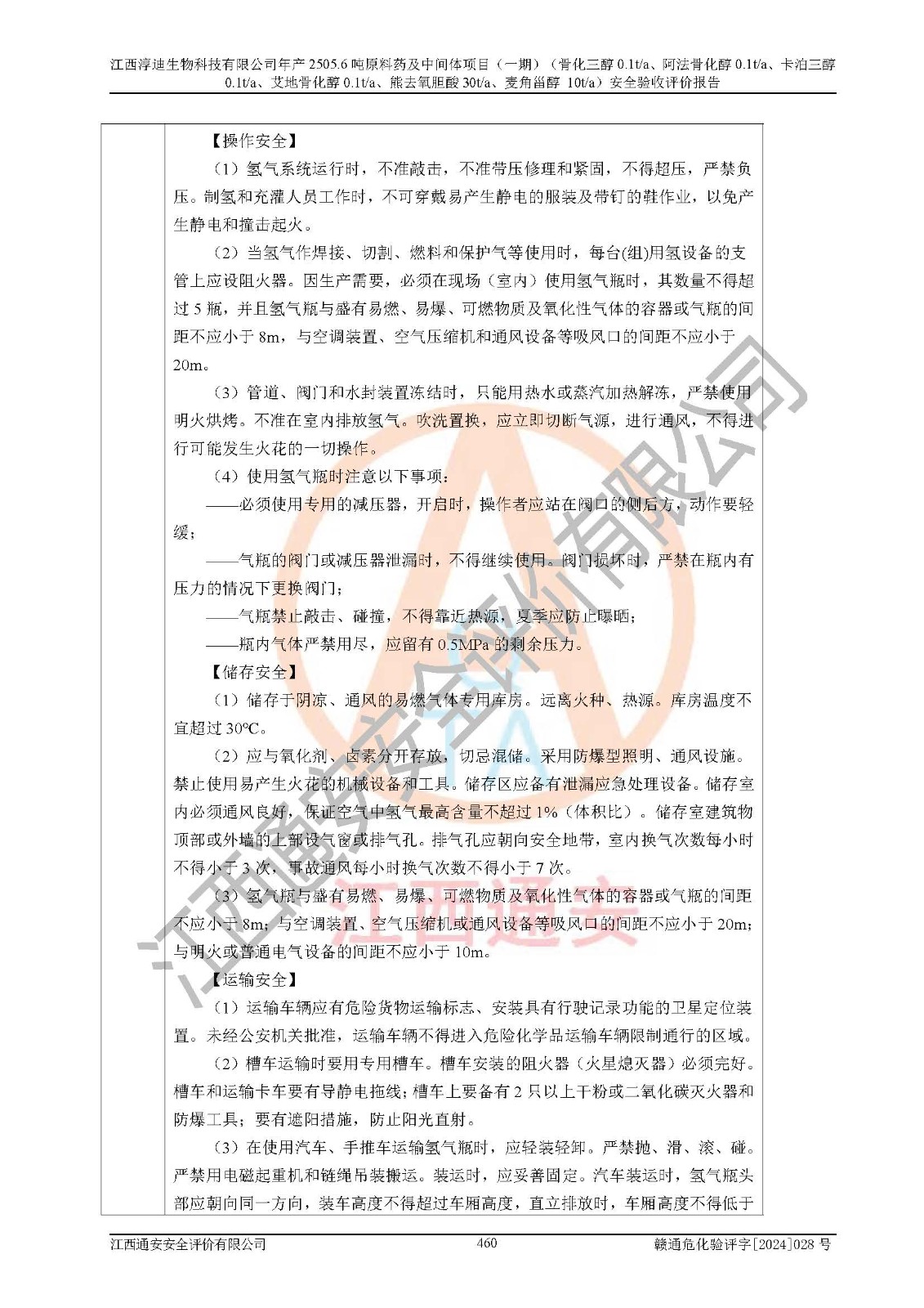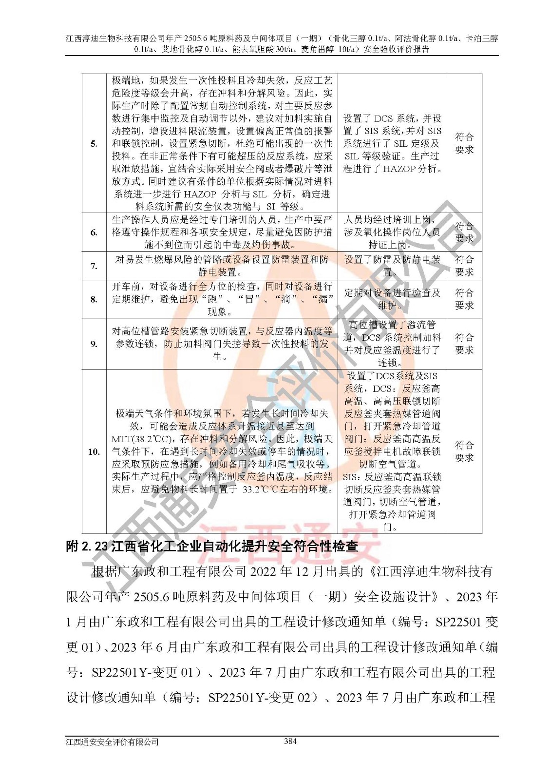 評價結論 | 評價結論:本報告認為,江西淳迪生物科技有限公司年產2505.6噸原料藥及中間體項目(一期)的生產裝置現(xiàn)場情況與設計圖紙一致,DCS和SIS系統(tǒng)設計符合要求且運行正常,有關從業(yè)人員資質符合《江西省危險化學品安全專項整治三年行動實施方案》要求,安全設施及安全管理符合**及有關部門關于安全生產法律、法規(guī)、標準的要求,安全風險是受控制的,其風險程度是可以接受的,符合安全生產條件,能夠滿足安全生產的要求,具備安全設施“三同時”驗收條件。 | |||