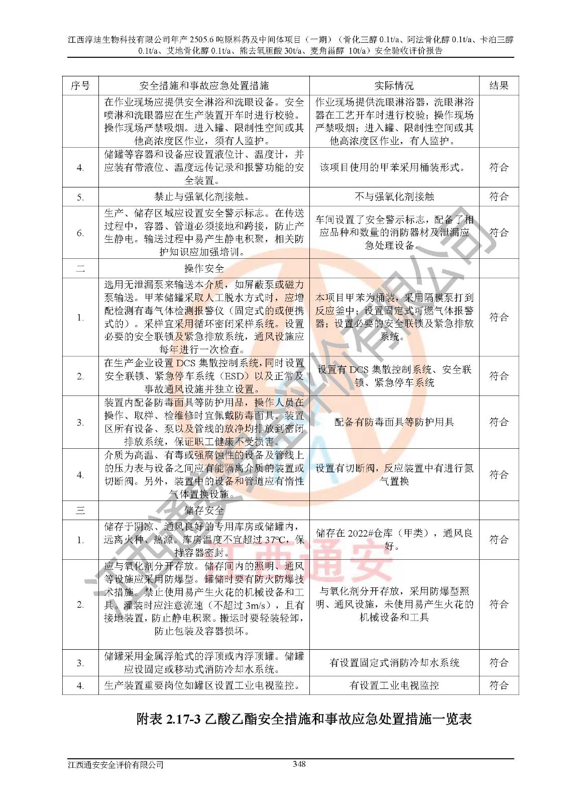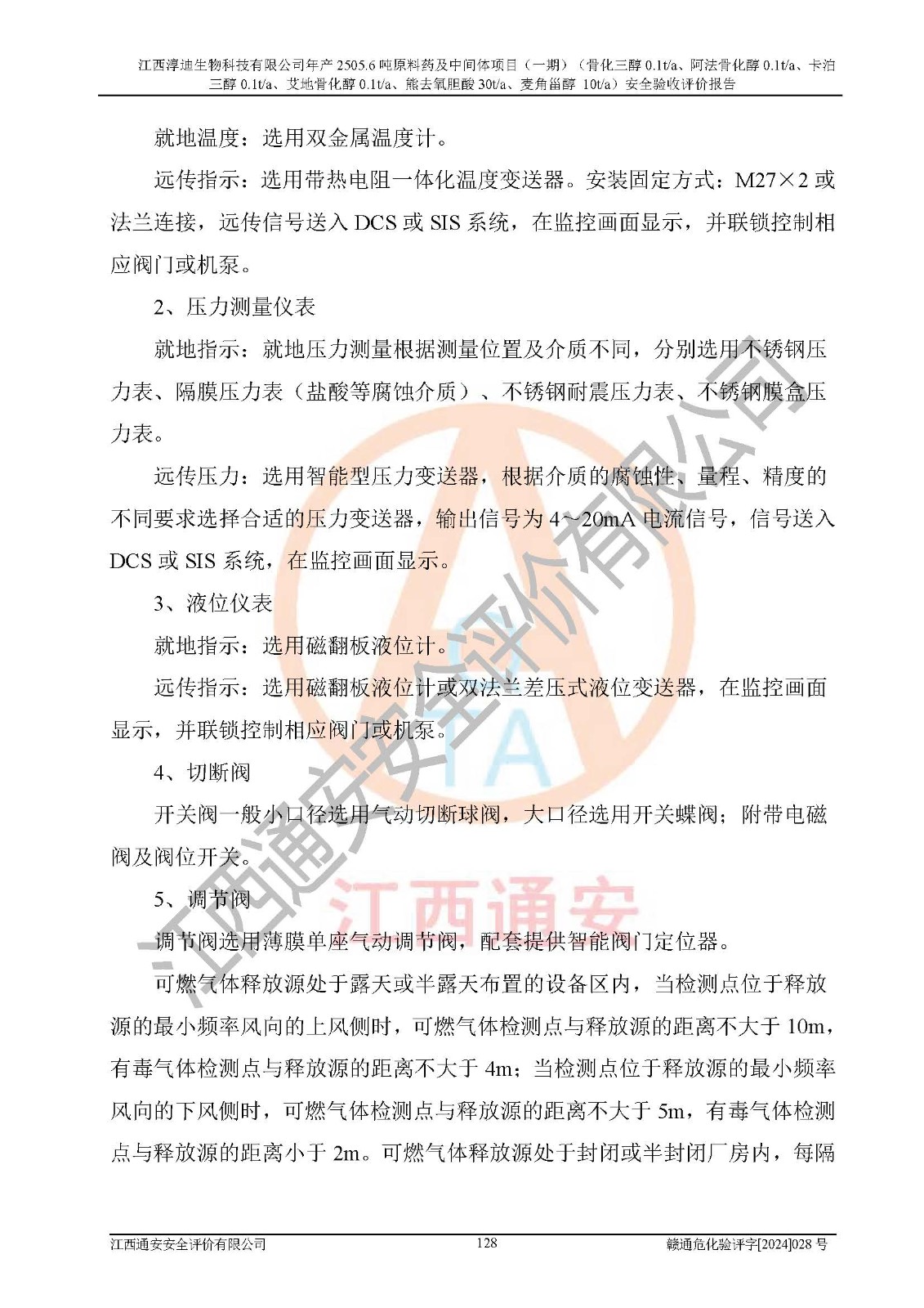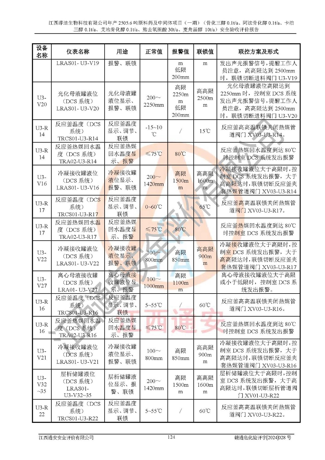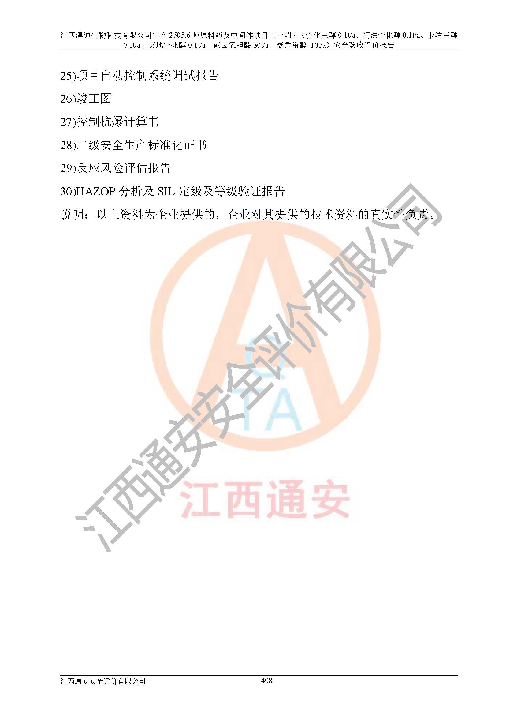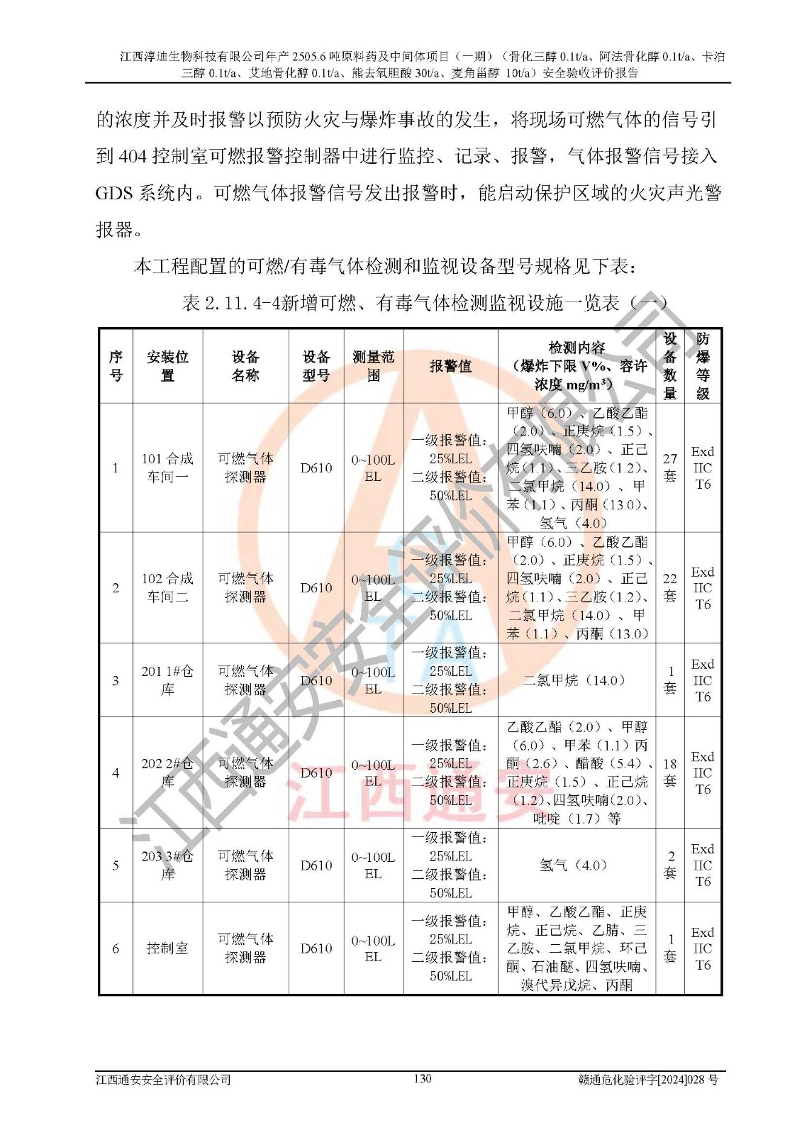 評價結論 | 評價結論:本報告認為,江西淳迪生物科技有限公司年產2505.6噸原料藥及中間體項目(一期)的生產裝置現(xiàn)場情況與設計圖紙一致,DCS和SIS系統(tǒng)設計符合要求且運行正常,有關從業(yè)人員資質符合《江西省危險化學品安全專項整治三年行動實施方案》要求,安全設施及安全管理符合**及有關部門關于安全生產法律、法規(guī)、標準的要求,安全風險是受控制的,其風險程度是可以接受的,符合安全生產條件,能夠滿足安全生產的要求,具備安全設施“三同時”驗收條件。 | |||