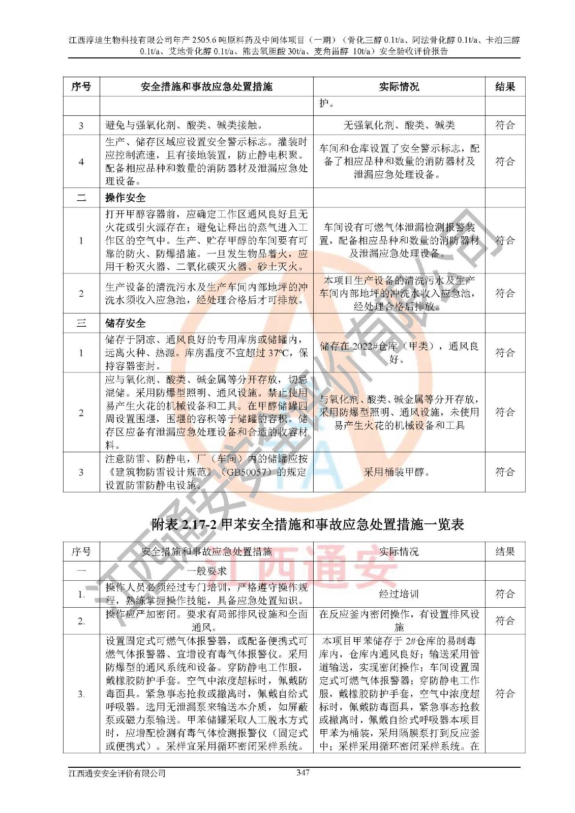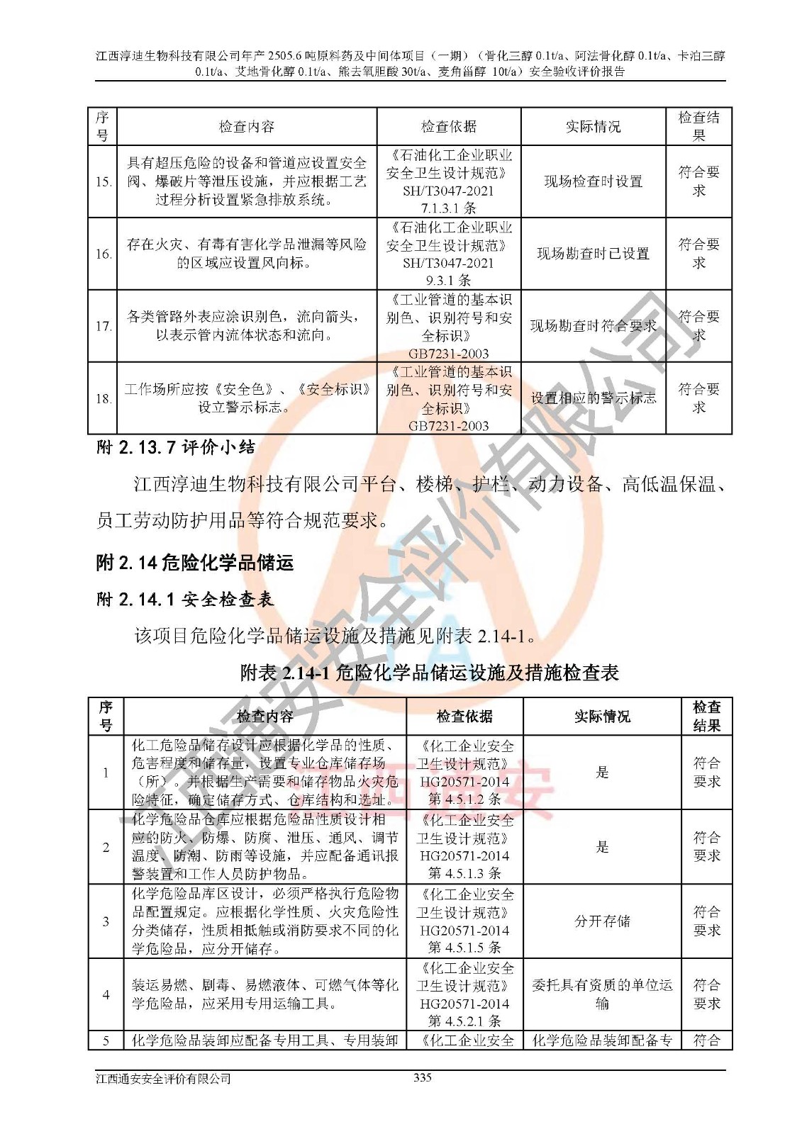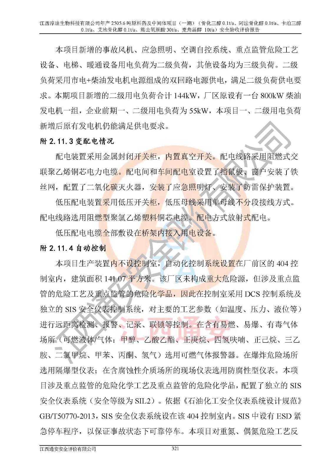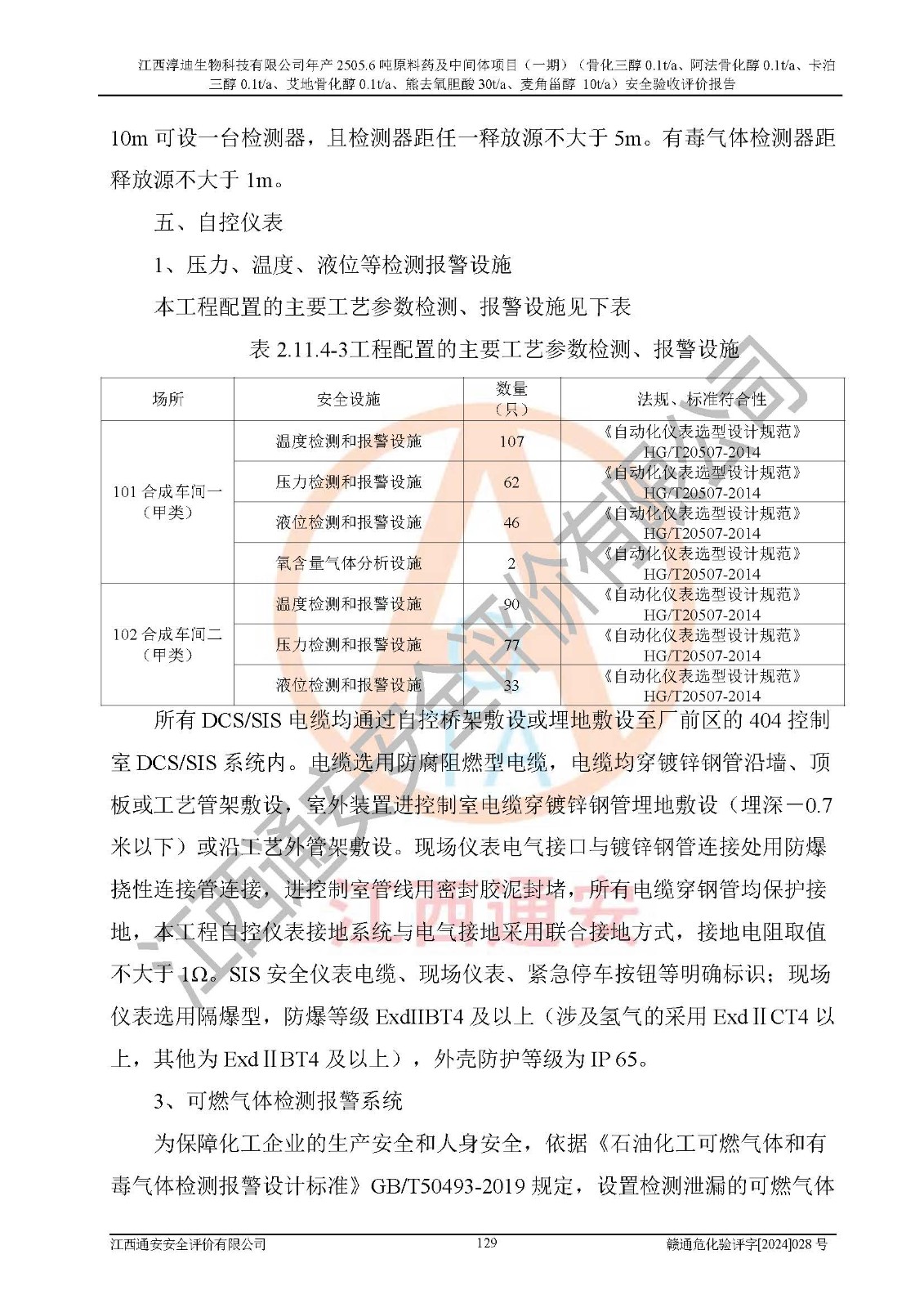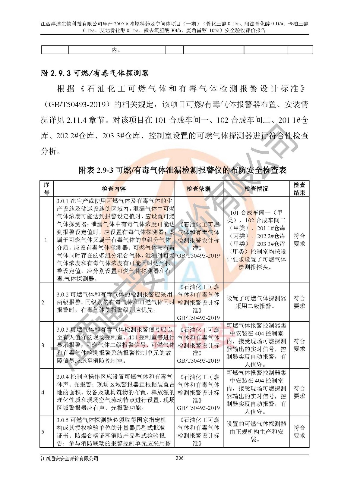 評價結論 | 評價結論:本報告認為,江西淳迪生物科技有限公司年產2505.6噸原料藥及中間體項目(一期)的生產裝置現(xiàn)場情況與設計圖紙一致,DCS和SIS系統(tǒng)設計符合要求且運行正常,有關從業(yè)人員資質符合《江西省危險化學品安全專項整治三年行動實施方案》要求,安全設施及安全管理符合**及有關部門關于安全生產法律、法規(guī)、標準的要求,安全風險是受控制的,其風險程度是可以接受的,符合安全生產條件,能夠滿足安全生產的要求,具備安全設施“三同時”驗收條件。 | |||