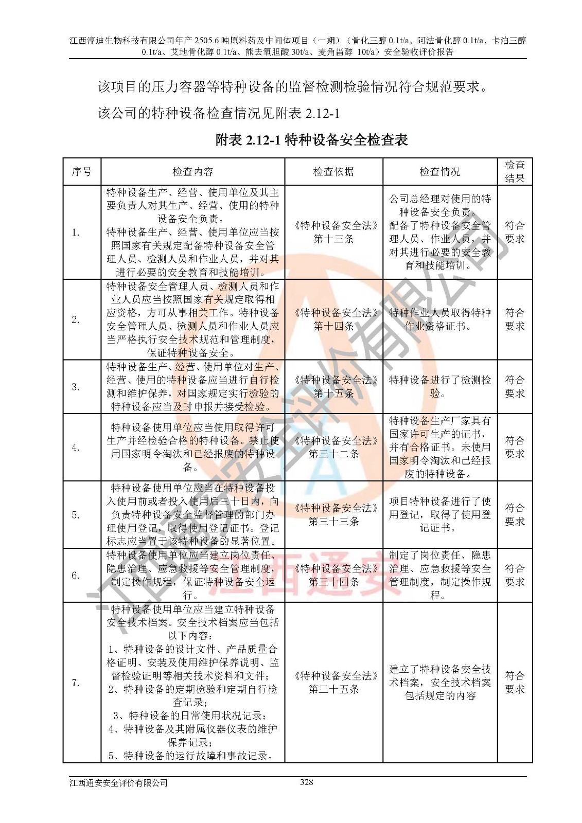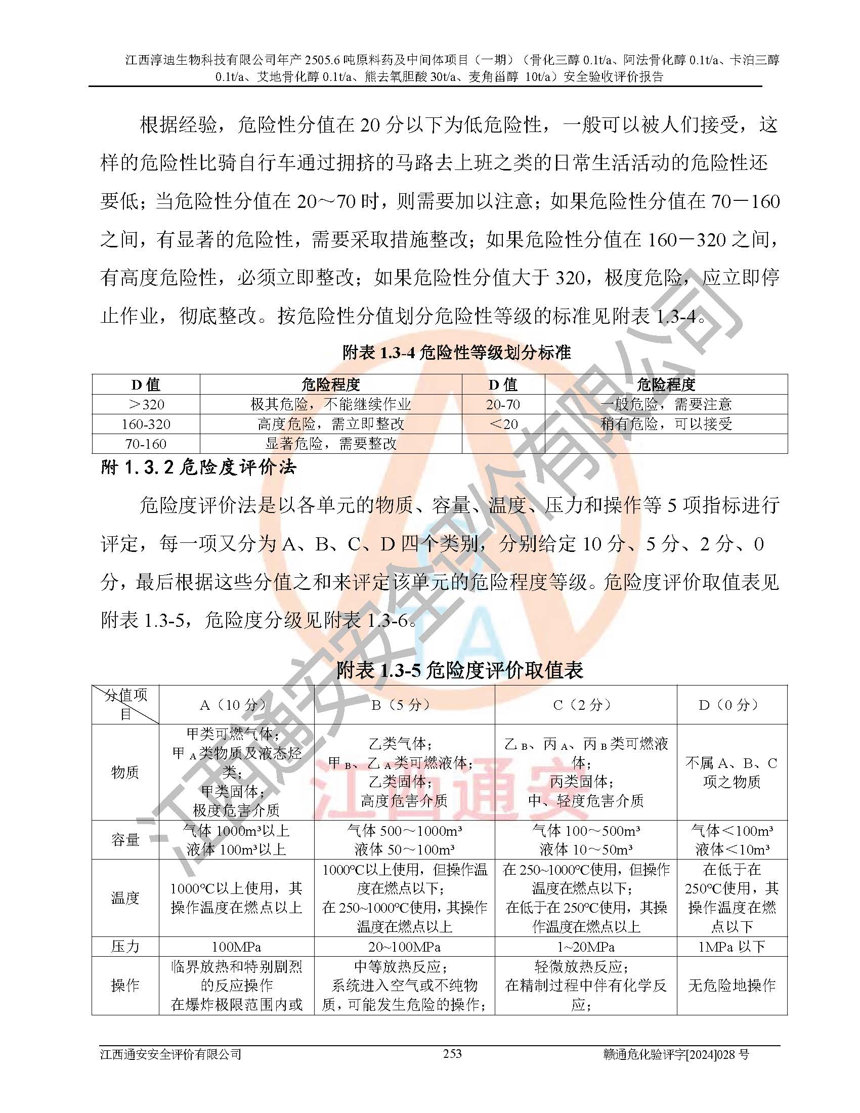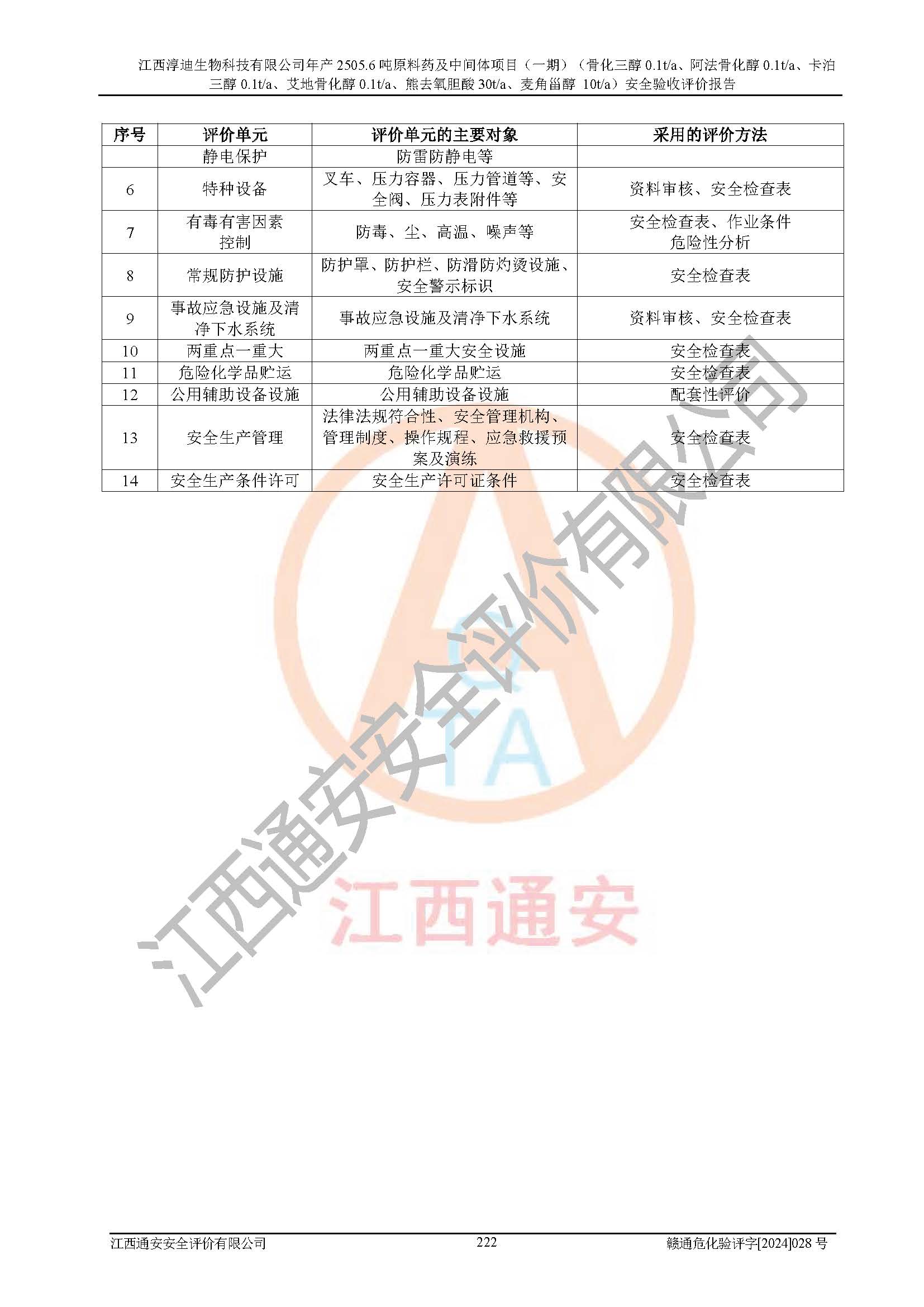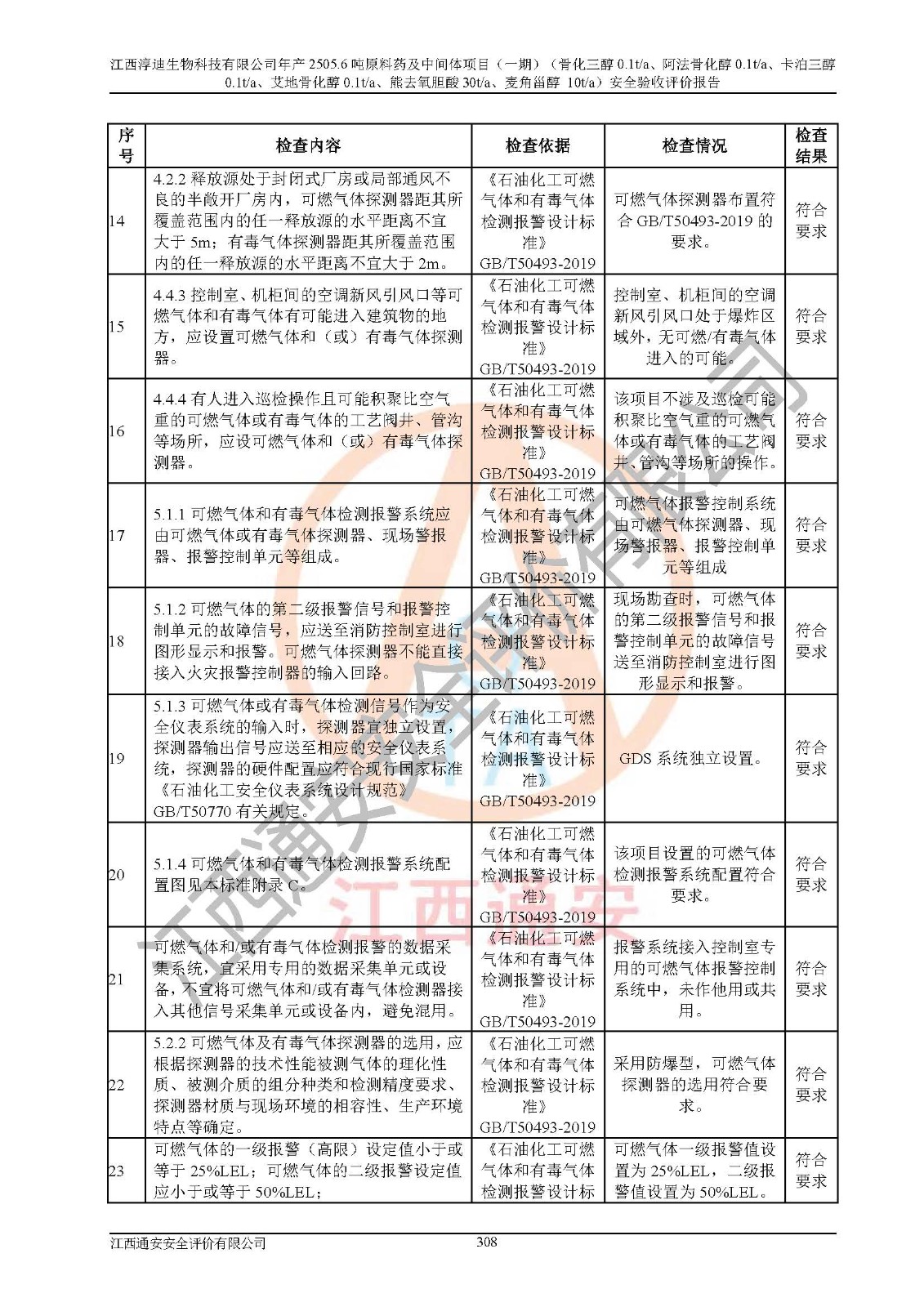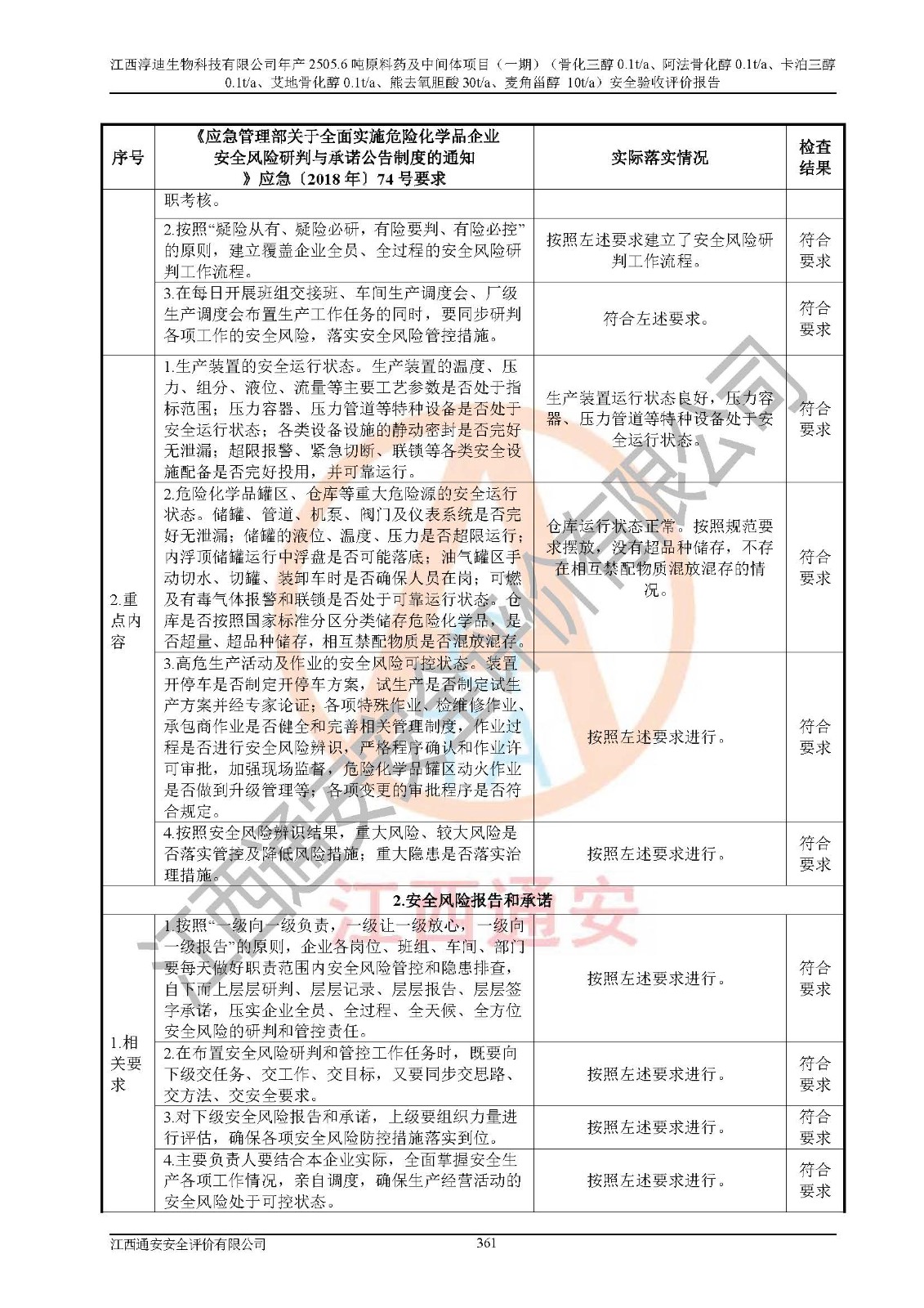 評價結論 | 評價結論:本報告認為,江西淳迪生物科技有限公司年產2505.6噸原料藥及中間體項目(一期)的生產裝置現(xiàn)場情況與設計圖紙一致,DCS和SIS系統(tǒng)設計符合要求且運行正常,有關從業(yè)人員資質符合《江西省危險化學品安全專項整治三年行動實施方案》要求,安全設施及安全管理符合**及有關部門關于安全生產法律、法規(guī)、標準的要求,安全風險是受控制的,其風險程度是可以接受的,符合安全生產條件,能夠滿足安全生產的要求,具備安全設施“三同時”驗收條件。 | |||