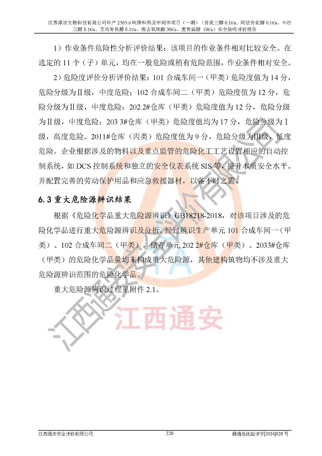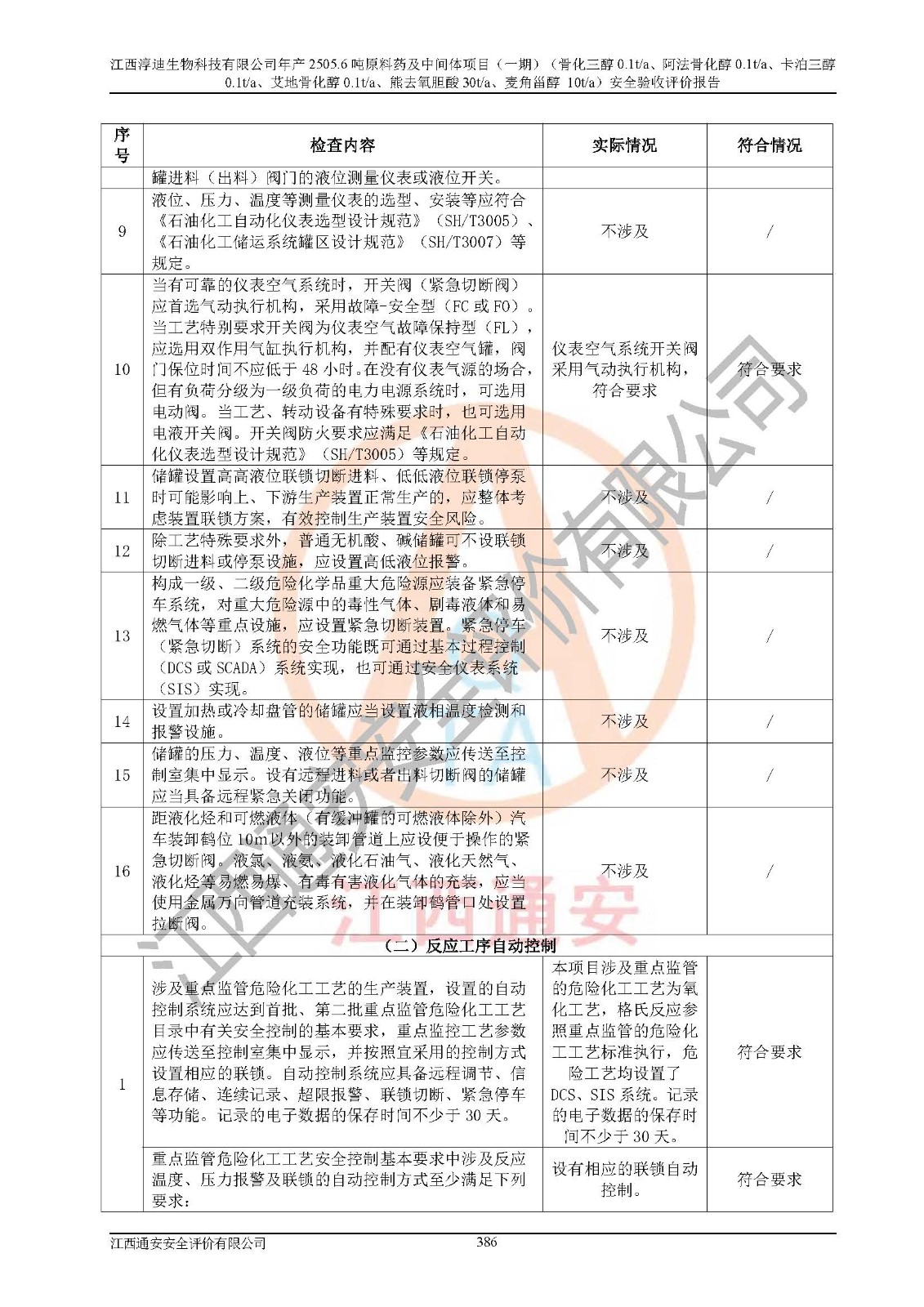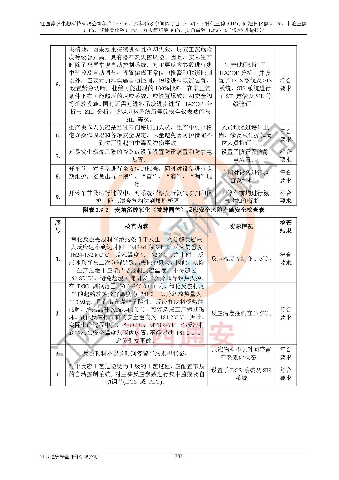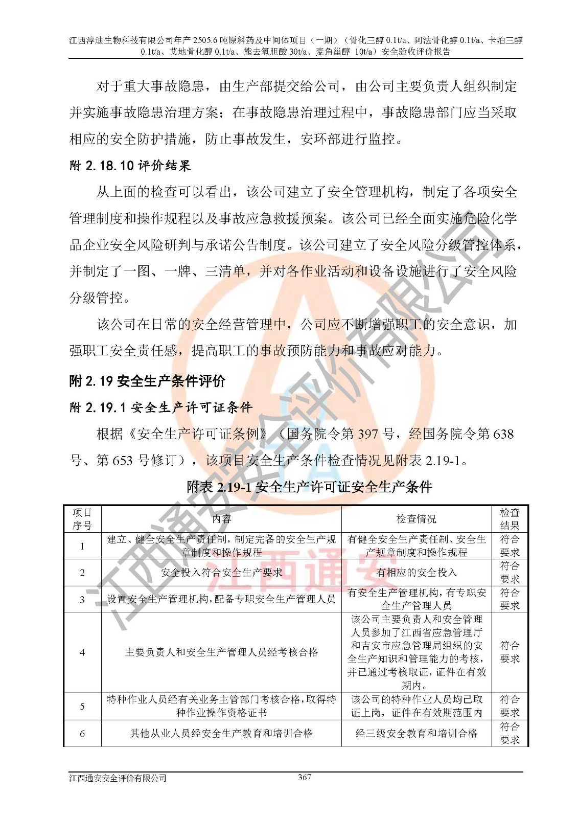評價結論 | 評價結論:本報告認為,江西淳迪生物科技有限公司年產2505.6噸原料藥及中間體項目(一期)的生產裝置現(xiàn)場情況與設計圖紙一致,DCS和SIS系統(tǒng)設計符合要求且運行正常,有關從業(yè)人員資質符合《江西省危險化學品安全專項整治三年行動實施方案》要求,安全設施及安全管理符合**及有關部門關于安全生產法律、法規(guī)、標準的要求,安全風險是受控制的,其風險程度是可以接受的,符合安全生產條件,能夠滿足安全生產的要求,具備安全設施“三同時”驗收條件。 | |||