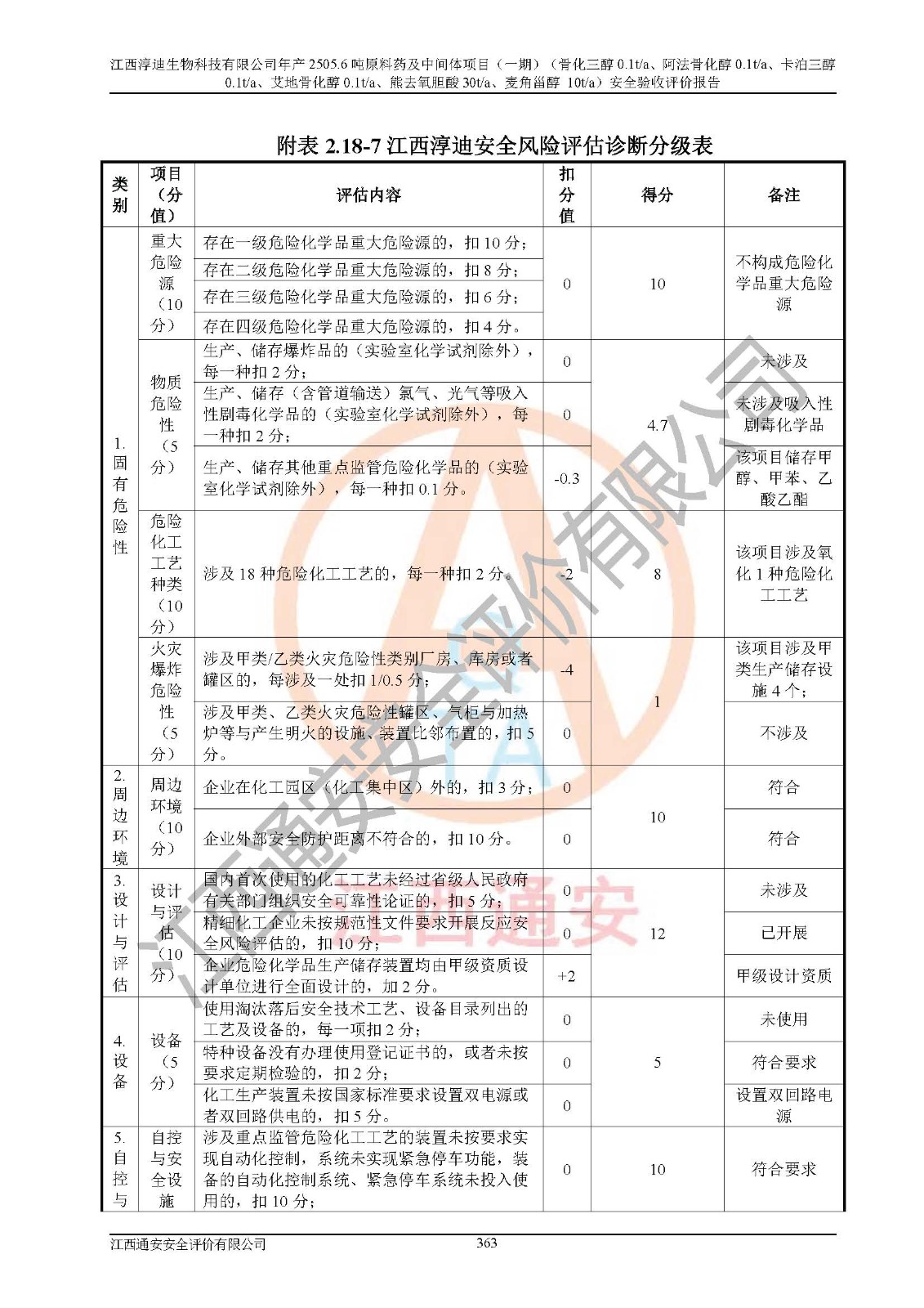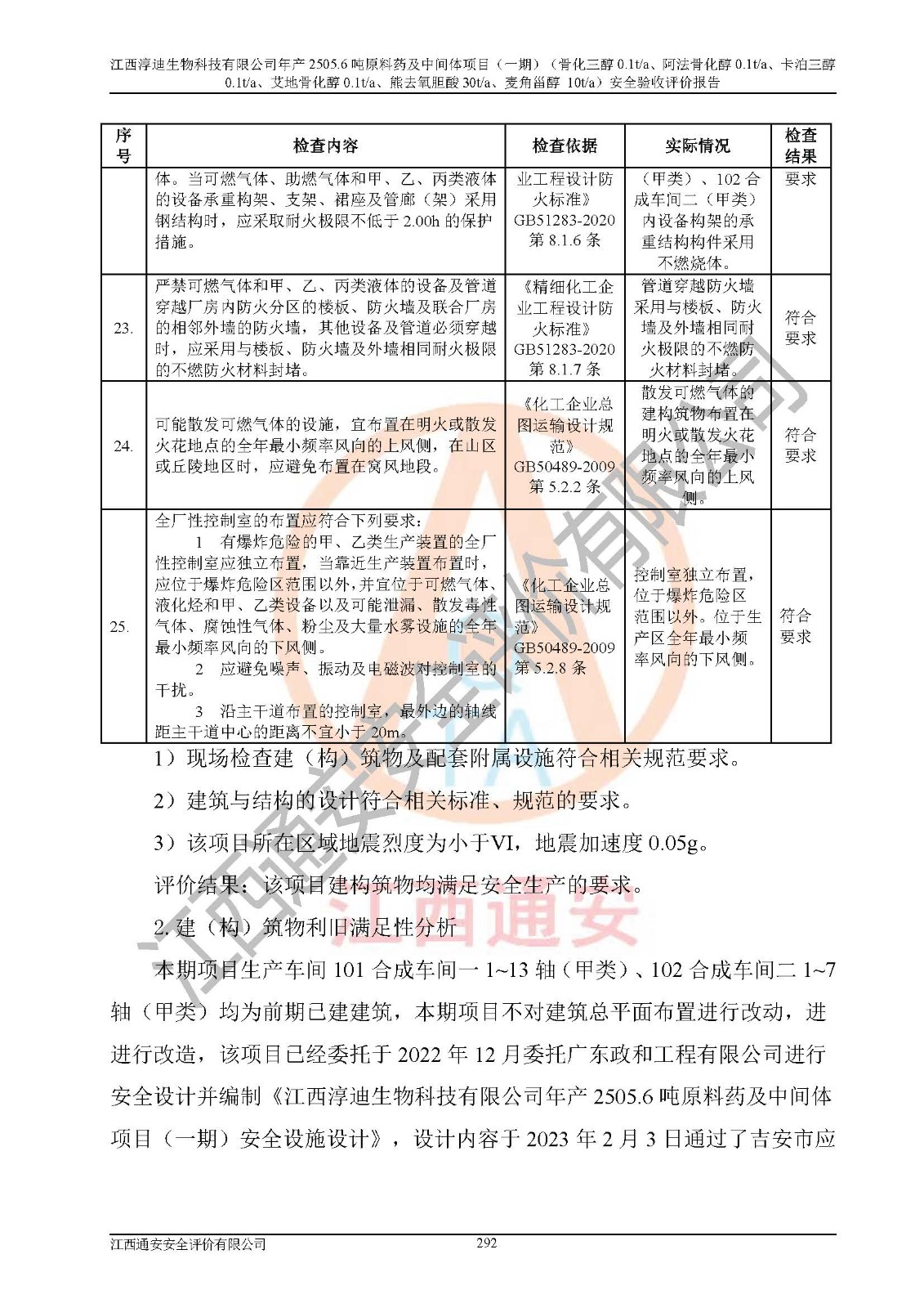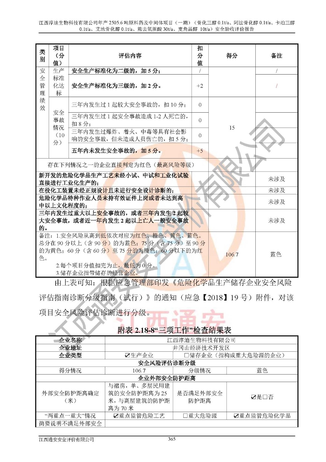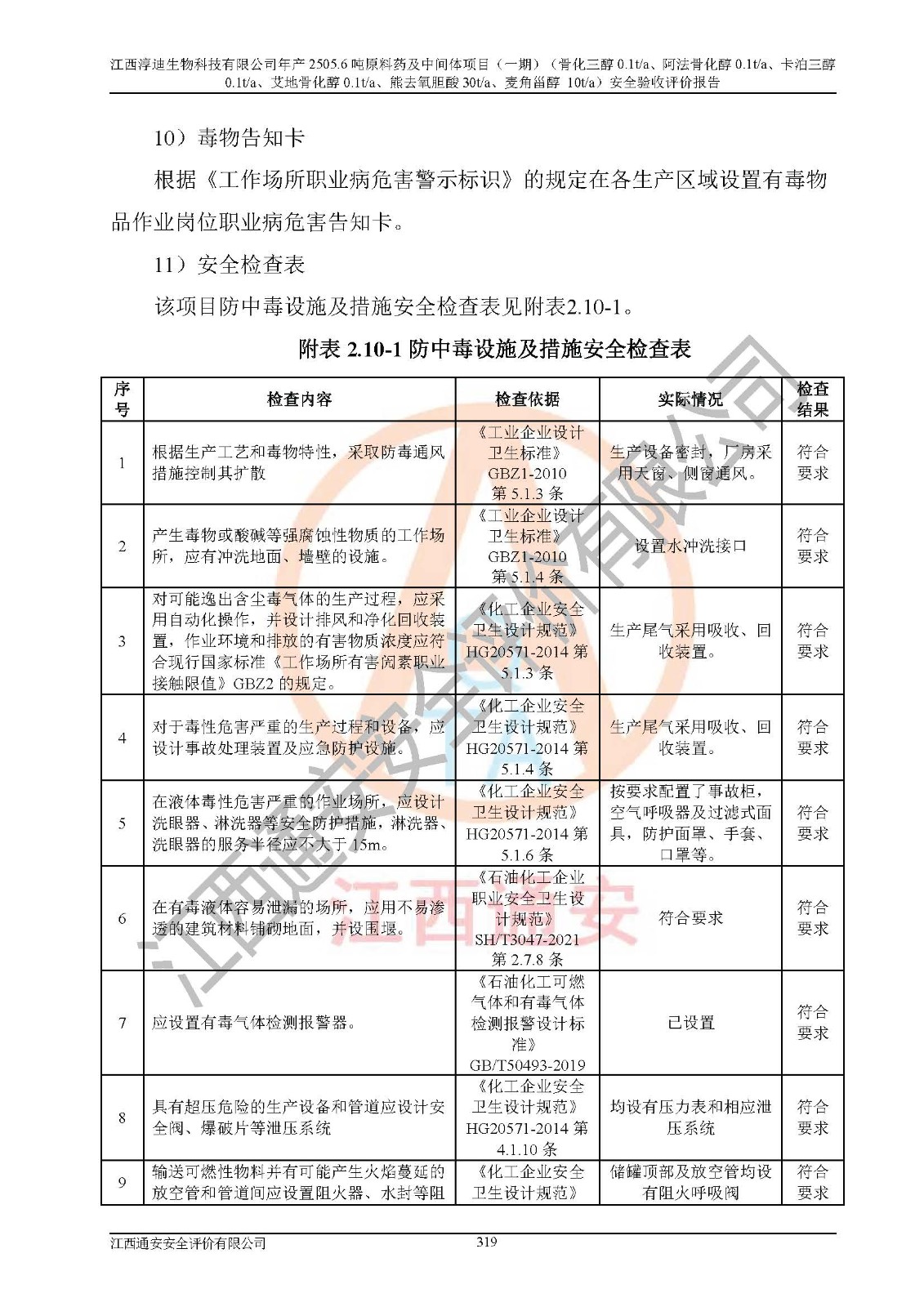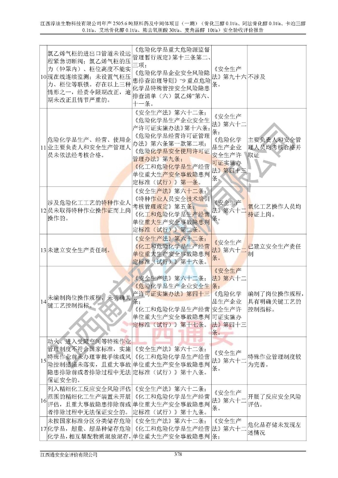 評價結論 | 評價結論:本報告認為,江西淳迪生物科技有限公司年產2505.6噸原料藥及中間體項目(一期)的生產裝置現(xiàn)場情況與設計圖紙一致,DCS和SIS系統(tǒng)設計符合要求且運行正常,有關從業(yè)人員資質符合《江西省危險化學品安全專項整治三年行動實施方案》要求,安全設施及安全管理符合**及有關部門關于安全生產法律、法規(guī)、標準的要求,安全風險是受控制的,其風險程度是可以接受的,符合安全生產條件,能夠滿足安全生產的要求,具備安全設施“三同時”驗收條件。 | |||