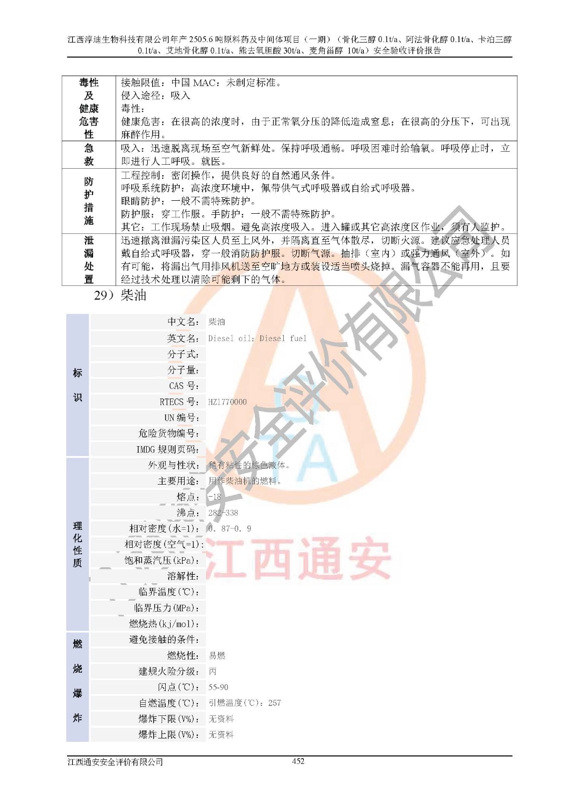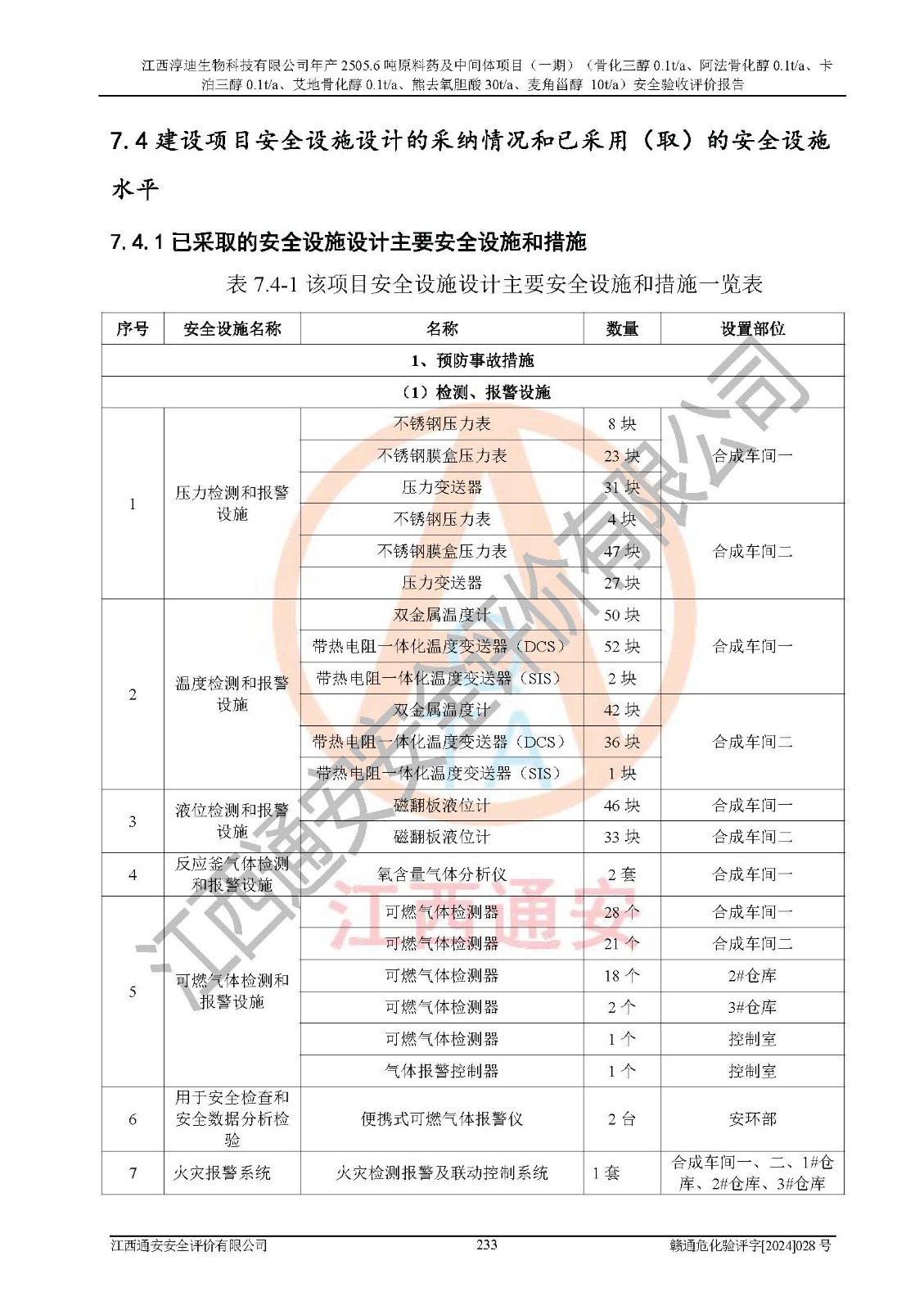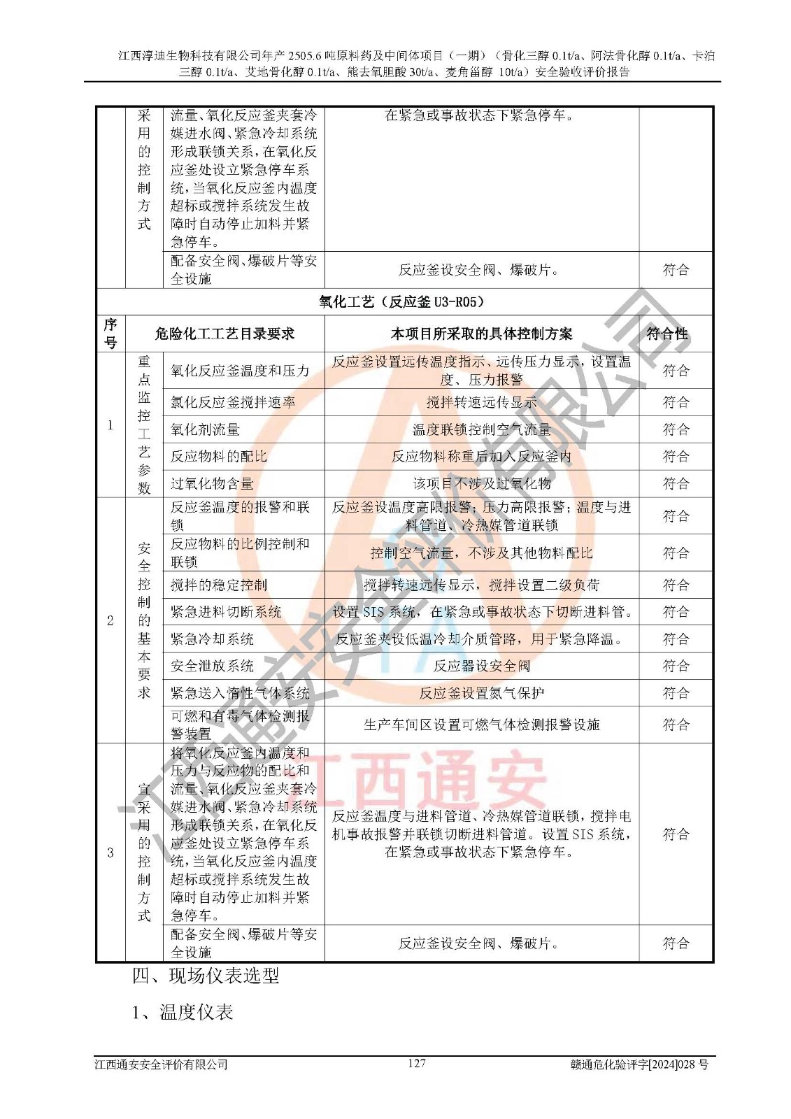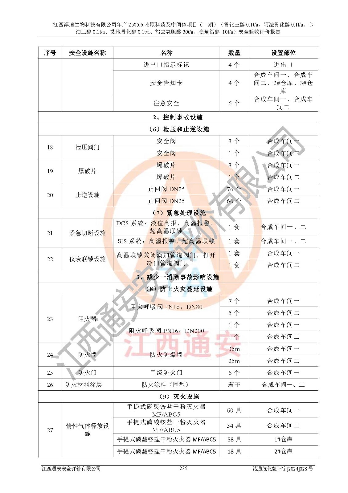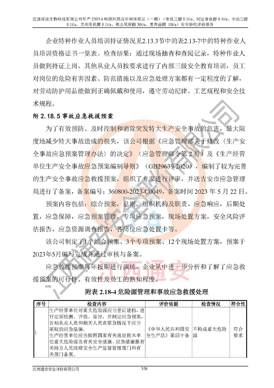 評價結論 | 評價結論:本報告認為,江西淳迪生物科技有限公司年產2505.6噸原料藥及中間體項目(一期)的生產裝置現(xiàn)場情況與設計圖紙一致,DCS和SIS系統(tǒng)設計符合要求且運行正常,有關從業(yè)人員資質符合《江西省危險化學品安全專項整治三年行動實施方案》要求,安全設施及安全管理符合**及有關部門關于安全生產法律、法規(guī)、標準的要求,安全風險是受控制的,其風險程度是可以接受的,符合安全生產條件,能夠滿足安全生產的要求,具備安全設施“三同時”驗收條件。 | |||
