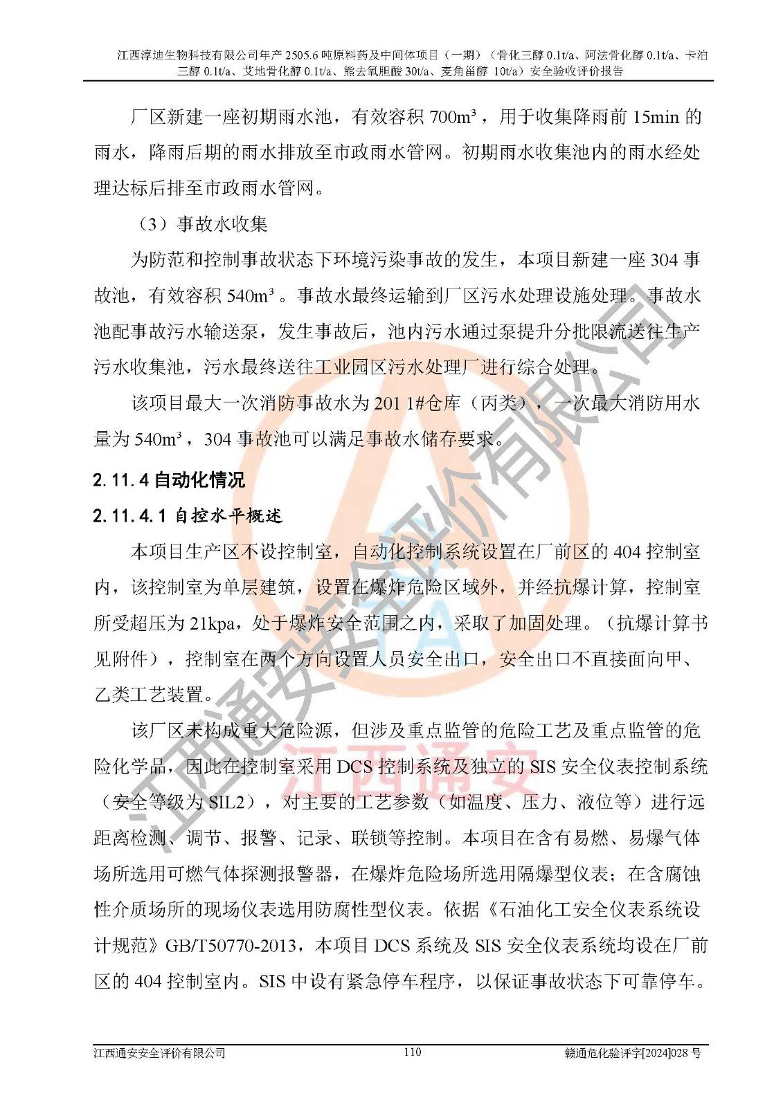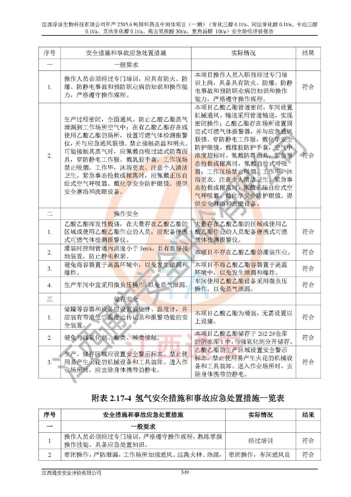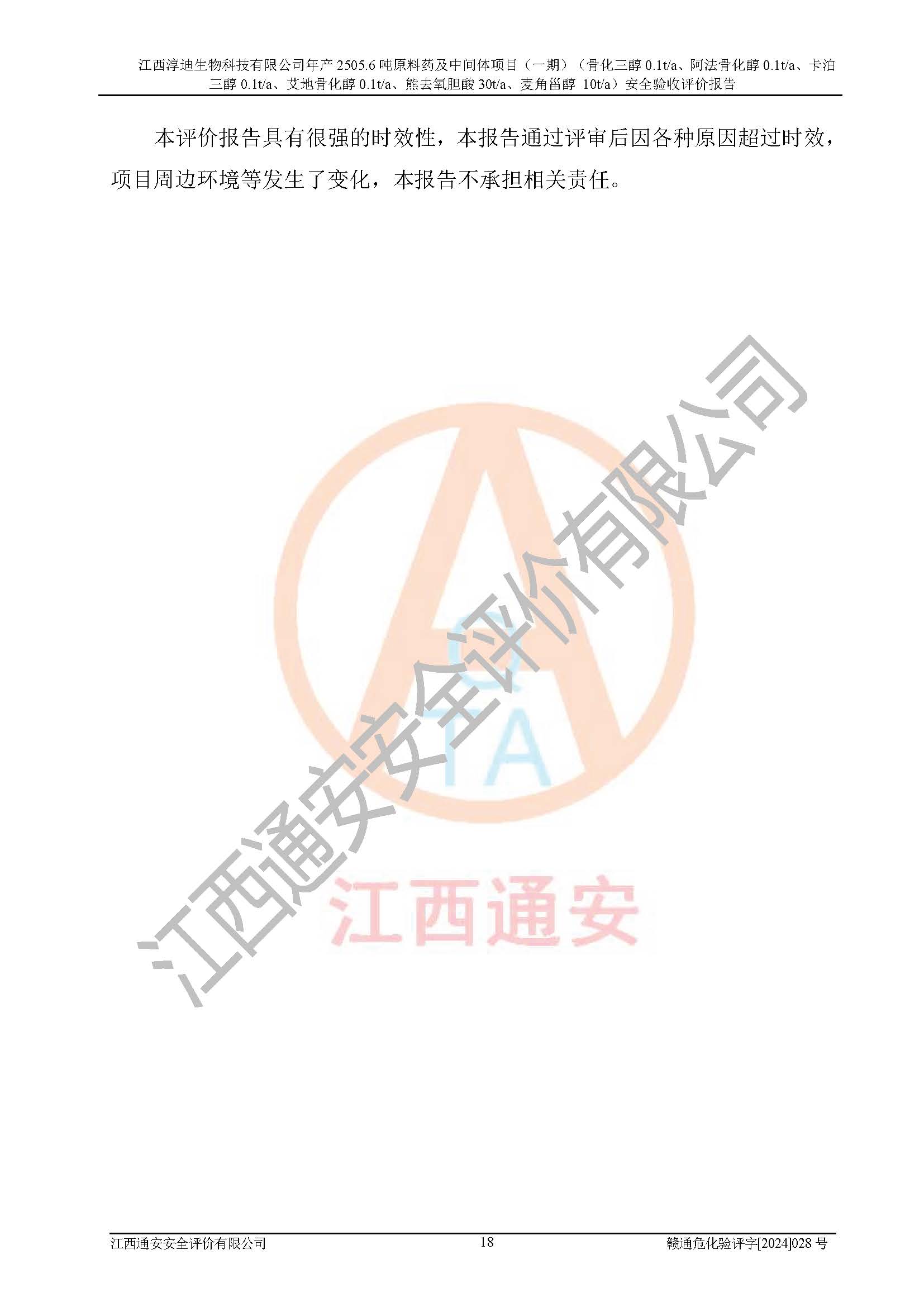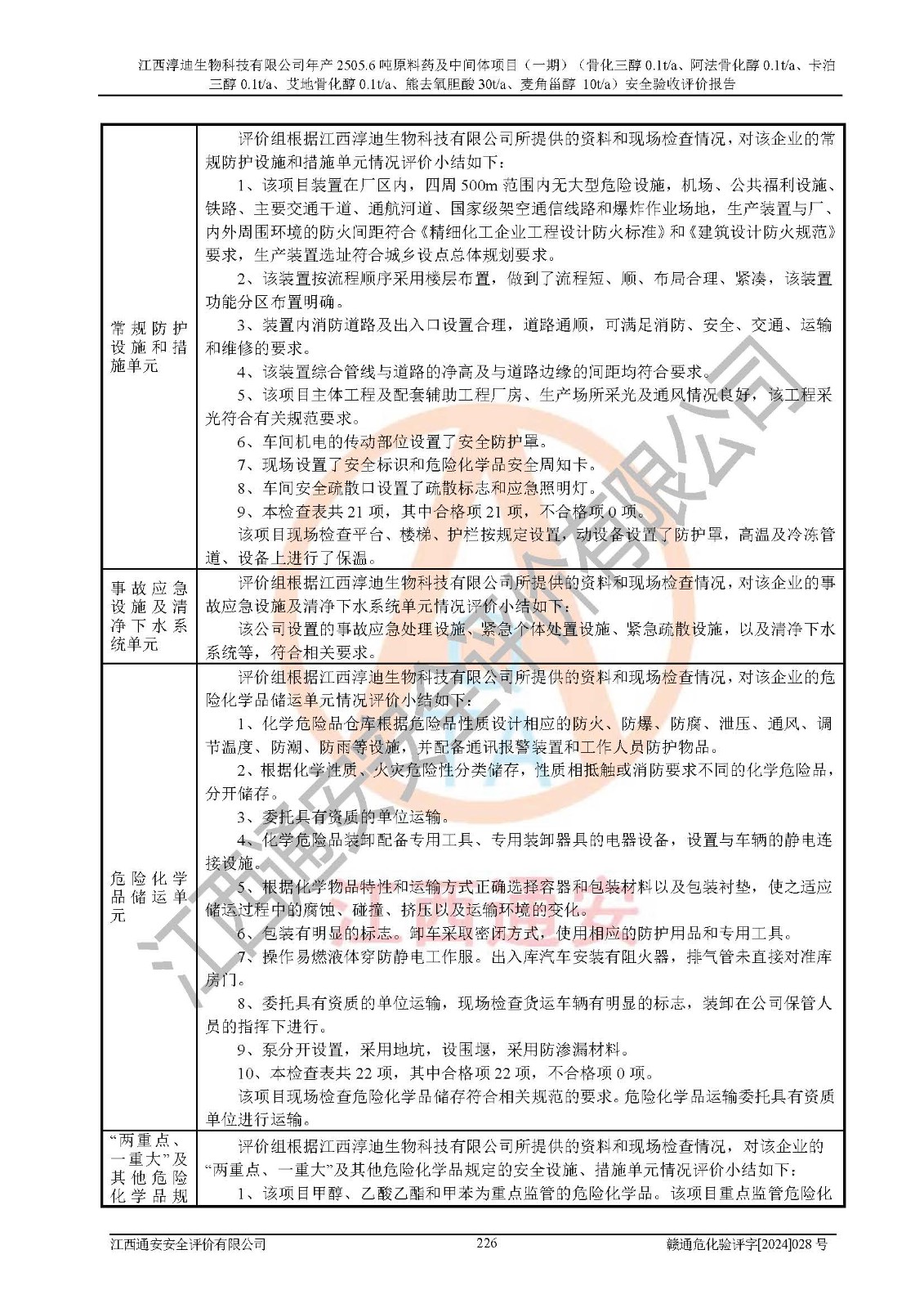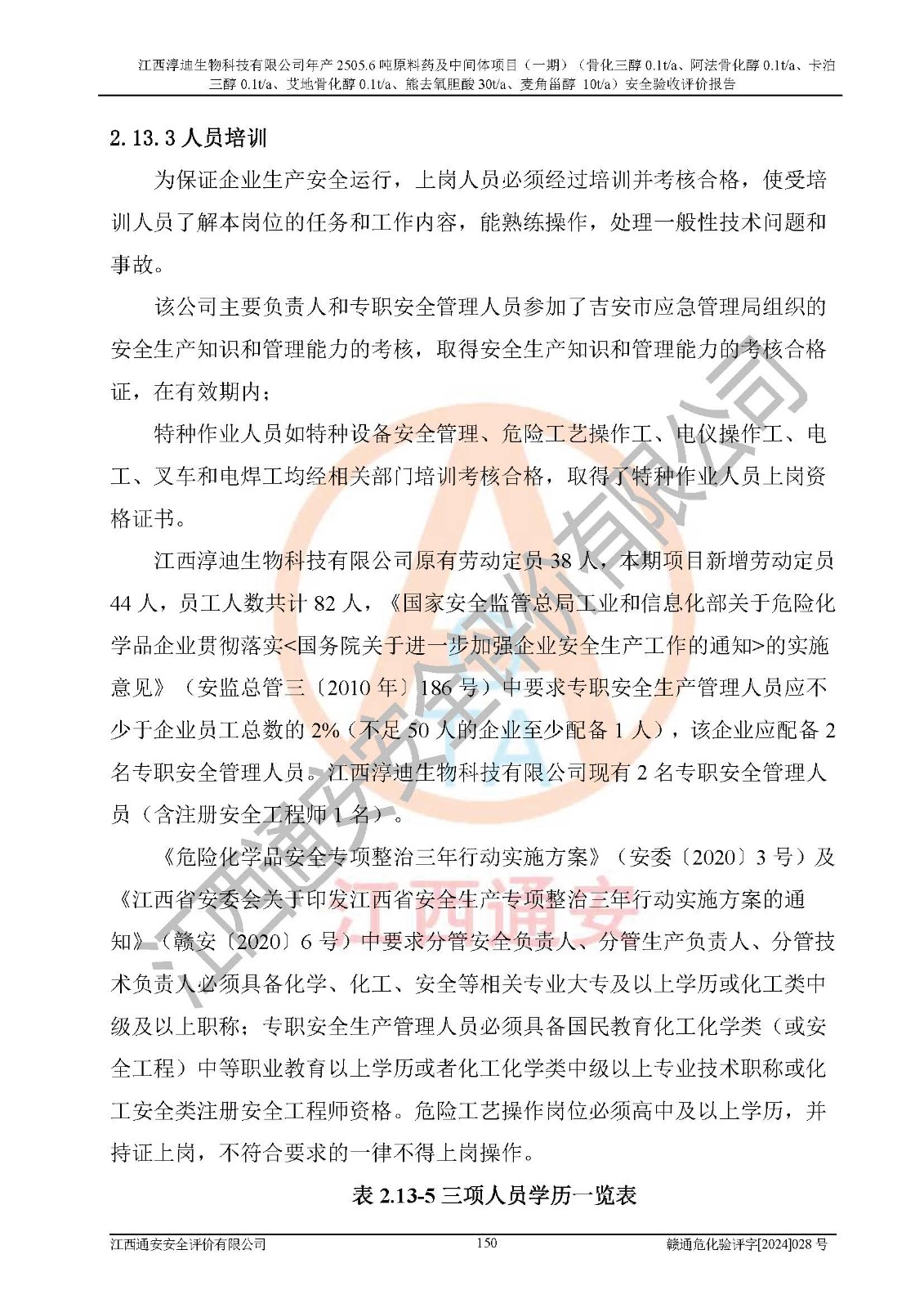 評價結論 | 評價結論:本報告認為,江西淳迪生物科技有限公司年產2505.6噸原料藥及中間體項目(一期)的生產裝置現(xiàn)場情況與設計圖紙一致,DCS和SIS系統(tǒng)設計符合要求且運行正常,有關從業(yè)人員資質符合《江西省危險化學品安全專項整治三年行動實施方案》要求,安全設施及安全管理符合**及有關部門關于安全生產法律、法規(guī)、標準的要求,安全風險是受控制的,其風險程度是可以接受的,符合安全生產條件,能夠滿足安全生產的要求,具備安全設施“三同時”驗收條件。 | |||