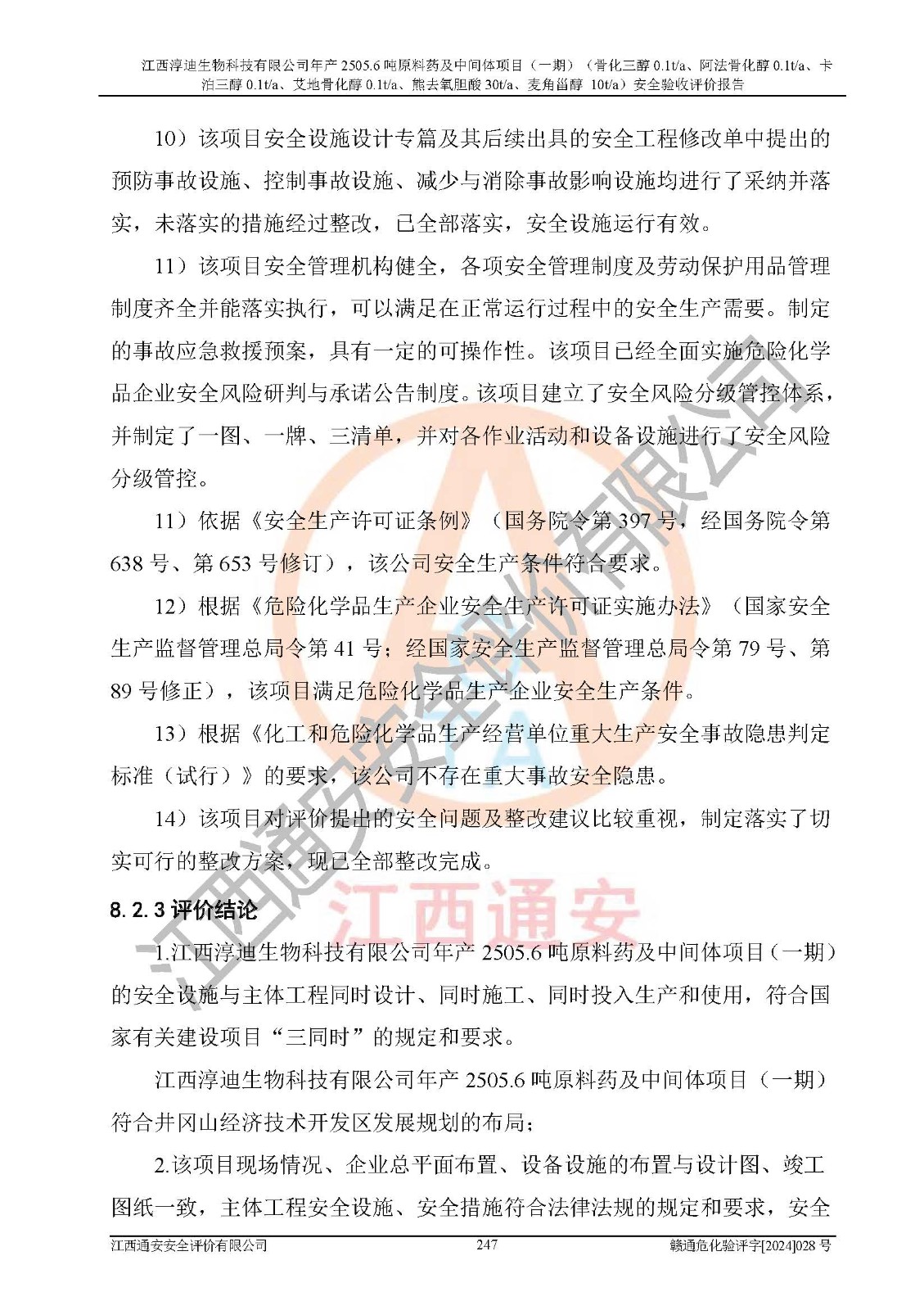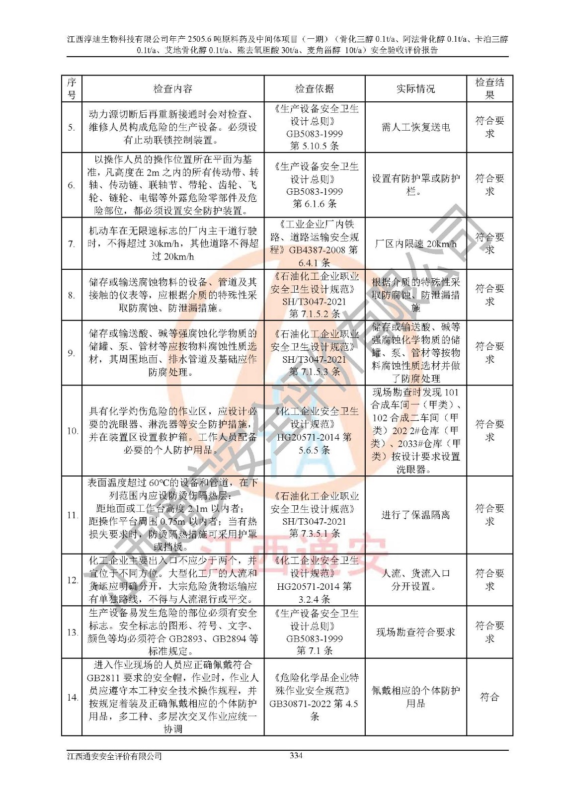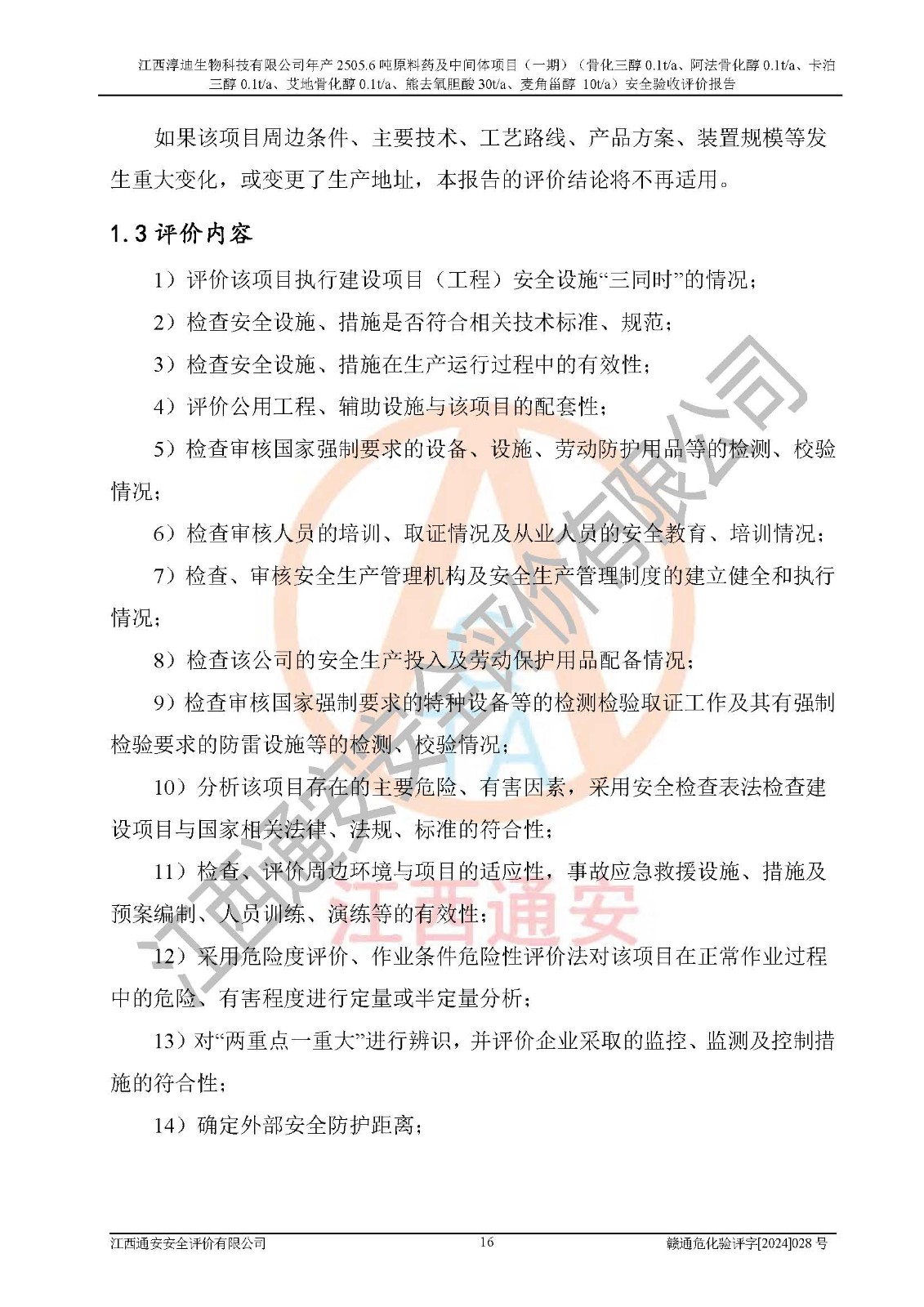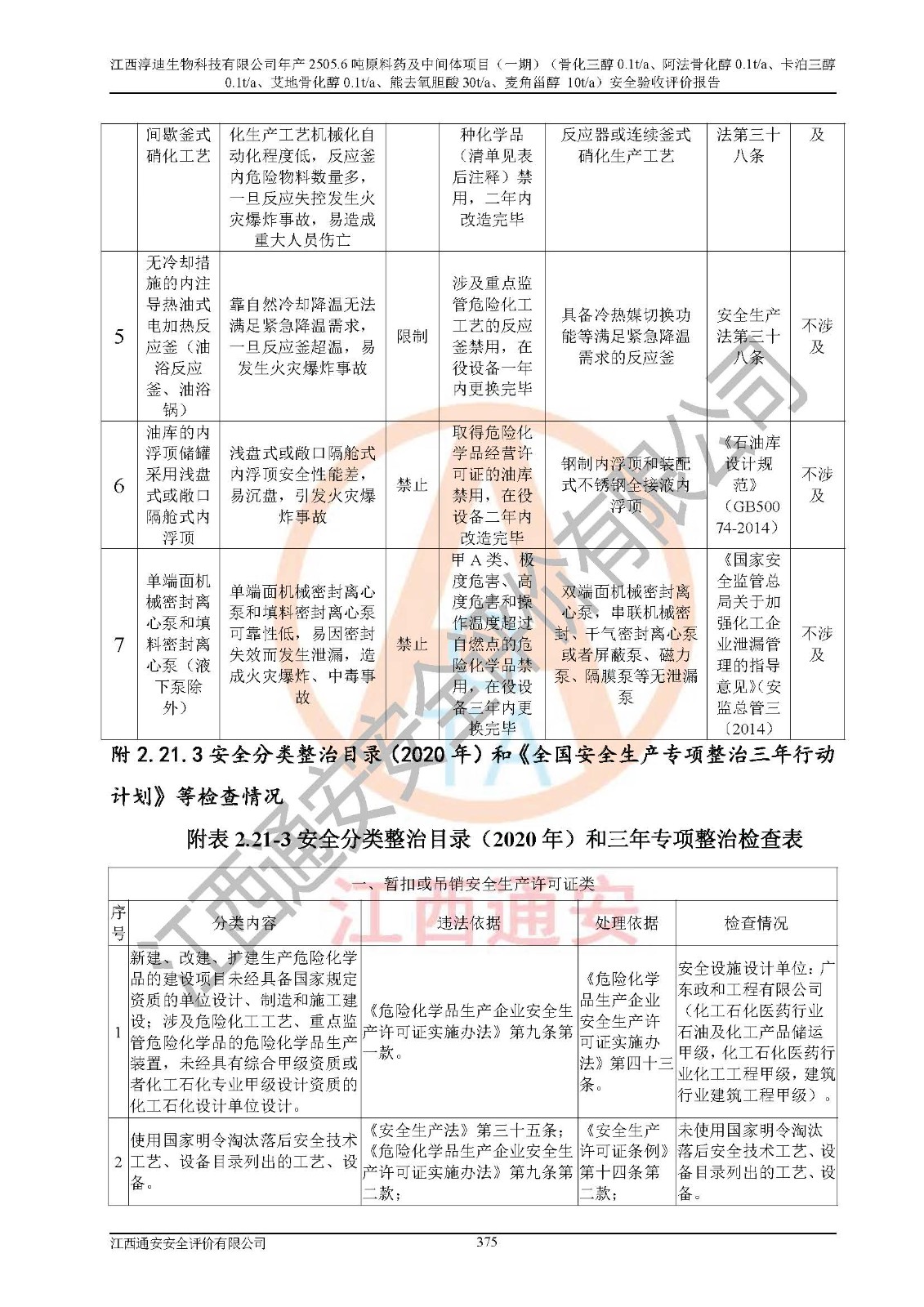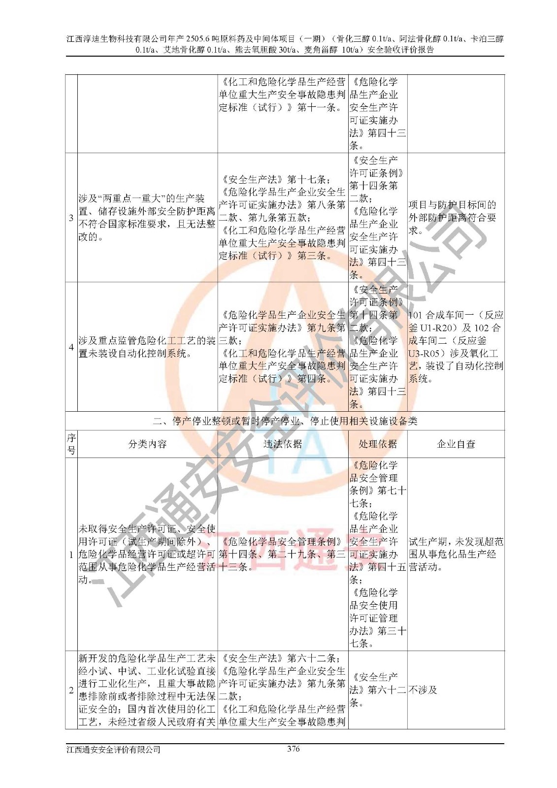 評價結論 | 評價結論:本報告認為,江西淳迪生物科技有限公司年產2505.6噸原料藥及中間體項目(一期)的生產裝置現(xiàn)場情況與設計圖紙一致,DCS和SIS系統(tǒng)設計符合要求且運行正常,有關從業(yè)人員資質符合《江西省危險化學品安全專項整治三年行動實施方案》要求,安全設施及安全管理符合**及有關部門關于安全生產法律、法規(guī)、標準的要求,安全風險是受控制的,其風險程度是可以接受的,符合安全生產條件,能夠滿足安全生產的要求,具備安全設施“三同時”驗收條件。 | |||