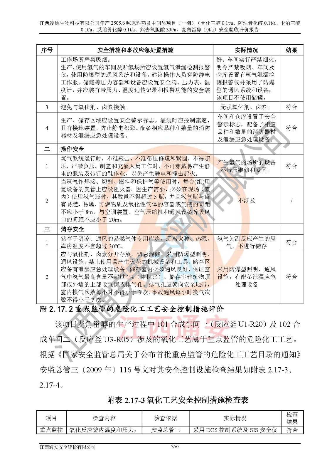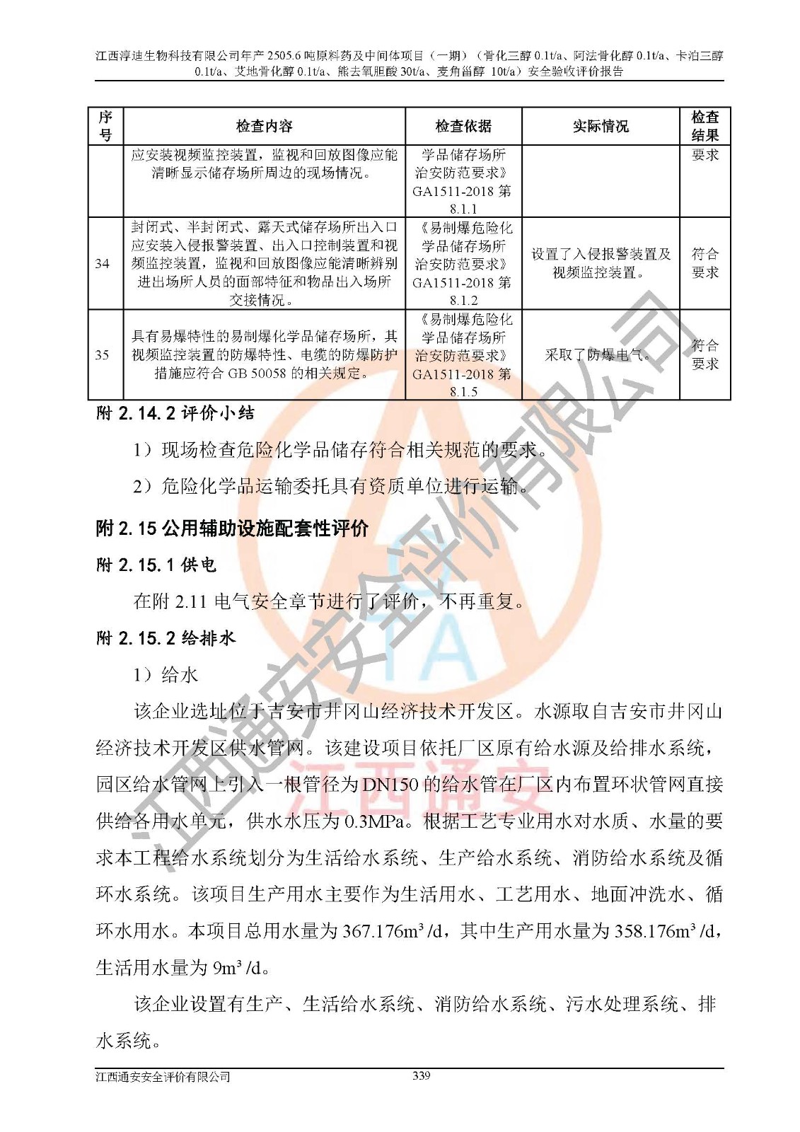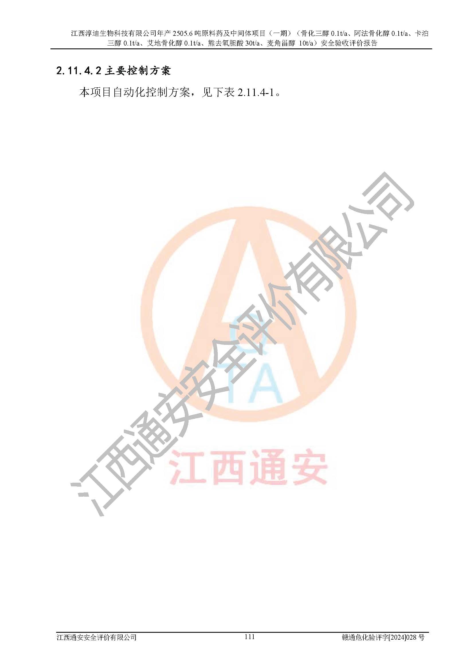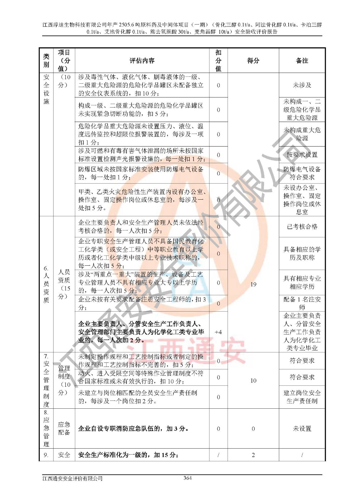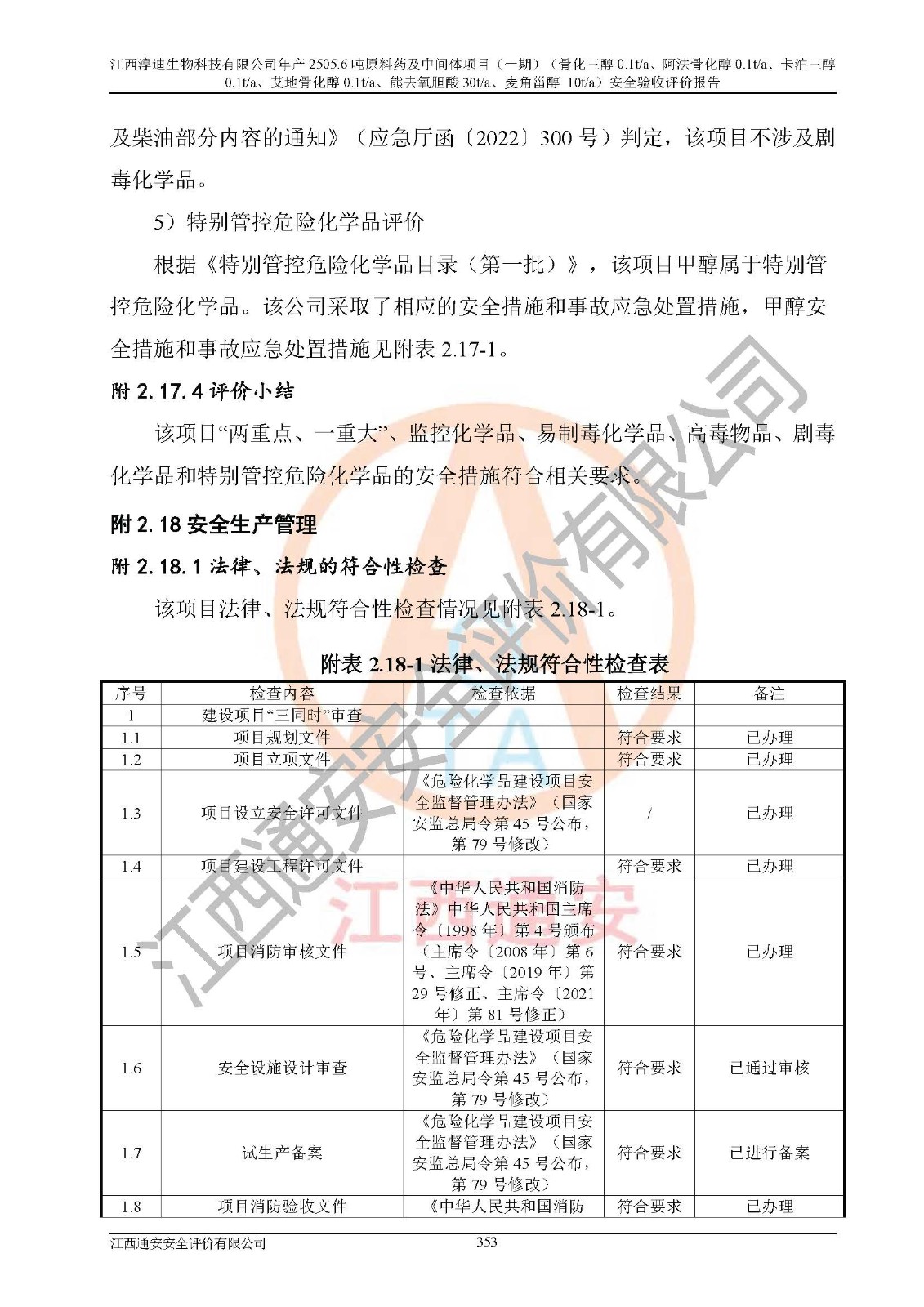 評價結論 | 評價結論:本報告認為,江西淳迪生物科技有限公司年產2505.6噸原料藥及中間體項目(一期)的生產裝置現(xiàn)場情況與設計圖紙一致,DCS和SIS系統(tǒng)設計符合要求且運行正常,有關從業(yè)人員資質符合《江西省危險化學品安全專項整治三年行動實施方案》要求,安全設施及安全管理符合**及有關部門關于安全生產法律、法規(guī)、標準的要求,安全風險是受控制的,其風險程度是可以接受的,符合安全生產條件,能夠滿足安全生產的要求,具備安全設施“三同時”驗收條件。 | |||