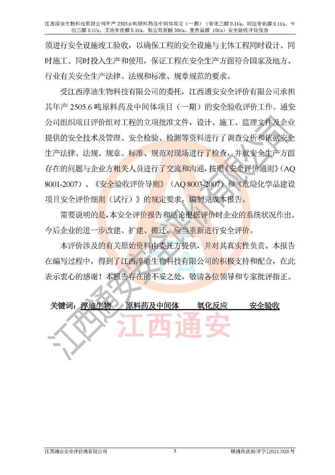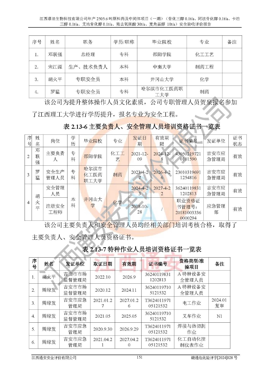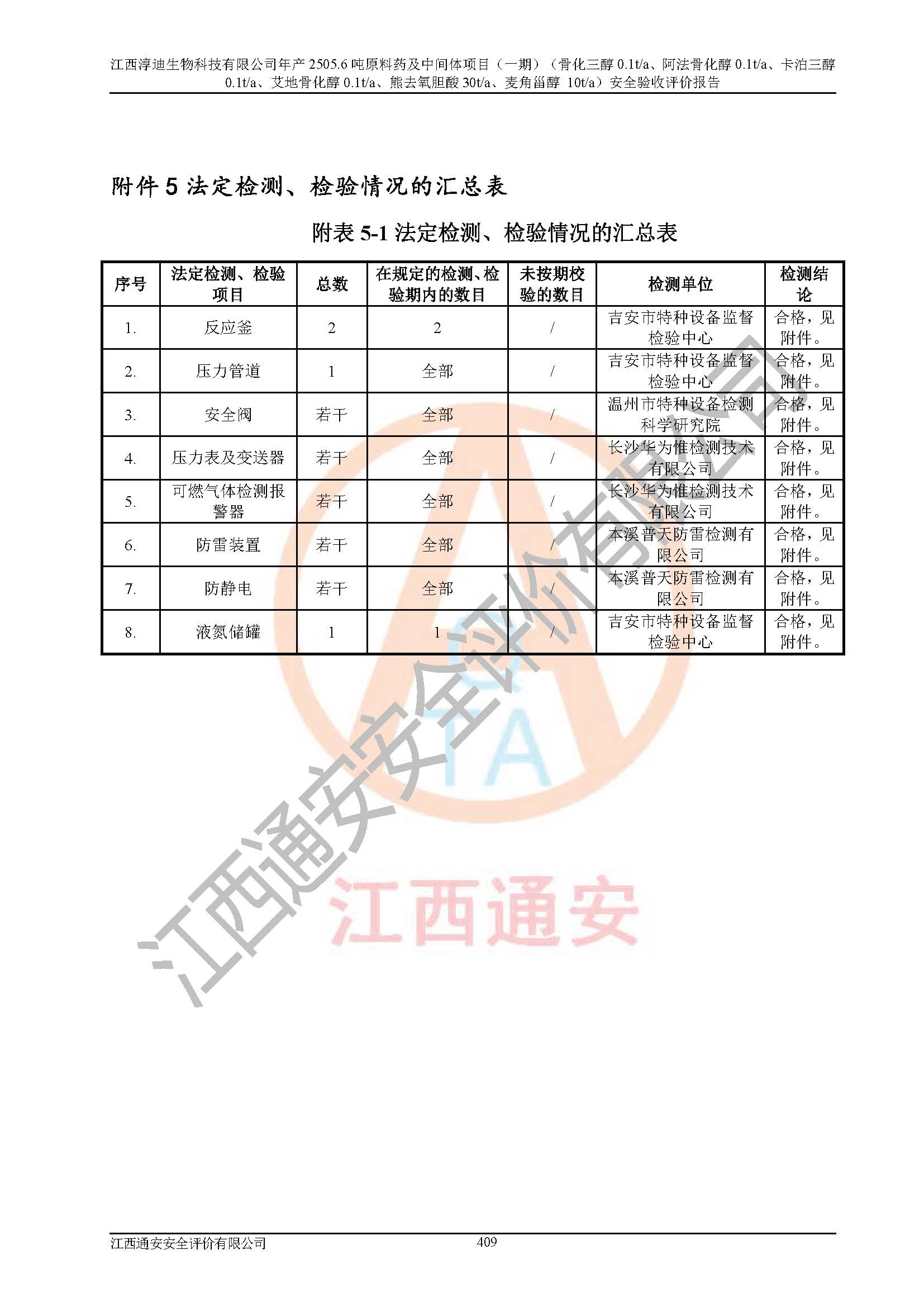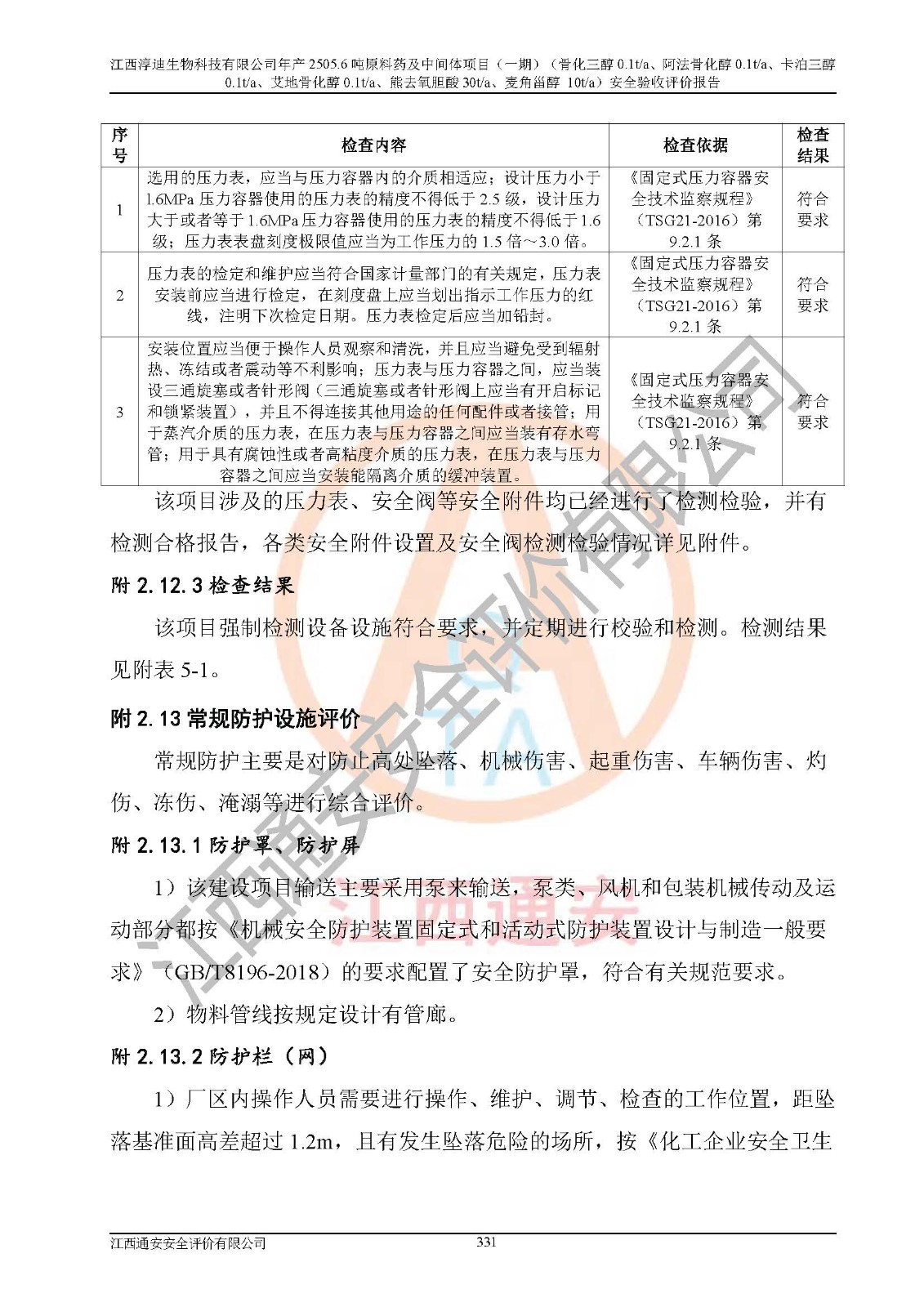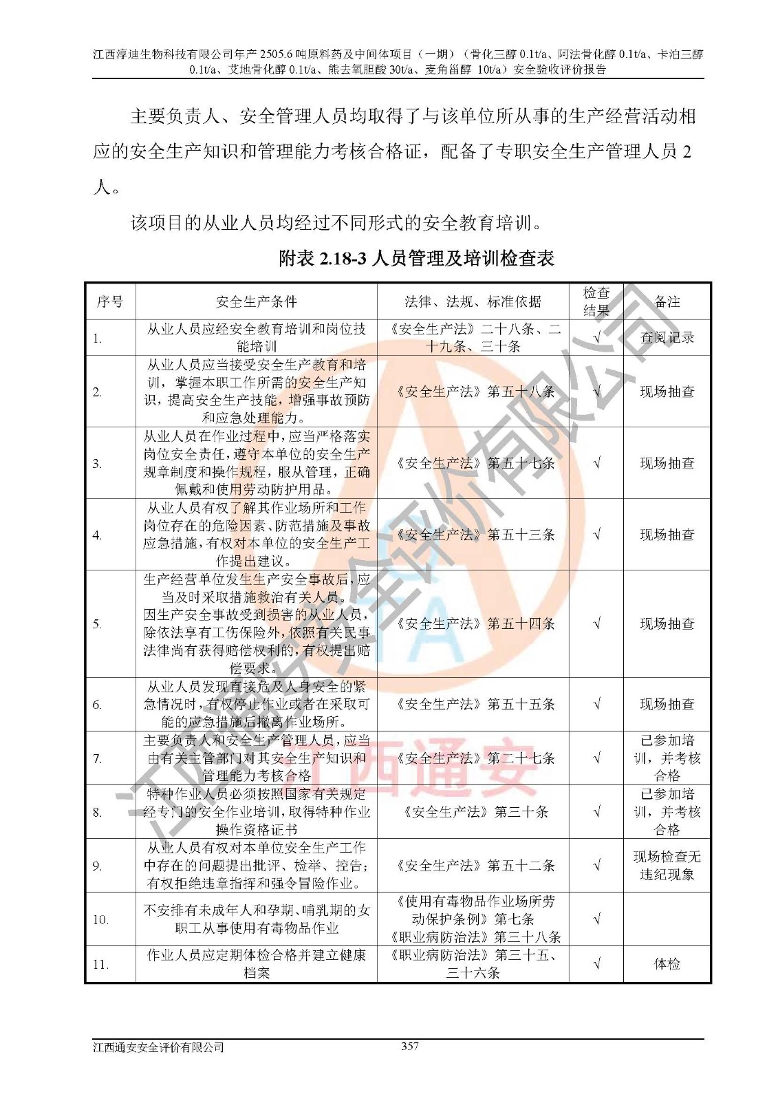 評價結論 | 評價結論:本報告認為,江西淳迪生物科技有限公司年產2505.6噸原料藥及中間體項目(一期)的生產裝置現(xiàn)場情況與設計圖紙一致,DCS和SIS系統(tǒng)設計符合要求且運行正常,有關從業(yè)人員資質符合《江西省危險化學品安全專項整治三年行動實施方案》要求,安全設施及安全管理符合**及有關部門關于安全生產法律、法規(guī)、標準的要求,安全風險是受控制的,其風險程度是可以接受的,符合安全生產條件,能夠滿足安全生產的要求,具備安全設施“三同時”驗收條件。 | |||