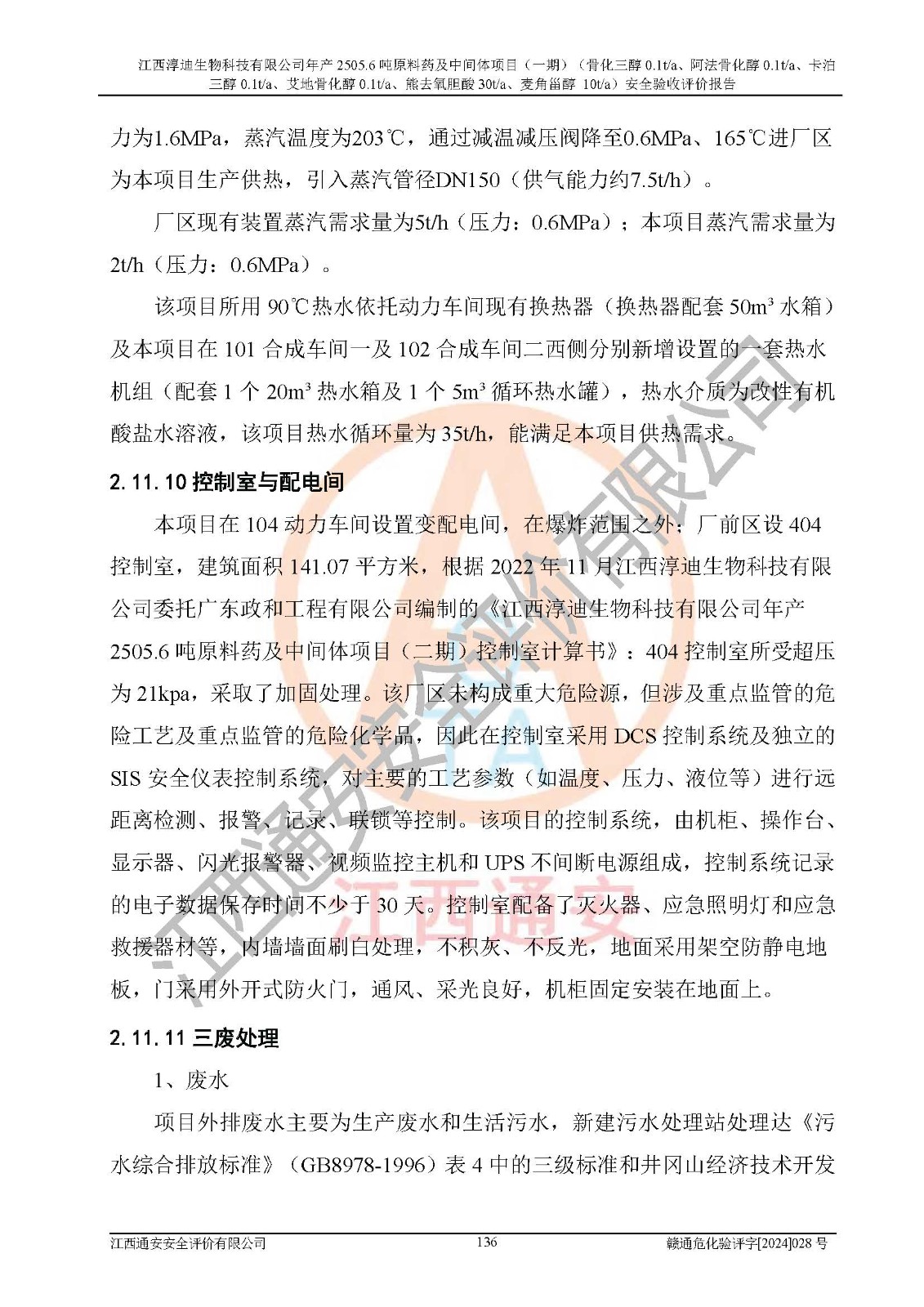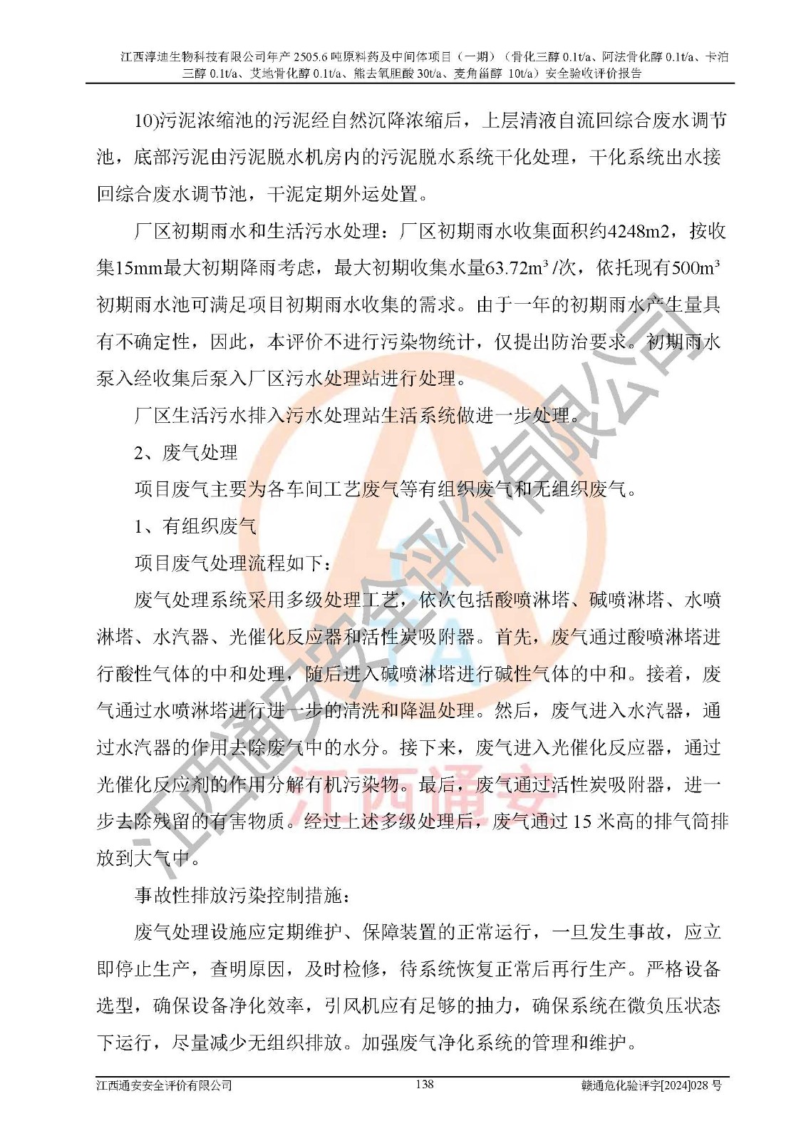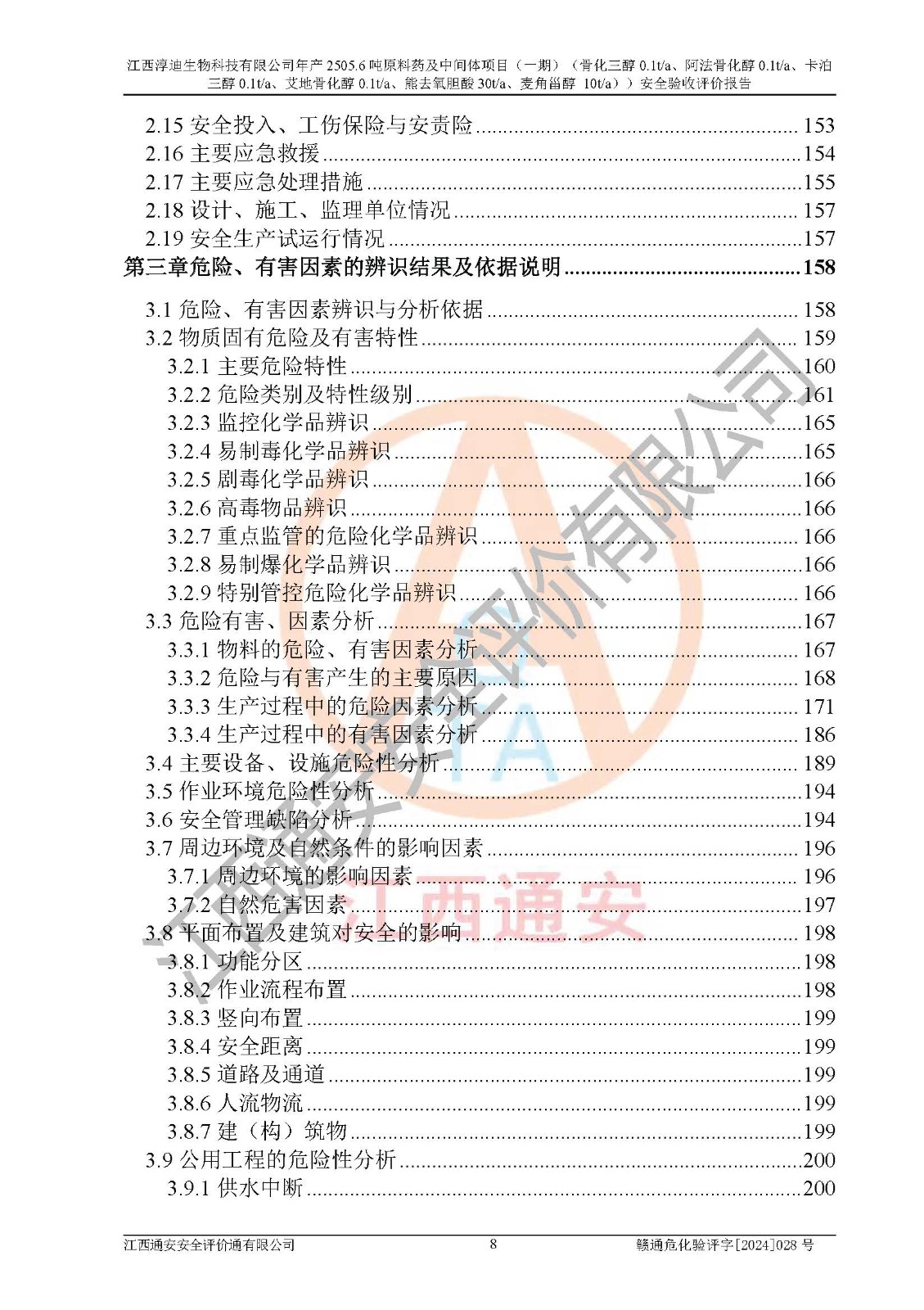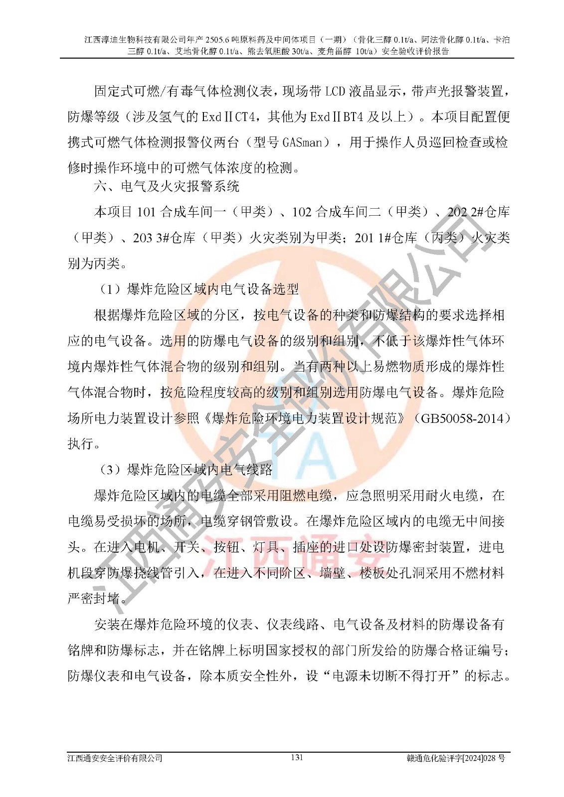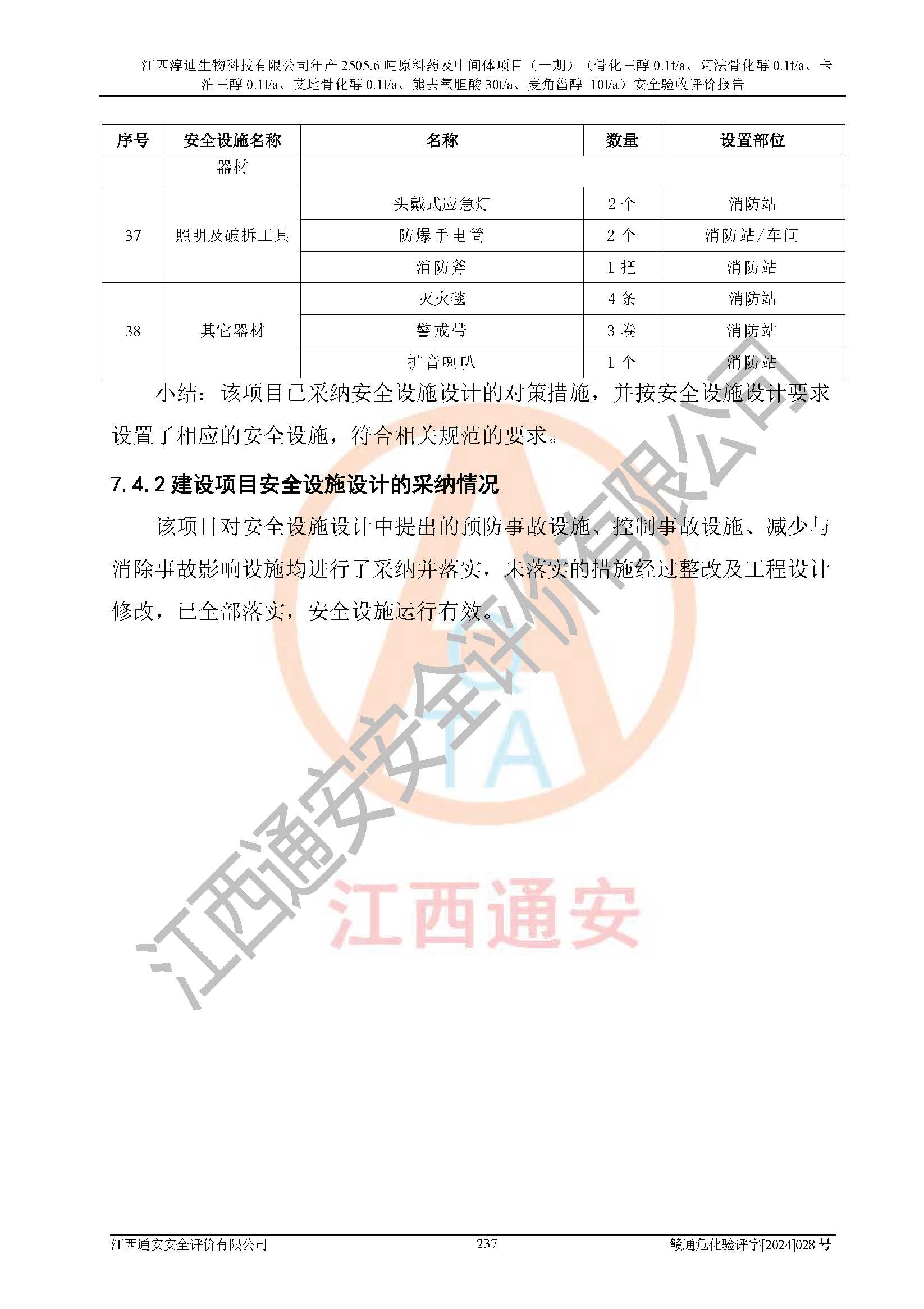 評價結論 | 評價結論:本報告認為,江西淳迪生物科技有限公司年產2505.6噸原料藥及中間體項目(一期)的生產裝置現(xiàn)場情況與設計圖紙一致,DCS和SIS系統(tǒng)設計符合要求且運行正常,有關從業(yè)人員資質符合《江西省危險化學品安全專項整治三年行動實施方案》要求,安全設施及安全管理符合**及有關部門關于安全生產法律、法規(guī)、標準的要求,安全風險是受控制的,其風險程度是可以接受的,符合安全生產條件,能夠滿足安全生產的要求,具備安全設施“三同時”驗收條件。 | |||