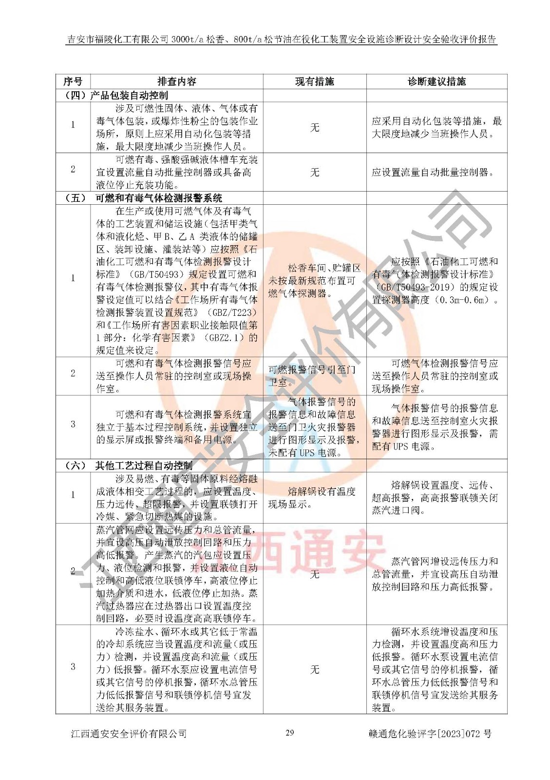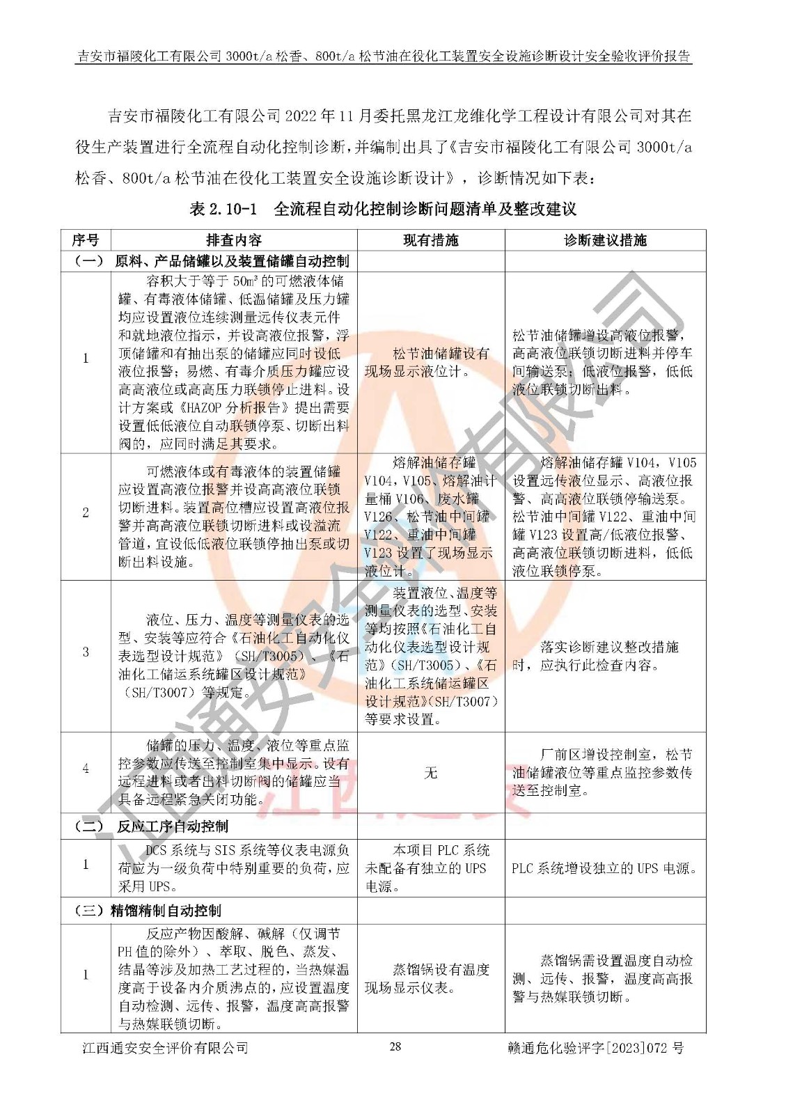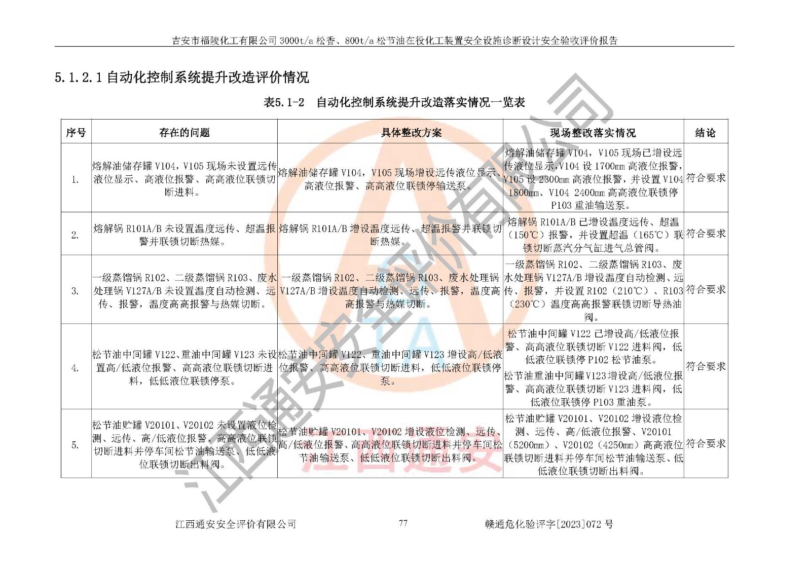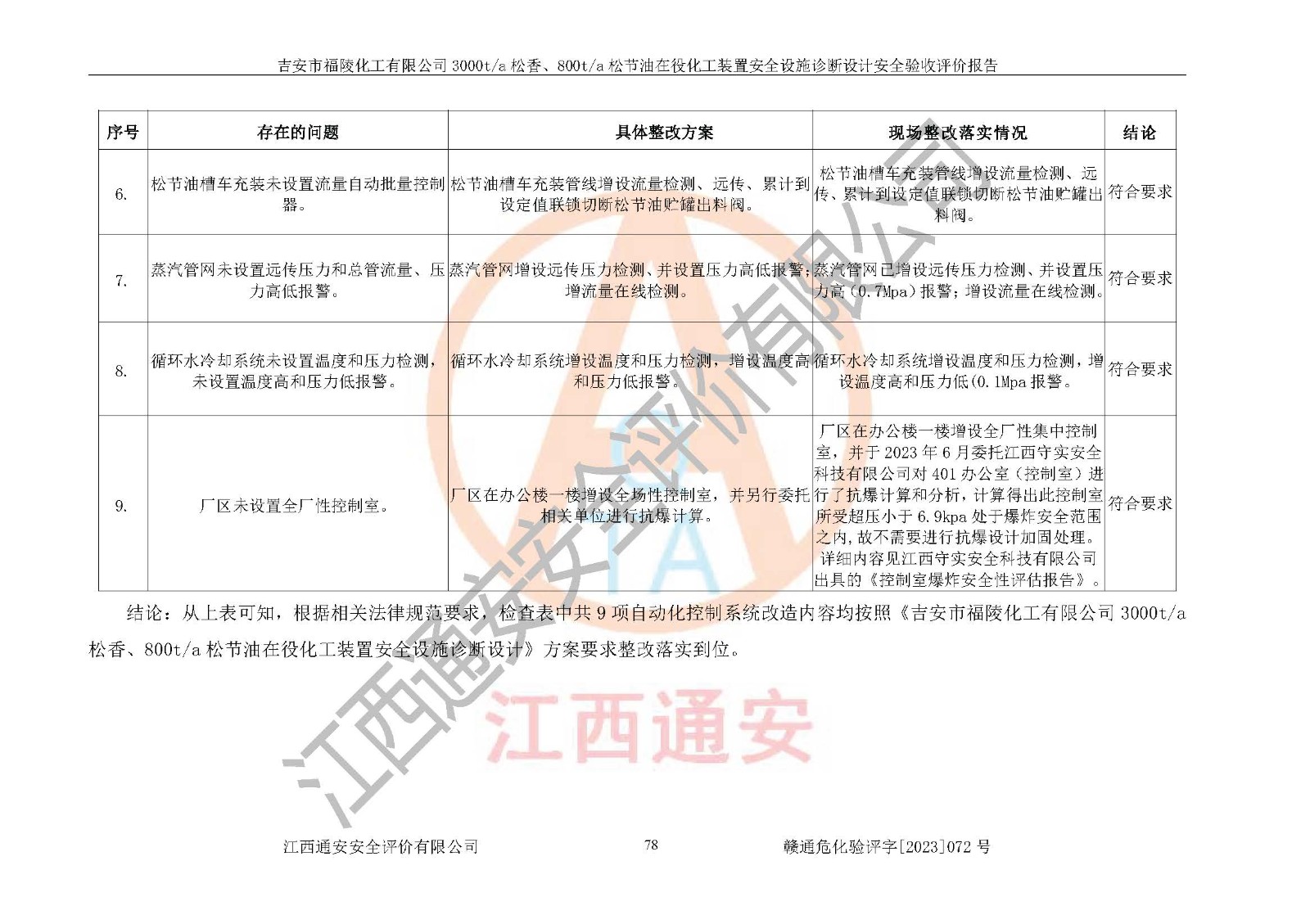 評價結(jié)論 | 評價結(jié)論:本報告認為,吉安市福陵化工有限公司3000t/a松香、800t/a松節(jié)油在役化工裝置安全設(shè)施診斷設(shè)計方案中提出的整改和控制措施已得到落實,企業(yè)控制系統(tǒng)設(shè)置情況與設(shè)計方案一致,由具有**相應(yīng)資質(zhì)的單位進行設(shè)計、施工,施工單位對自動控制系統(tǒng)調(diào)試合格,并出具了竣工圖,安全設(shè)施及安全管理符合**及有關(guān)部門關(guān)于安全生產(chǎn)法律、法規(guī)、標準的要求,安全風險程度是可以接受的,安全風險可控,滿足《江西省應(yīng)急管理廳關(guān)于印發(fā)<江西省化工企業(yè)自動化提升實施方案>(試行)的通知》(贛應(yīng)急字[2021]190號)的要求,具備安全設(shè)計診斷問題整改及全流程自動化控制改造工程竣工驗收條件。 | |||