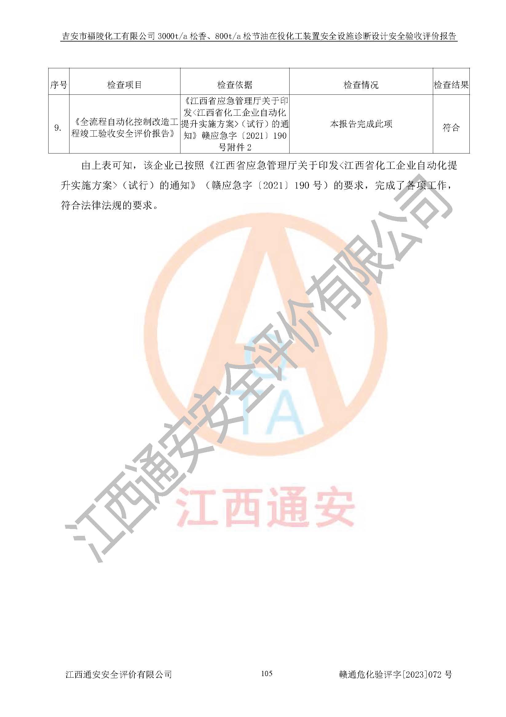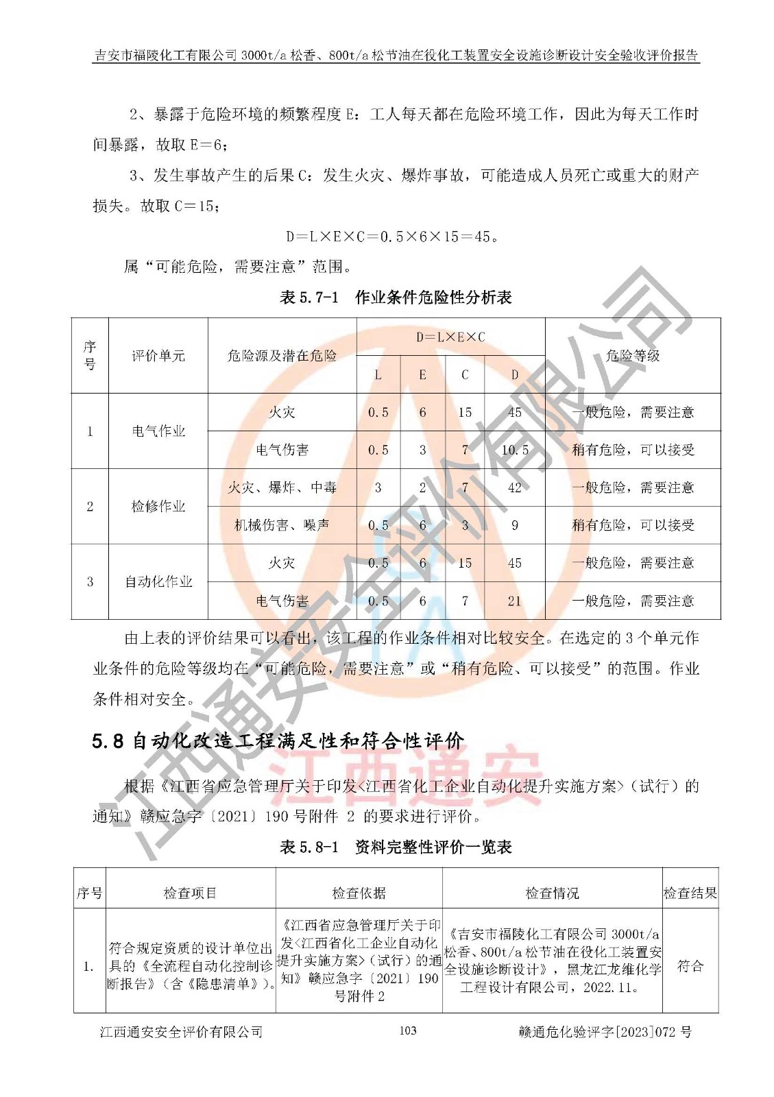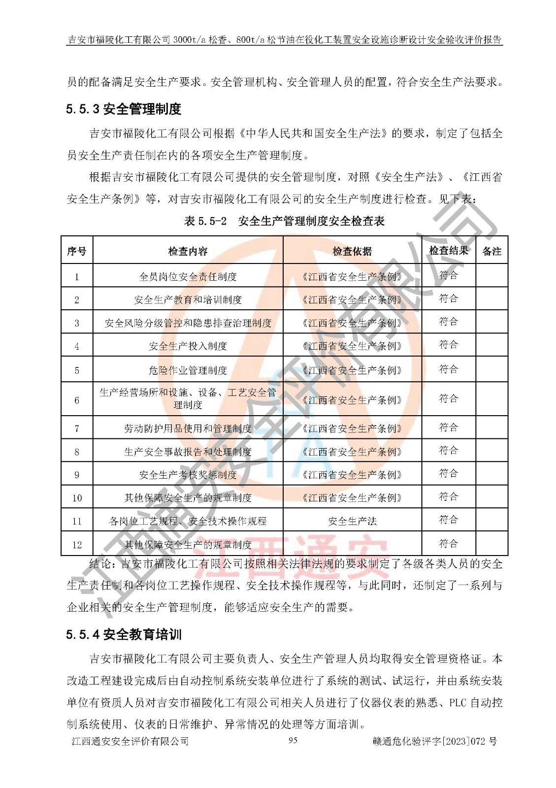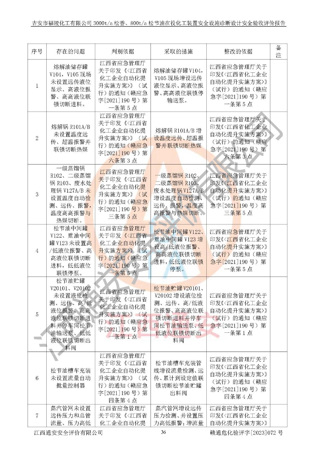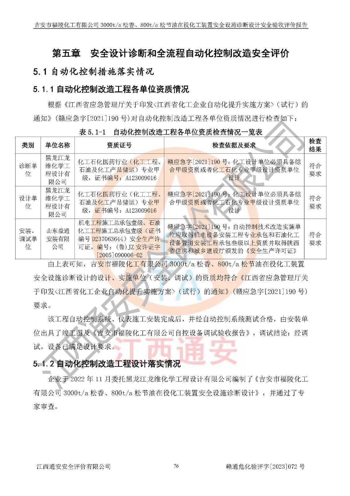 評價結(jié)論 | 評價結(jié)論:本報告認為,吉安市福陵化工有限公司3000t/a松香、800t/a松節(jié)油在役化工裝置安全設(shè)施診斷設(shè)計方案中提出的整改和控制措施已得到落實,企業(yè)控制系統(tǒng)設(shè)置情況與設(shè)計方案一致,由具有**相應(yīng)資質(zhì)的單位進行設(shè)計、施工,施工單位對自動控制系統(tǒng)調(diào)試合格,并出具了竣工圖,安全設(shè)施及安全管理符合**及有關(guān)部門關(guān)于安全生產(chǎn)法律、法規(guī)、標準的要求,安全風險程度是可以接受的,安全風險可控,滿足《江西省應(yīng)急管理廳關(guān)于印發(fā)<江西省化工企業(yè)自動化提升實施方案>(試行)的通知》(贛應(yīng)急字[2021]190號)的要求,具備安全設(shè)計診斷問題整改及全流程自動化控制改造工程竣工驗收條件。 | |||