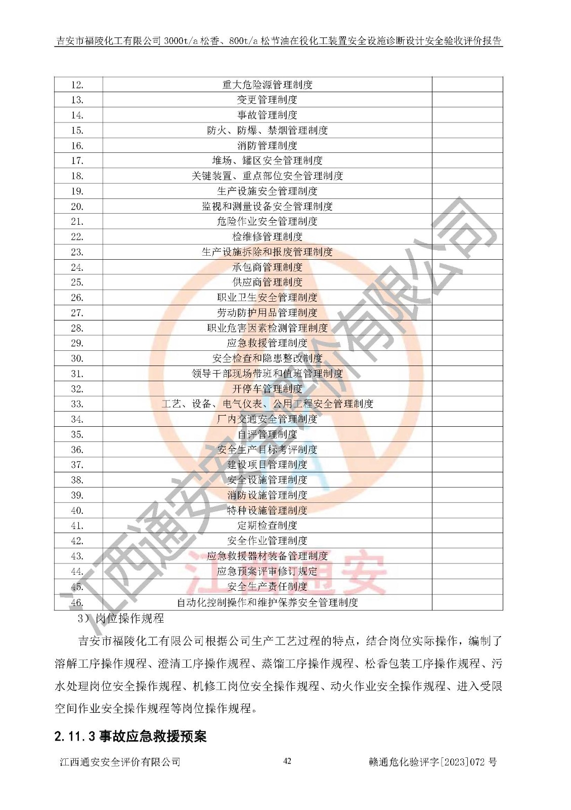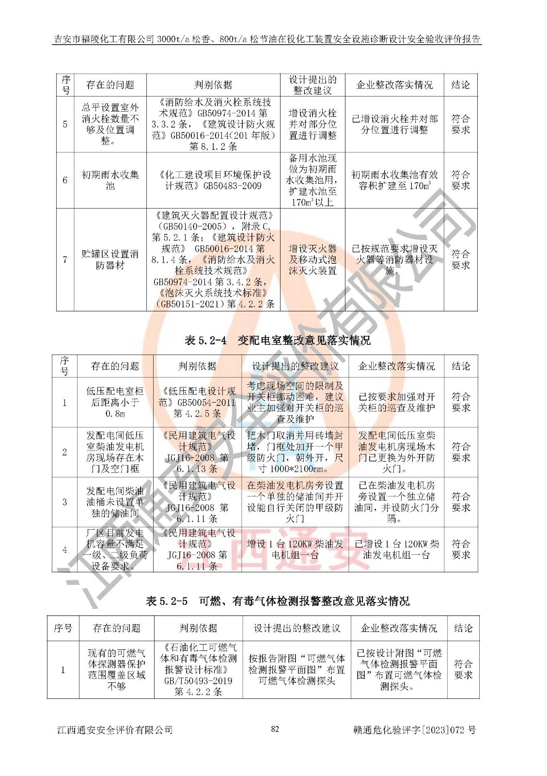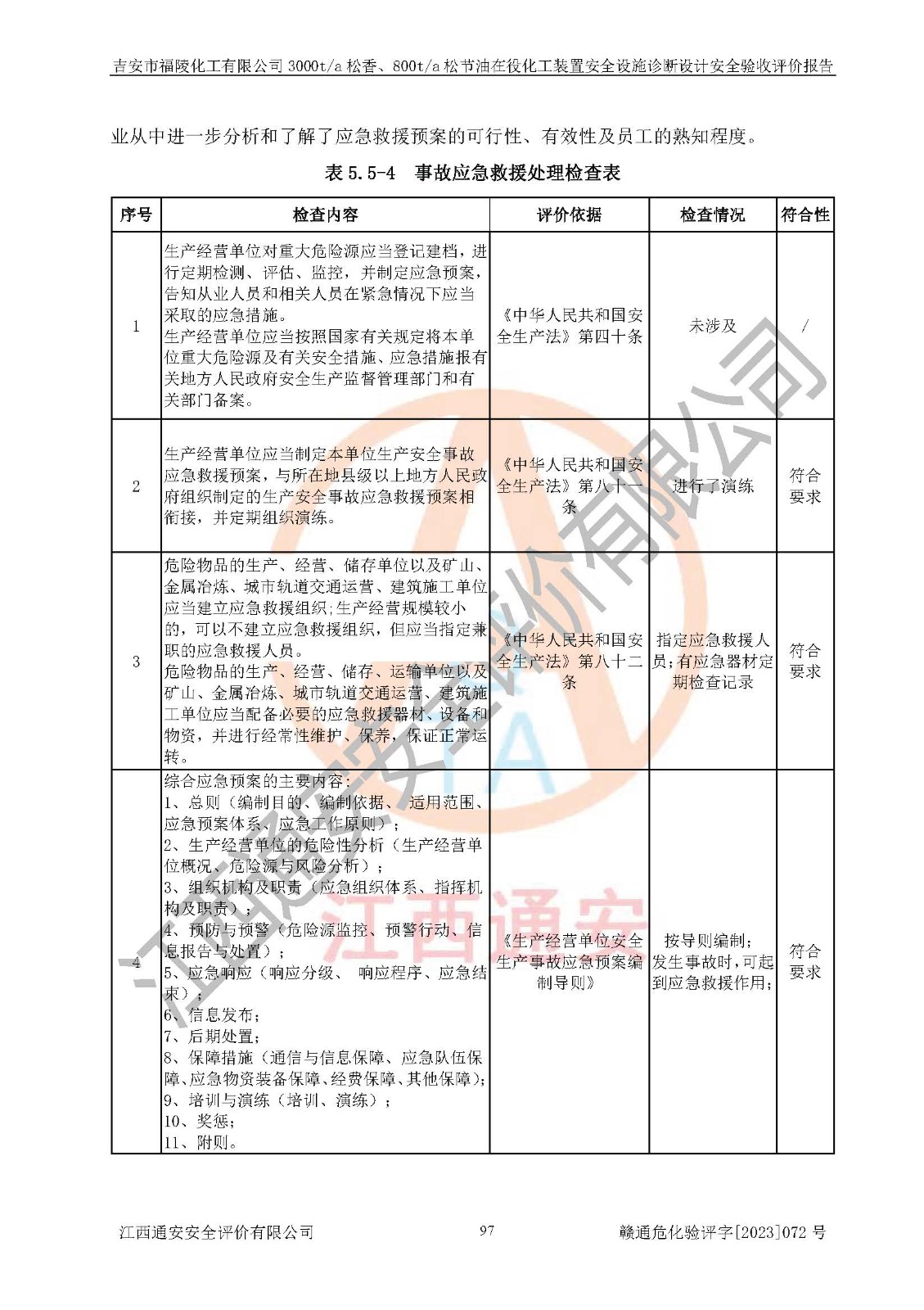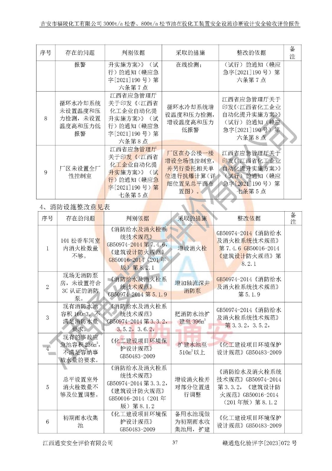評價結(jié)論 | 評價結(jié)論:本報告認為,吉安市福陵化工有限公司3000t/a松香、800t/a松節(jié)油在役化工裝置安全設(shè)施診斷設(shè)計方案中提出的整改和控制措施已得到落實,企業(yè)控制系統(tǒng)設(shè)置情況與設(shè)計方案一致,由具有**相應(yīng)資質(zhì)的單位進行設(shè)計、施工,施工單位對自動控制系統(tǒng)調(diào)試合格,并出具了竣工圖,安全設(shè)施及安全管理符合**及有關(guān)部門關(guān)于安全生產(chǎn)法律、法規(guī)、標準的要求,安全風險程度是可以接受的,安全風險可控,滿足《江西省應(yīng)急管理廳關(guān)于印發(fā)<江西省化工企業(yè)自動化提升實施方案>(試行)的通知》(贛應(yīng)急字[2021]190號)的要求,具備安全設(shè)計診斷問題整改及全流程自動化控制改造工程竣工驗收條件。 | |||