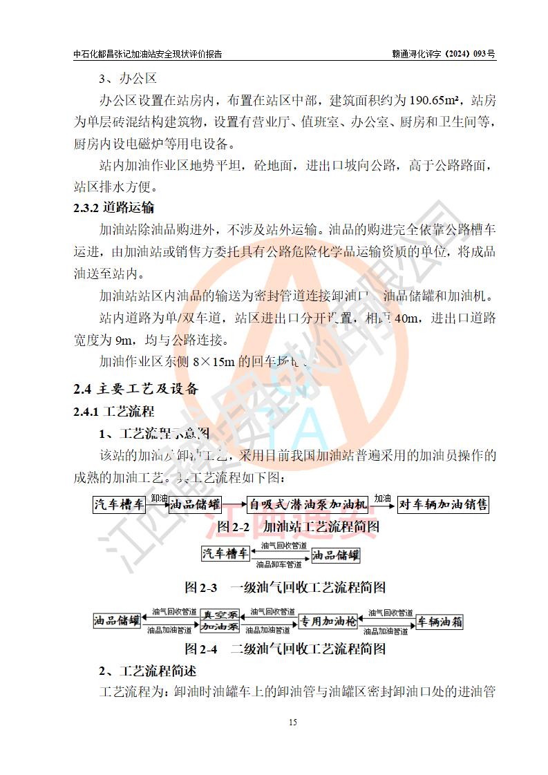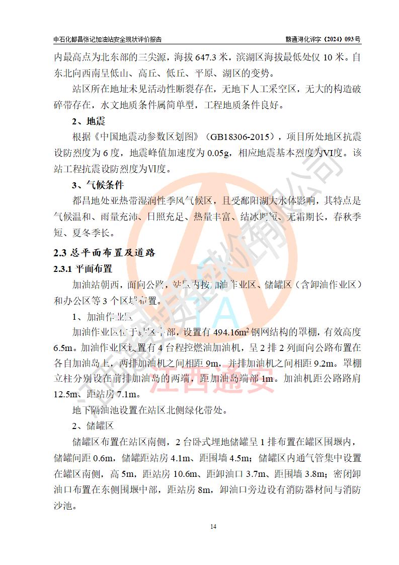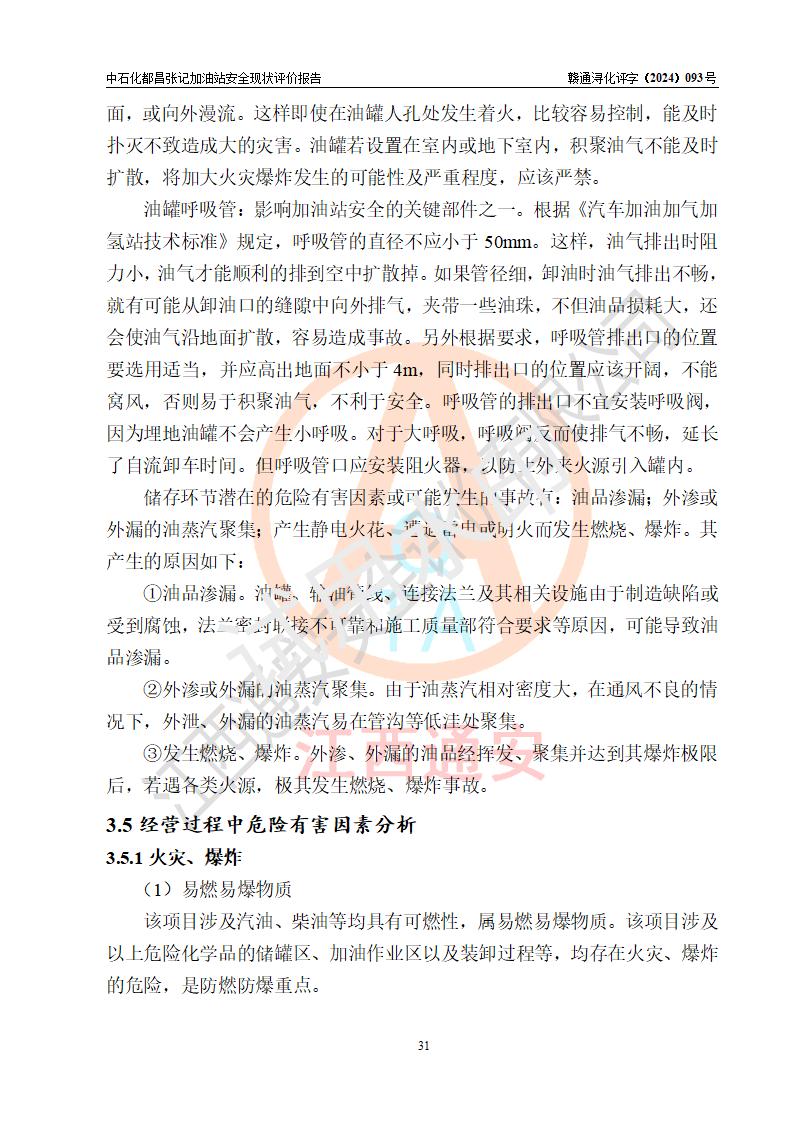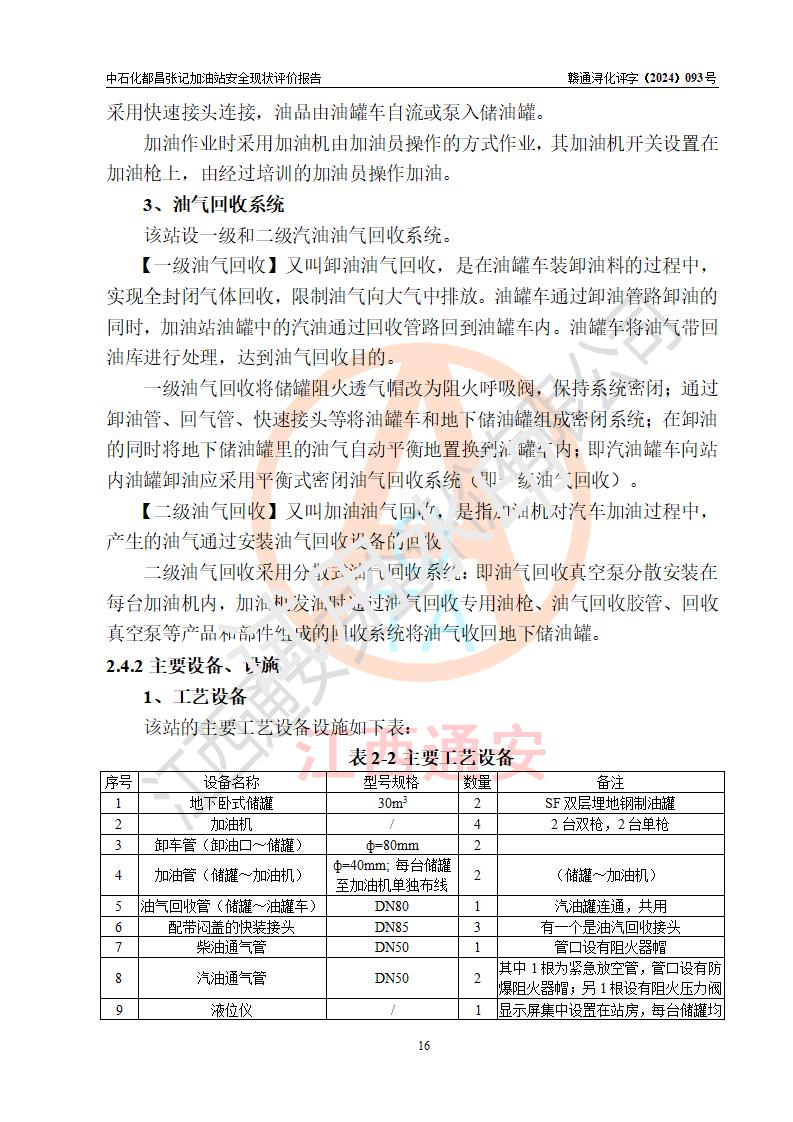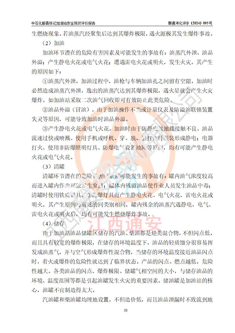 項目簡介 | 中國石化銷售股份有限公司江西九江都昌石油分公司張記加油站是一家專門從事成品油零售經(jīng)營的有限公司分公司(外商投資企業(yè)分公司),經(jīng)營場所位于江西省九江市都昌縣中館鎮(zhèn)張家山?,F(xiàn)有從業(yè)人員3名,其中安全管理人員1人,加油站負(fù)責(zé)人談宇斌。 該加油站占地面積3333m2,站區(qū)內(nèi)設(shè)置有2臺雙槍和2臺單槍稅控燃油加油機及配套的工藝管線,設(shè)有SF雙層儲罐2臺,其中30m3的92#汽油儲罐1臺、30m3的0#柴油儲罐1臺,油品儲罐總?cè)莘e為60m3(折算成汽油為45m3),按現(xiàn)行《汽車加油加氣加氫站技術(shù)標(biāo)準(zhǔn)》對加油站的等級劃分原則,屬三級加油站。 該站由九江市行政審批局換發(fā)《危險化學(xué)品經(jīng)營許可證》(證號:贛九行審經(jīng)(甲)字[2021]000066號),**期限2021年12月10日至2024年12月09日。 | |||