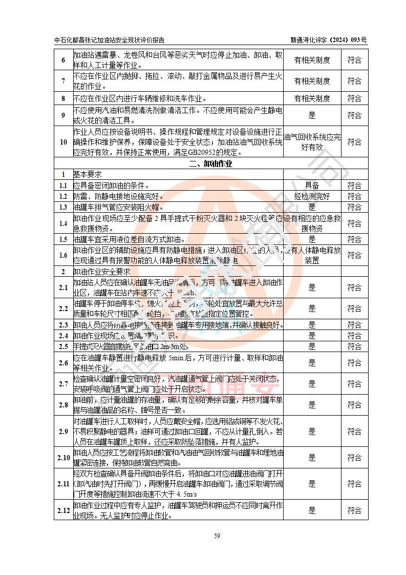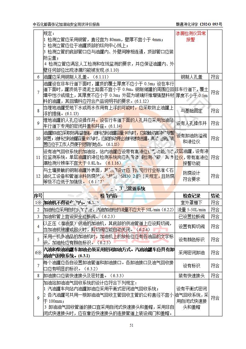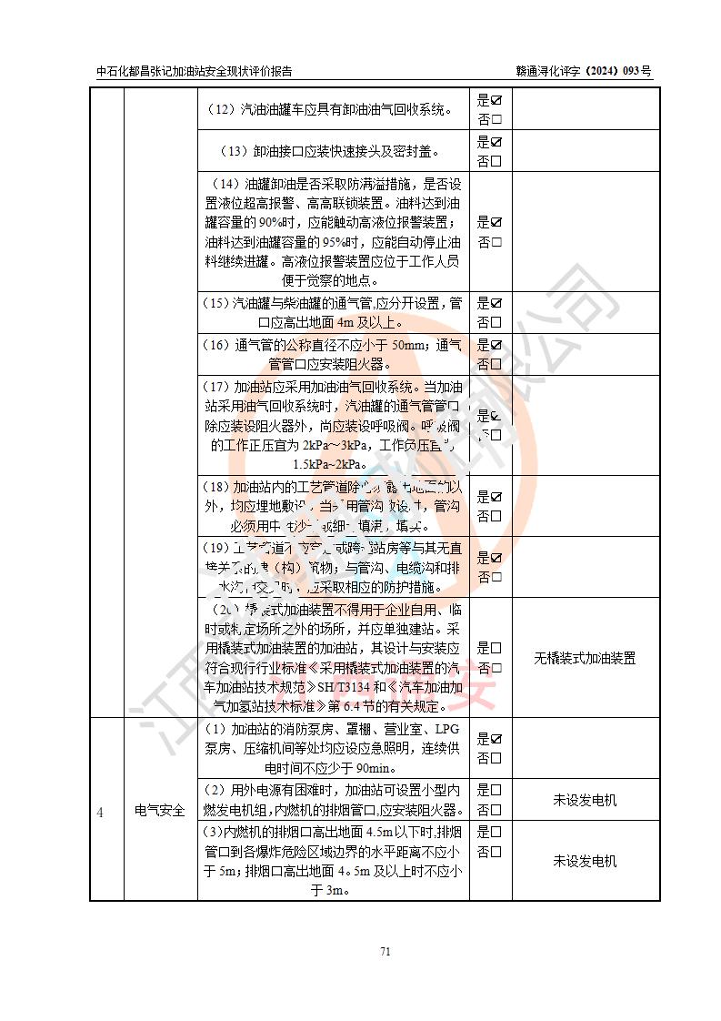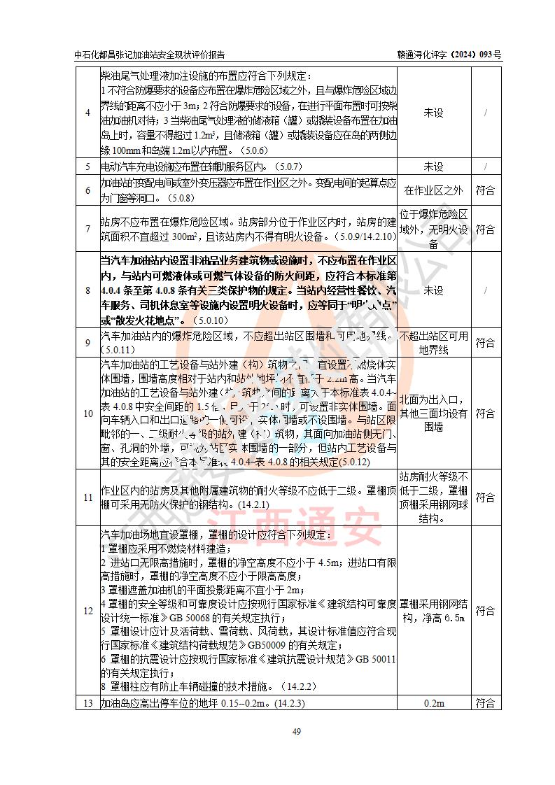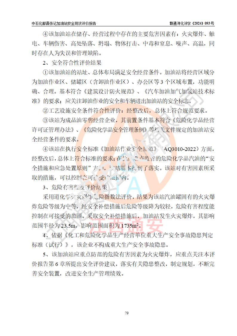評價結(jié)論 | 中國石化銷售股份有限公司江西九江都昌石油分公司張記加油站涉及的安全條件、安全經(jīng)營條件、安全生產(chǎn)管理符合《危險化學(xué)品經(jīng)營許可證管理辦法》、《汽車加油加氣加氫站技術(shù)標(biāo)準(zhǔn)》等**有關(guān)法規(guī)、標(biāo)準(zhǔn)、規(guī)范要求,能滿足危險化學(xué)品經(jīng)營安全條件。 | |||